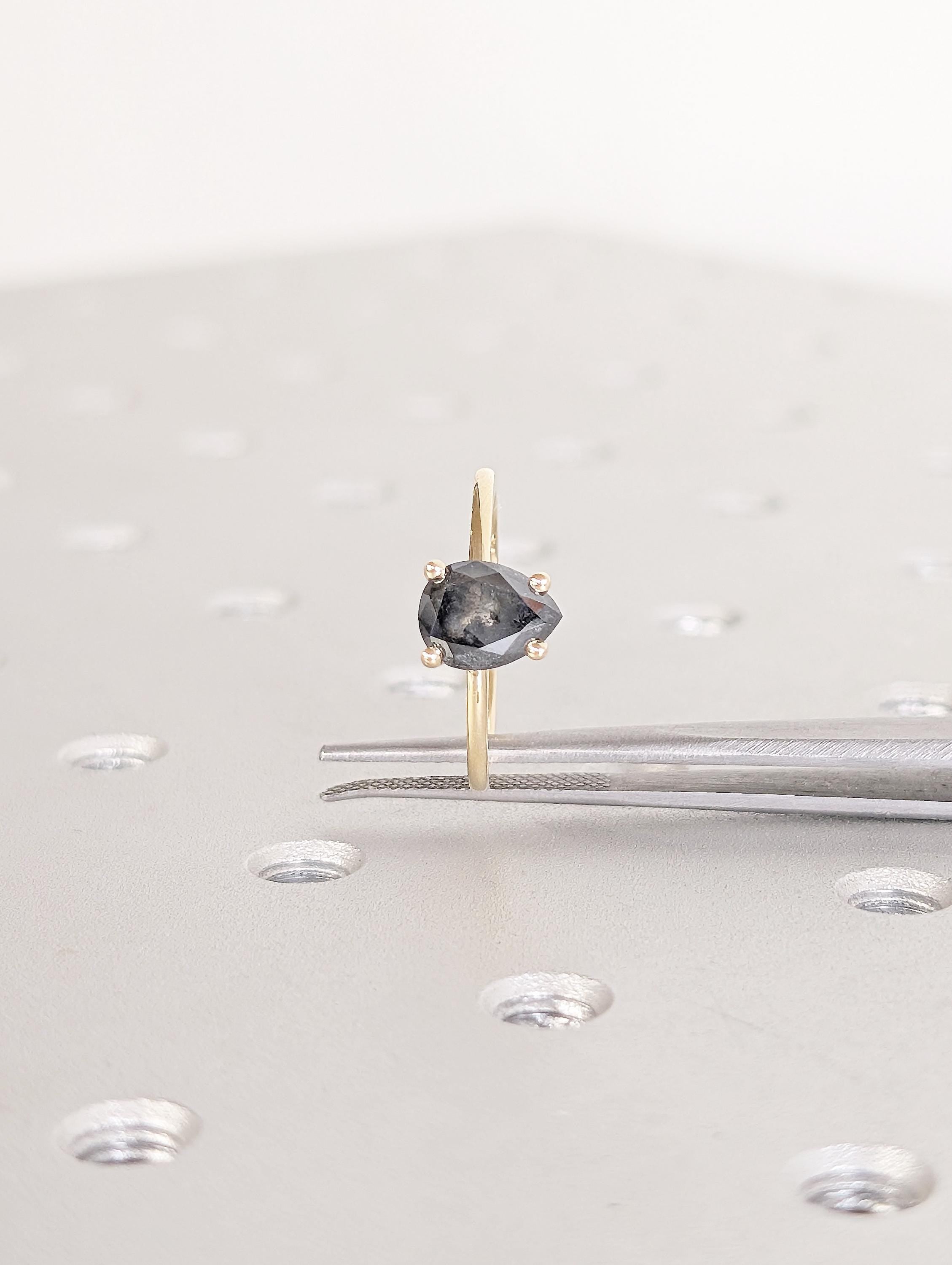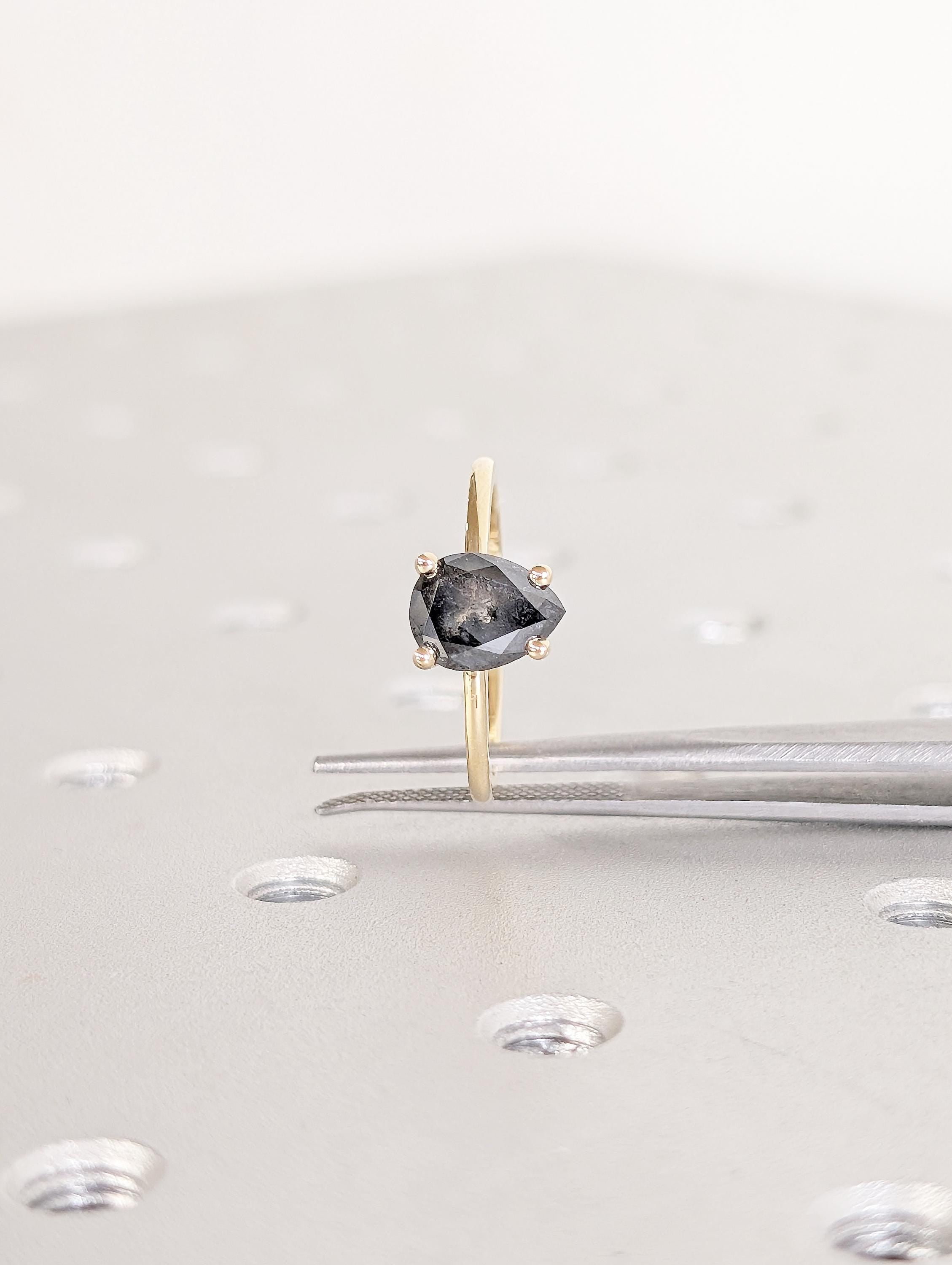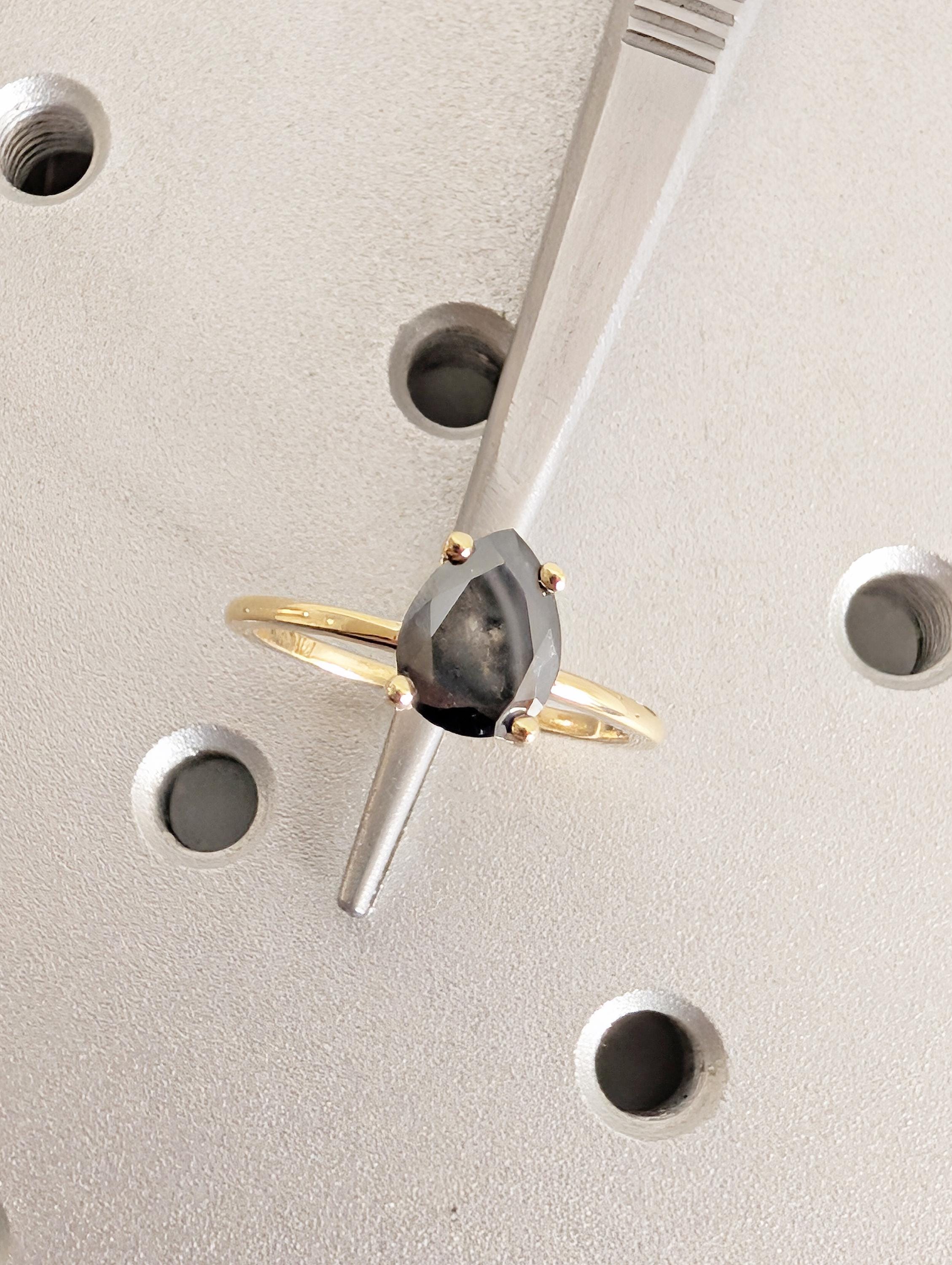 This solitaire engagement ring features a captivating pear-cut Salt and Pepper Diamond, prized for its natural inclusions and unique character. Set in a classic prong setting on a slim gold band, it offers a refined yet modern take on timeless elegance.