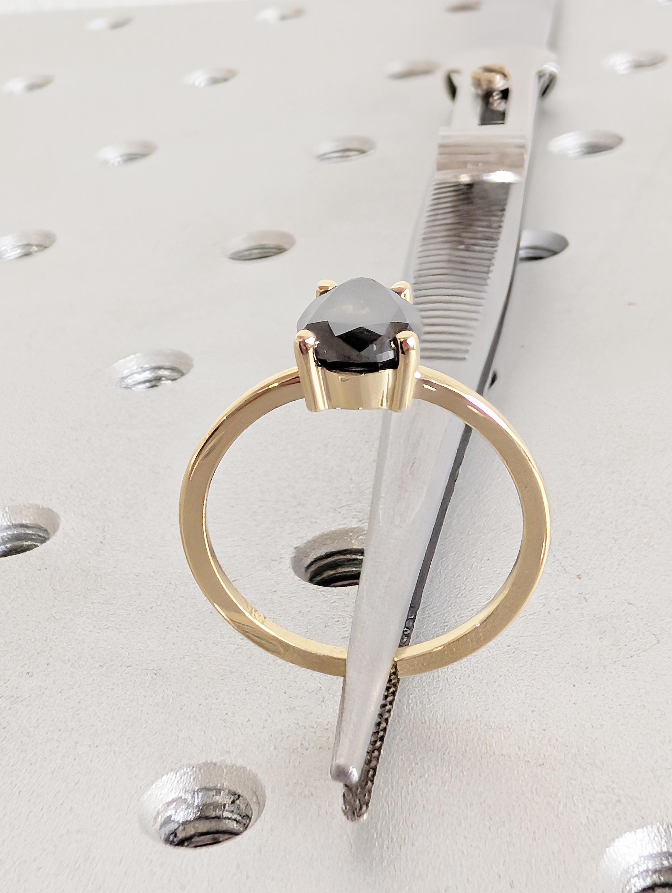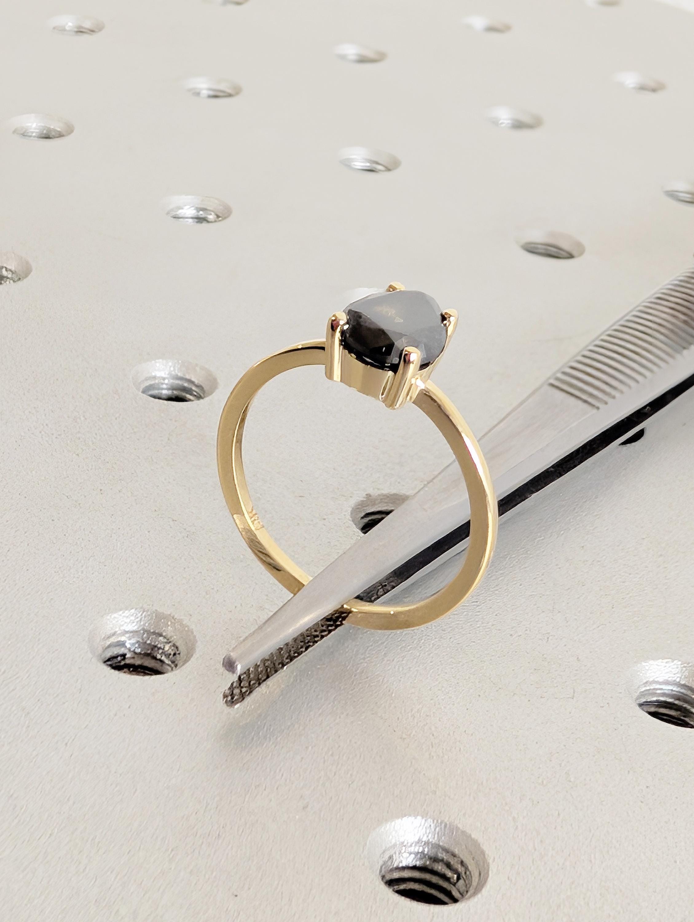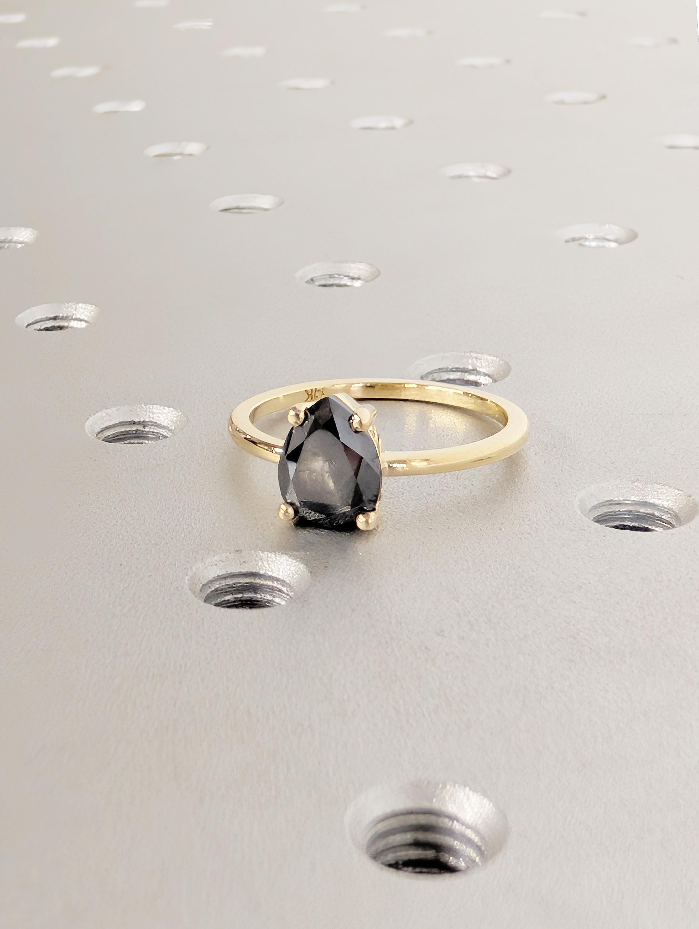 This solitaire engagement ring features a captivating pear-cut Salt and Pepper Diamond, prized for its natural inclusions and unique character. Set in a classic prong setting on a slim gold band, it offers a refined yet modern take on timeless elegance.