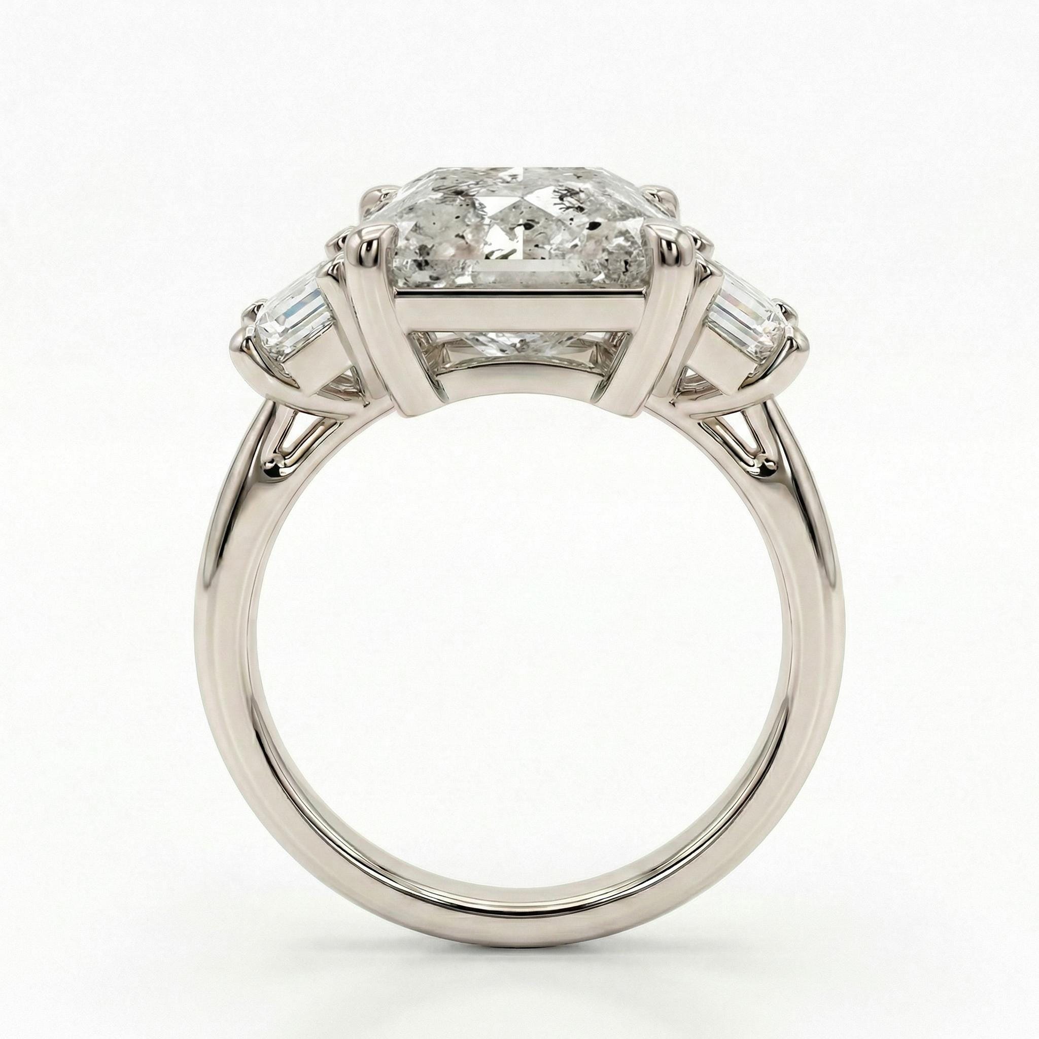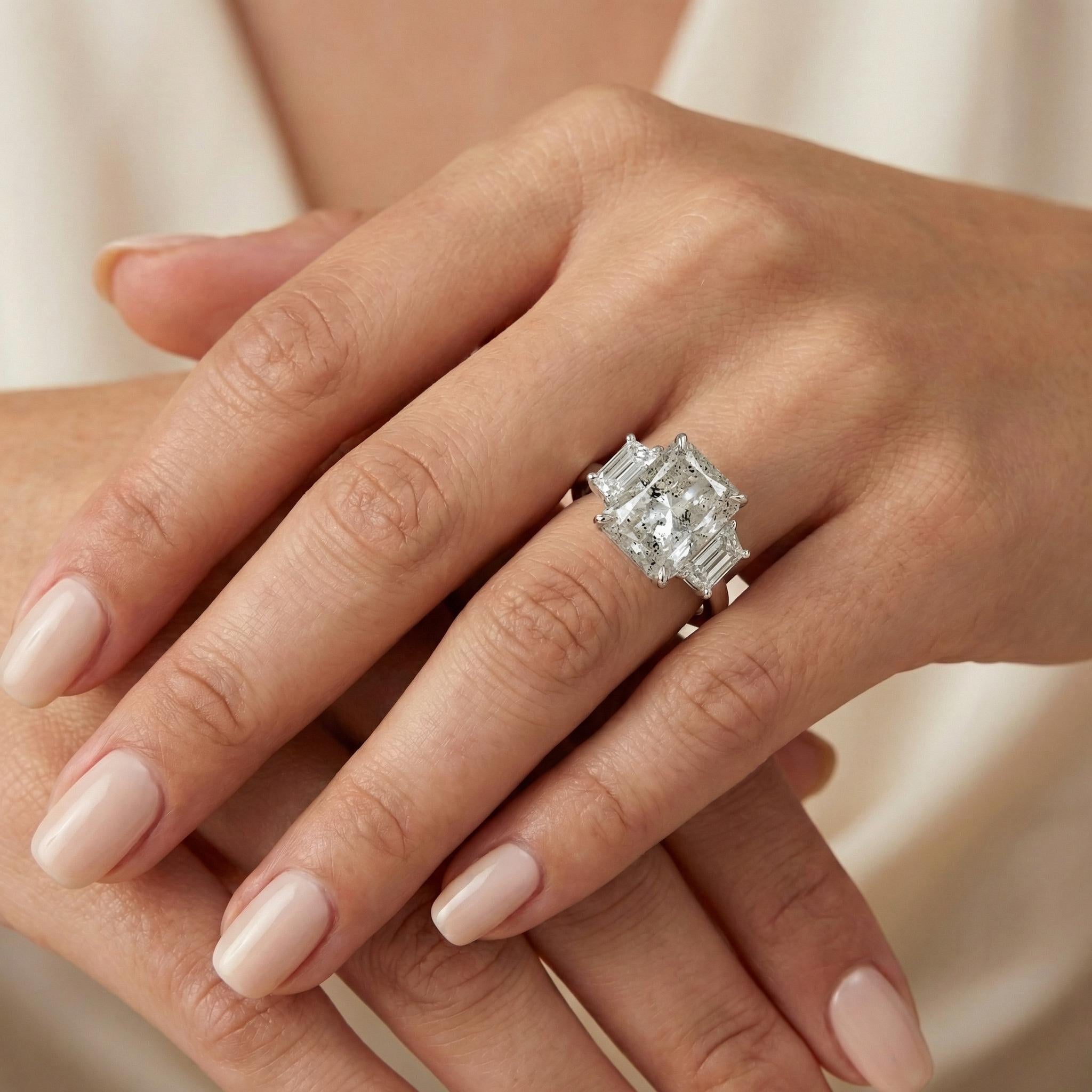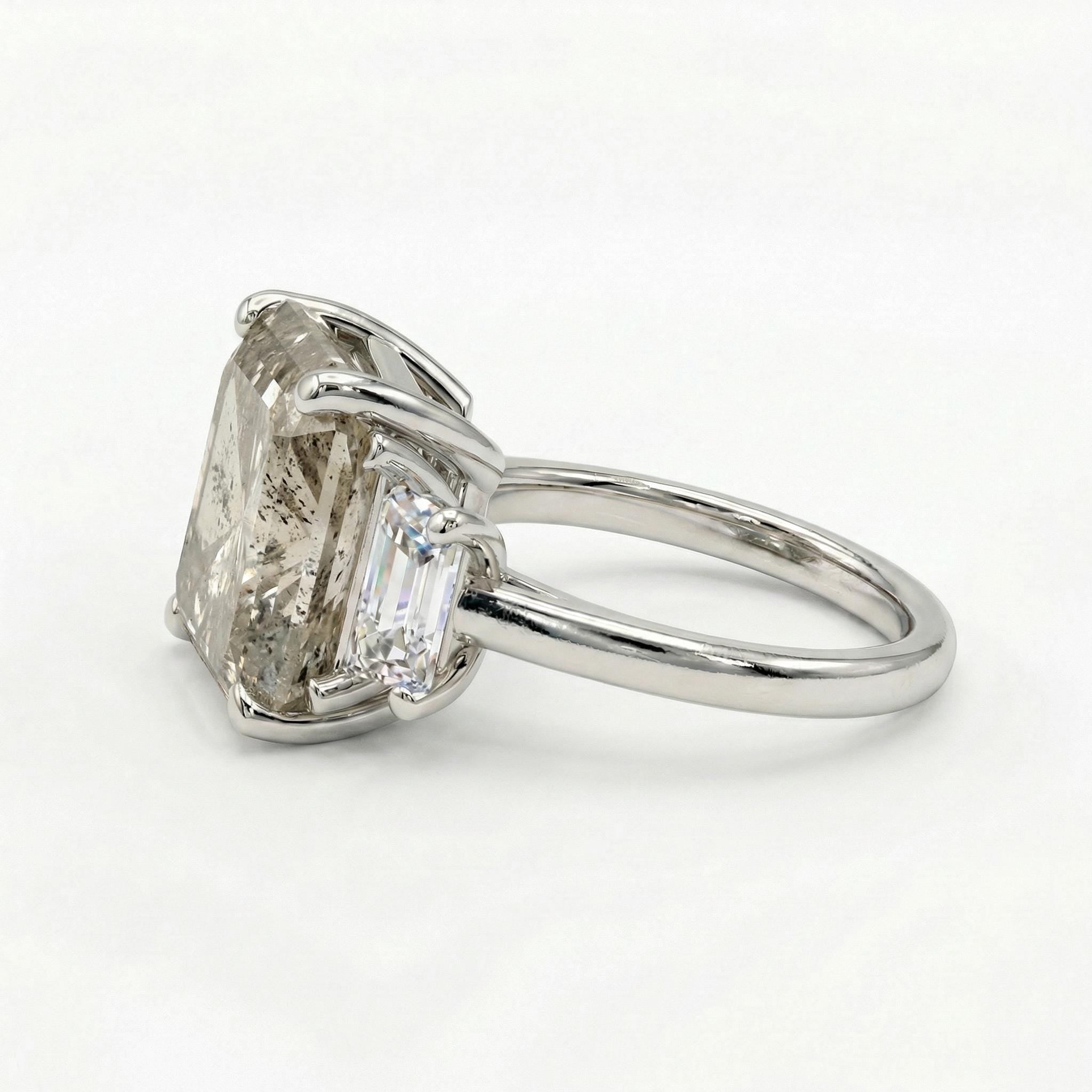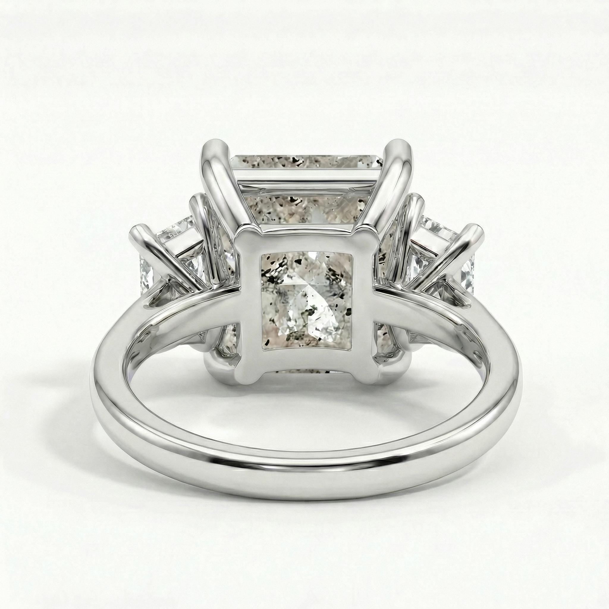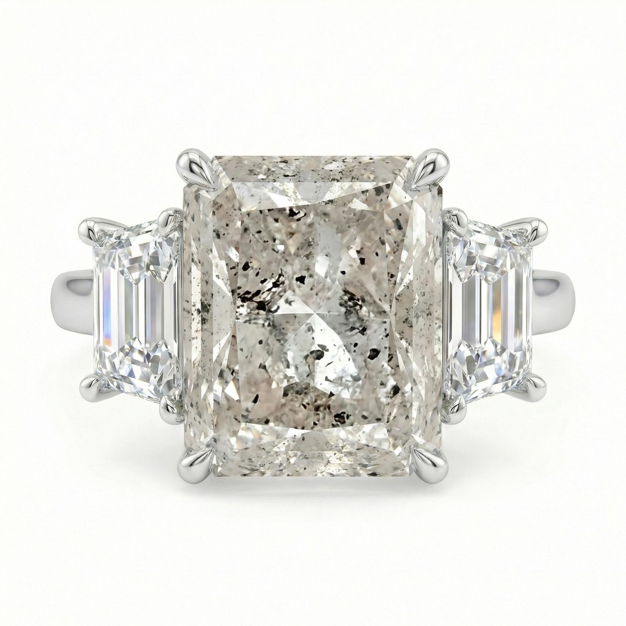 Ignite your style with our 5.5ct radiant cut Salt and Pepper Diamond ring, a testament to pure individuality. The trillion enhanced diamond side stone is showcased in a diamond-paved band, forming a captivating ensemble that pairs seamlessly with our chevron diamond wedding band for a sophisticated and memorable look.