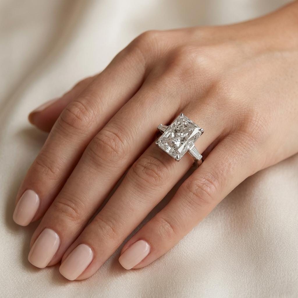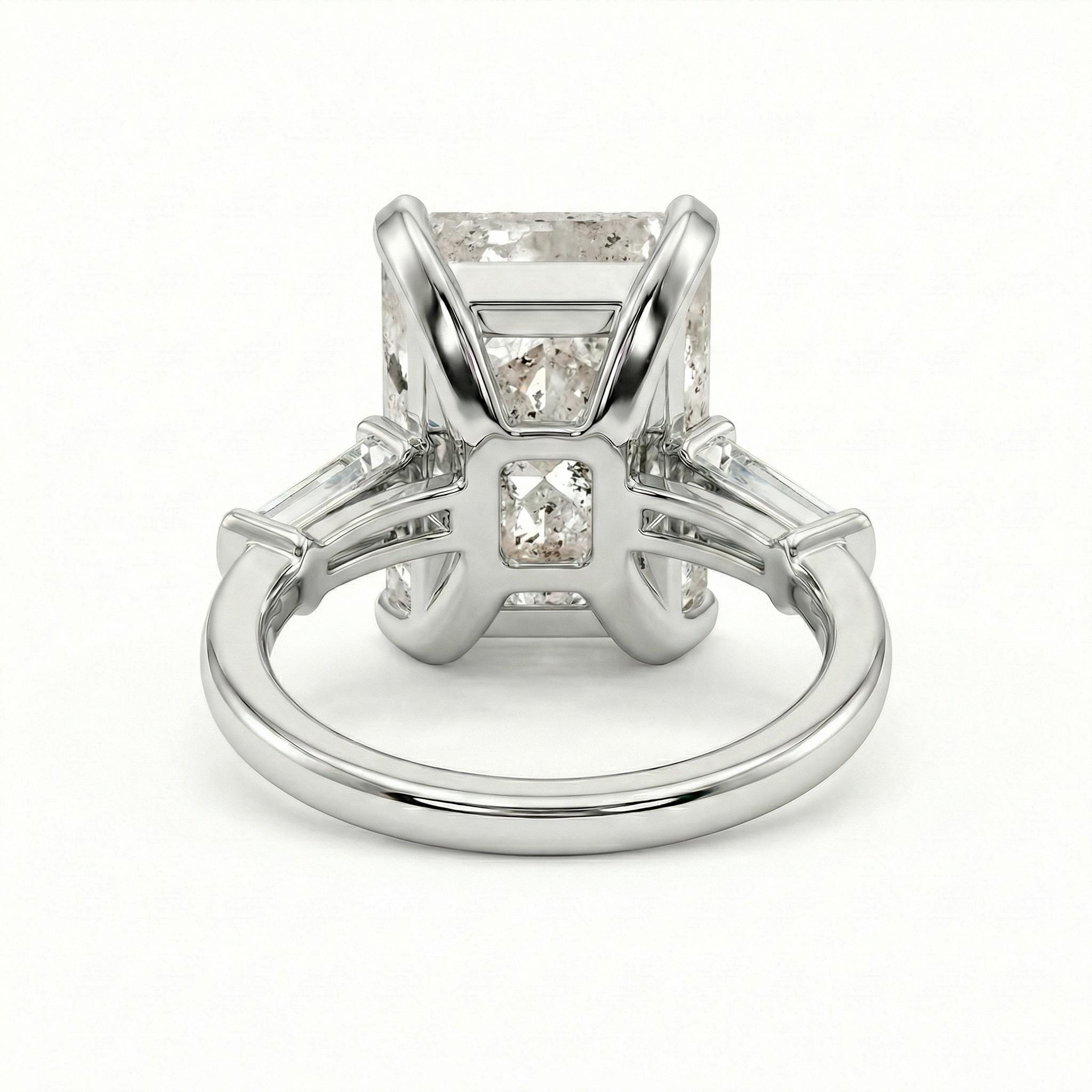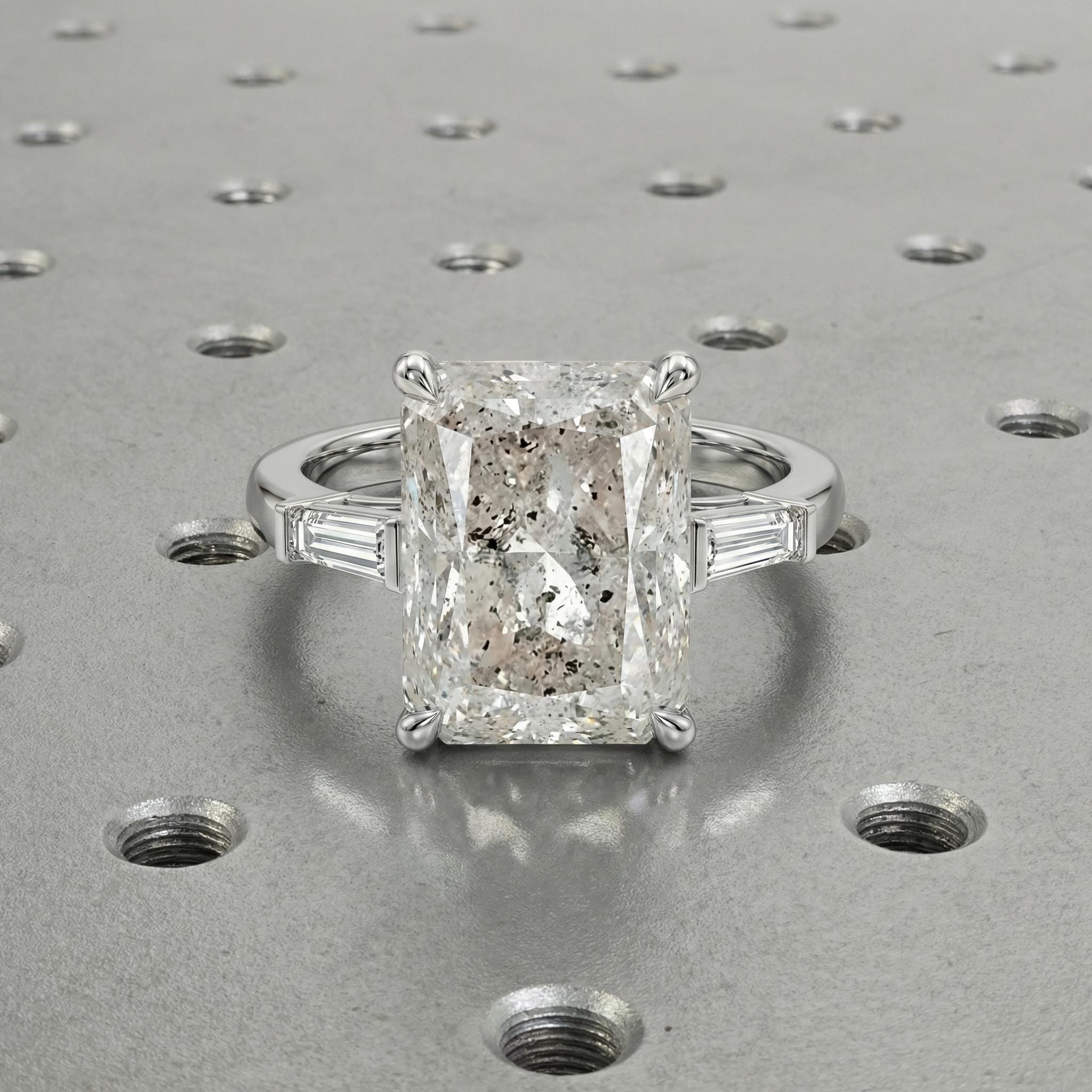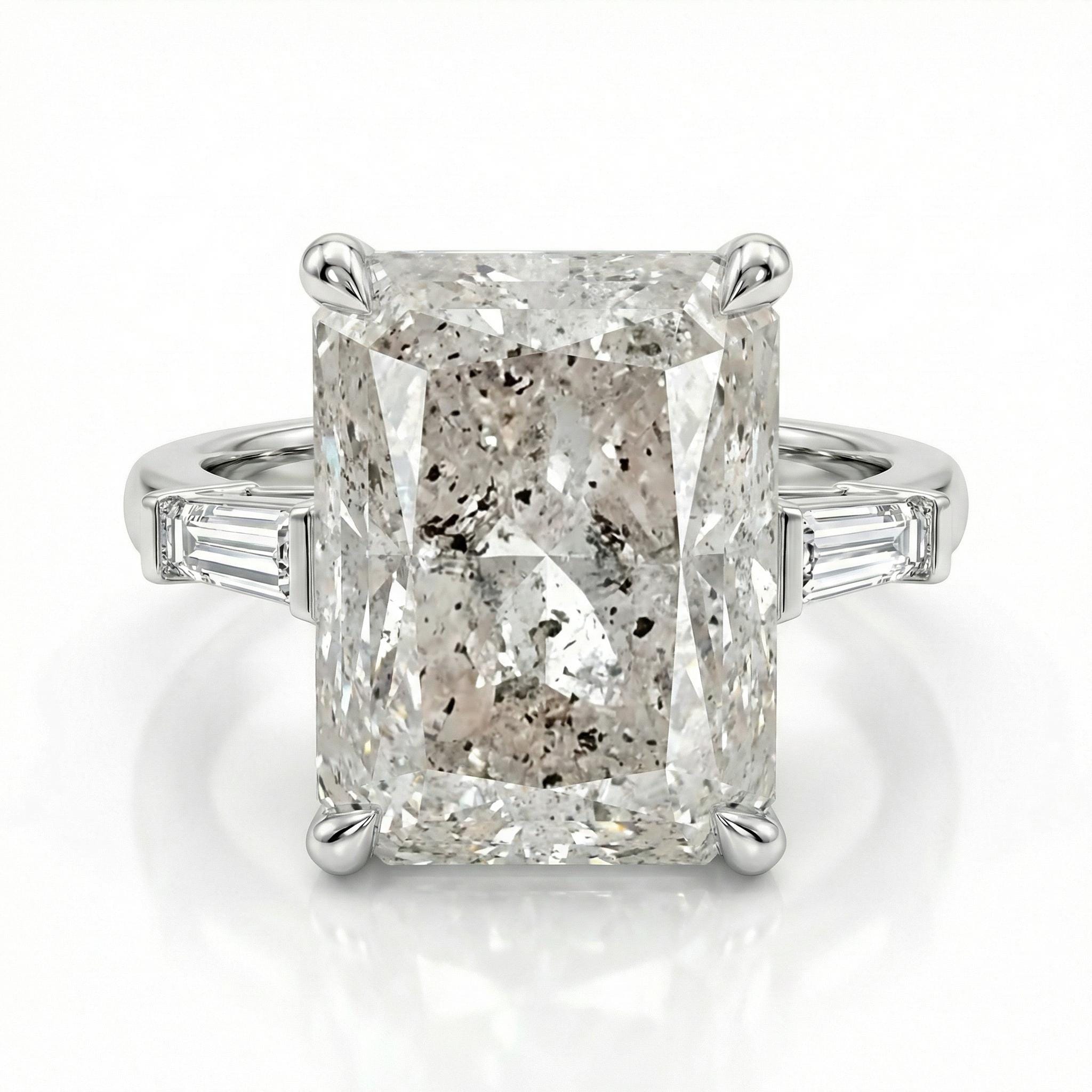 Ignite your style with our 6ct radiant cut Salt and Pepper Diamond ring, a testament to pure individuality. The trillion enhanced diamond side stone is showcased in a diamond-paved band, forming a captivating ensemble that pairs seamlessly with our chevron diamond wedding band for a sophisticated and memorable look.