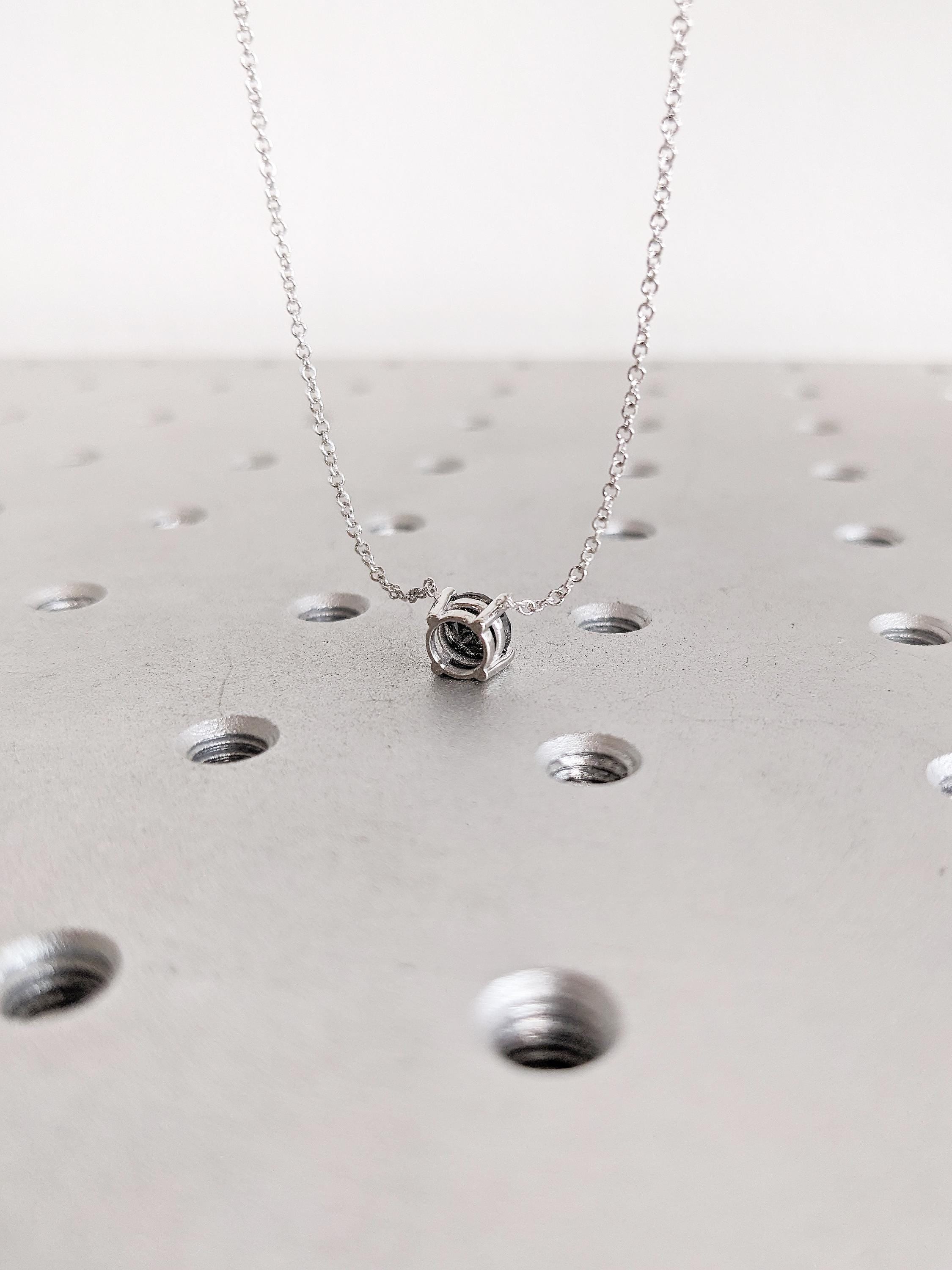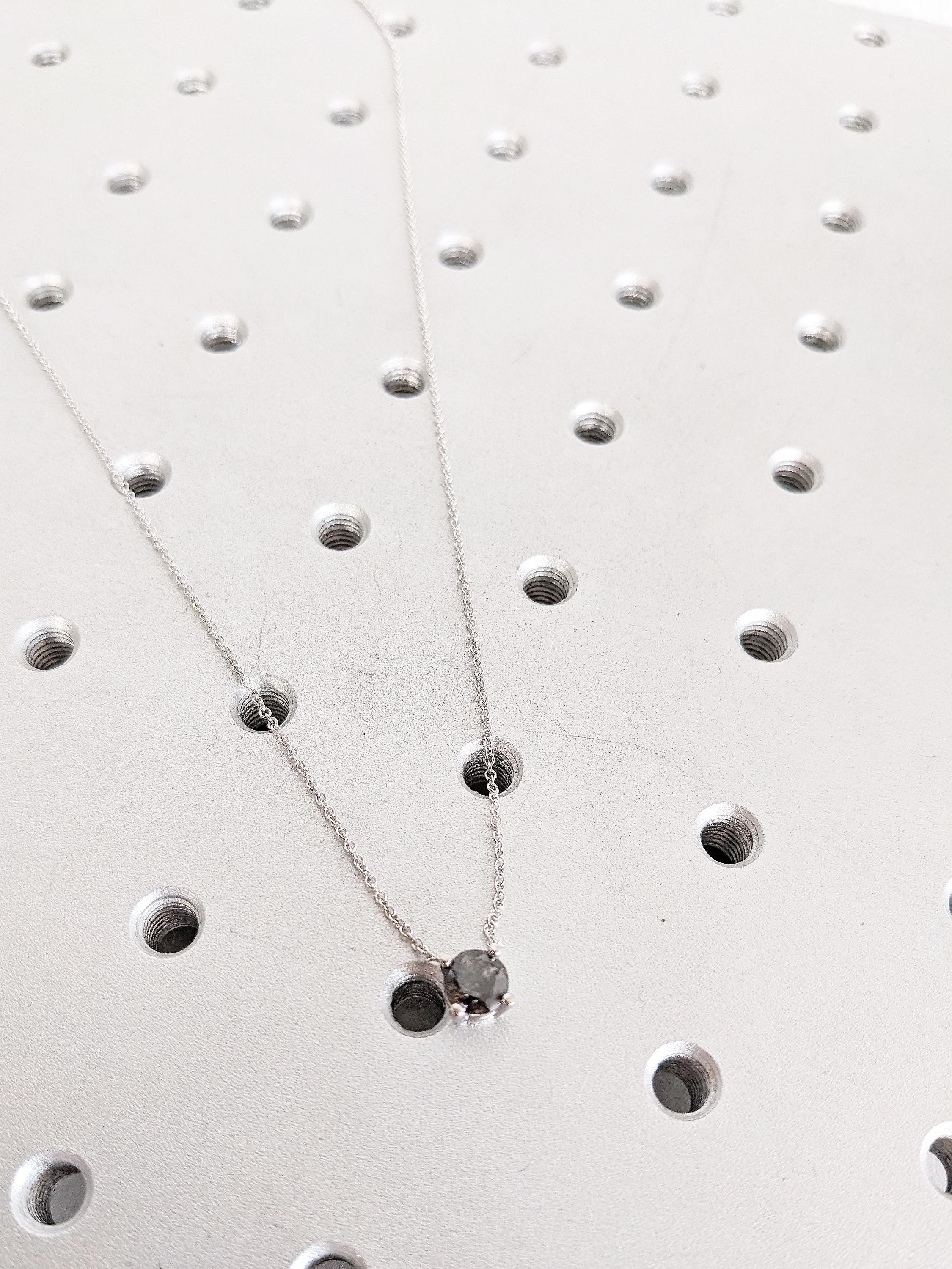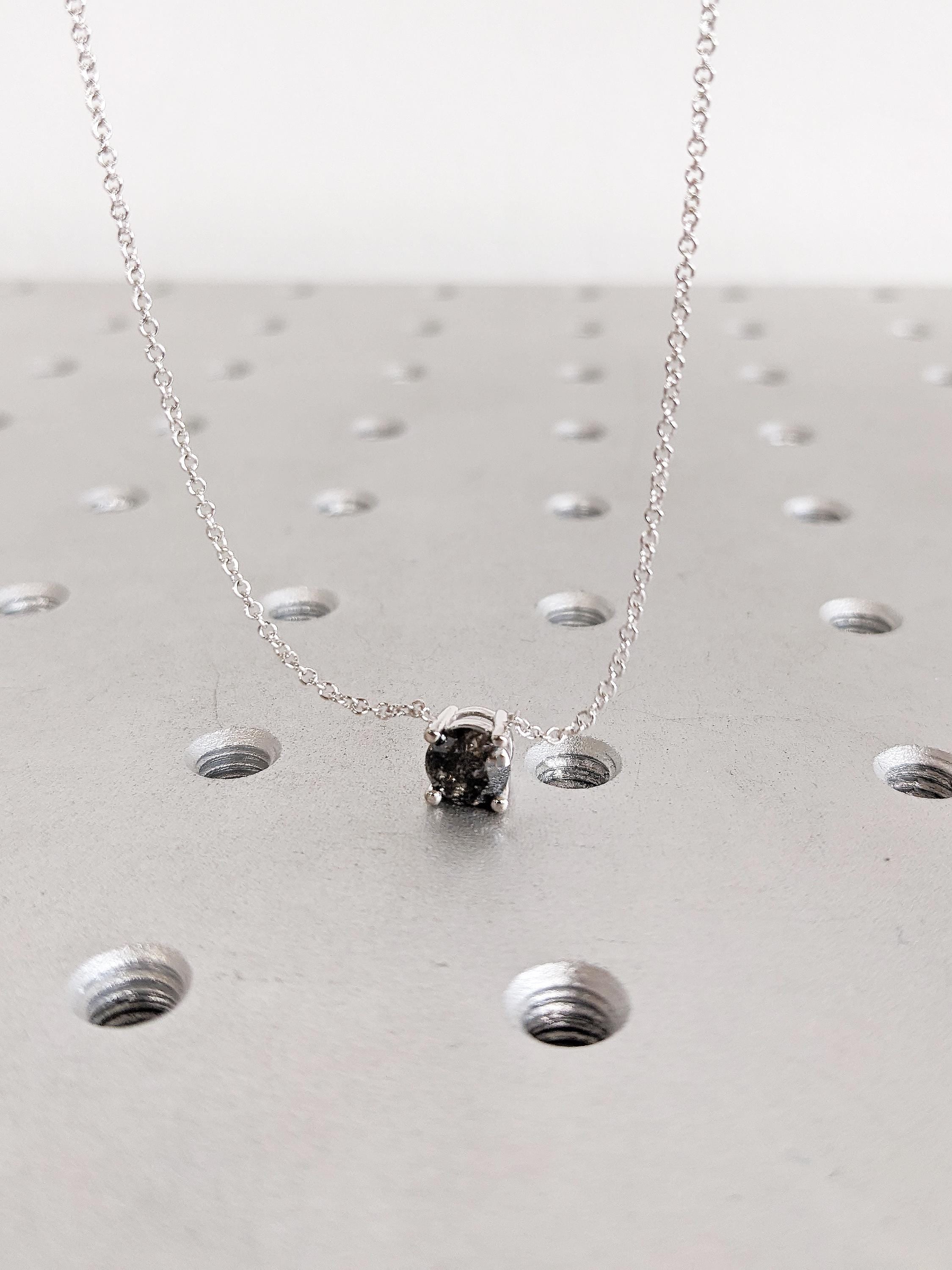 This elegant necklace showcases a captivating salt and pepper diamond pendant, secured in a delicate prong setting. The unique speckled inclusions of the diamond add a modern twist to its natural beauty, making it a timeless yet contemporary piece.