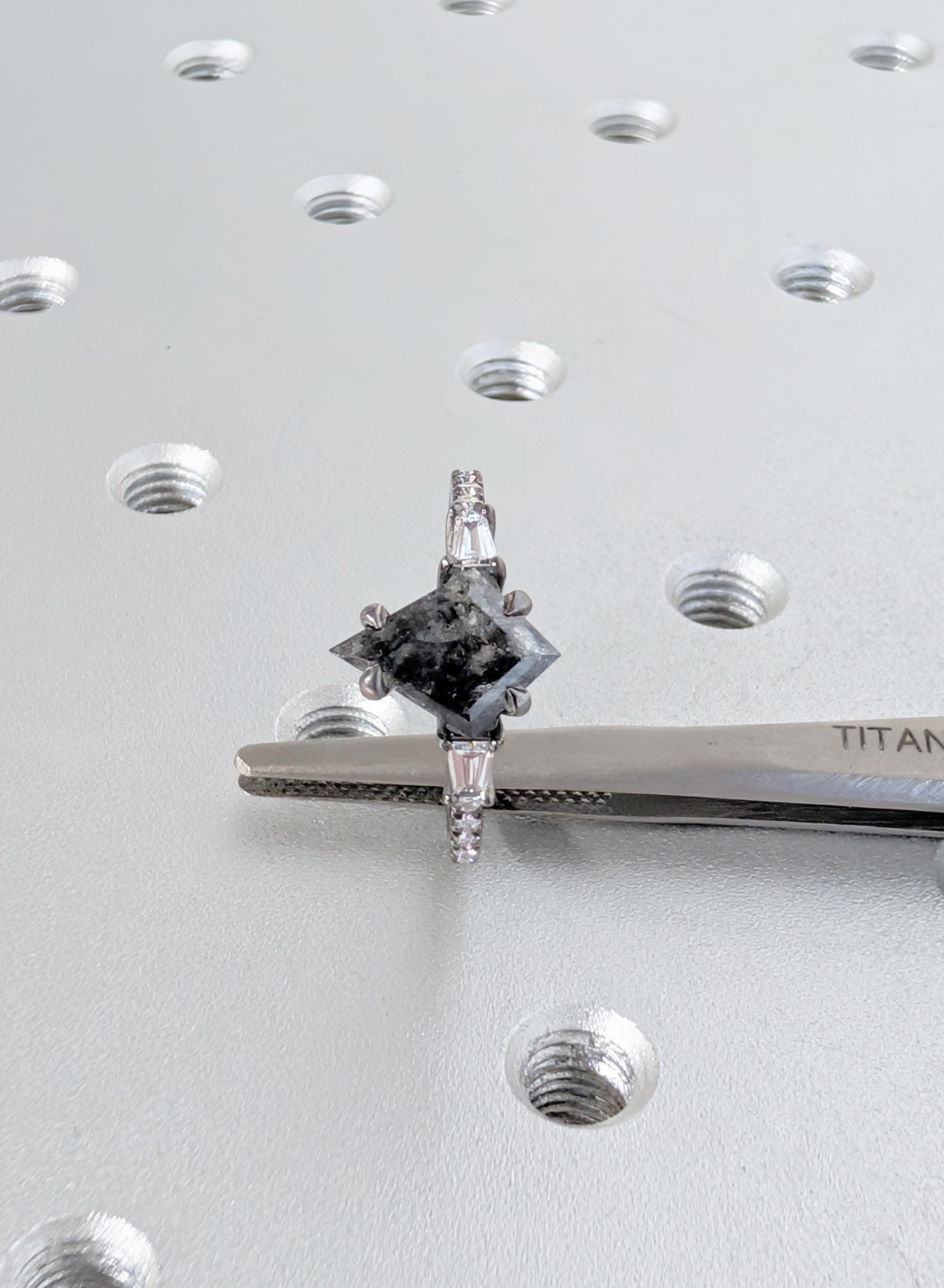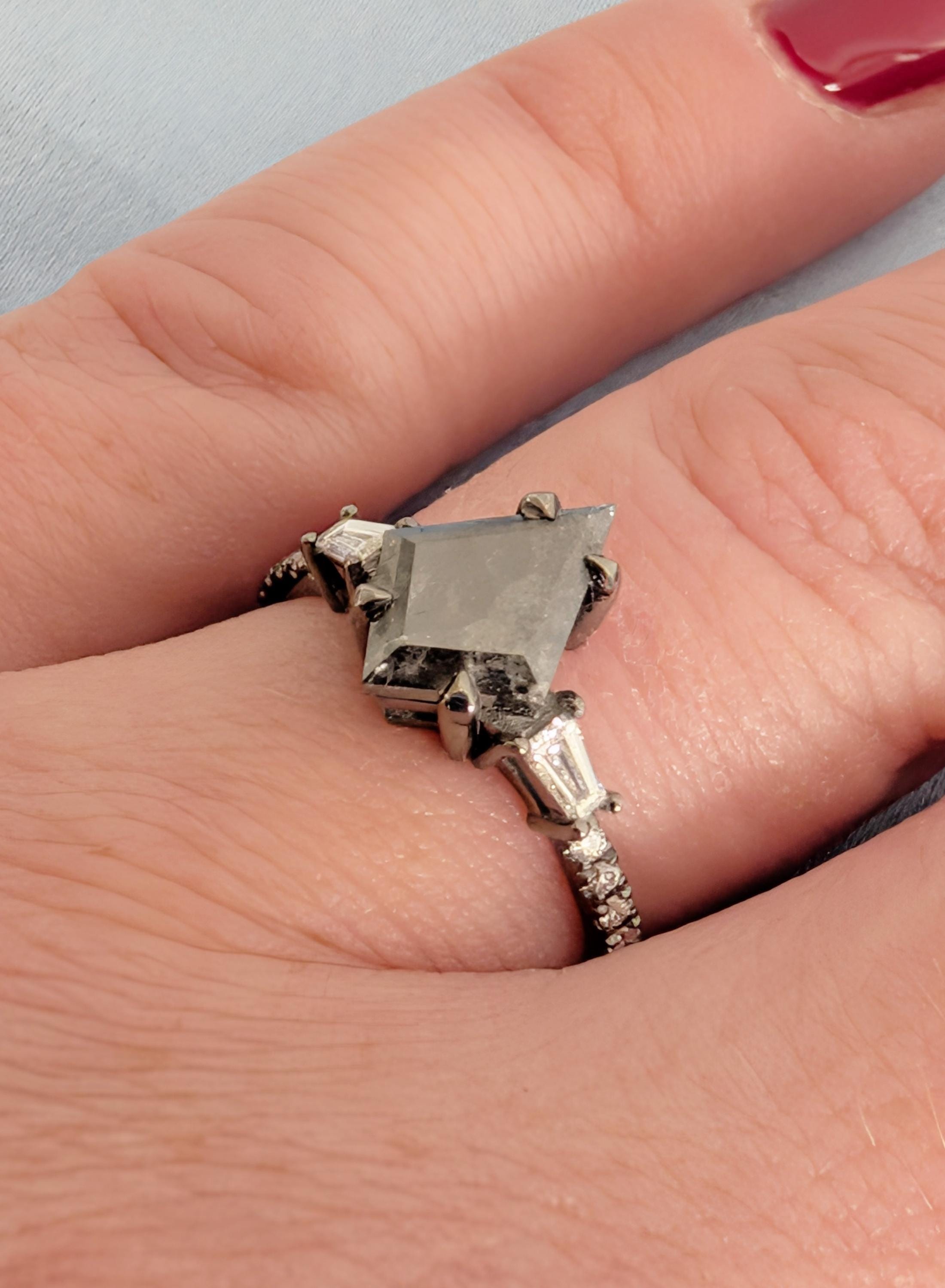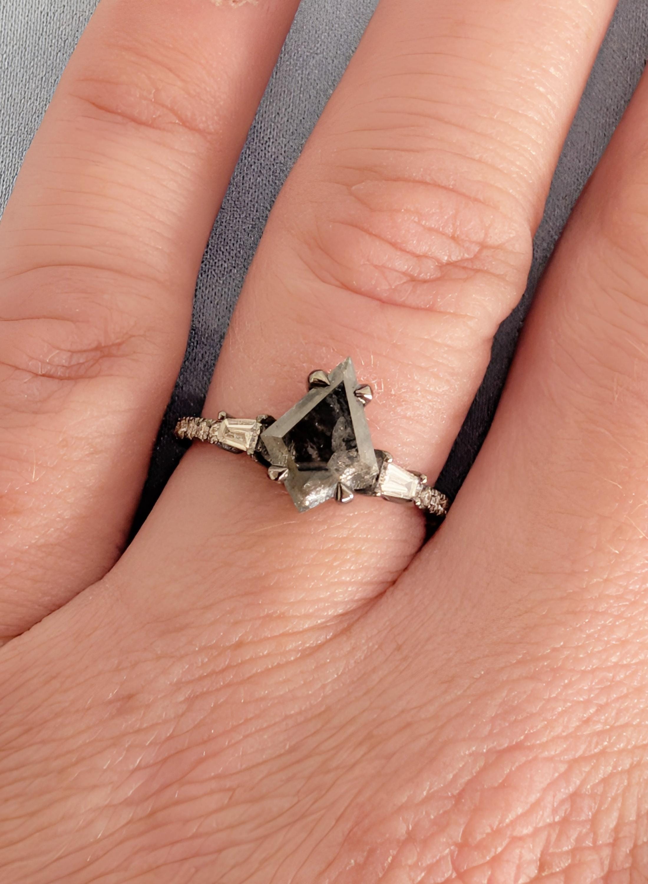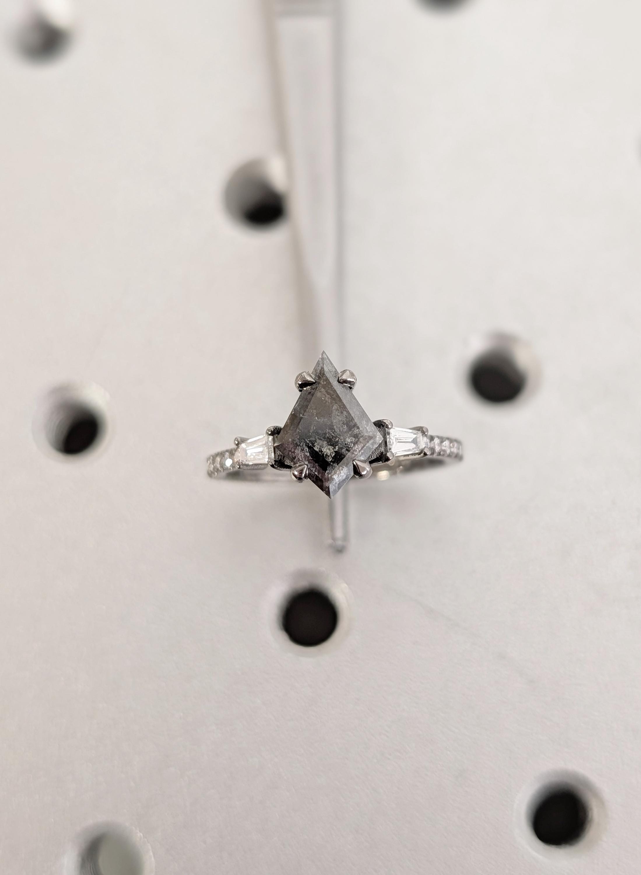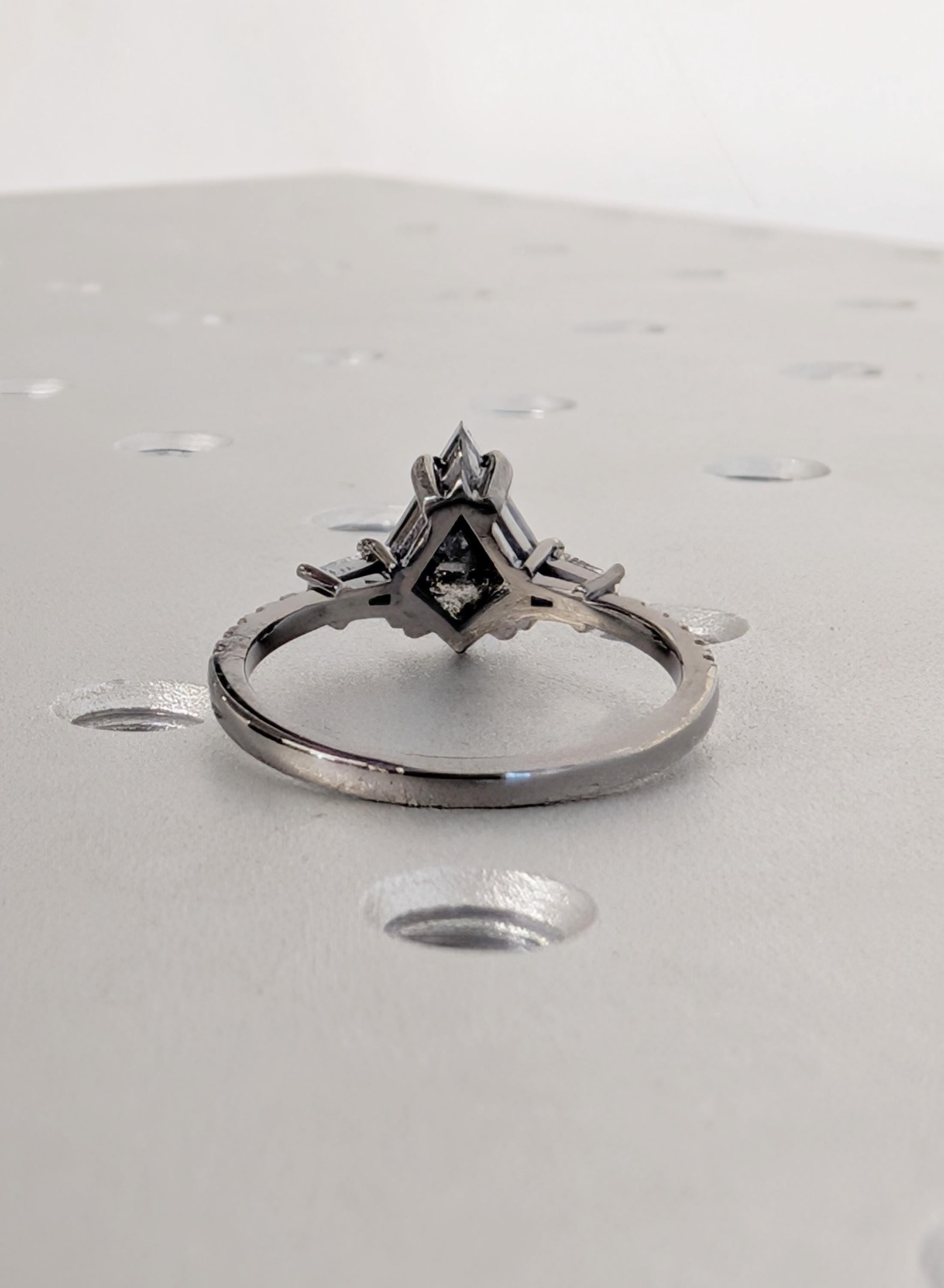 This engagement ring presents a kite cut Natural Salt and Pepper Diamond center stone set in a talon prong setting with Natural Diamond, Lab Grown Diamond, or Moissanite side stones. The bold contrast of light and dark creates depth, while the mixed stone shapes add quiet sparkle and character. Perfect for a distinctive engagement ring, anniversary gift, or everyday wear.