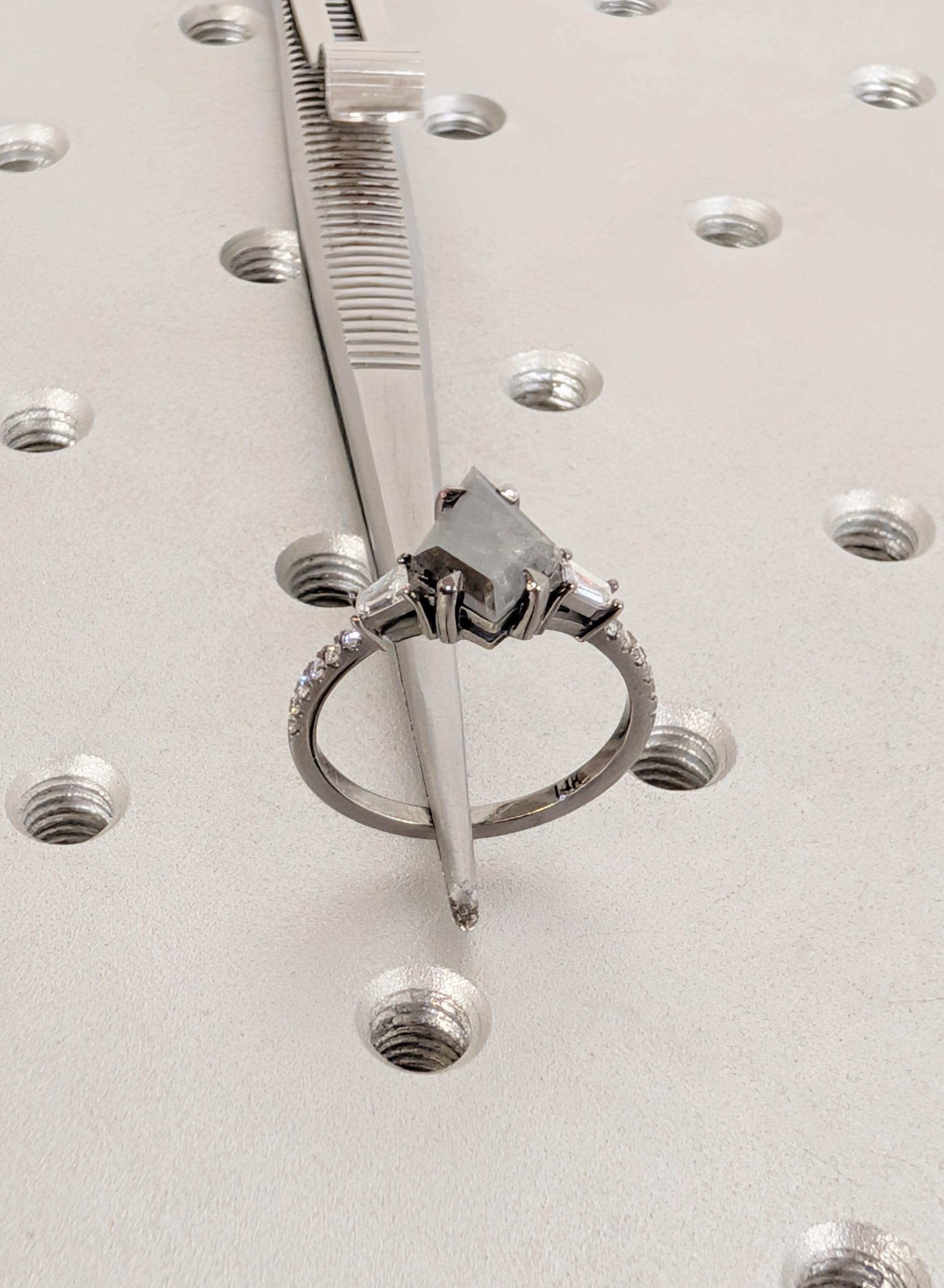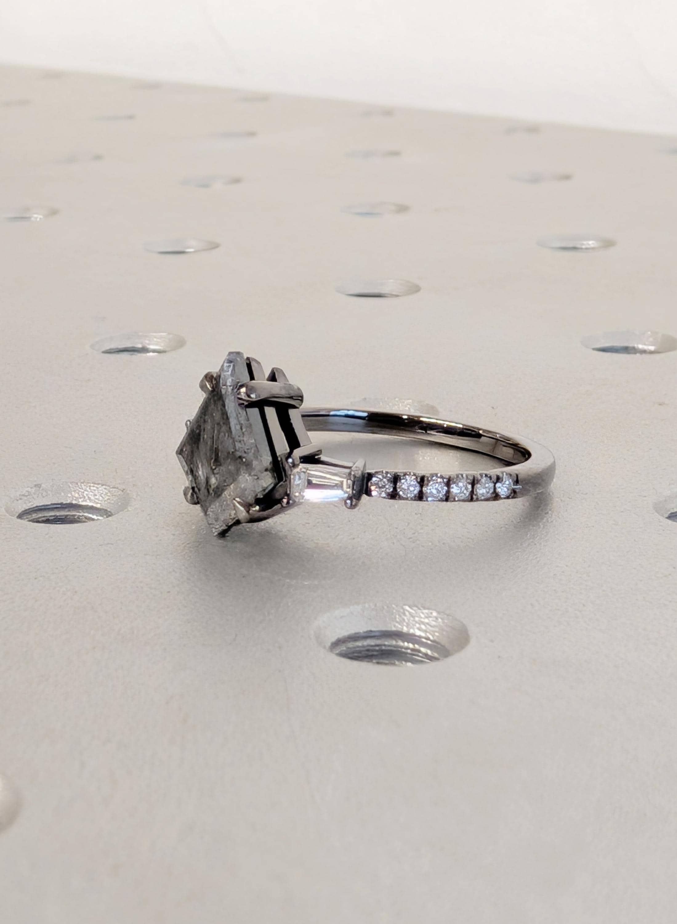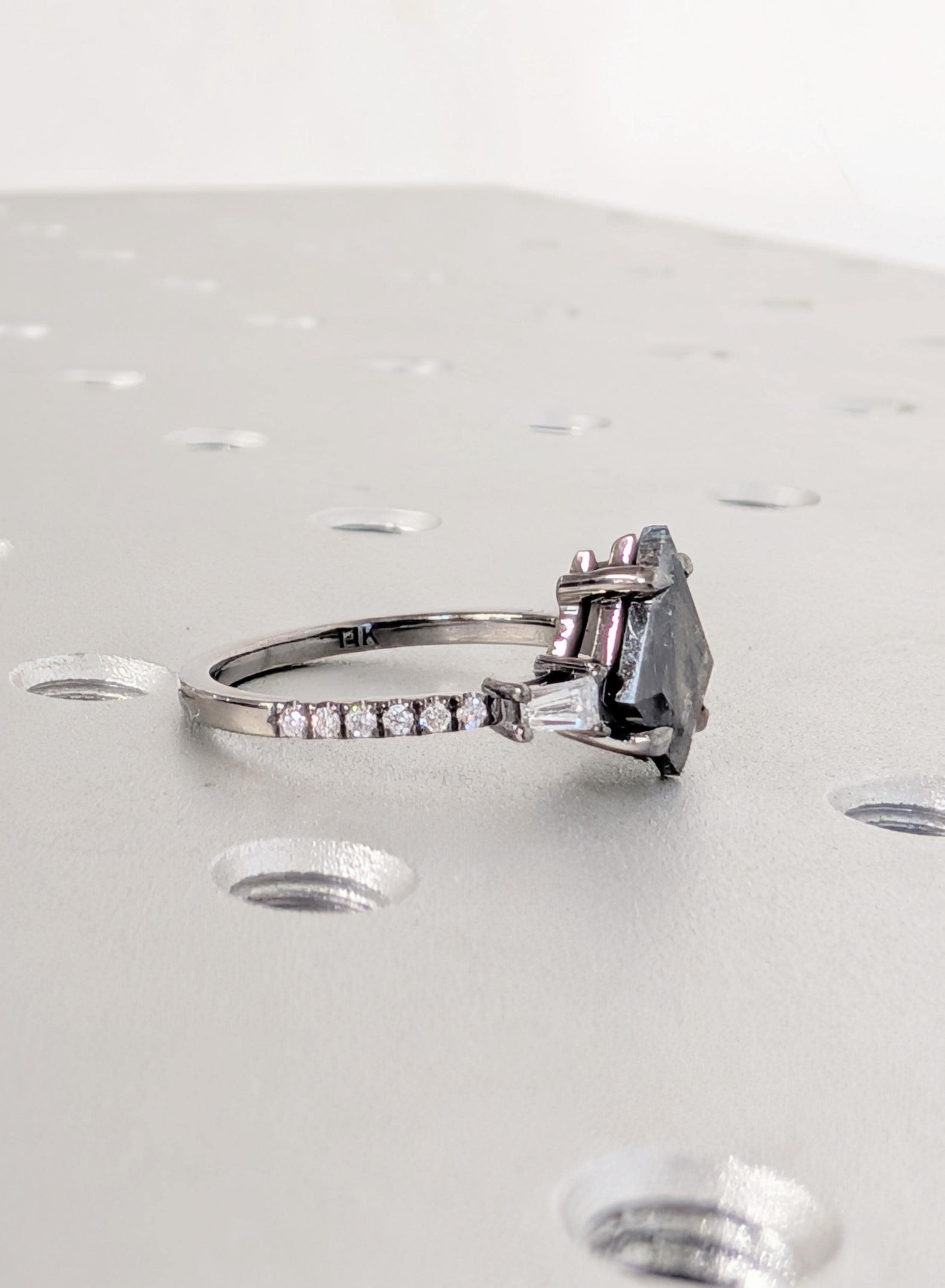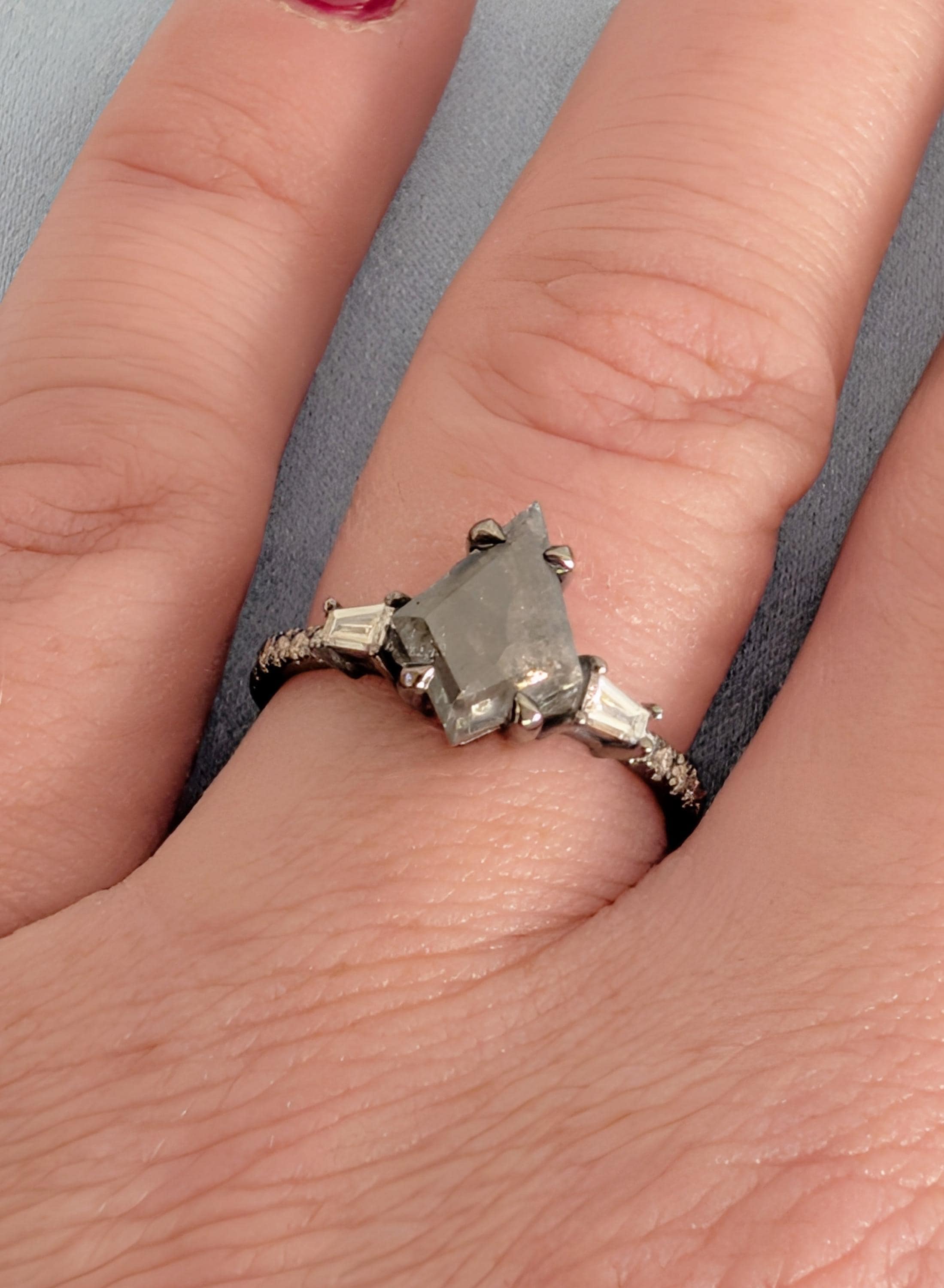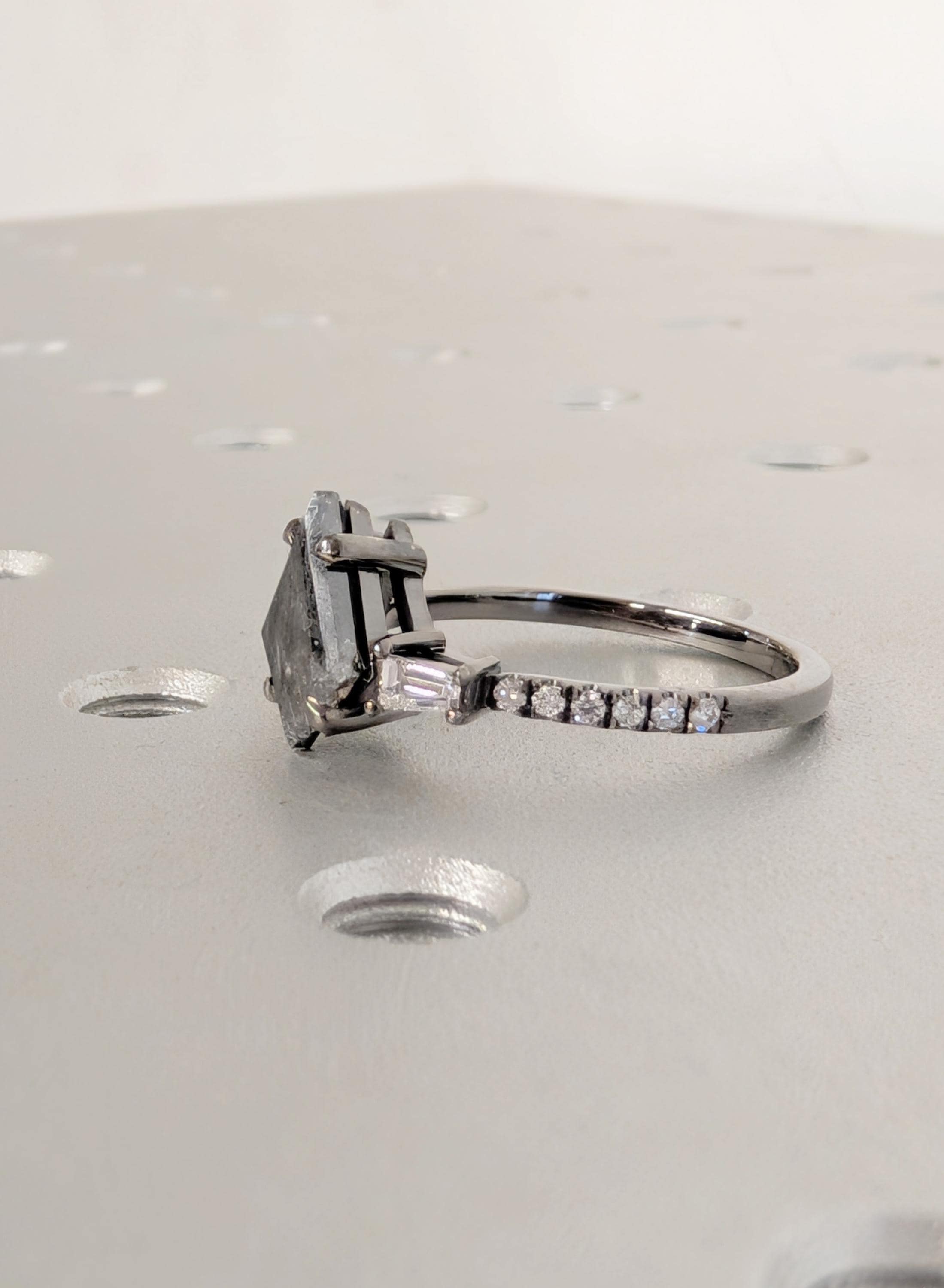 This engagement ring presents a kite cut Natural Salt and Pepper Diamond center stone set in a talon prong setting with Natural Diamond, Lab Grown Diamond, or Moissanite side stones. The bold contrast of light and dark creates depth, while the mixed stone shapes add quiet sparkle and character. Perfect for a distinctive engagement ring, anniversary gift, or everyday wear.