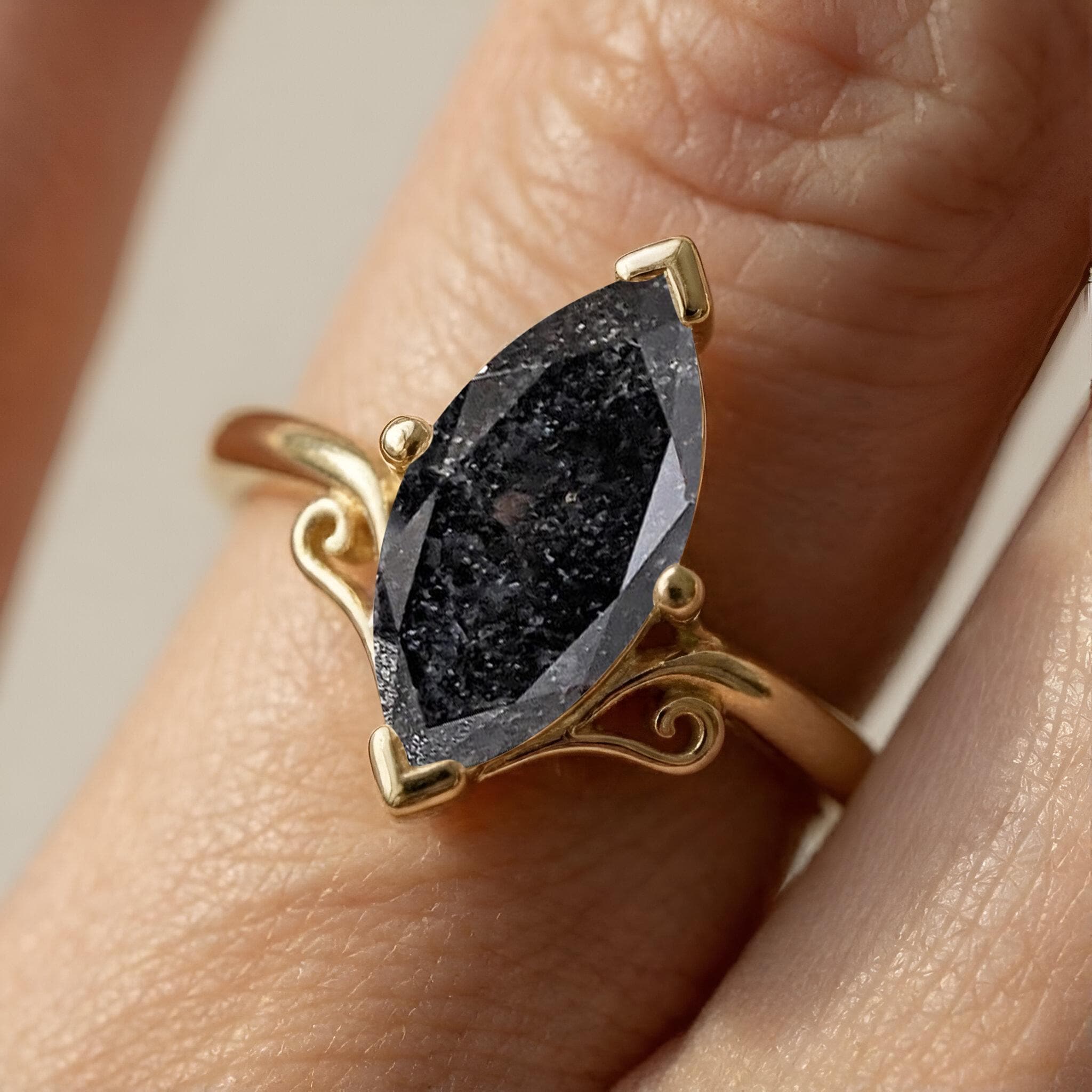 Salt and Pepper Diamond Ring: 0.5-2.25ct Marquise Engagement Ring, Filigree 14k/18K Yellow Gold Solitaire