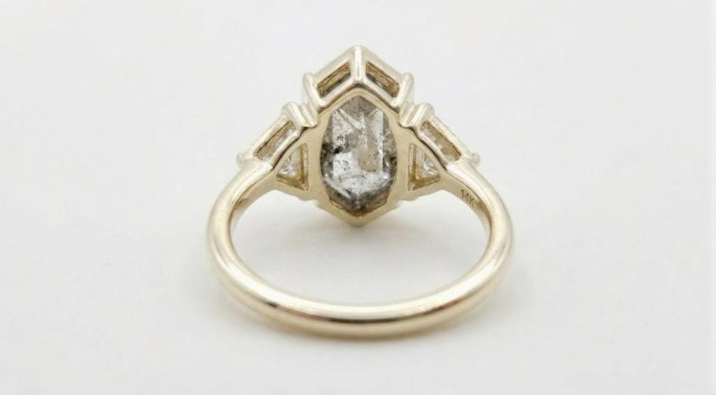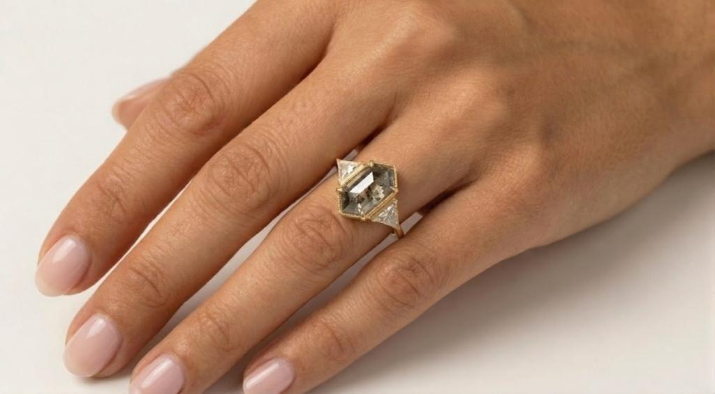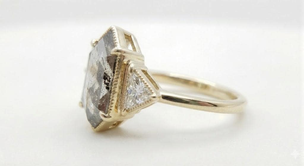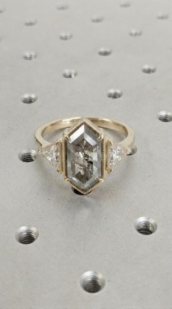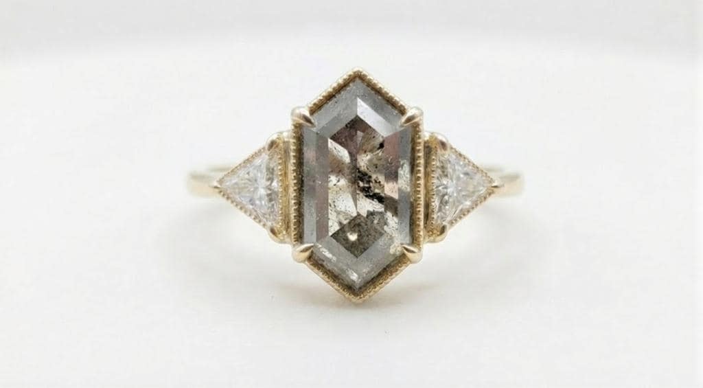 This Salt and Pepper Diamond engagement ring highlights a natural hexagon cut Salt and Pepper Diamond center stone in a prong setting, paired with triangle side stones in Natural Diamond, Lab Grown Diamond, or Moissanite. The milgrain edges and geometric style create a bold and elegant look, perfect for an engagement ring, bridal gift, or unique everyday piece.