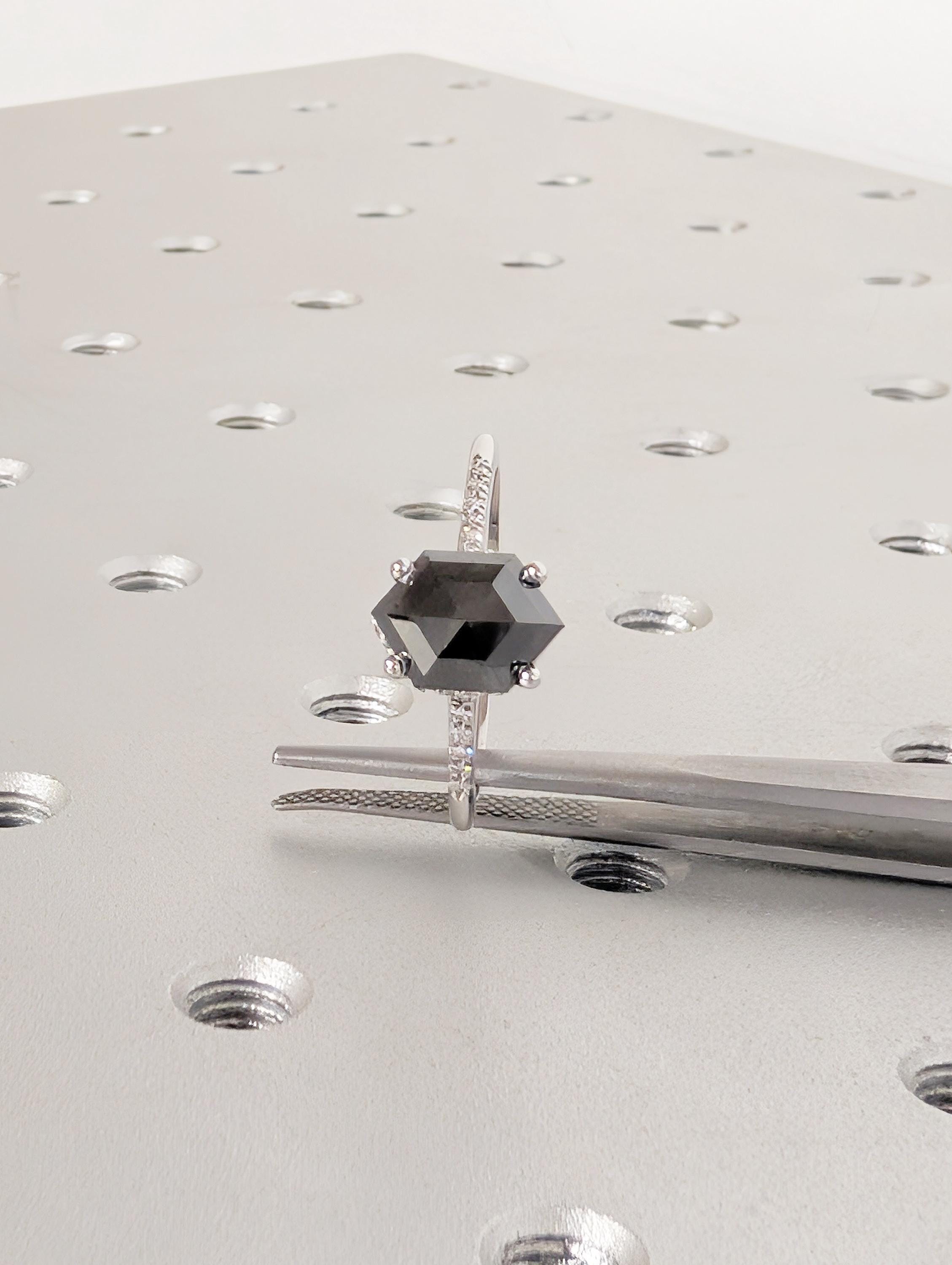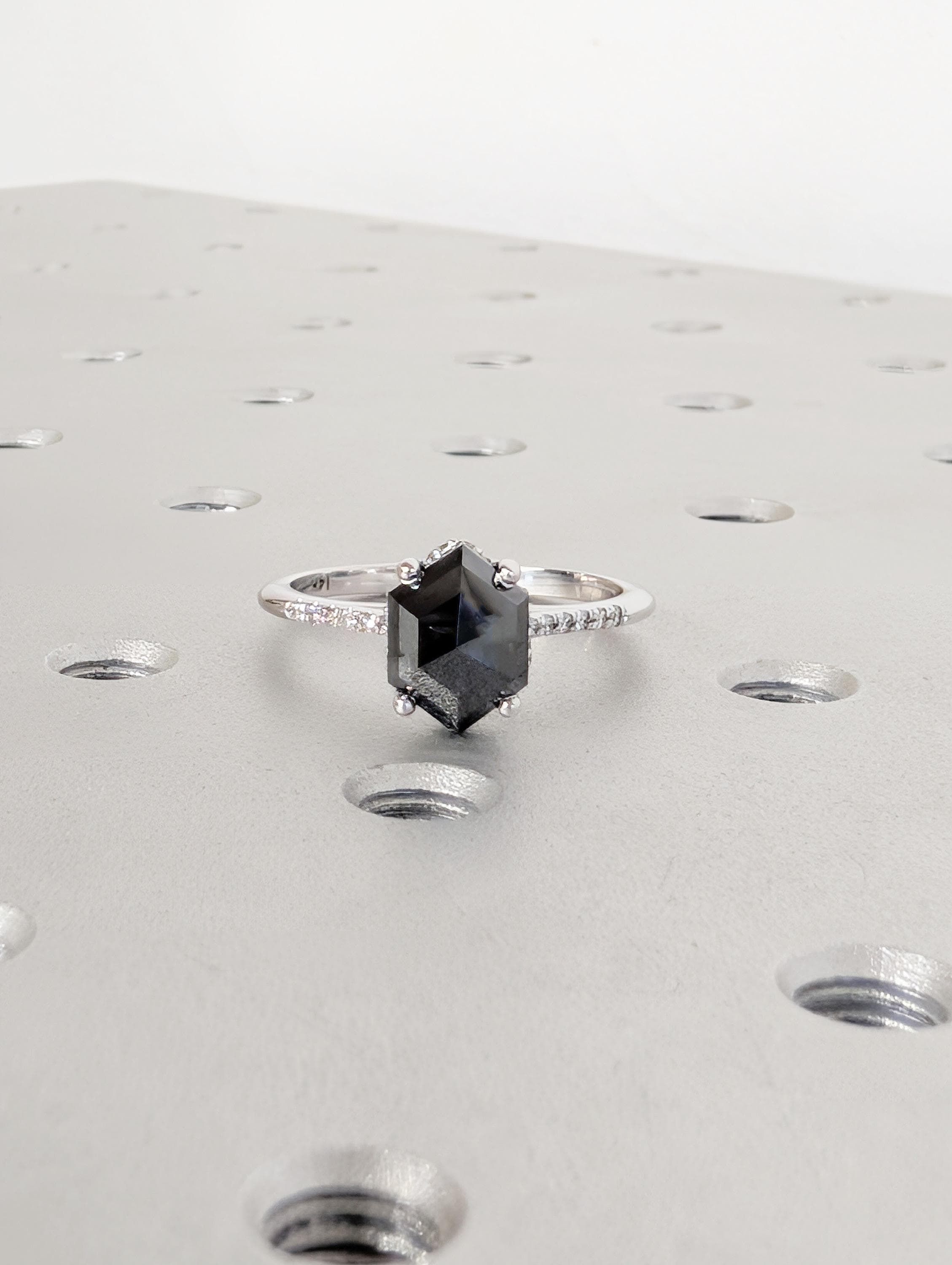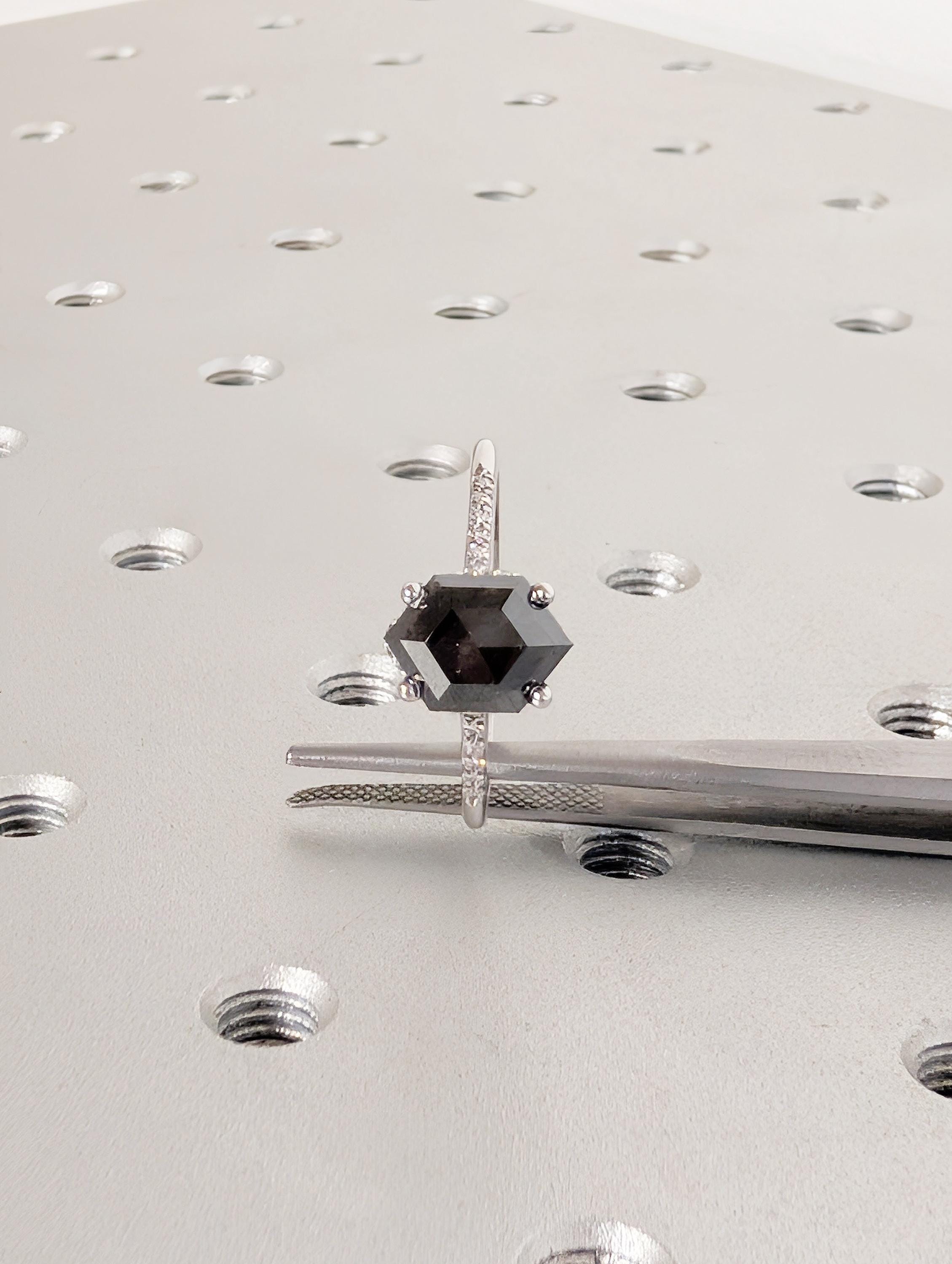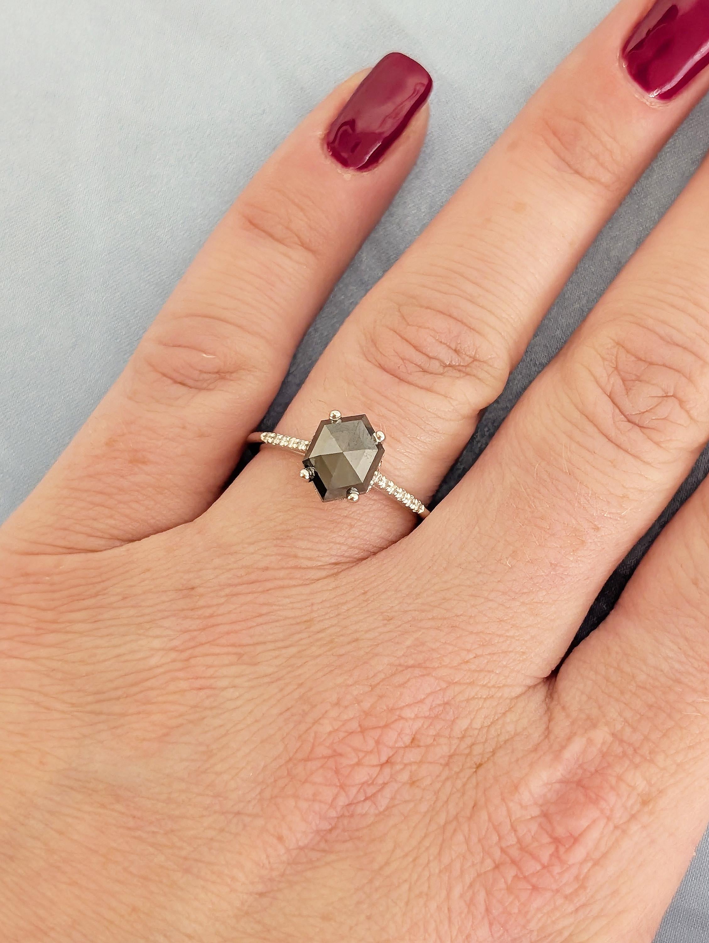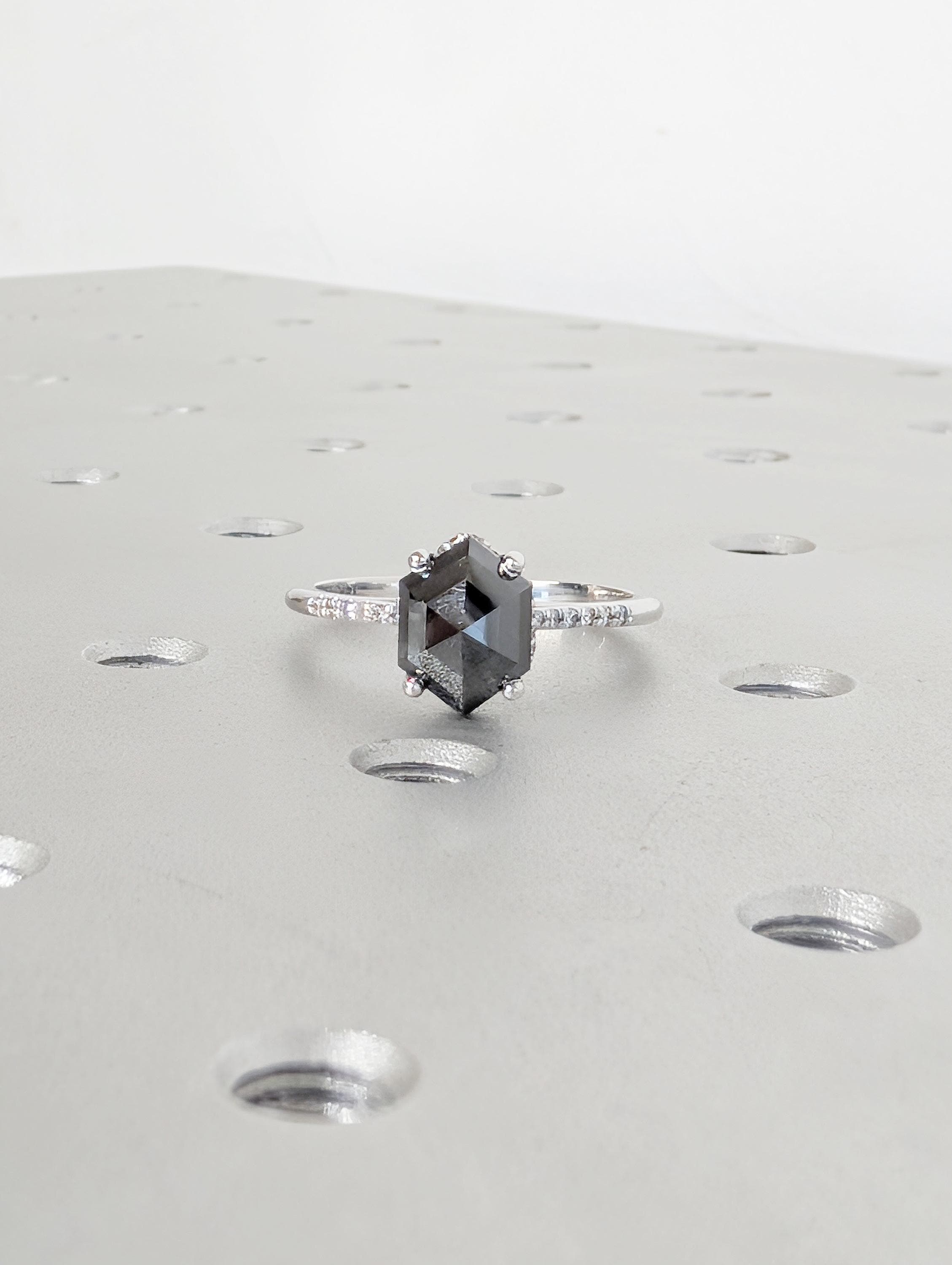 Salt and Pepper Diamond Ring, 14k White Gold Hexagon Engagement Ring, Pave Band