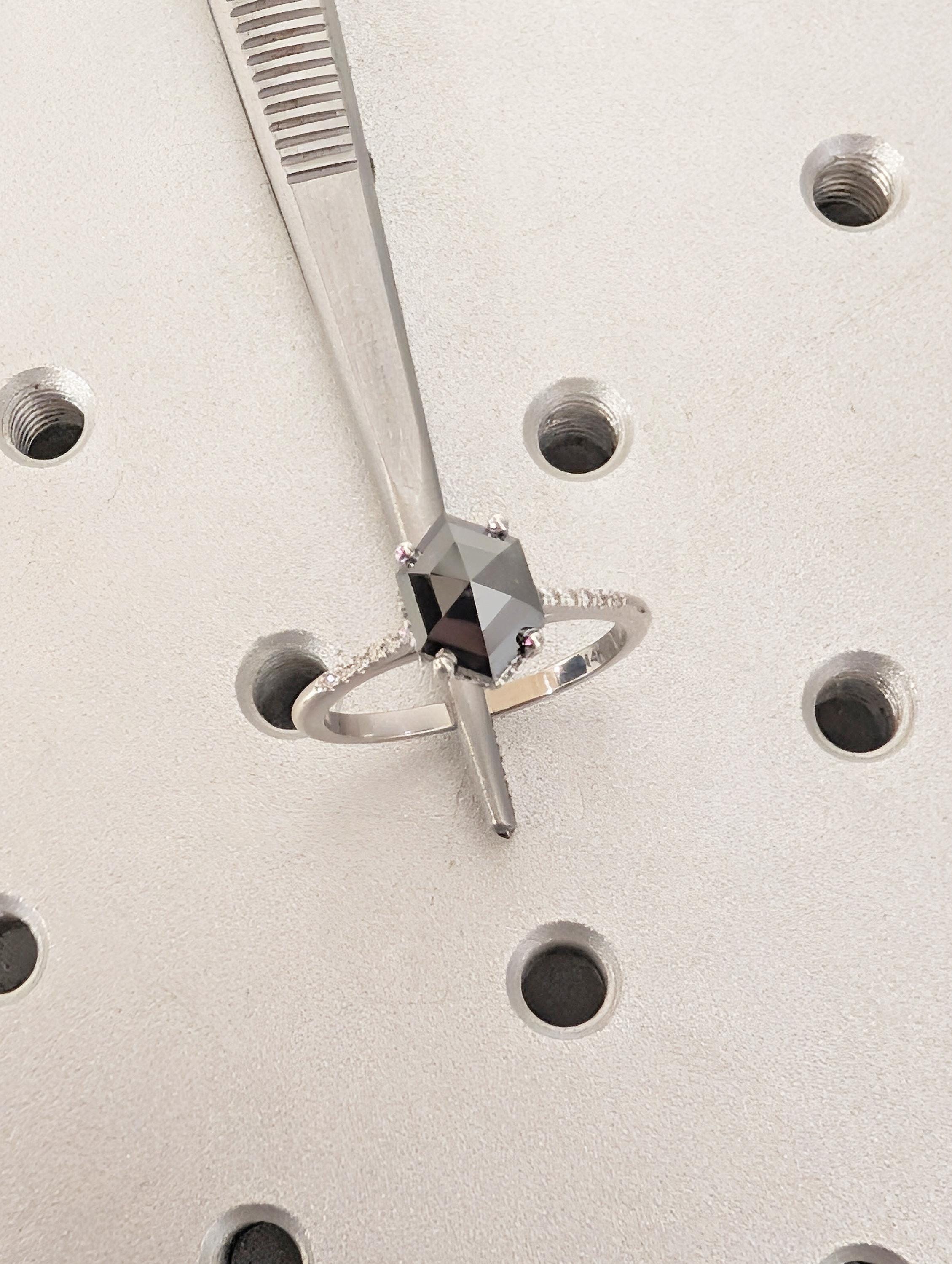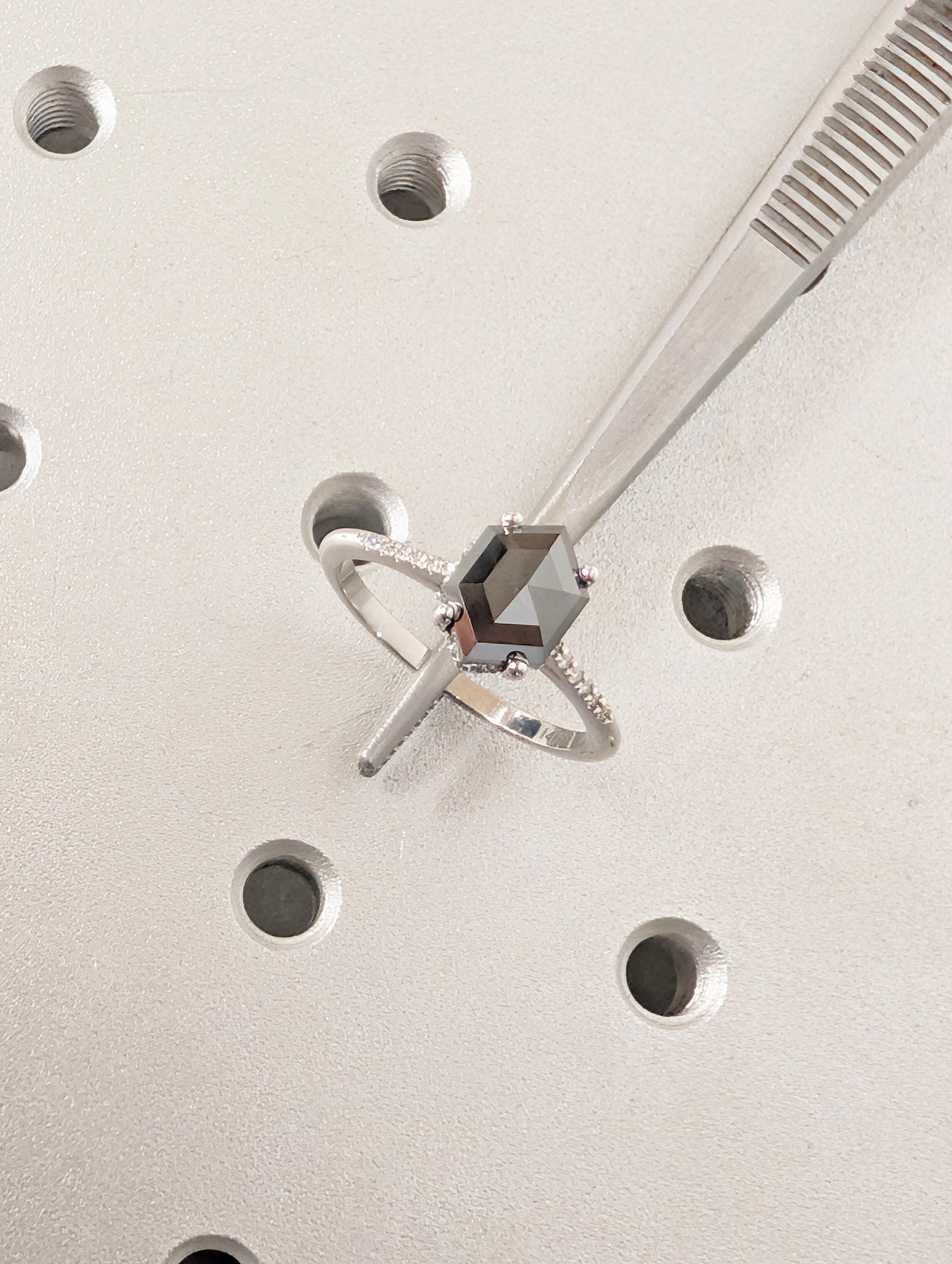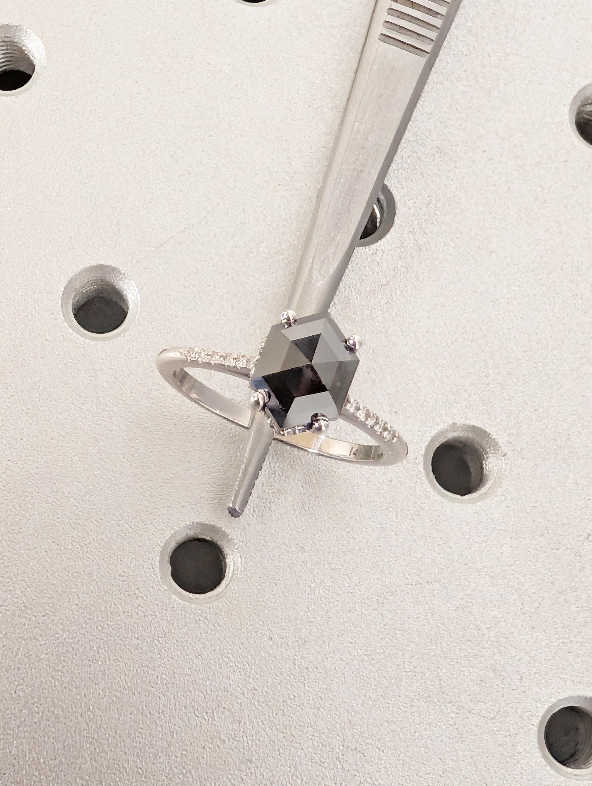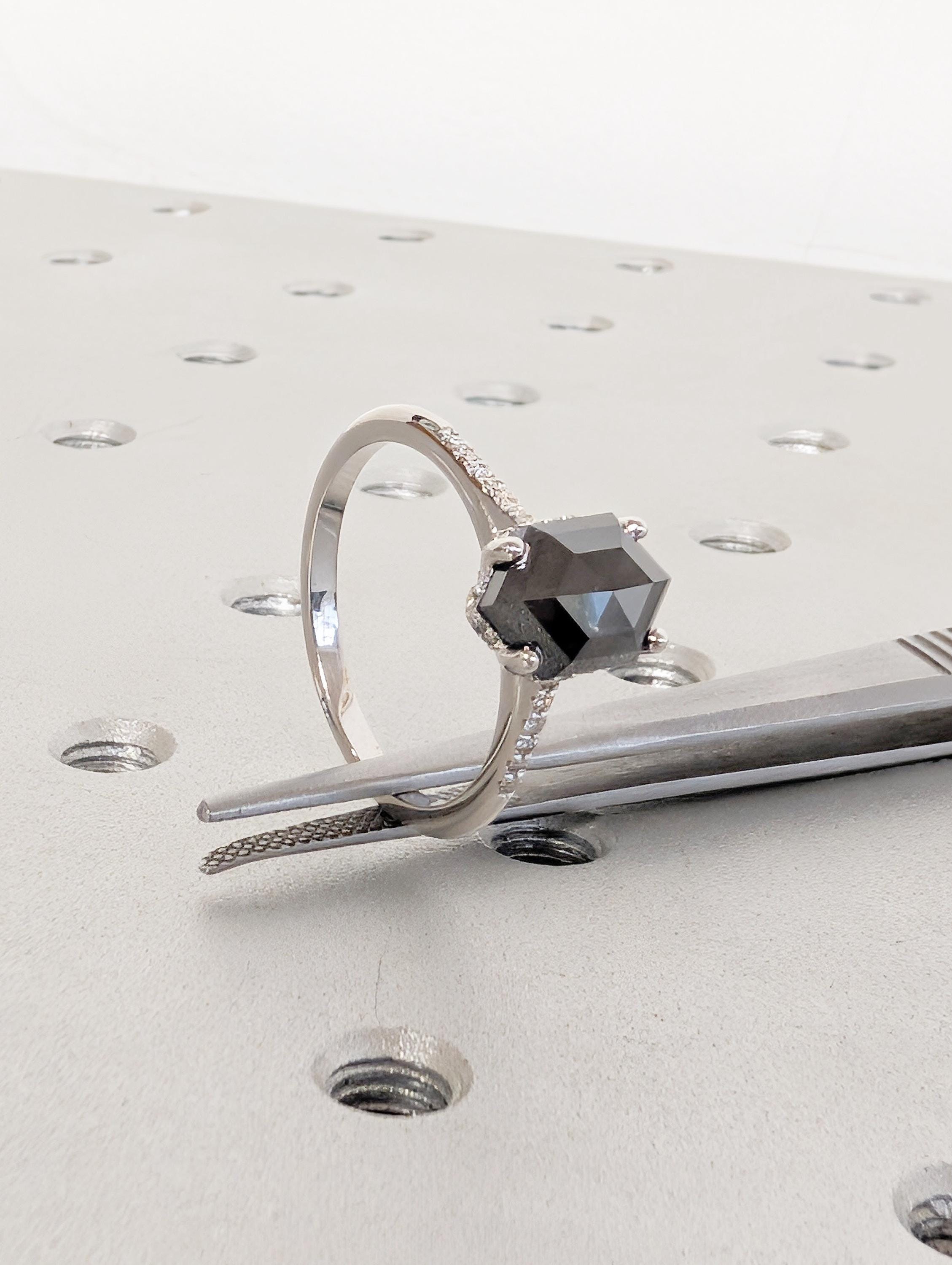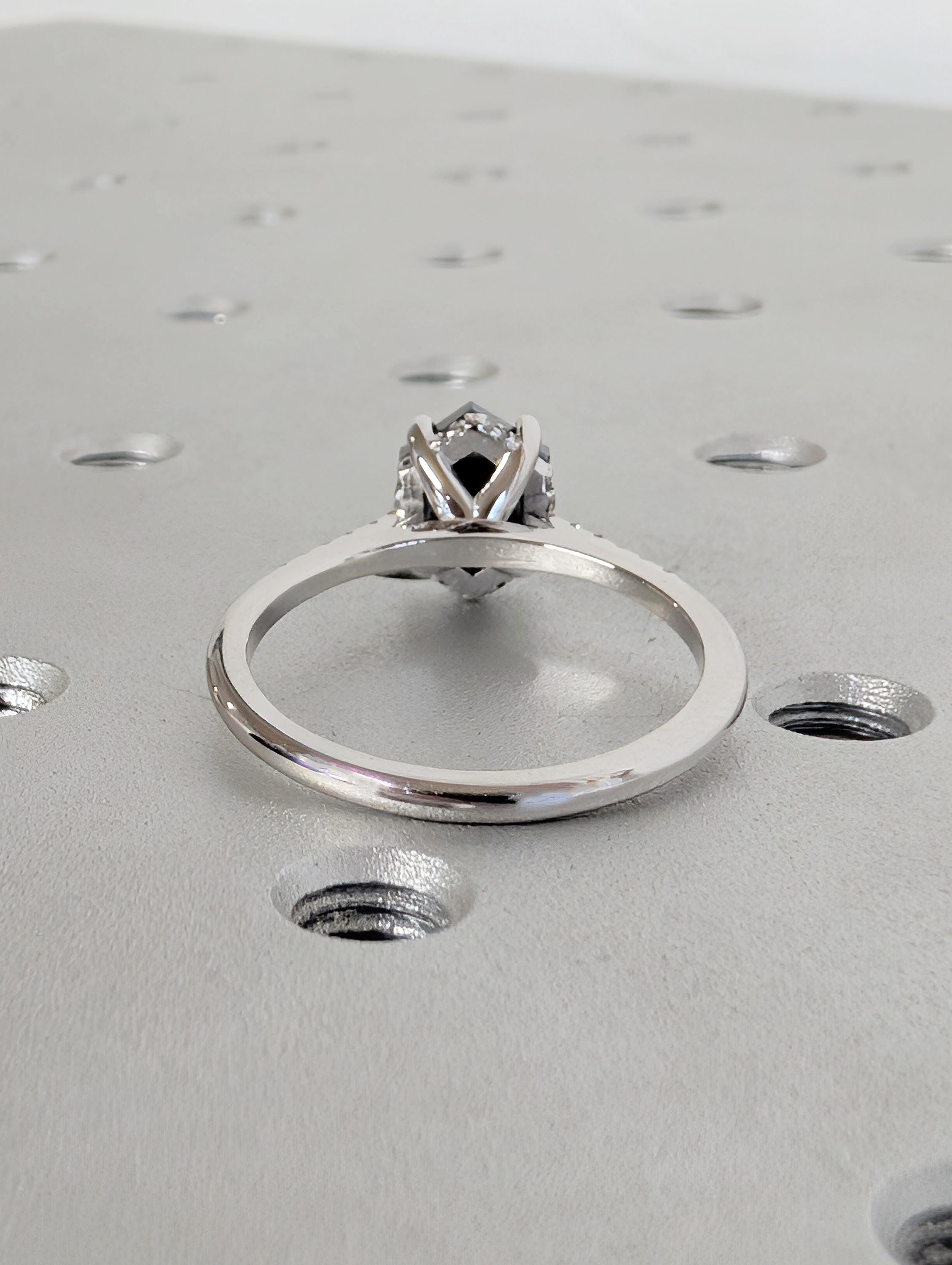 Salt and Pepper Diamond Ring, 14k White Gold Hexagon Engagement Ring, Pave Band