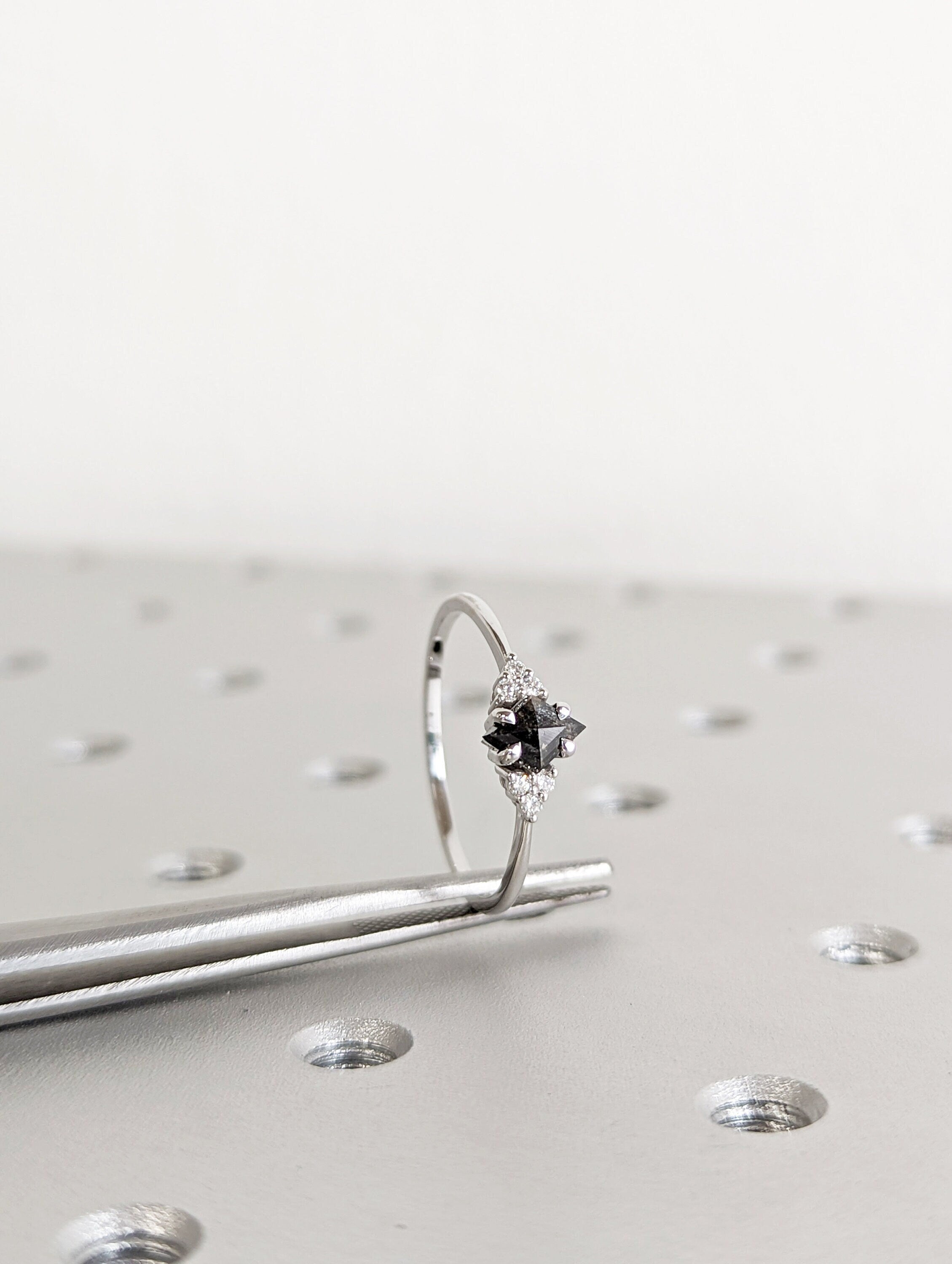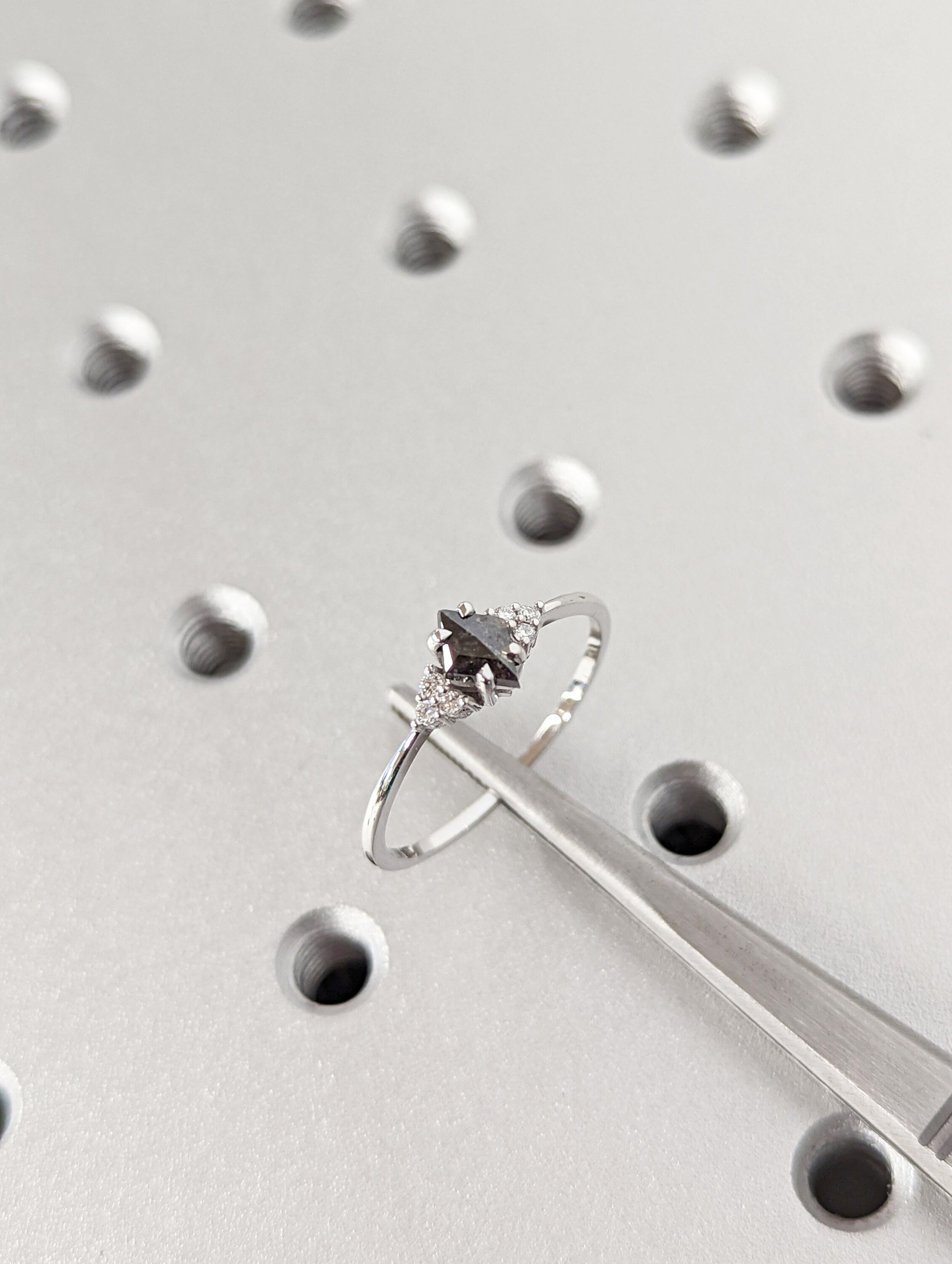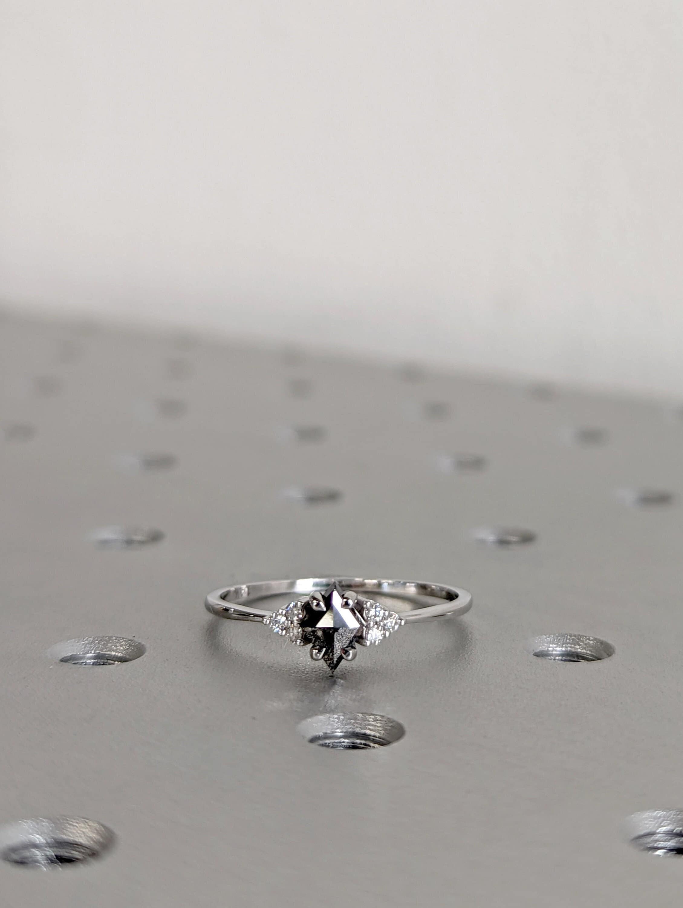 Raw Diamond Kite Baguette Diamond, Salt and Pepper, Unique Engagement Ring, Rose Cut Geometric Diamond Ring, 14k Gold, Custom Handmade