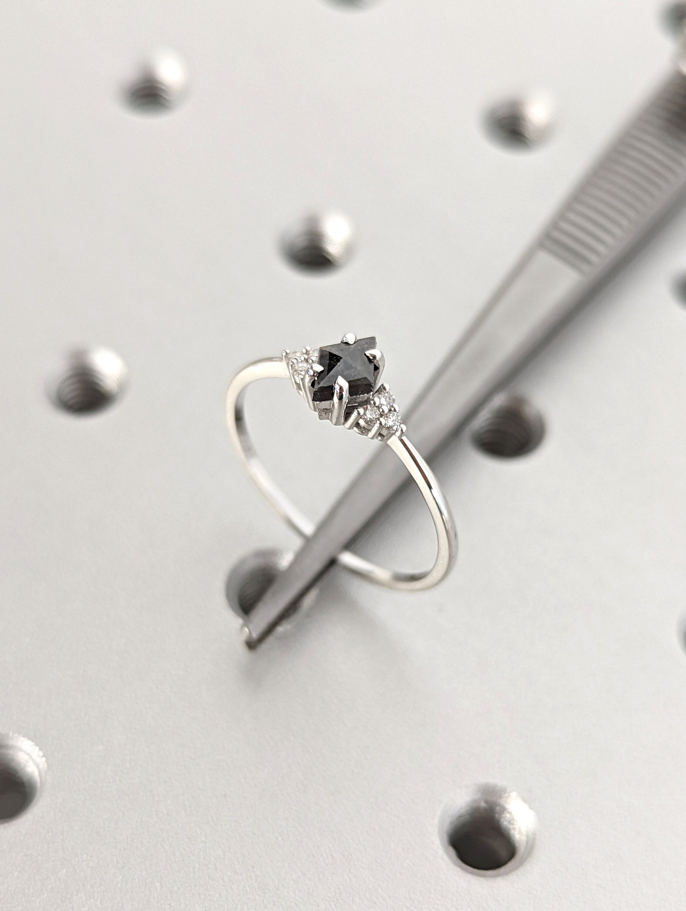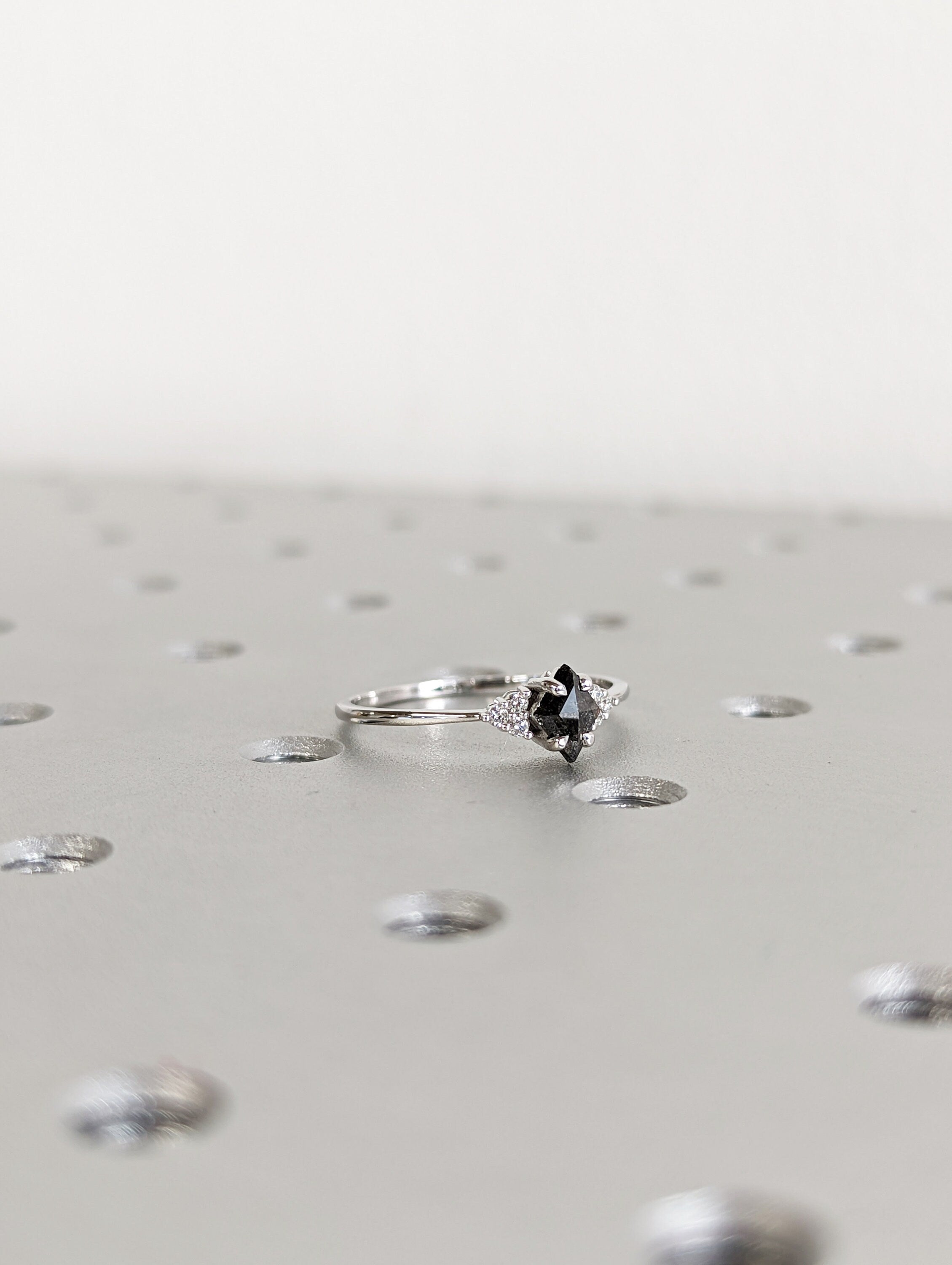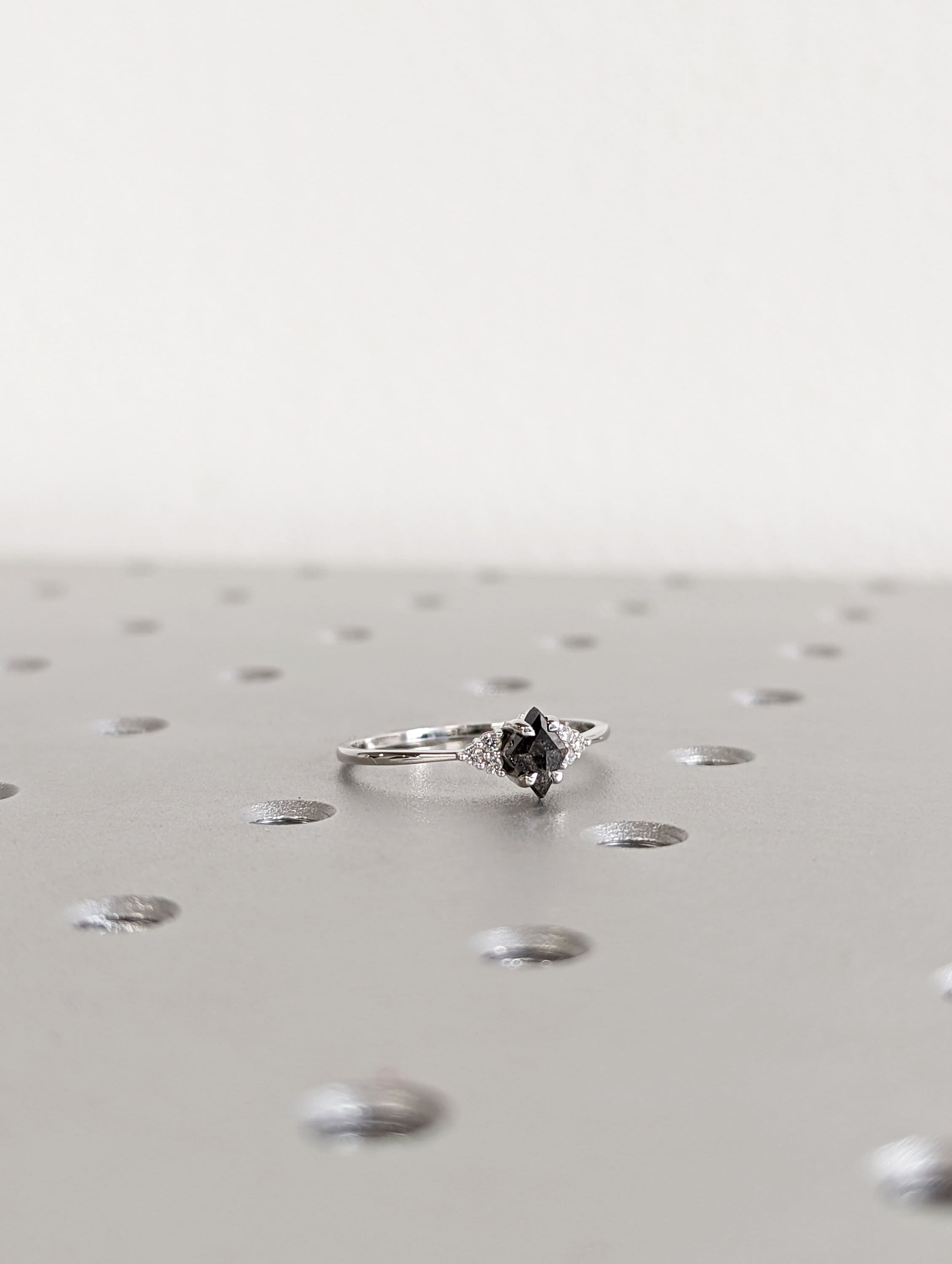 Raw Diamond Kite Baguette Diamond, Salt and Pepper, Unique Engagement Ring, Rose Cut Geometric Diamond Ring, 14k Gold, Custom Handmade