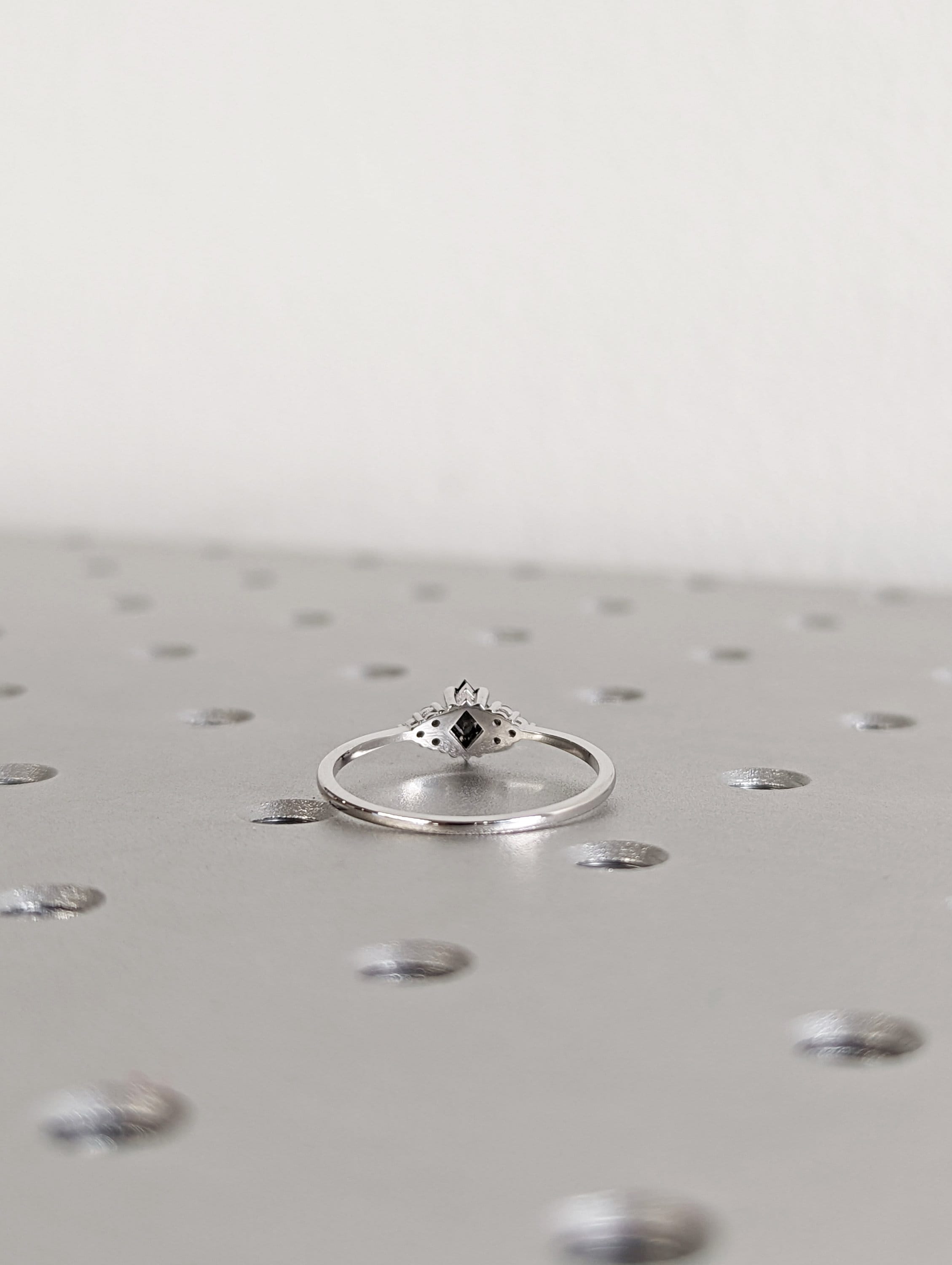 A cluster of 6 round brilliant cut diamonds, with brilliant sparkle and luster, accompany the center salt and pepper diamond, with a kite shape, that gives a strong presence of vintage scent. This beautiful ring is made to order from hand selected and cut