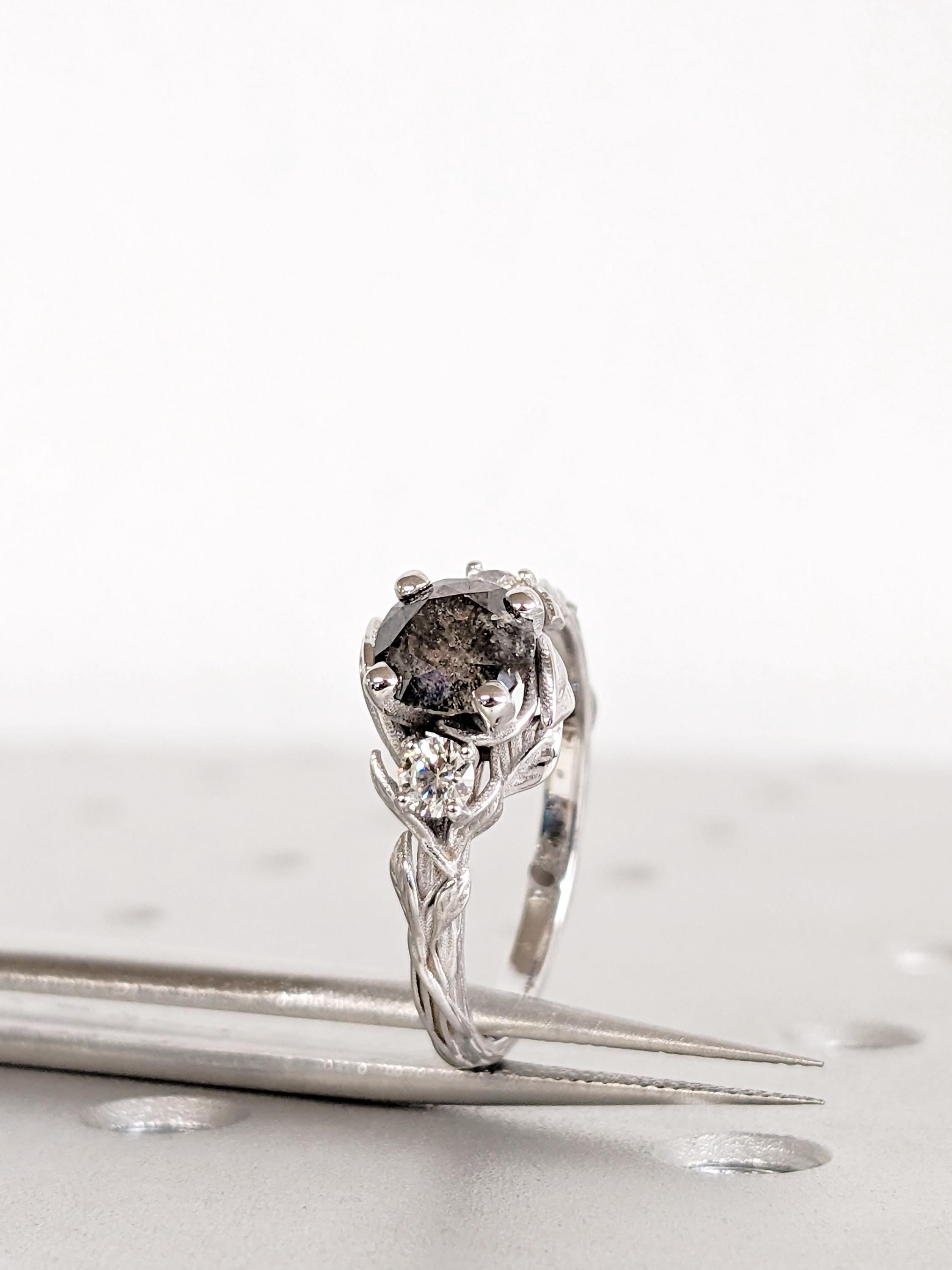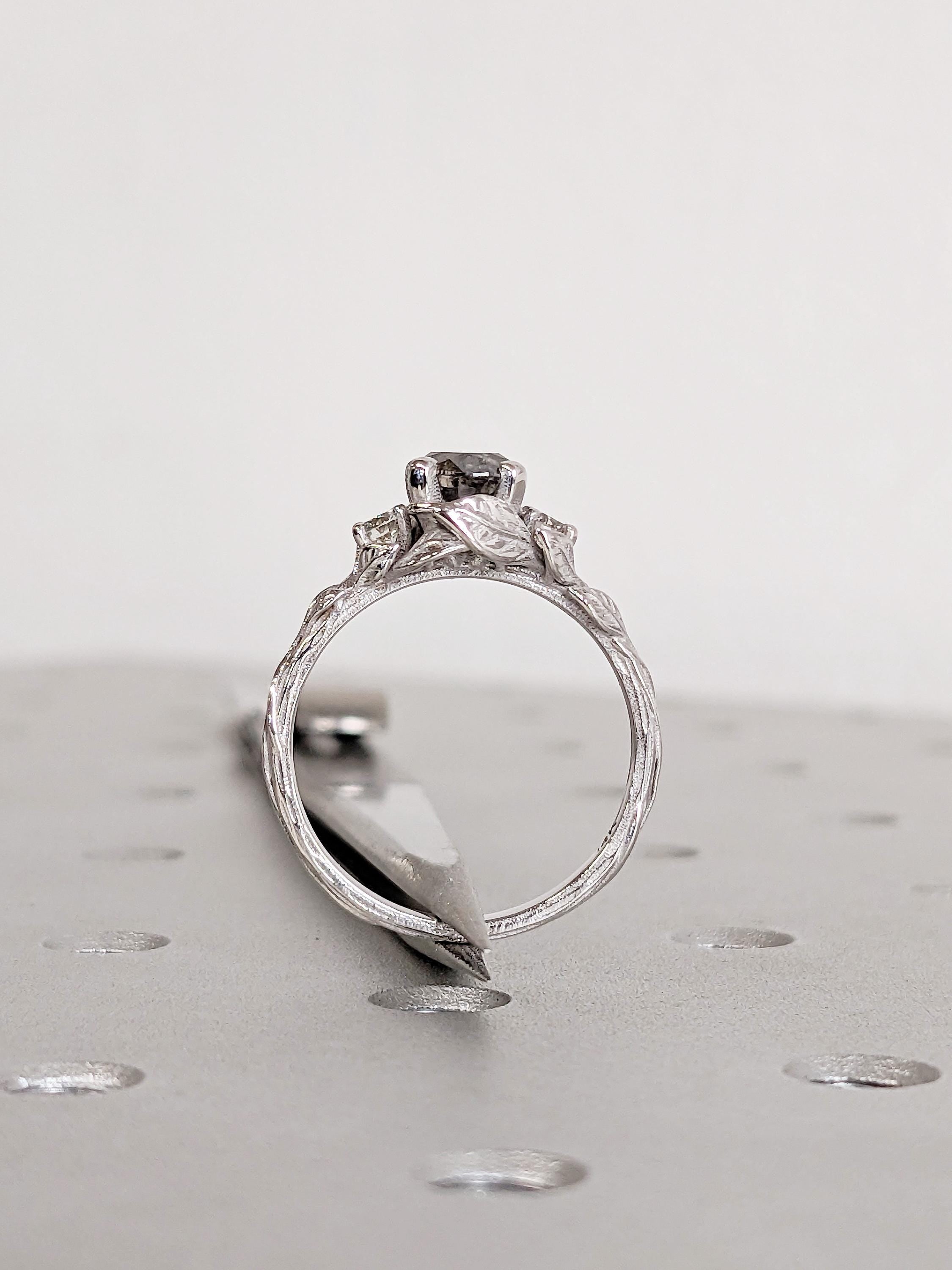 Salt and Pepper Diamond Ring in 14K White Gold, Round Cut Leaf Engagement Ring
