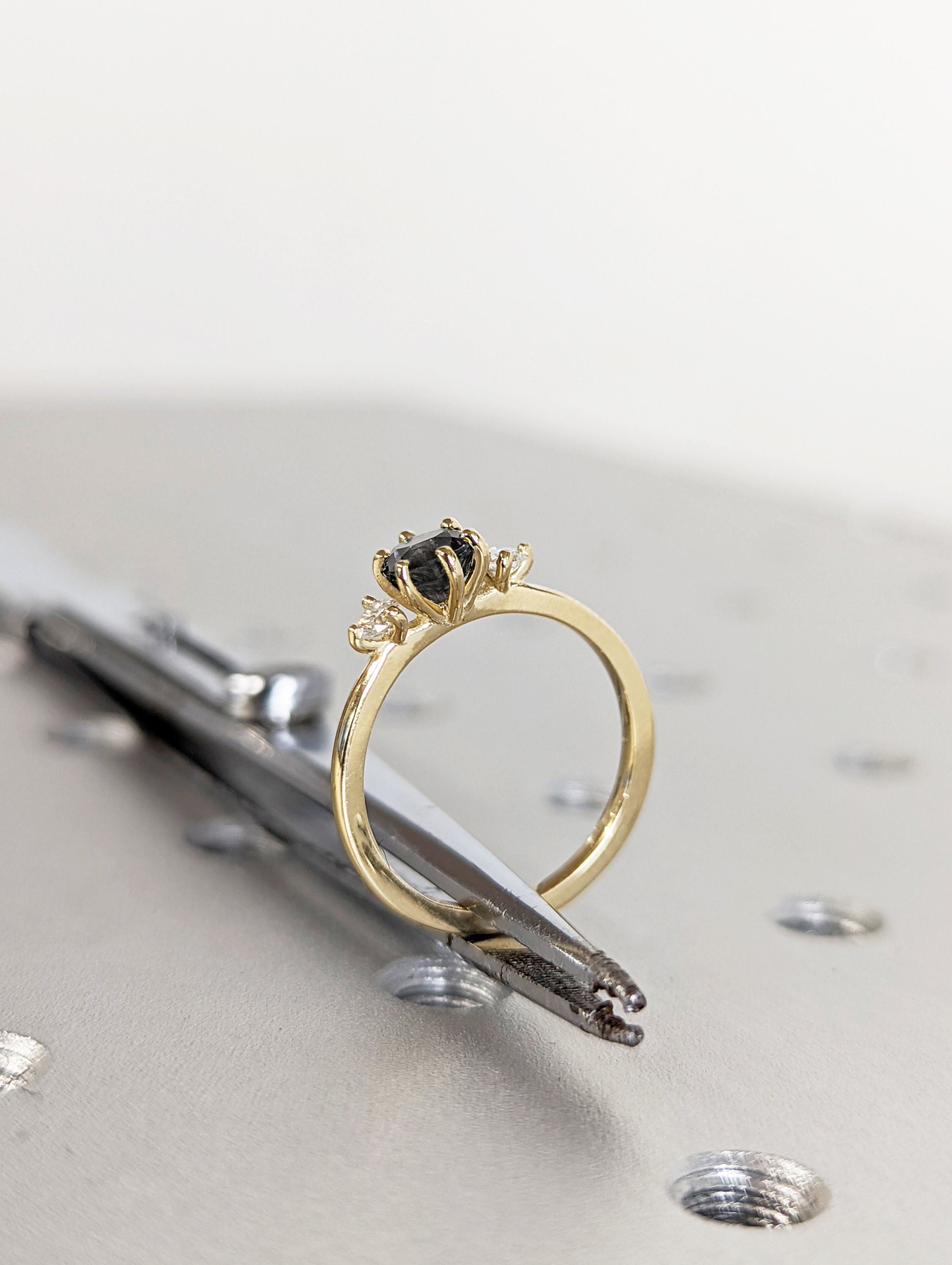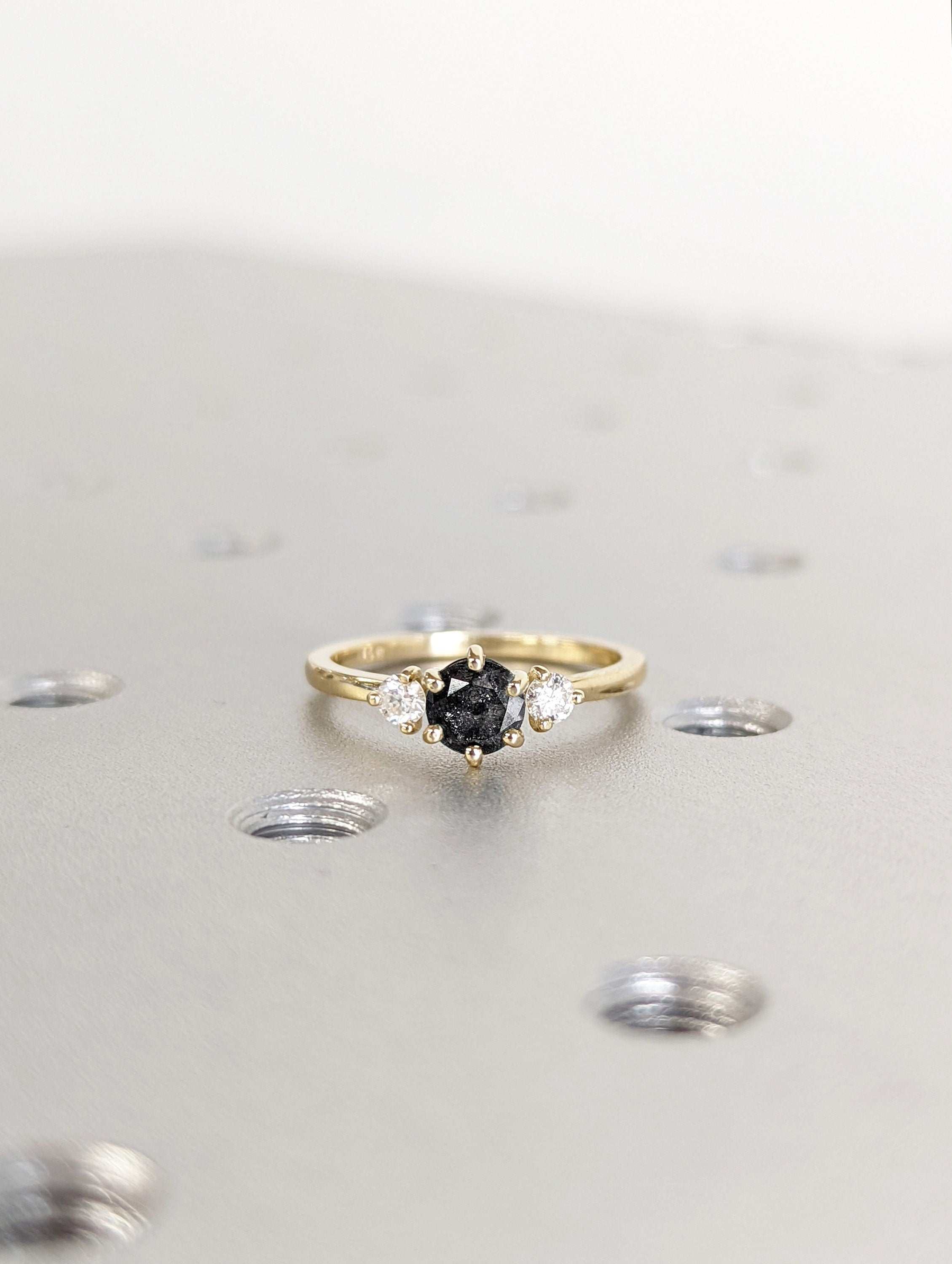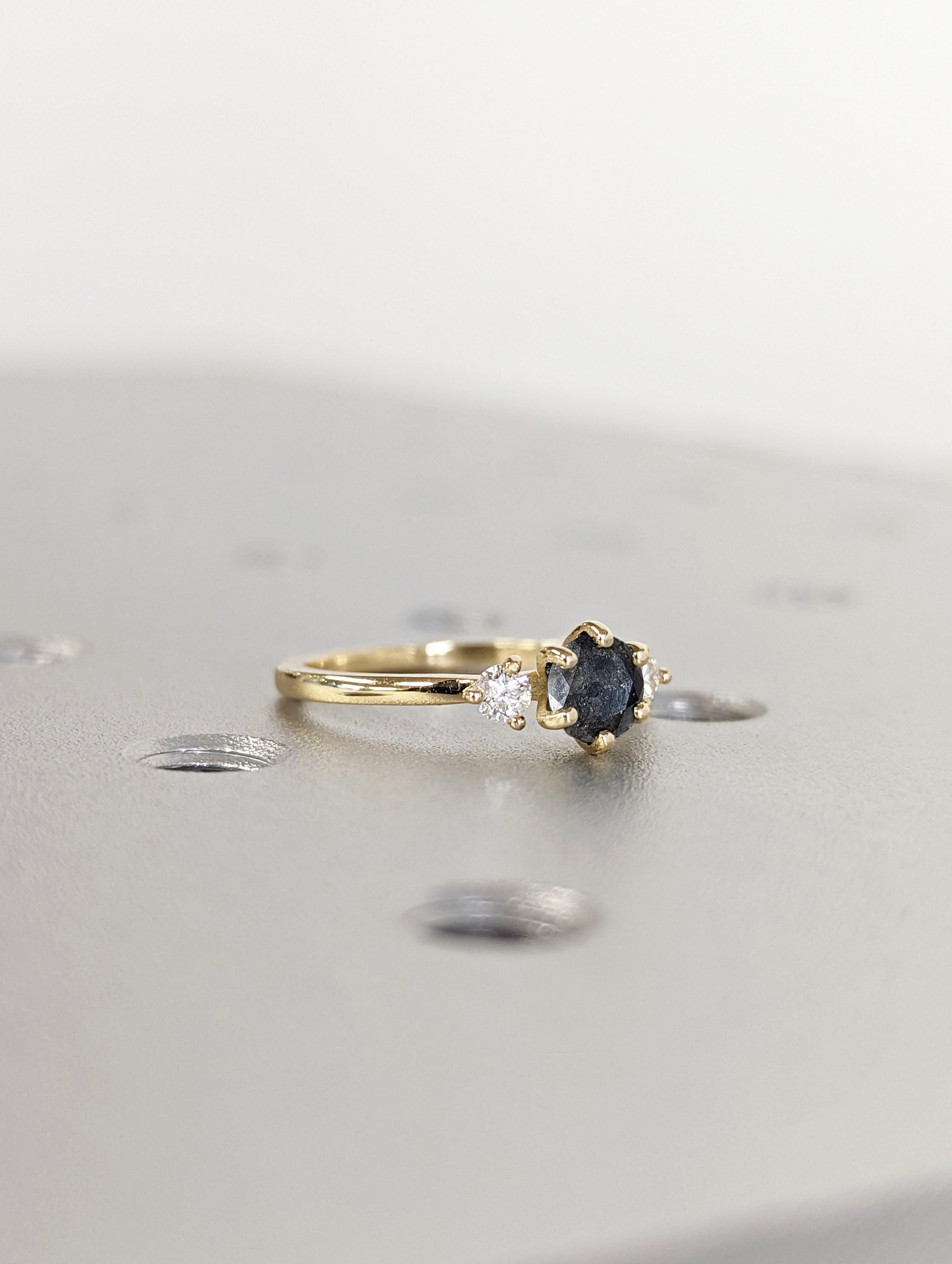 Salt and pepper engagement ring round cut vintage engagement ring prong set ring diamond ring three stone anniversary ring 14k yellow gold