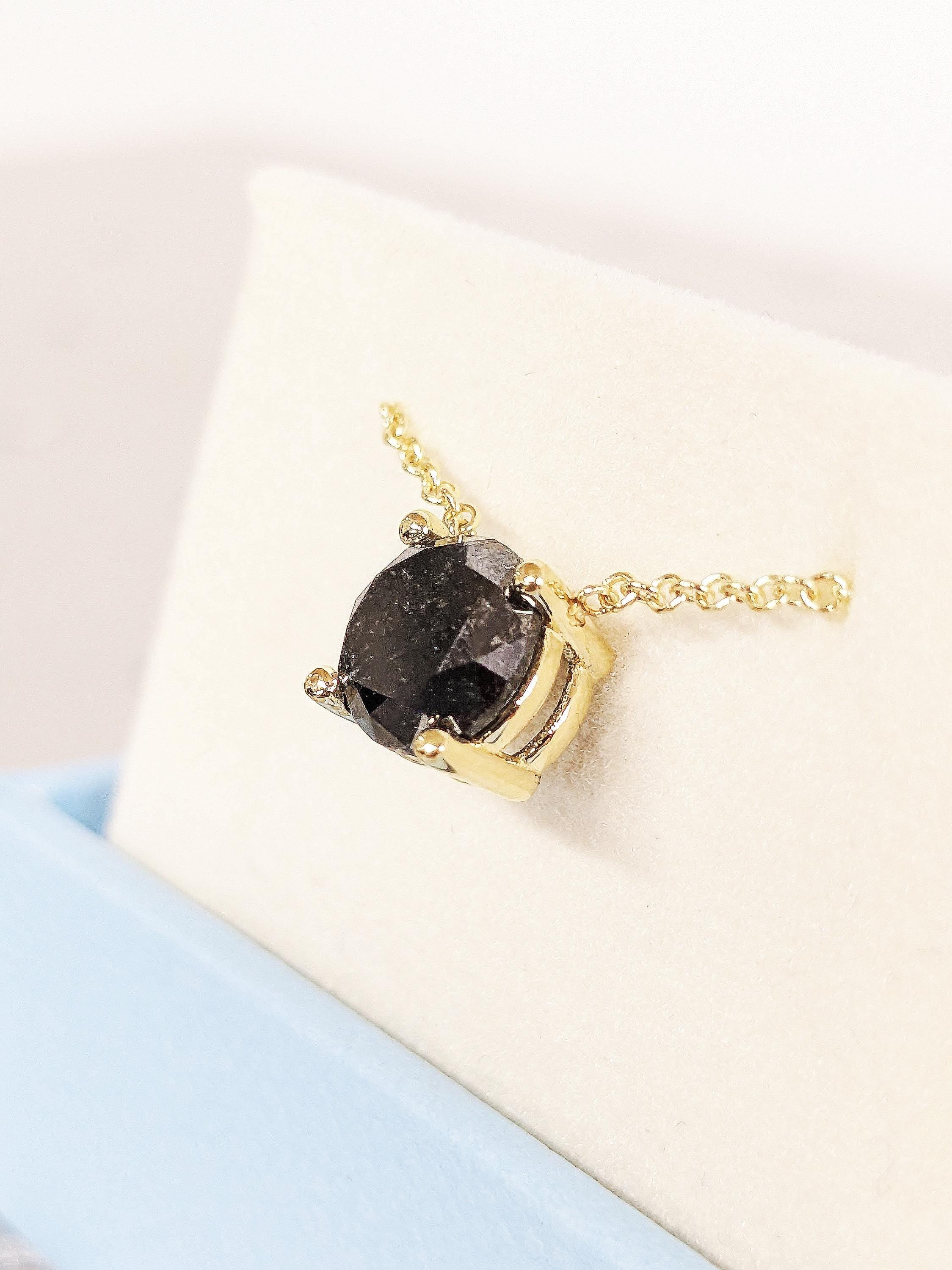 Discover a touch of celestial charm with this Salt & Pepper Diamond Necklace. The unique diamond’s natural speckles reflect a cosmic beauty. One of a kind, just like your story. Designed with a minimalist solitaire setting, this dainty pendant adds effortless elegance, whether worn alone or layered. Perfect as a bridal necklace, anniversary gift or vintage inspired keepsake, it’s a modern heirloom crafted for dreamers and romantics.