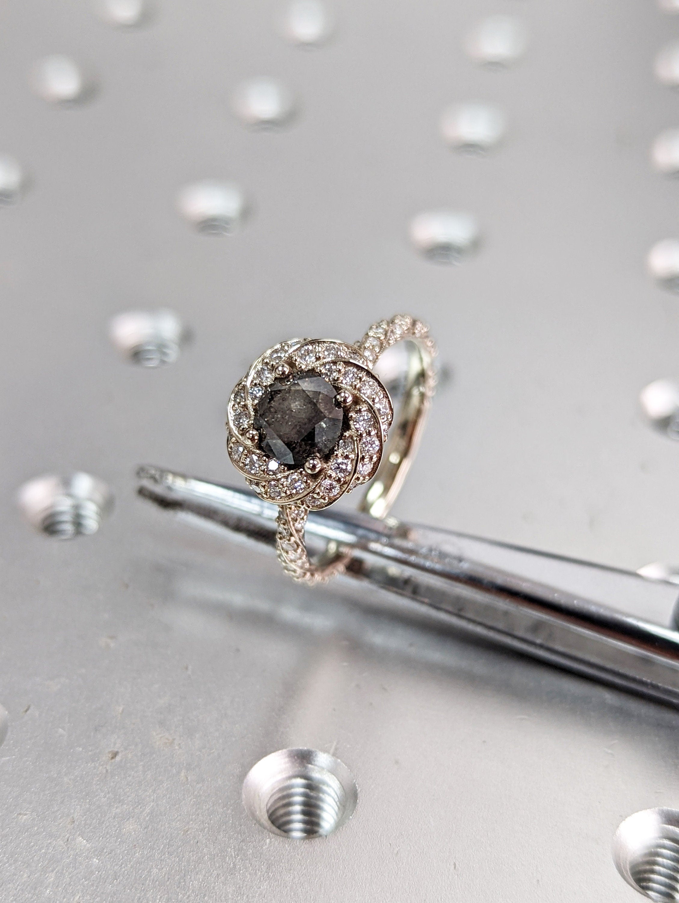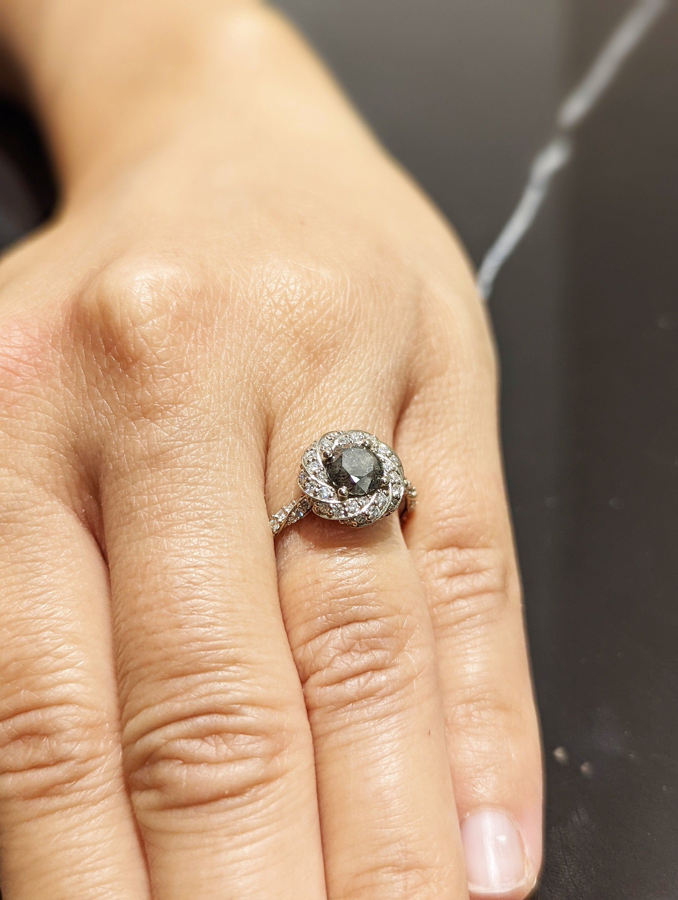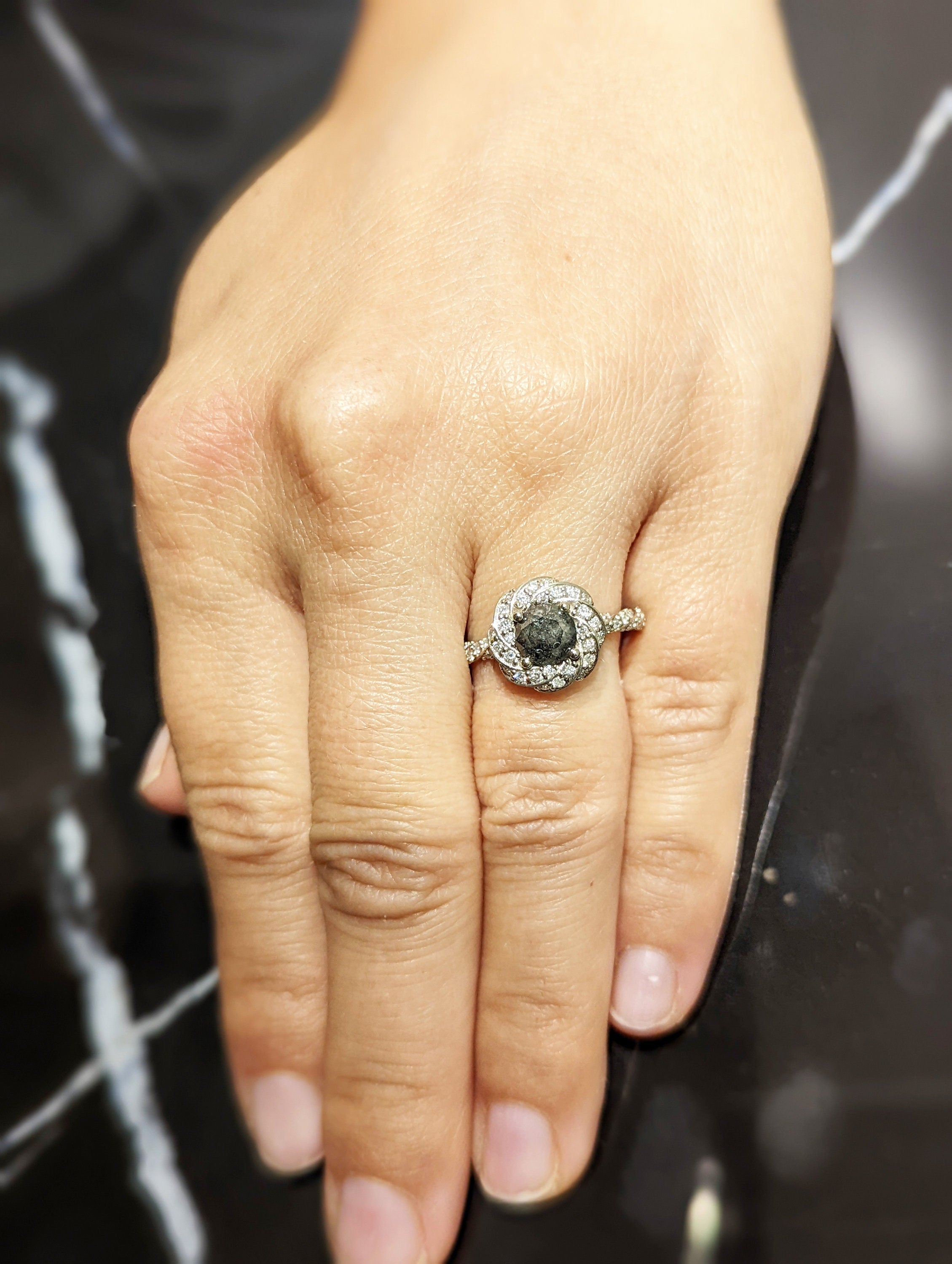 Salt & pepper diamond ring, Grey diamond engagement ring, Natural diamond cluster, Round Cut Halo Engagement Ring Solid 14k White Gold