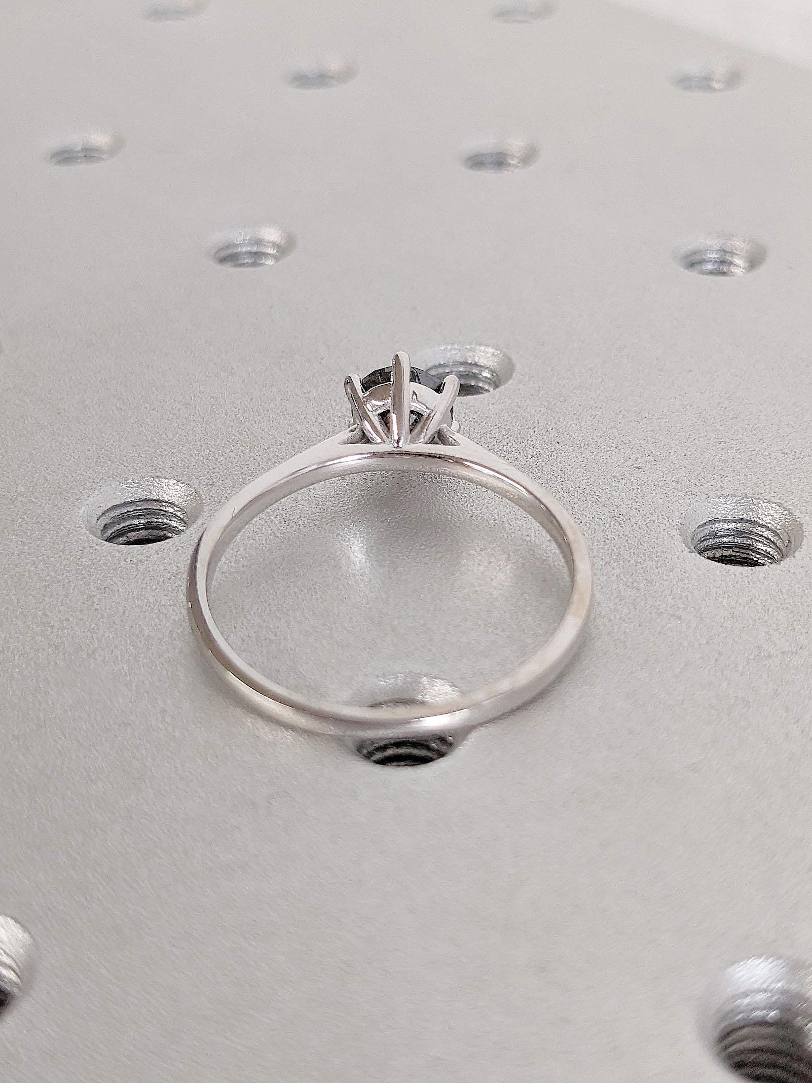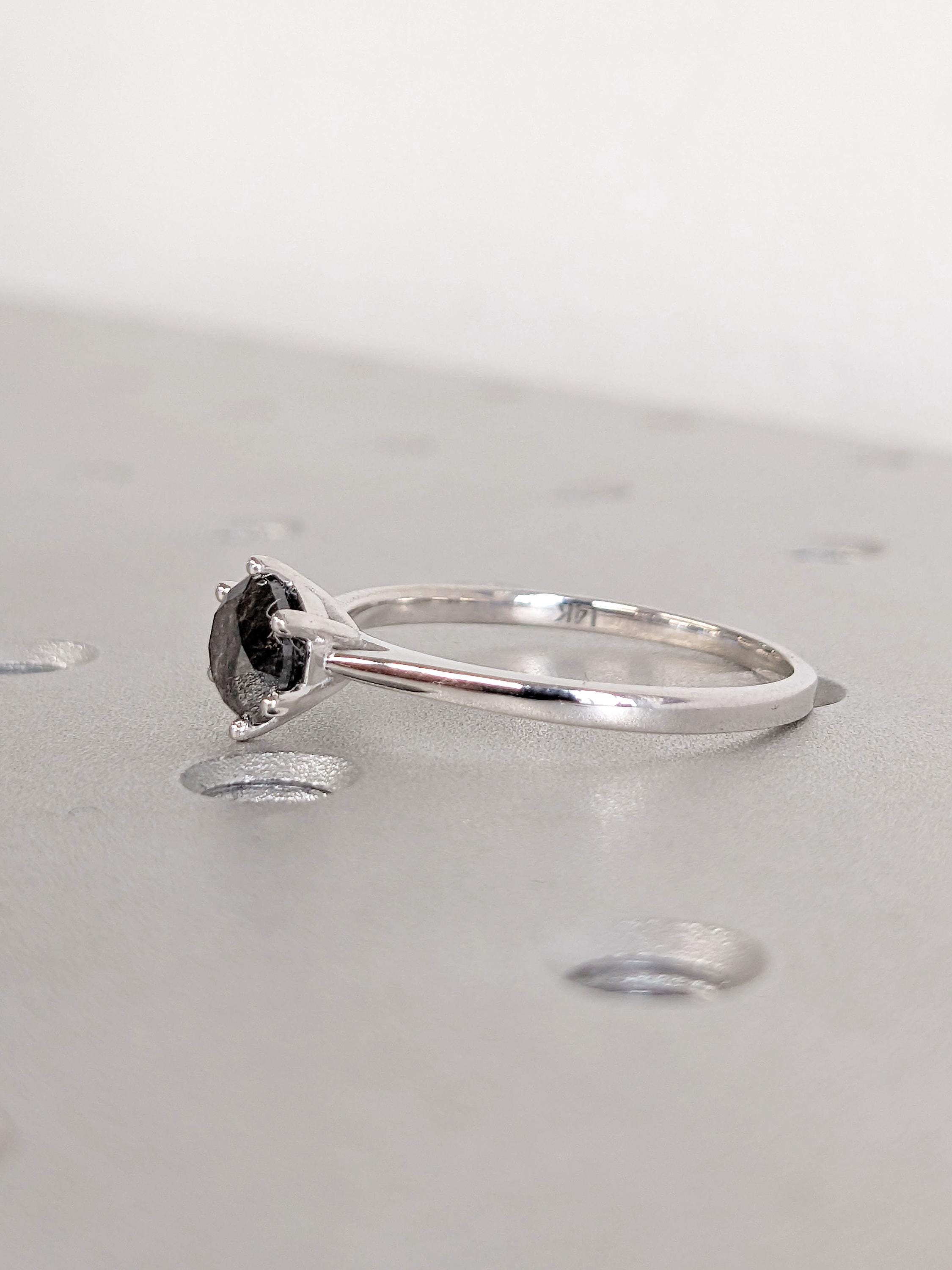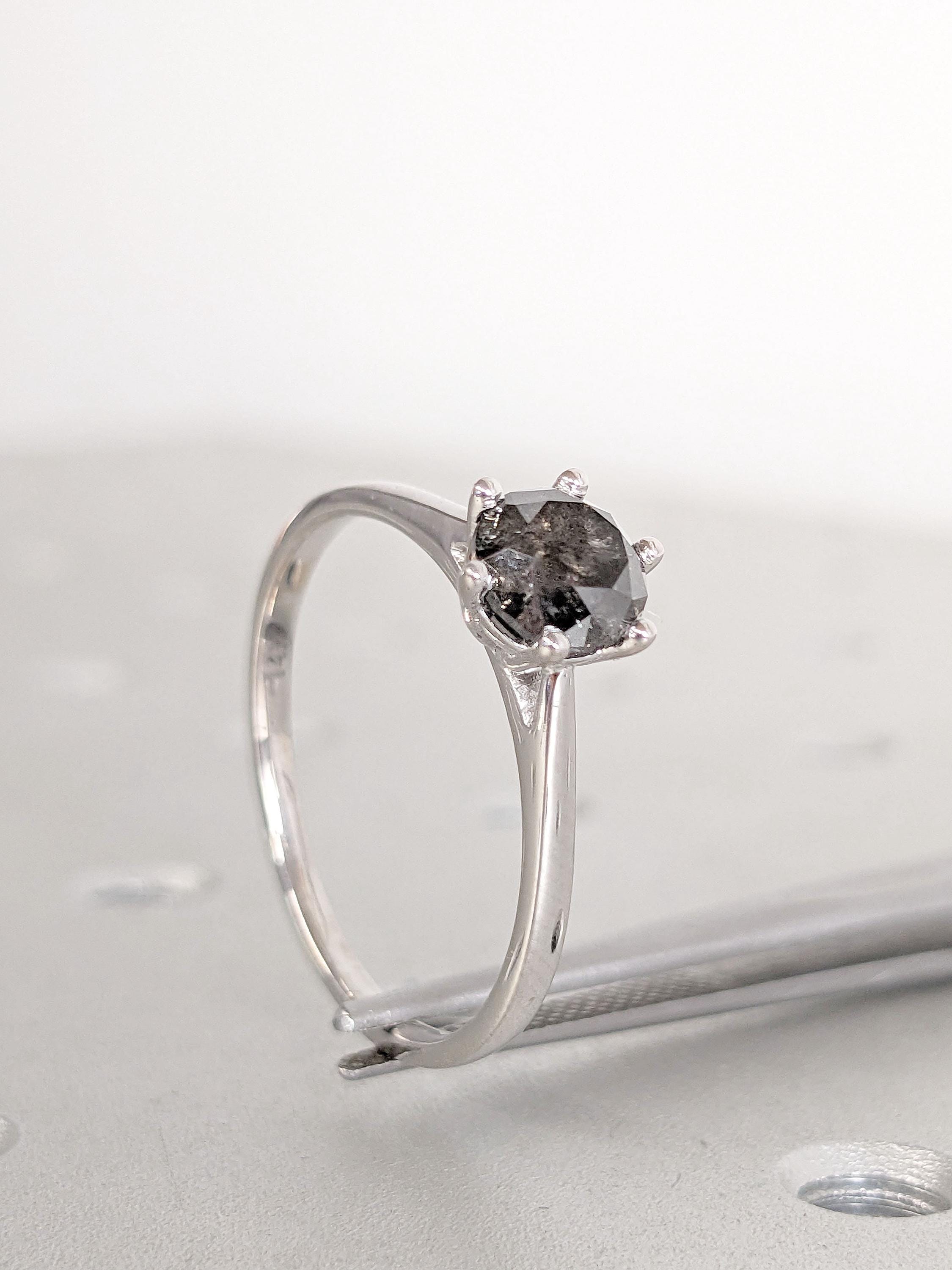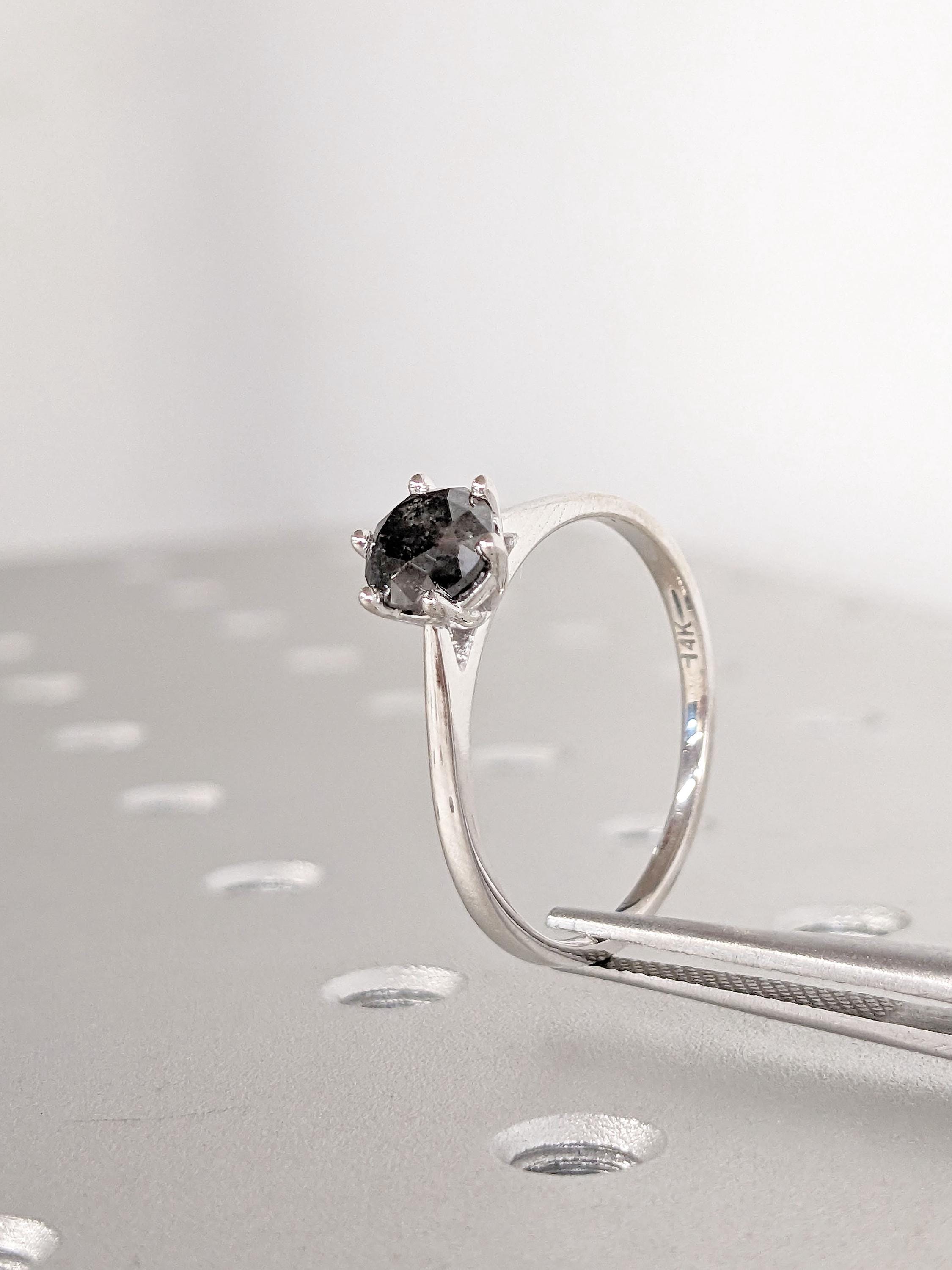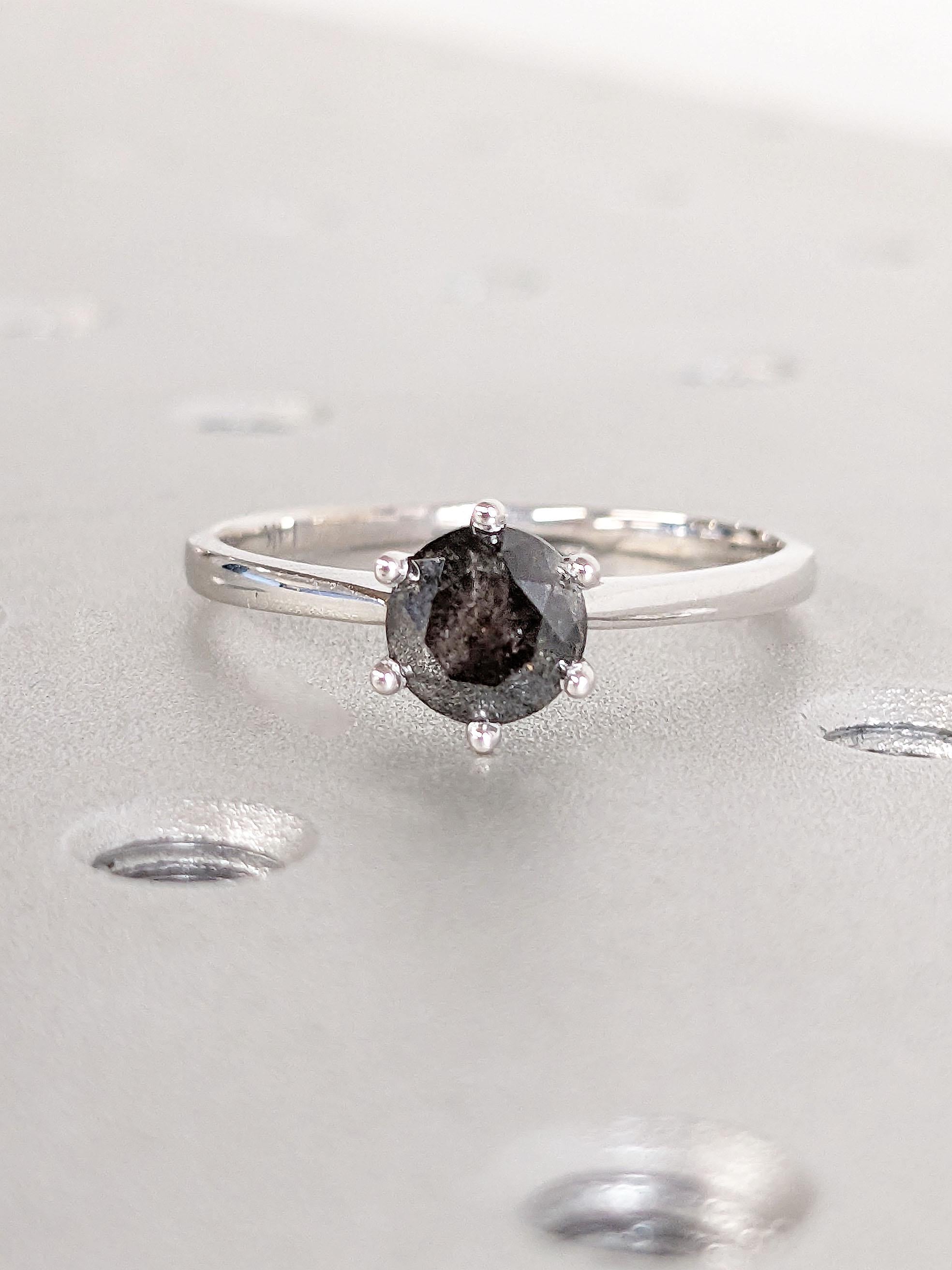 A timeless solitaire ring, features a round cut Salt and Pepper Diamond center stone, held elegantly by classic six prong cathedral setting, set on a slightly tapered band of 2mm width. The perfect jewelry for a minimalist and sophisticated style.