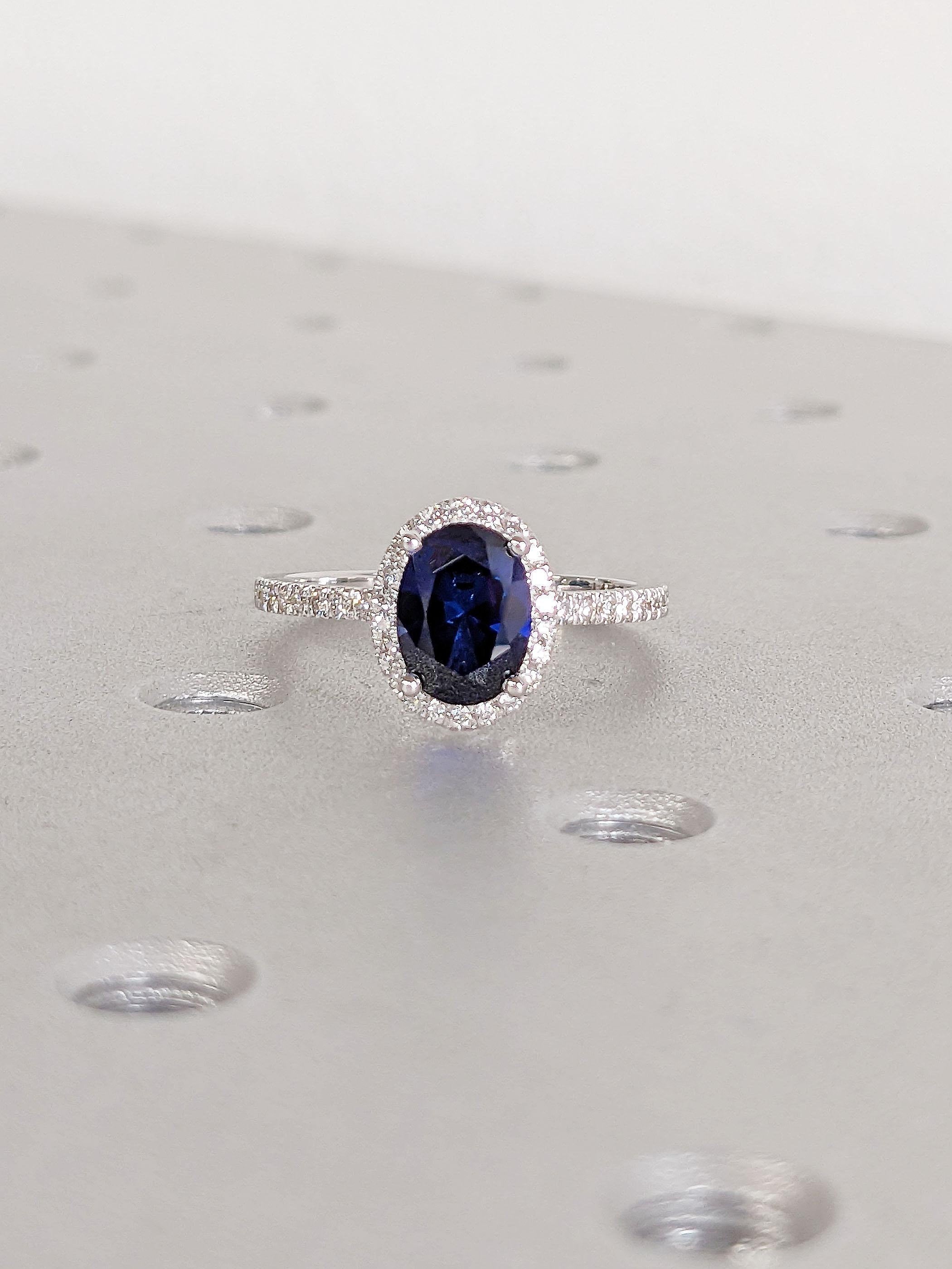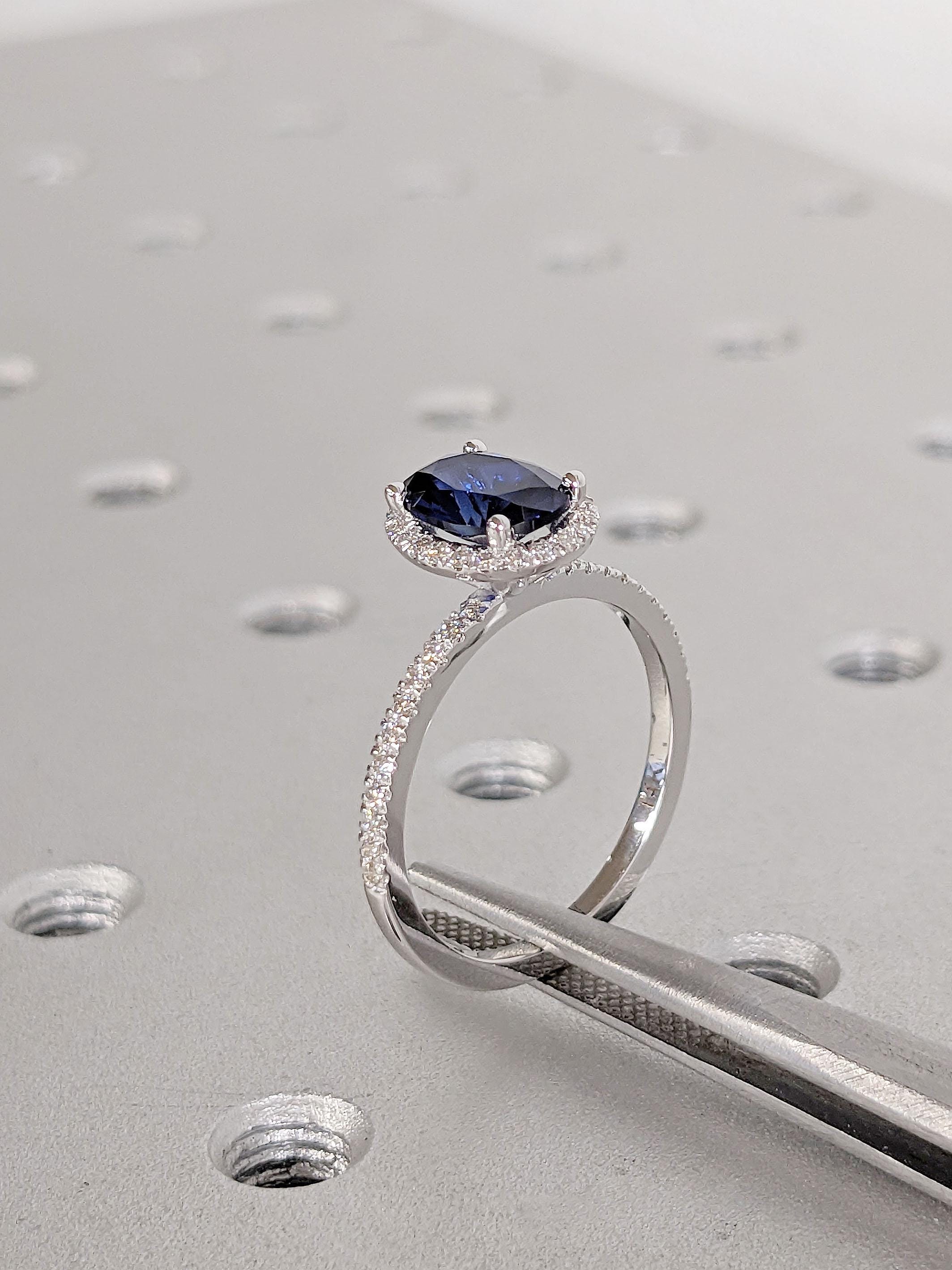 This exquisite ring features a brilliant oval cut Lab Created Sapphire at its center, surrounded by a sparkling halo of smaller stones, designed to catch the light from every angle. The perfect blend of timeless beauty and modern sophistication. Ideal for proposals or special occasions, this elegant statement ring promises to leave a lasting impression. Celebrate your love story with this breathtaking piece, and personalized it with your choice of natural diamonds, lab diamonds or moissanites for the side stones.