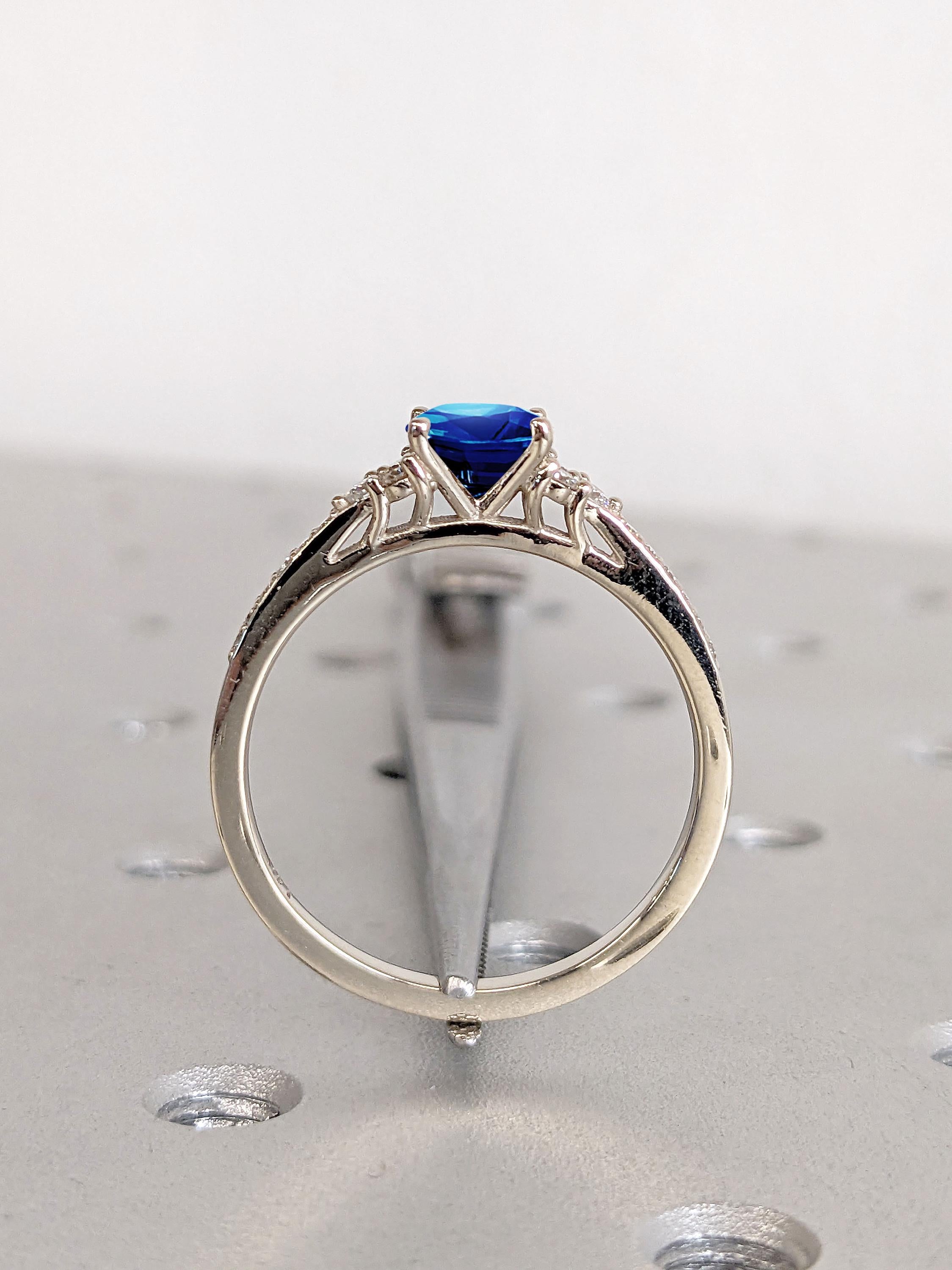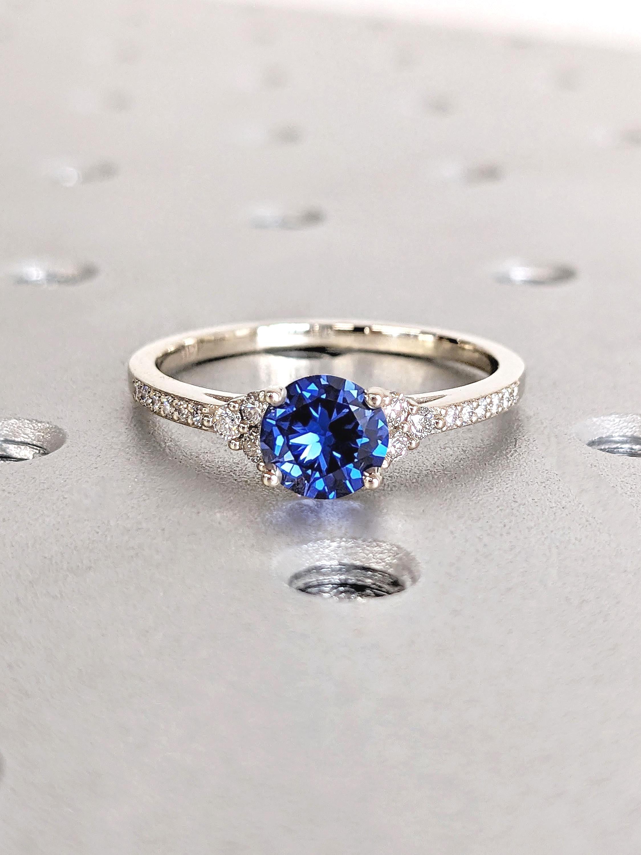 A dazzling handmade ring, featuring a round cut Lab Sapphire center, accented by cluster of round cut side stones. Set on a thin band of 1.7mm width paved with tiny round white gemstones of natural diamonds, lab diamonds or moissanites. This luxurious sparkling ring is a wonderful statement piece to be added to your jewelry collections.