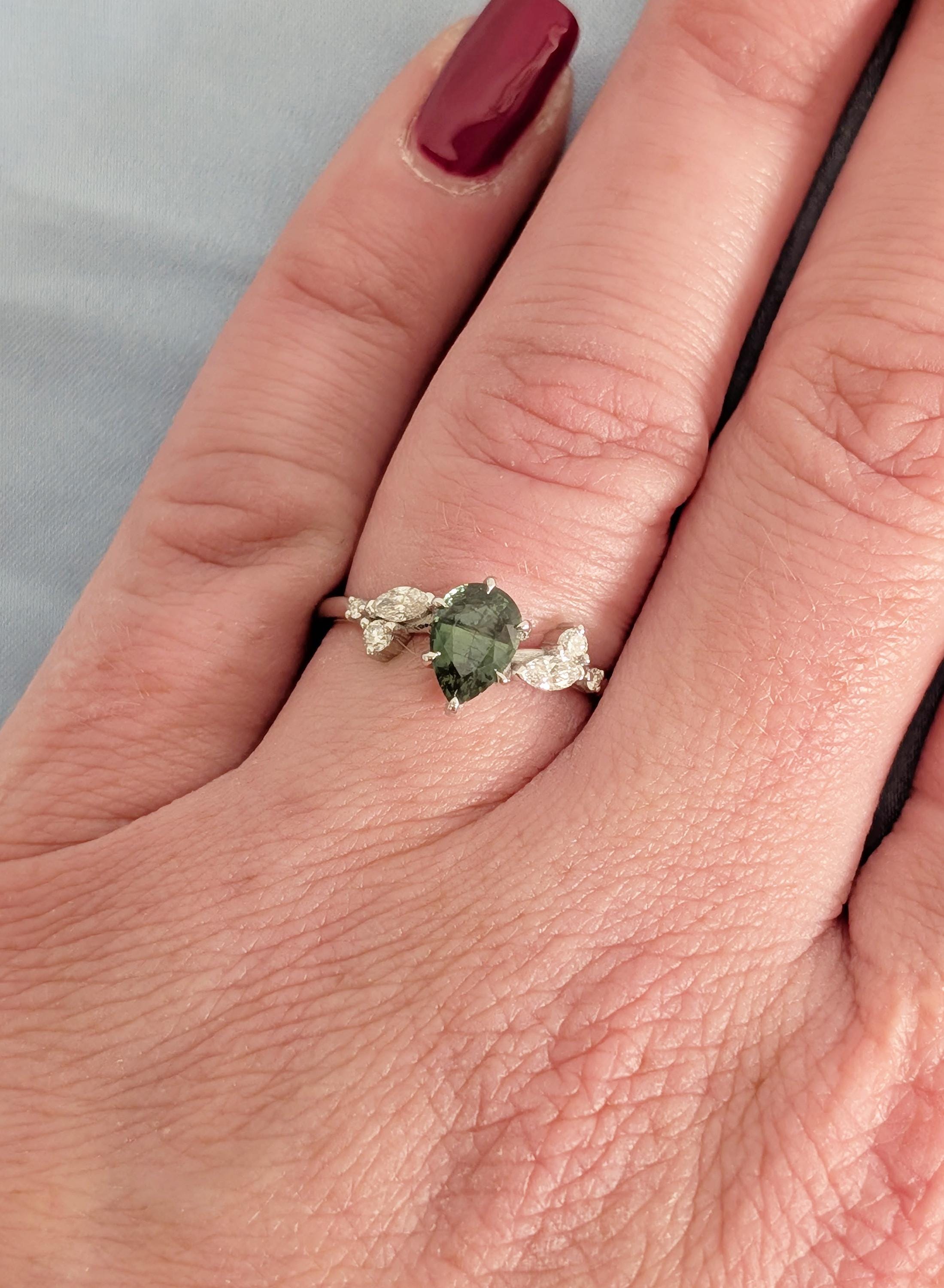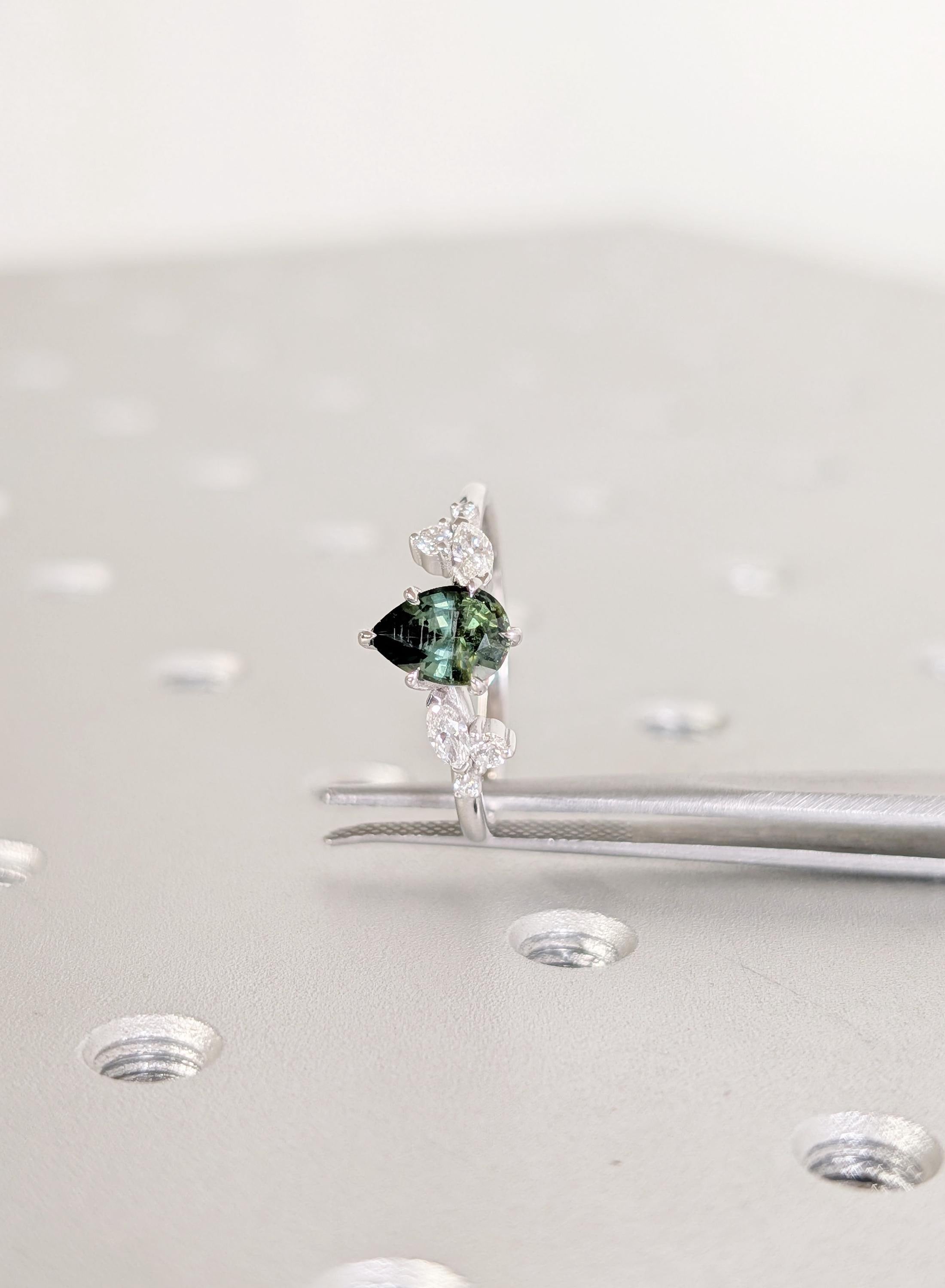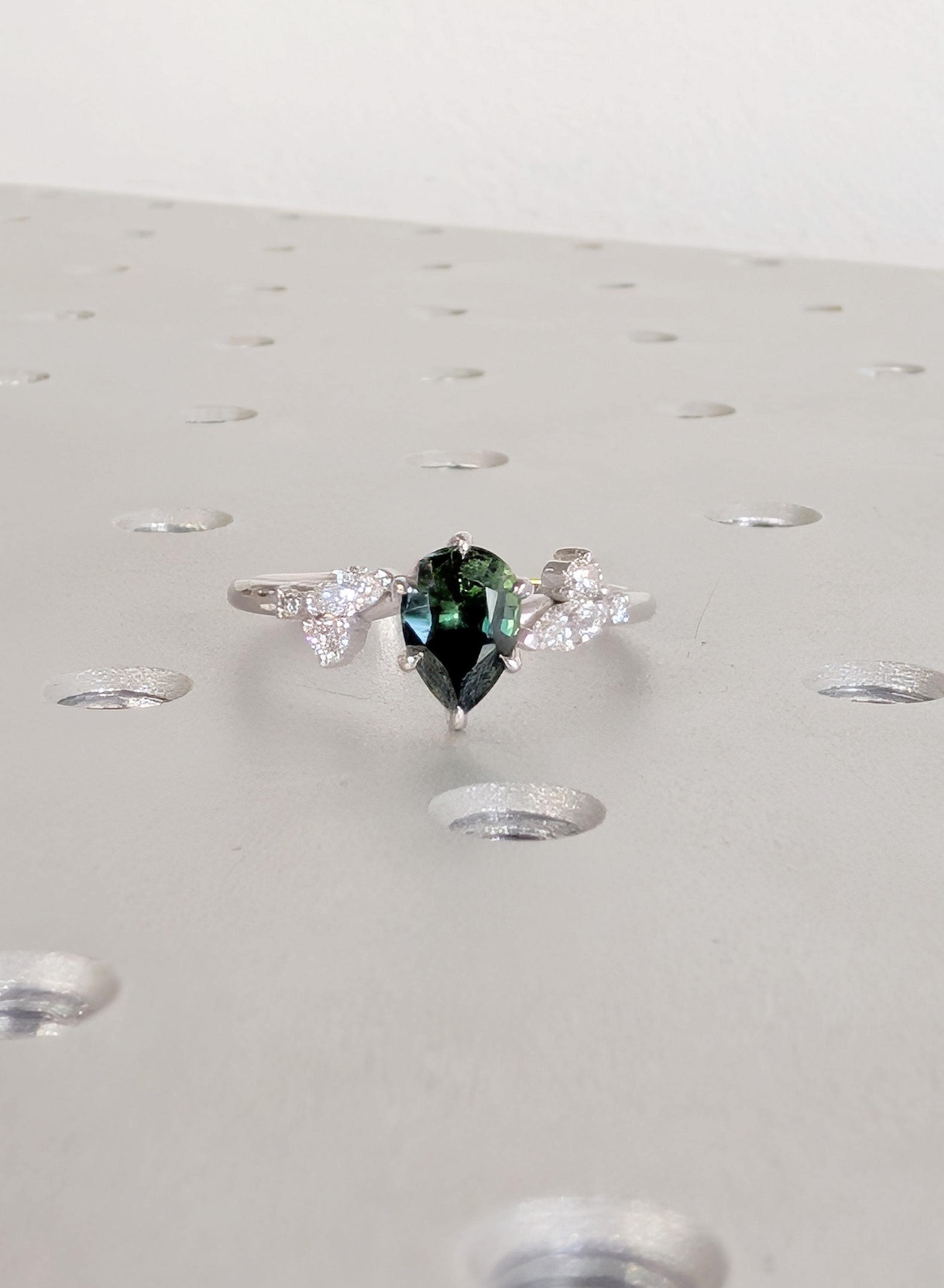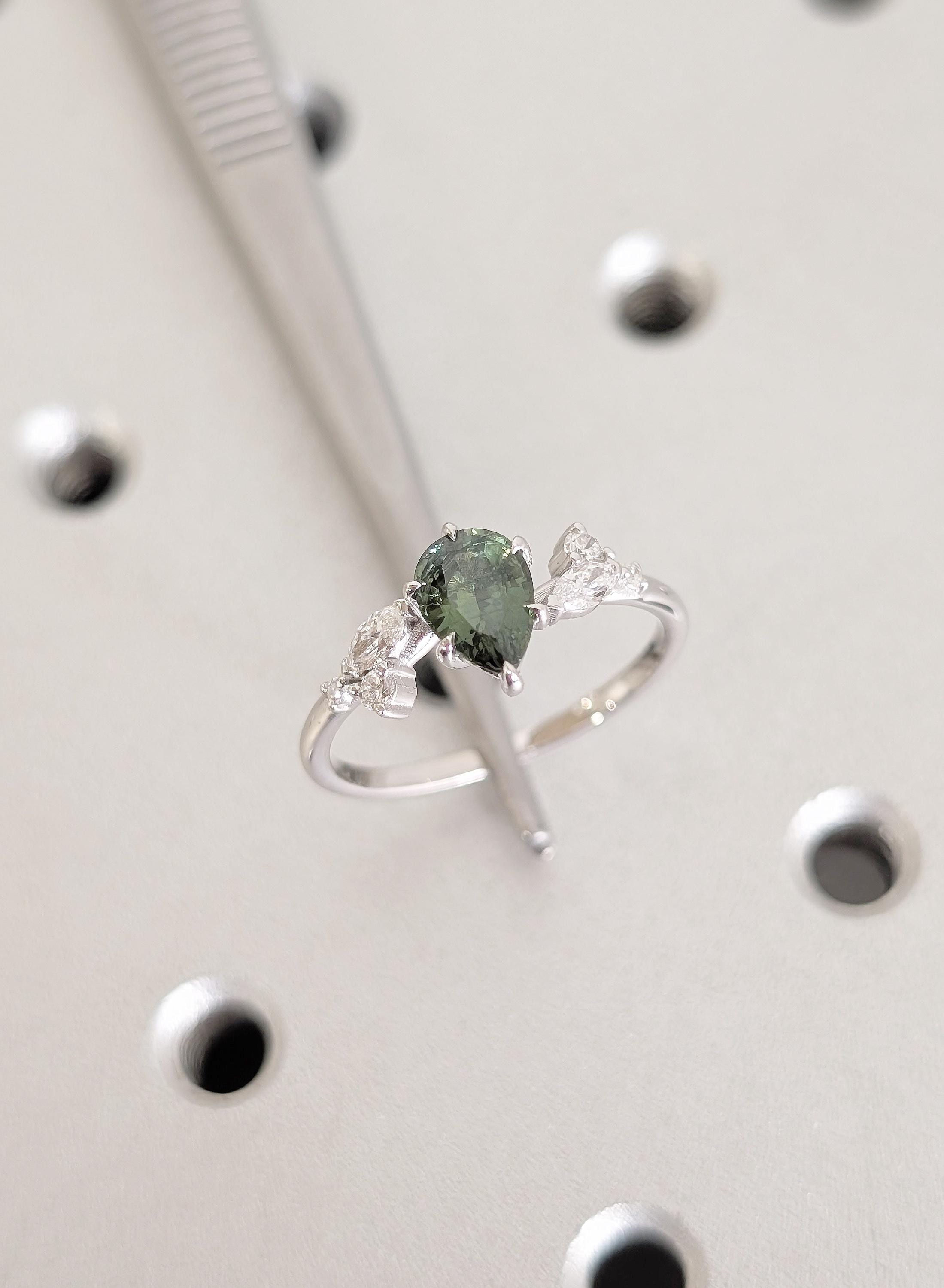 This Natural Sapphire pear cut talon prong setting Peacock Sapphire engagement ring is paired with marquise and round Diamond, Lab Diamond or Moissanite side stones. The center stone carries deep green blue tones that feel calm and organic, while the side stones bring gentle balance. Designed for an engagement ring, bridal wear, anniversaries, or a meaningful gift with lasting presence.