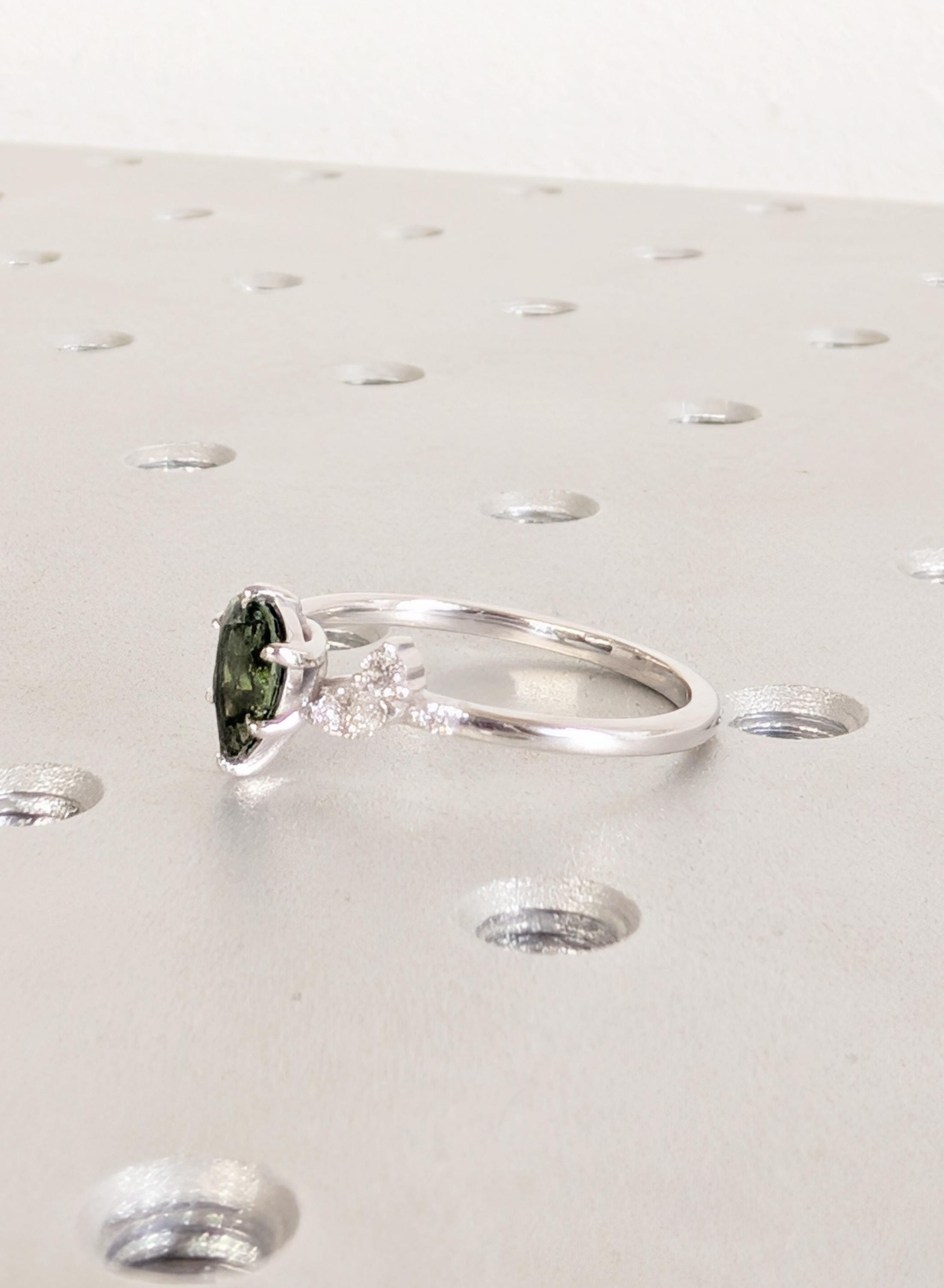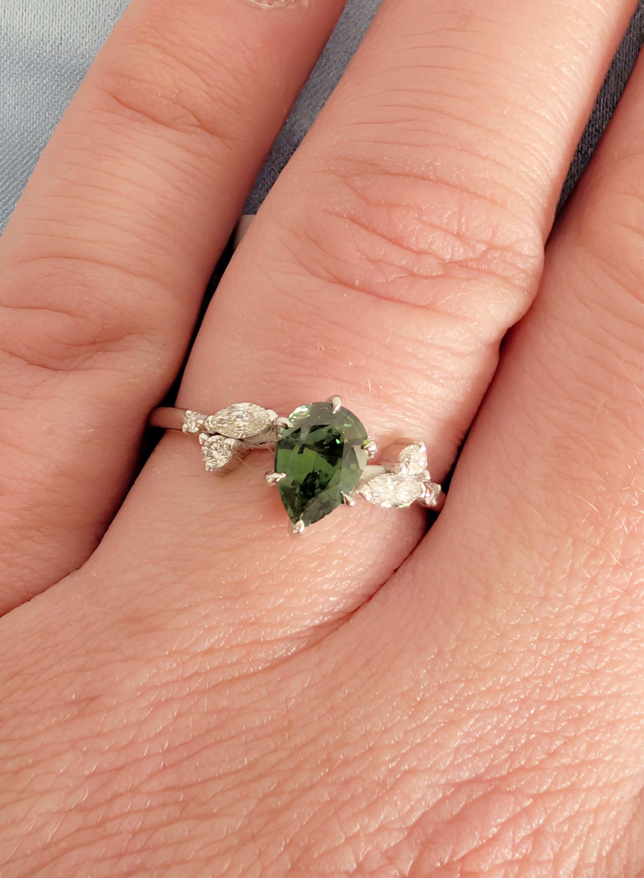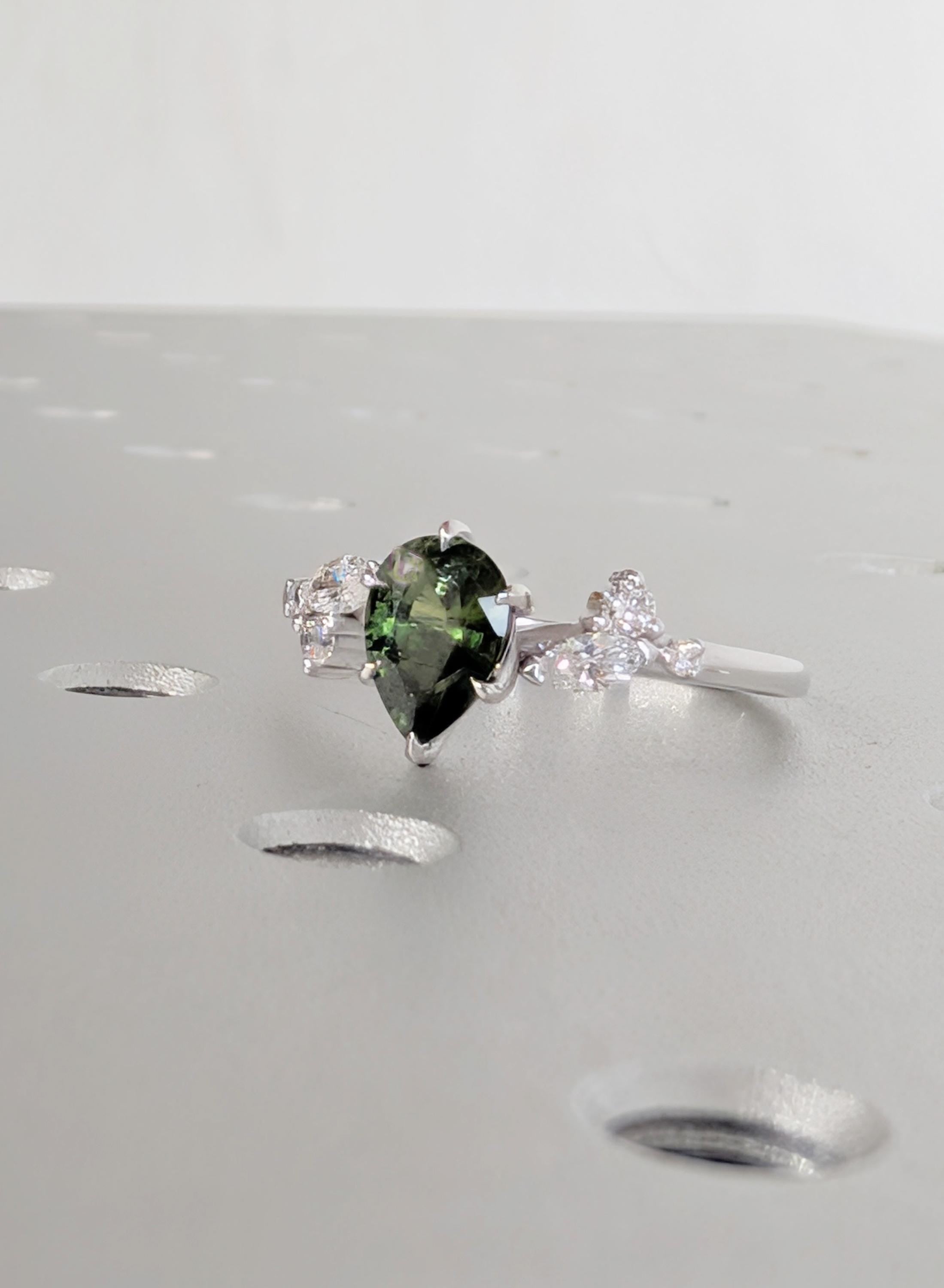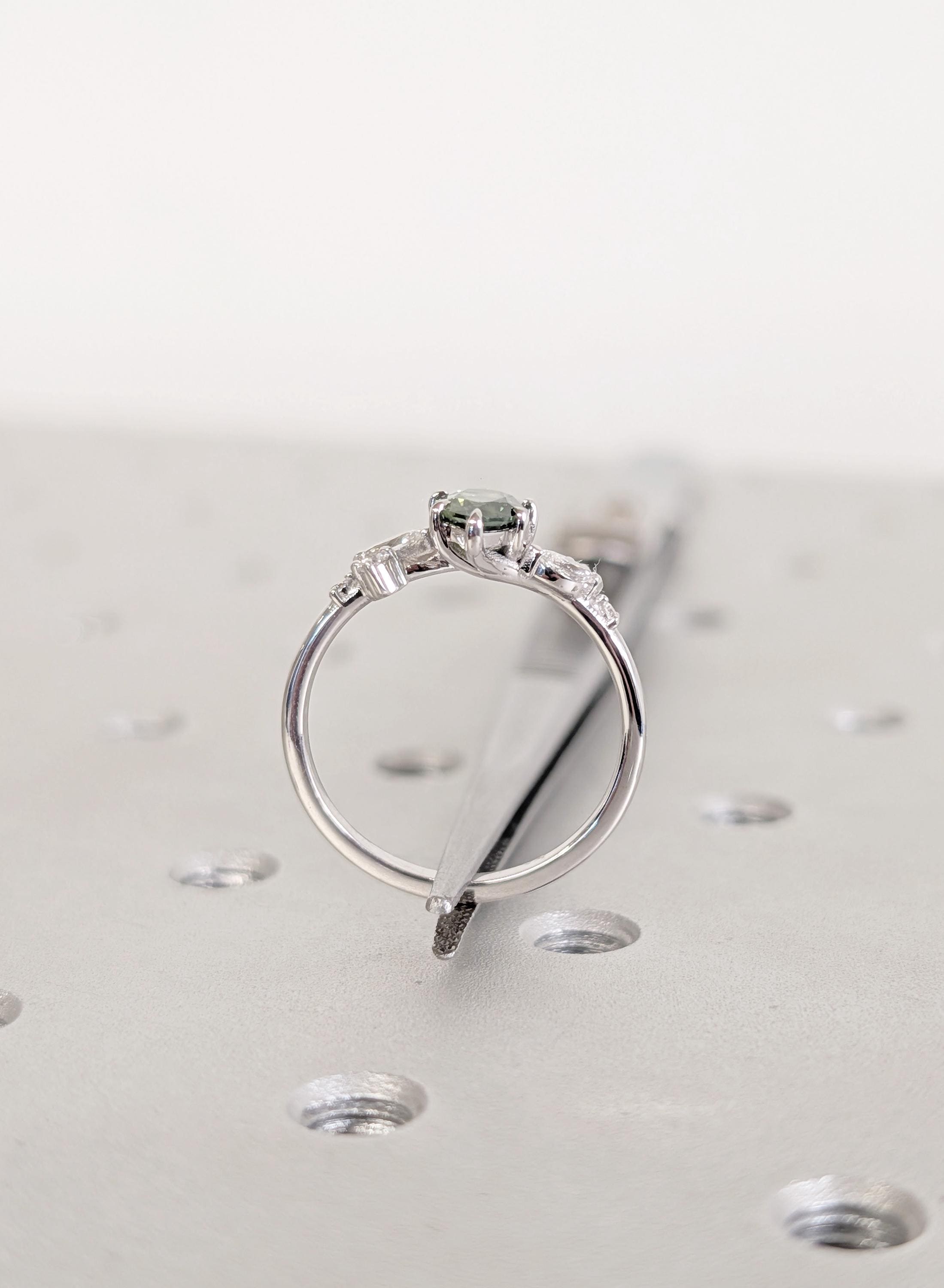 This Natural Sapphire pear cut talon prong setting Peacock Sapphire engagement ring is paired with marquise and round Diamond, Lab Diamond or Moissanite side stones. The center stone carries deep green blue tones that feel calm and organic, while the side stones bring gentle balance. Designed for an engagement ring, bridal wear, anniversaries, or a meaningful gift with lasting presence.