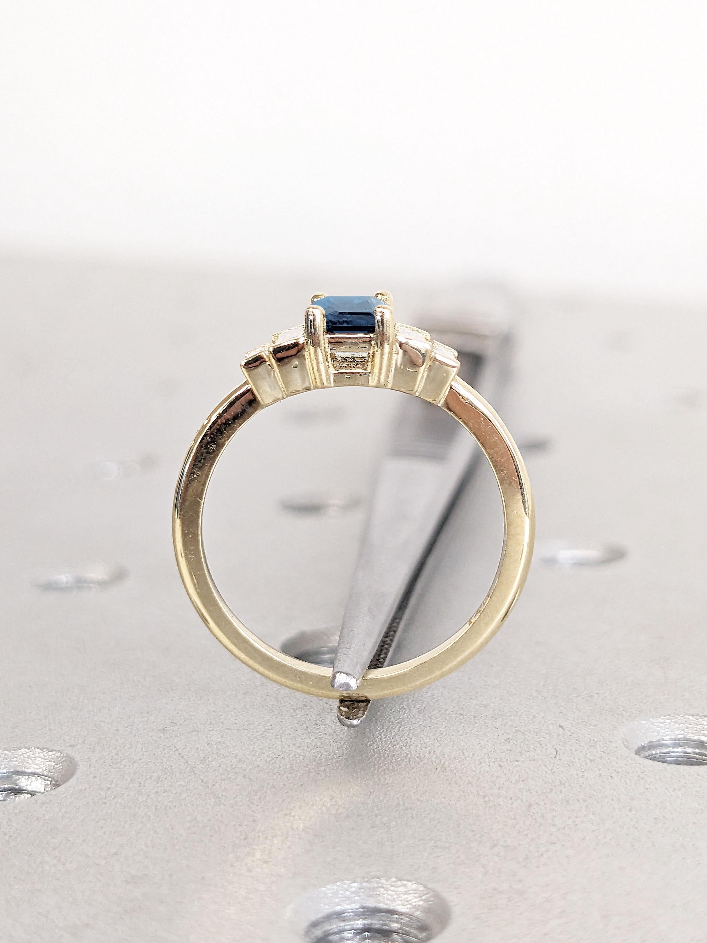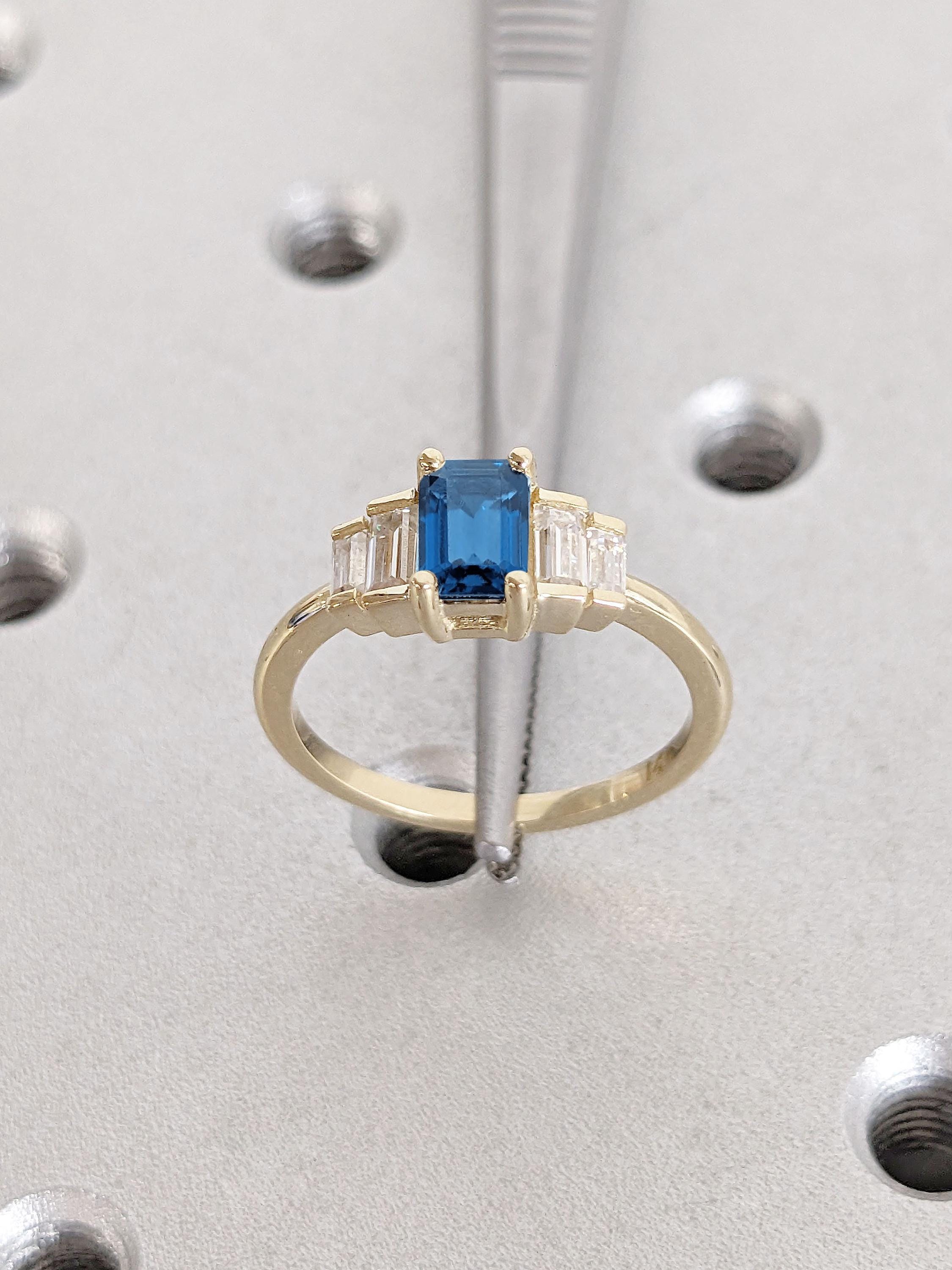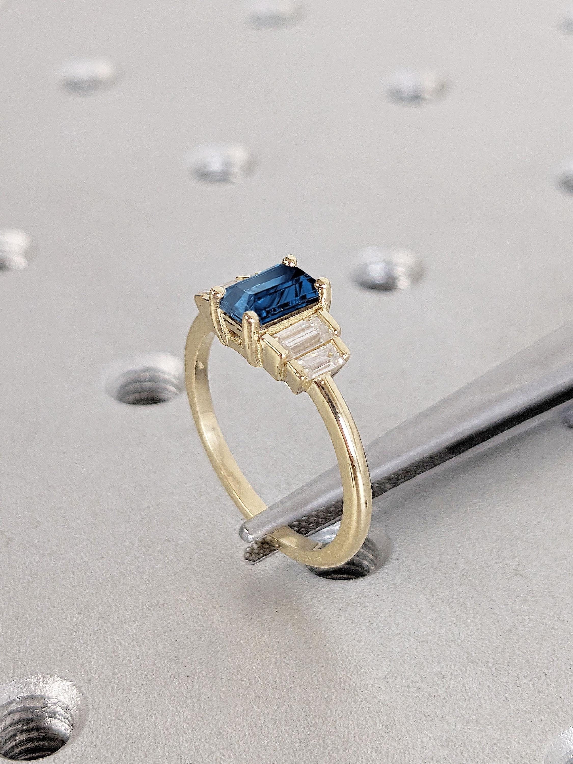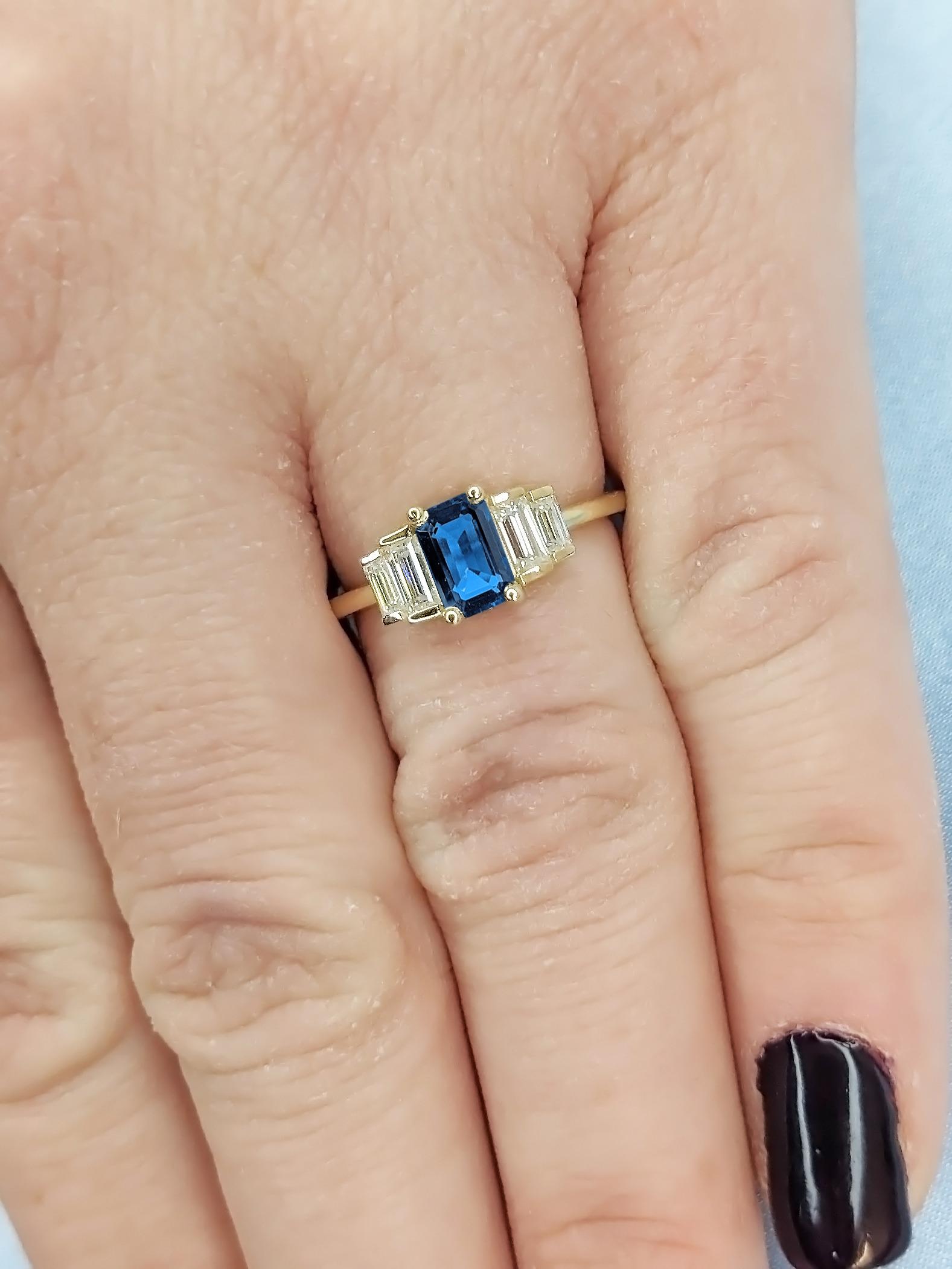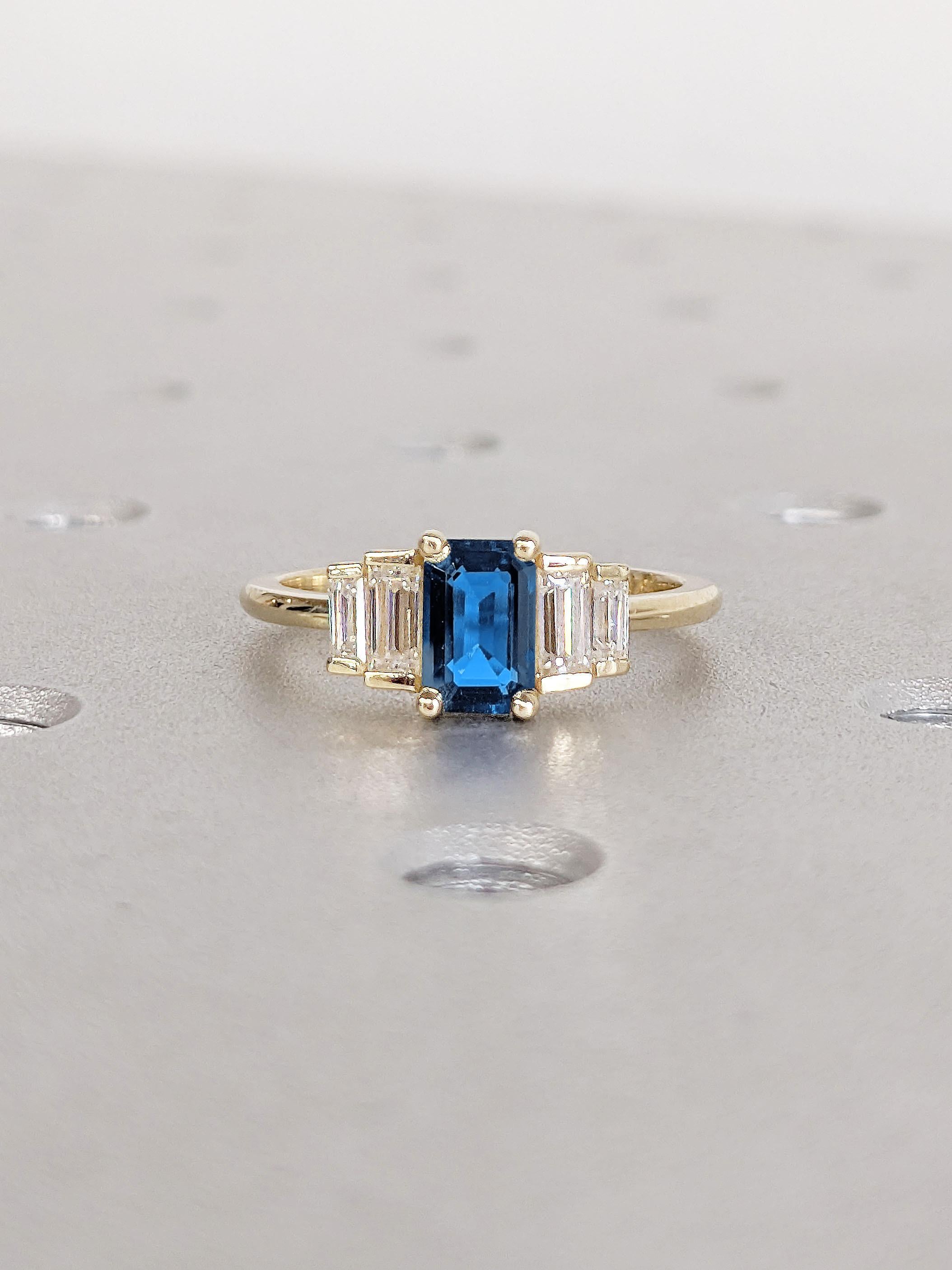 A classy geometrical statement piece, this five stone ring features an emerald cut Sapphire focal stone, accented by baguette cut side stones in your choice of natural diamonds, lab diamonds or moissanites. Set on a delicate thin band of 1.6mm width, this multi stone ring effortlessly adds a flair of sophistication to your style for any occasion. It's the perfect gift for engagement, wedding anniversary or birthday.
