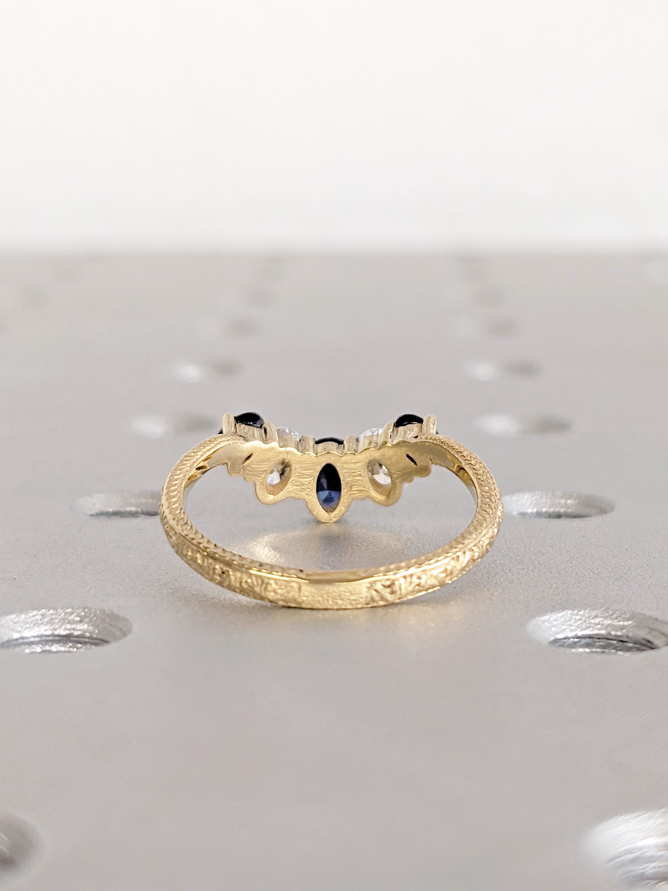 Blue Sapphire wedding band, oval cut Lab Sapphire with Diamond, Lab Grown Diamond, Moissanite side stones in prong setting. This curved band radiates elegance and timeless beauty, perfect as a women’s wedding band, bridal ring, or stackable anniversary piece. A refined symbol of love, grace, and everlasting commitment.