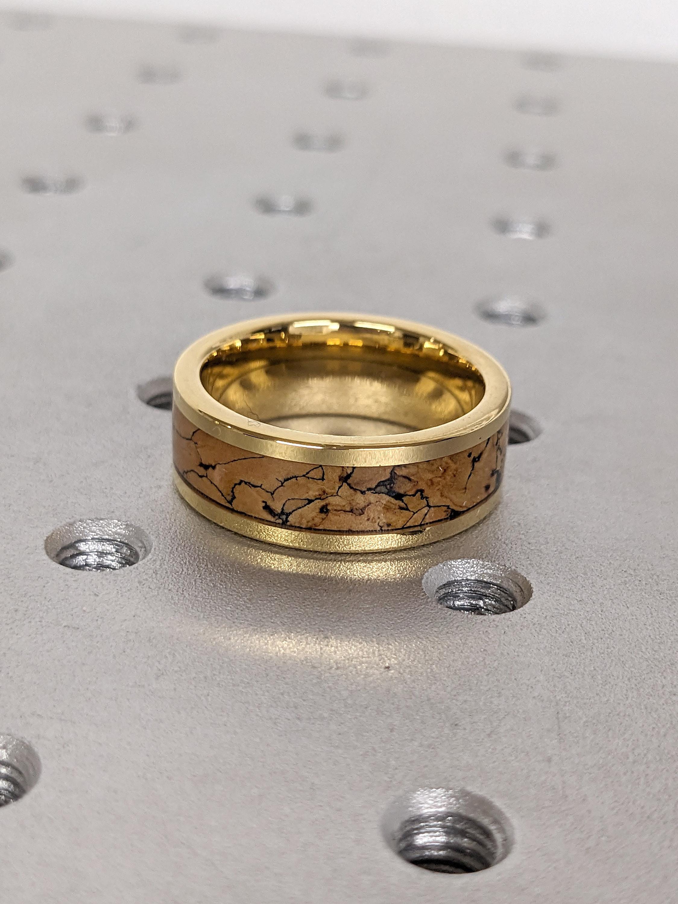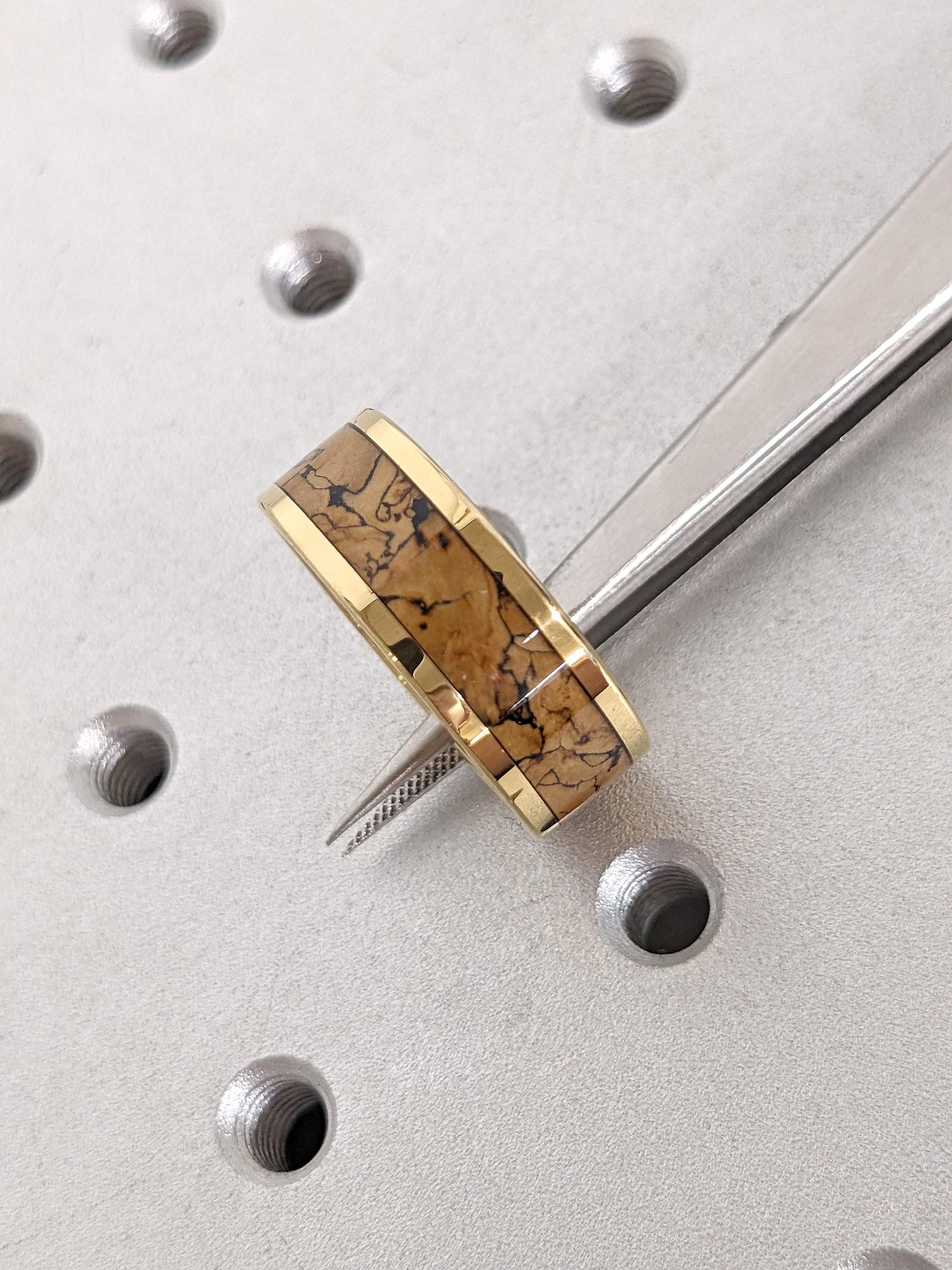 Scratch Resistant Tungsten Carbide 8MM Wedding Ring | Unique Fossil Bone Inlay Yellow Gold Men's Ring | Polished Finish Handmade Jewelry