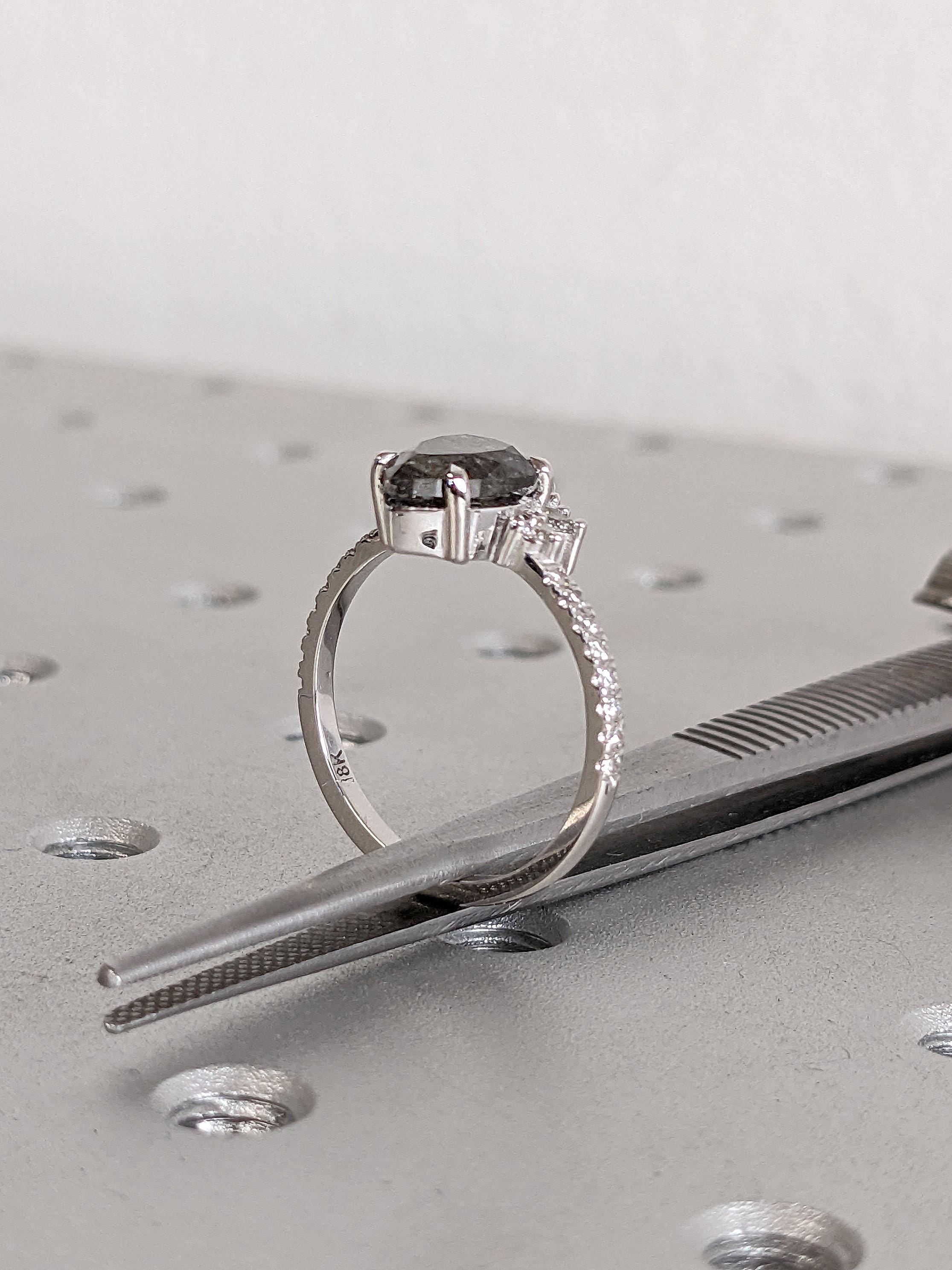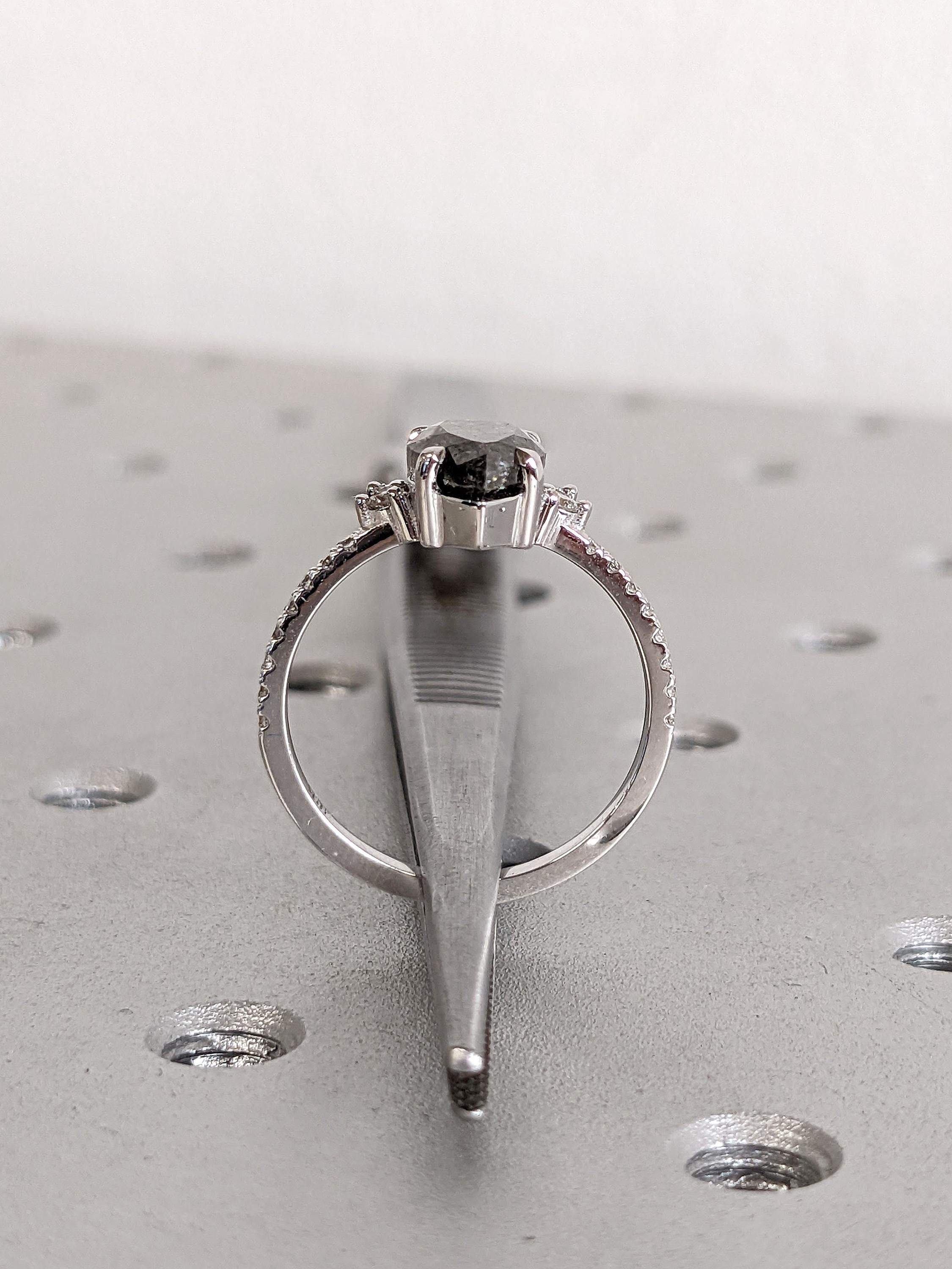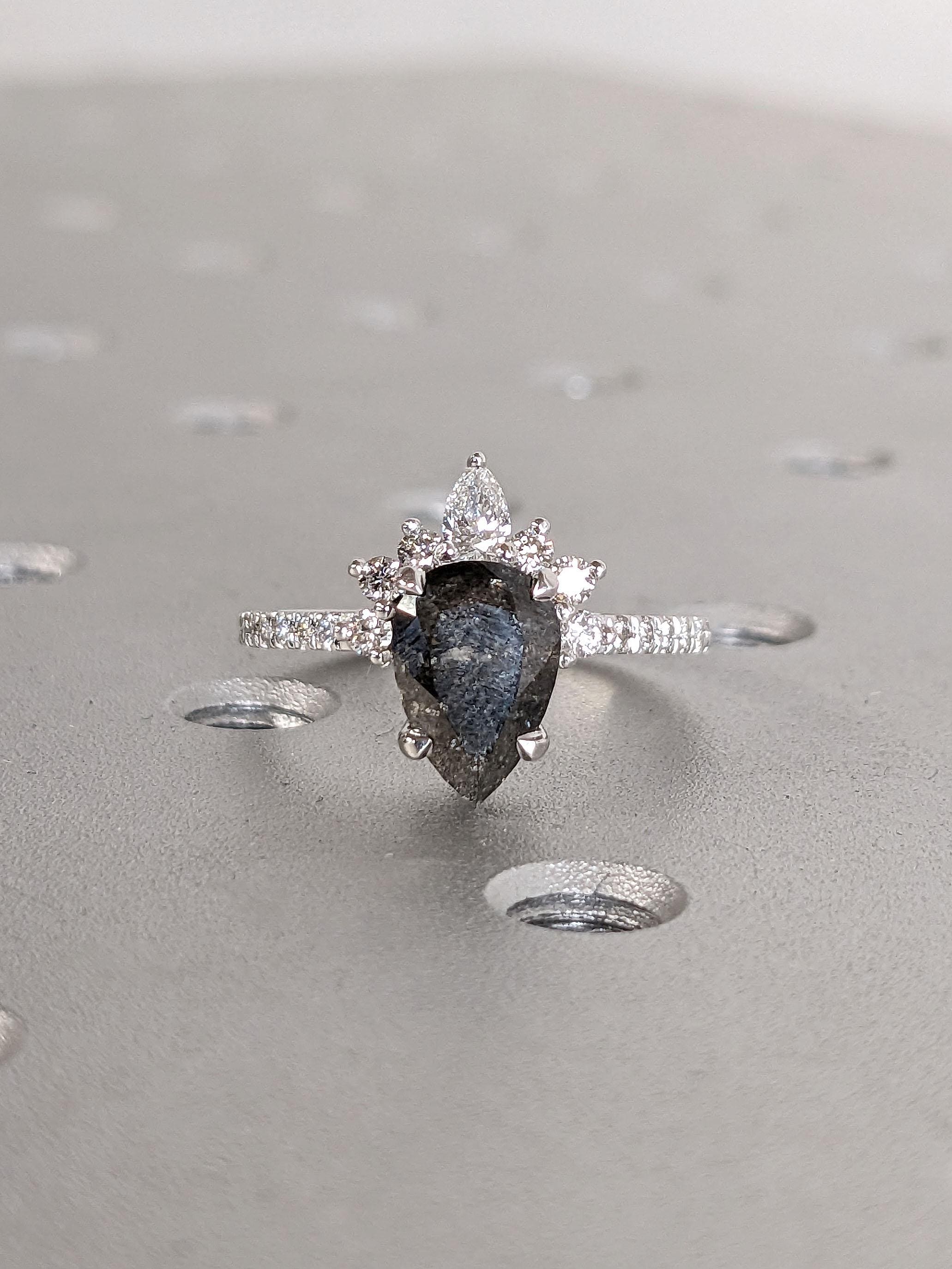 Unique and regal, this ring highlights a striking pear cut Salt and Pepper Diamond as the centerpiece. Accented by a crown-shaped halo, creating a bold yet romantic silhouette. The dainty pavé band adds a touch of sparkle without overshadowing the natural character of the salt and pepper diamond. A perfect blend of vintage elegance and modern artistry.