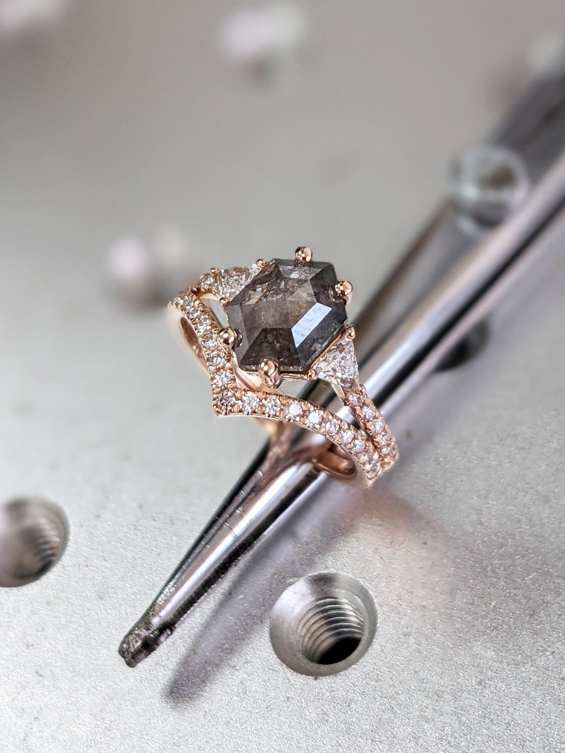 Solid Rose Gold Diamond Ring Bridal Set: Hexagon cut Salt and Pepper Diamond with Curved Wedding Ring