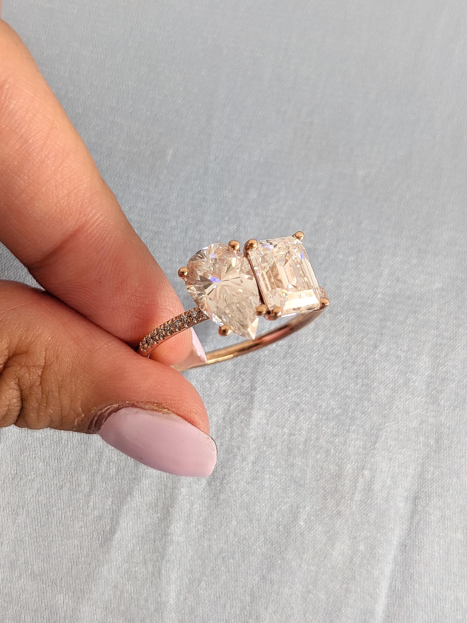 A modern statement of balance and brilliance, this double stone ring showcases an elegant emerald cut and graceful pear cut Lab Diamond center. The dual stones symbolize harmony and connection, making it a meaningful choice for engagements or personal milestones. A delicate pavé band adds extra sparkle, enhancing the contemporary yet timeless appeal of this ring.