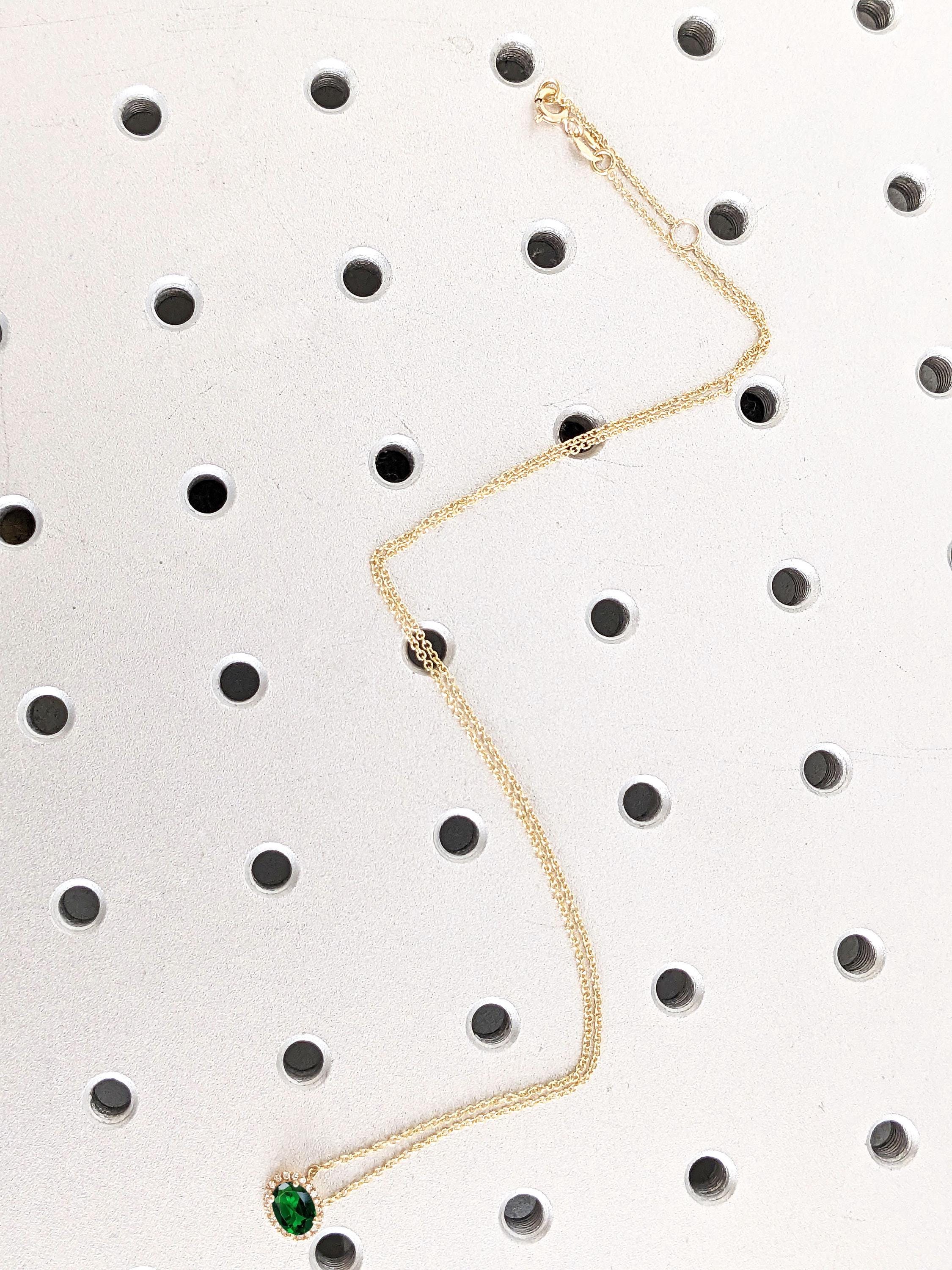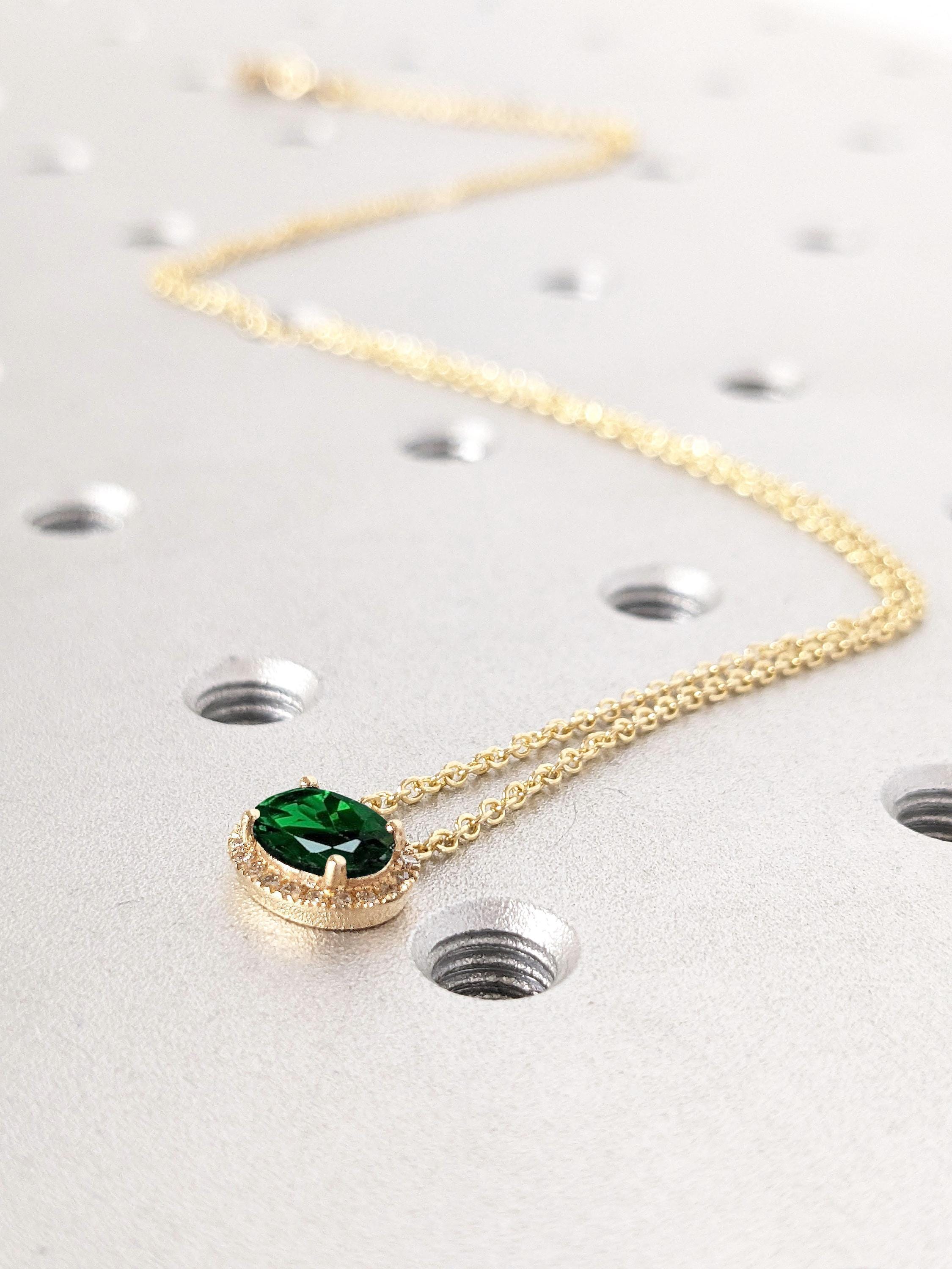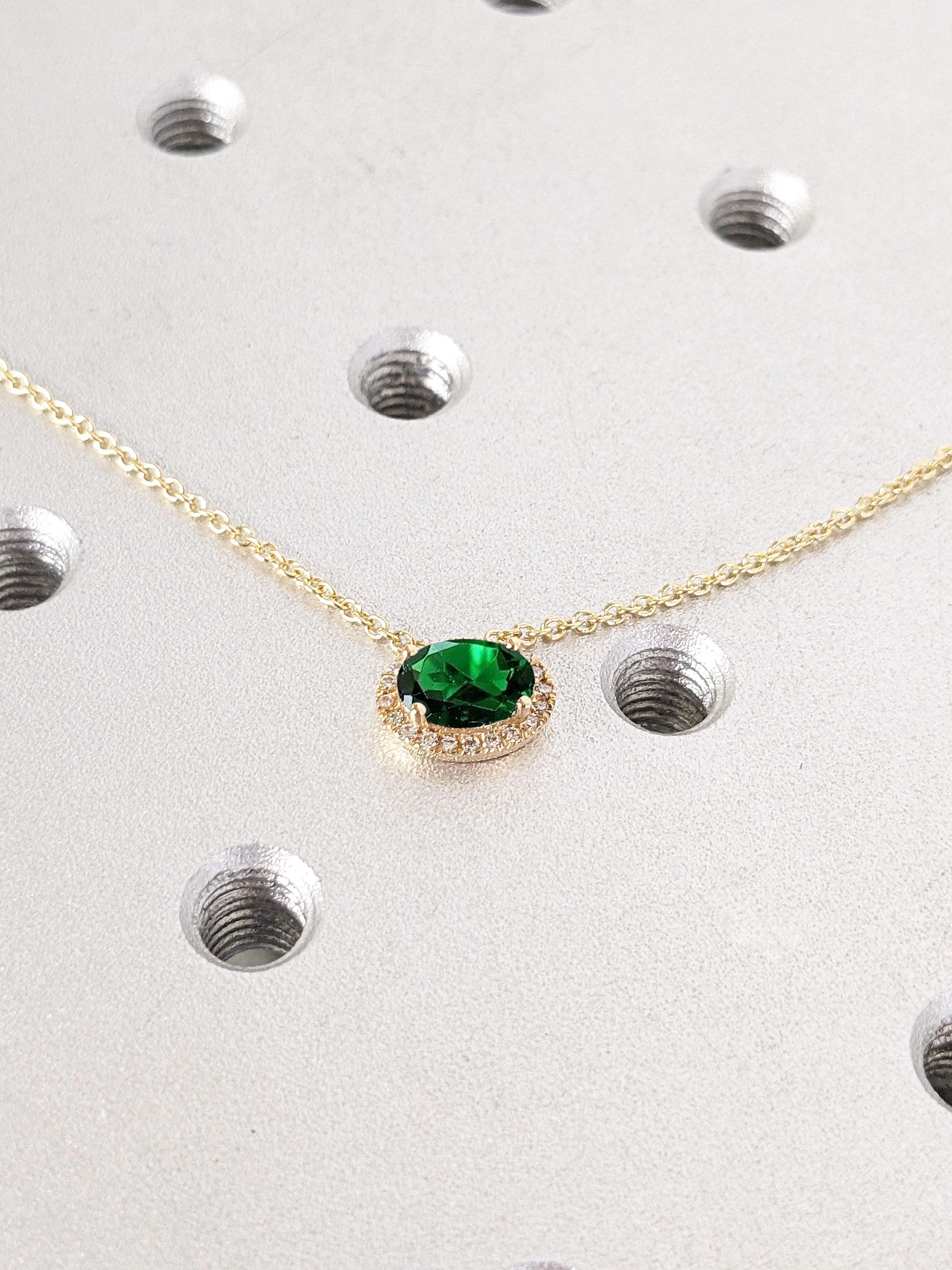 Solid Yellow Gold Chain Necklace | Lab Emerald and Diamond Necklace | Oval cut Emerald Solitaire Everyday Necklace | Moissanite Halo Pendant