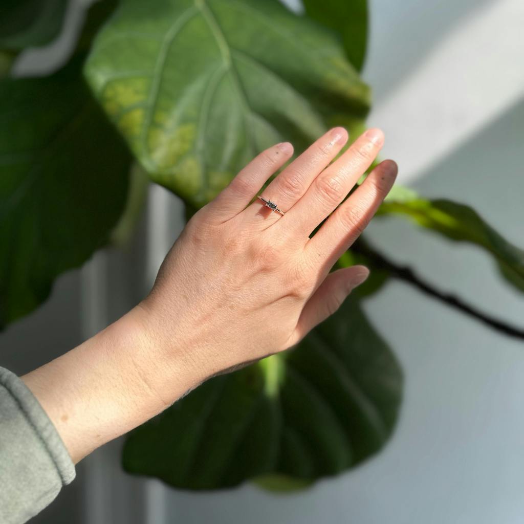 Solitaire Emerald Baguette Raw Salt and Pepper Diamond Gold Engagement Ring Art Deco 1920s Inspired Thin Petite Band 14k Unique Ring for Her
