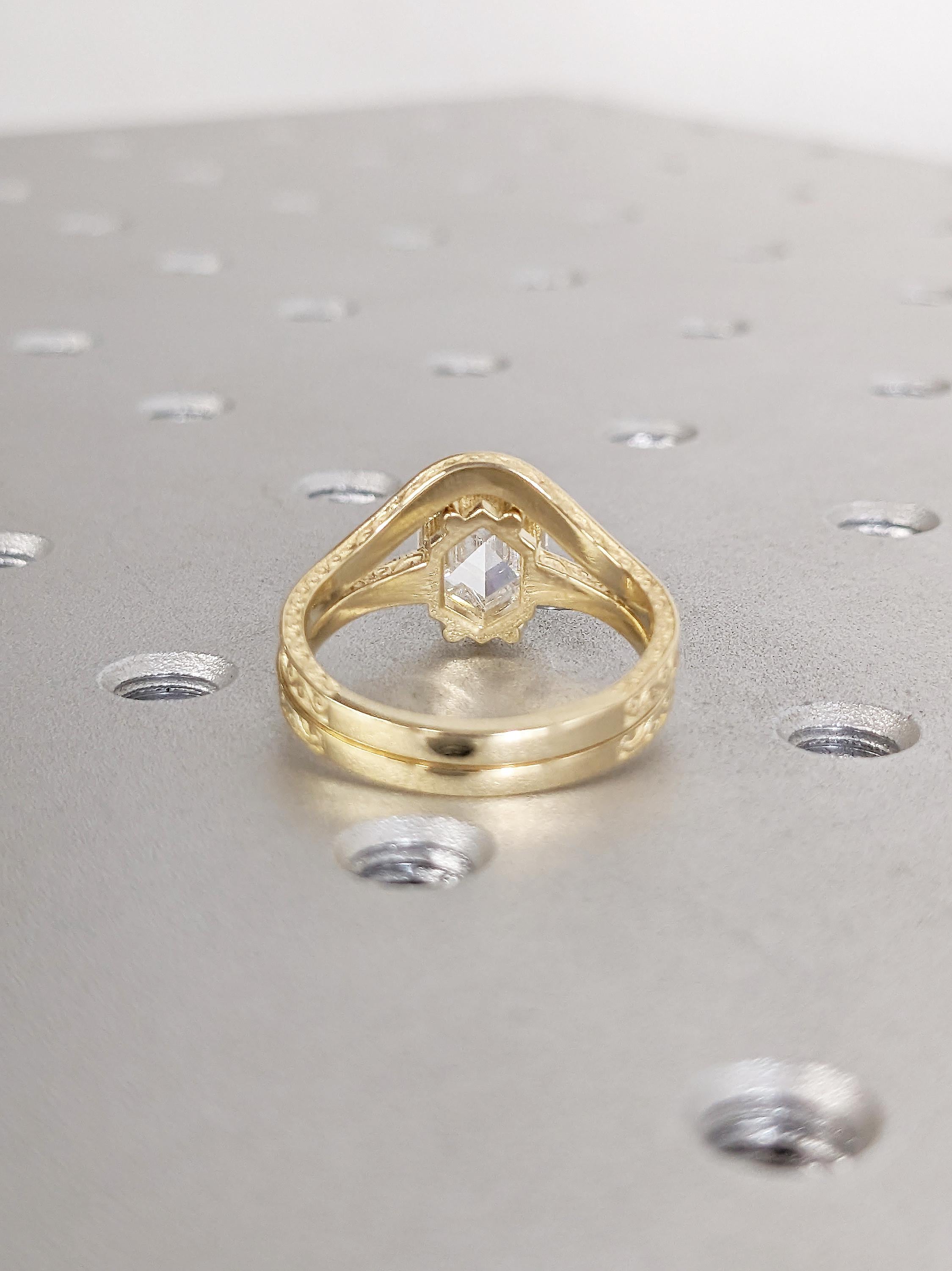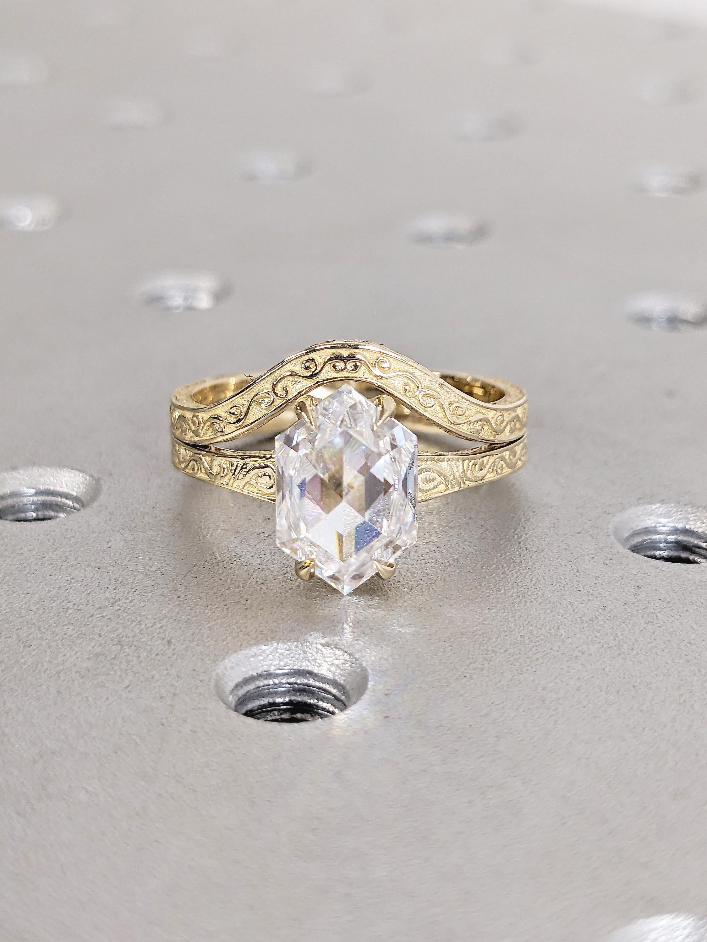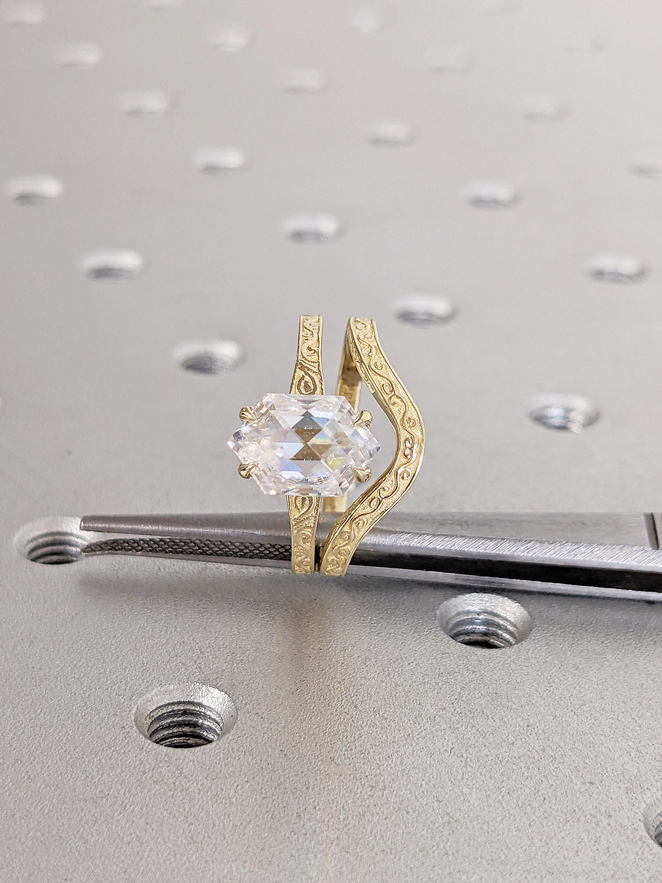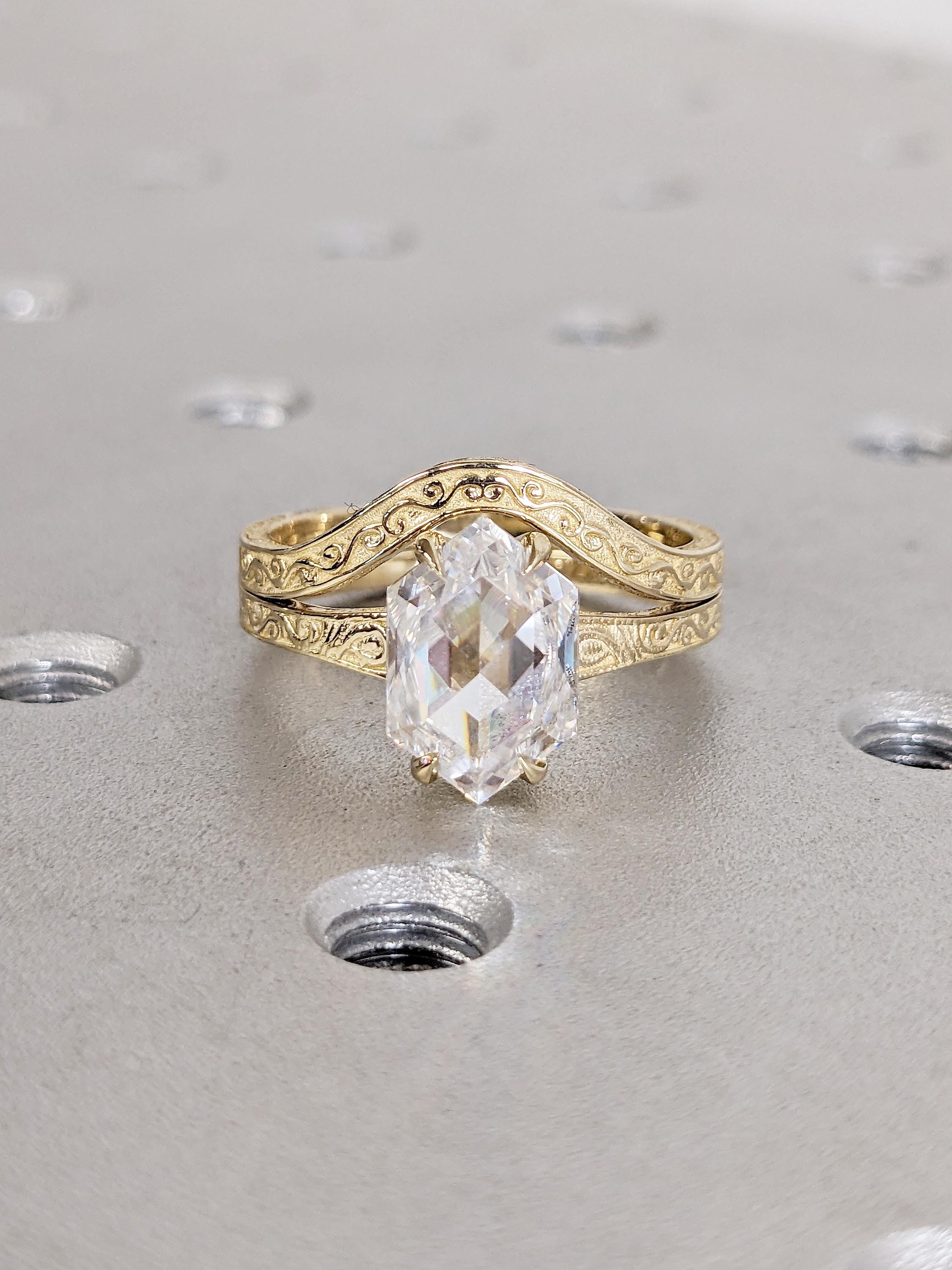 Solitaire Moissanite Engagement Ring, Bridal Set, Scrollwork 14k Yellow Gold Hexagon Ring