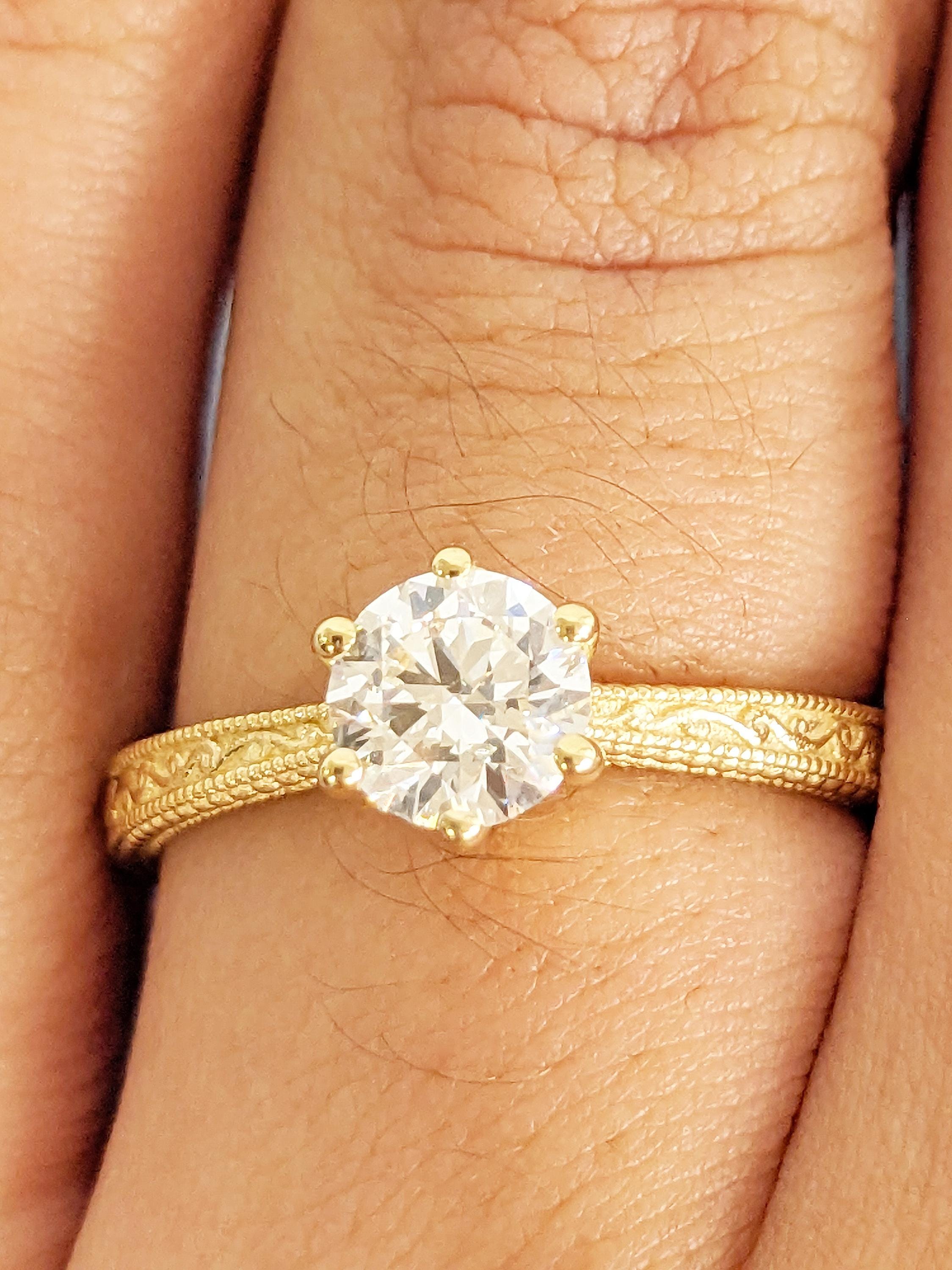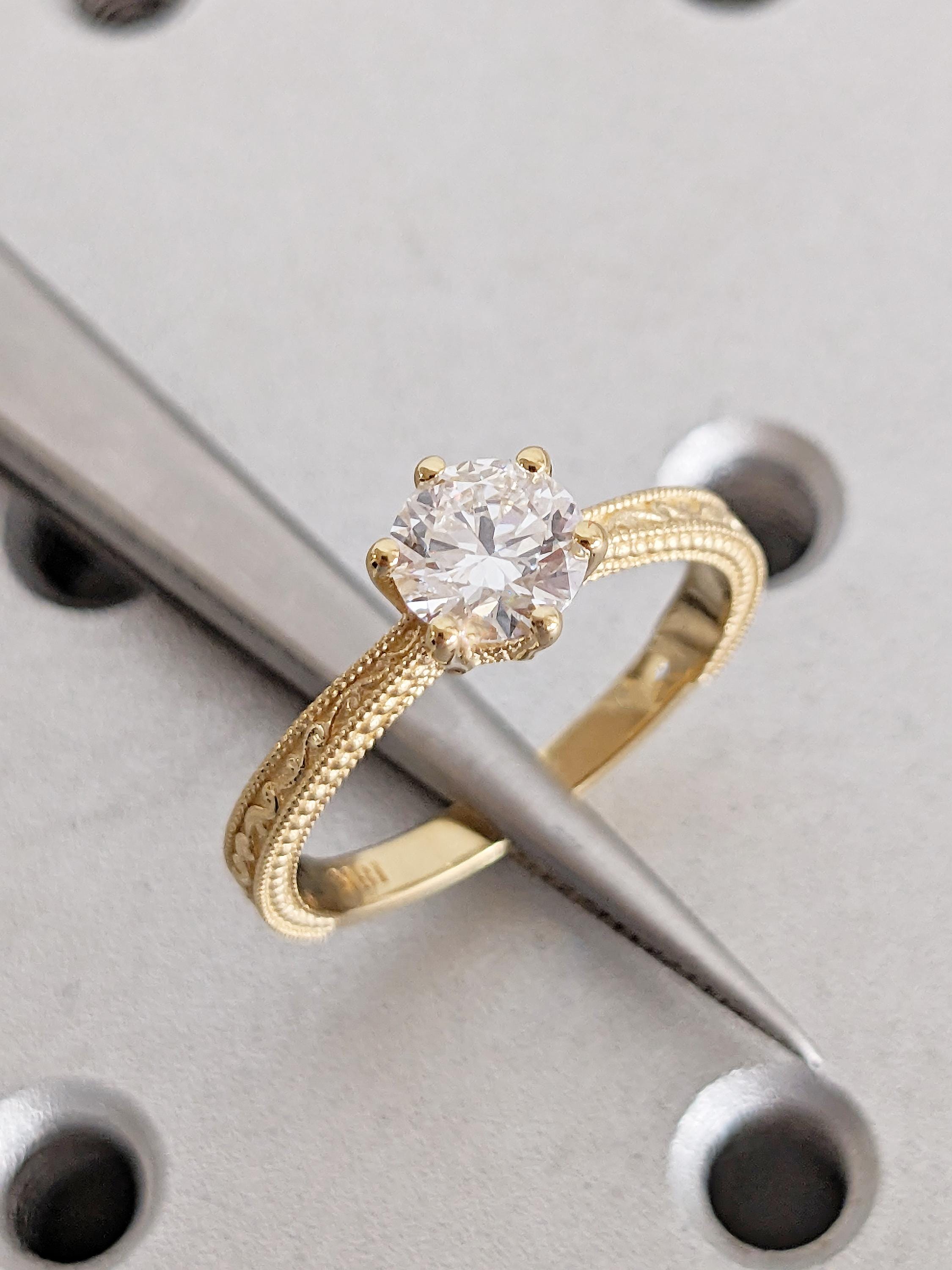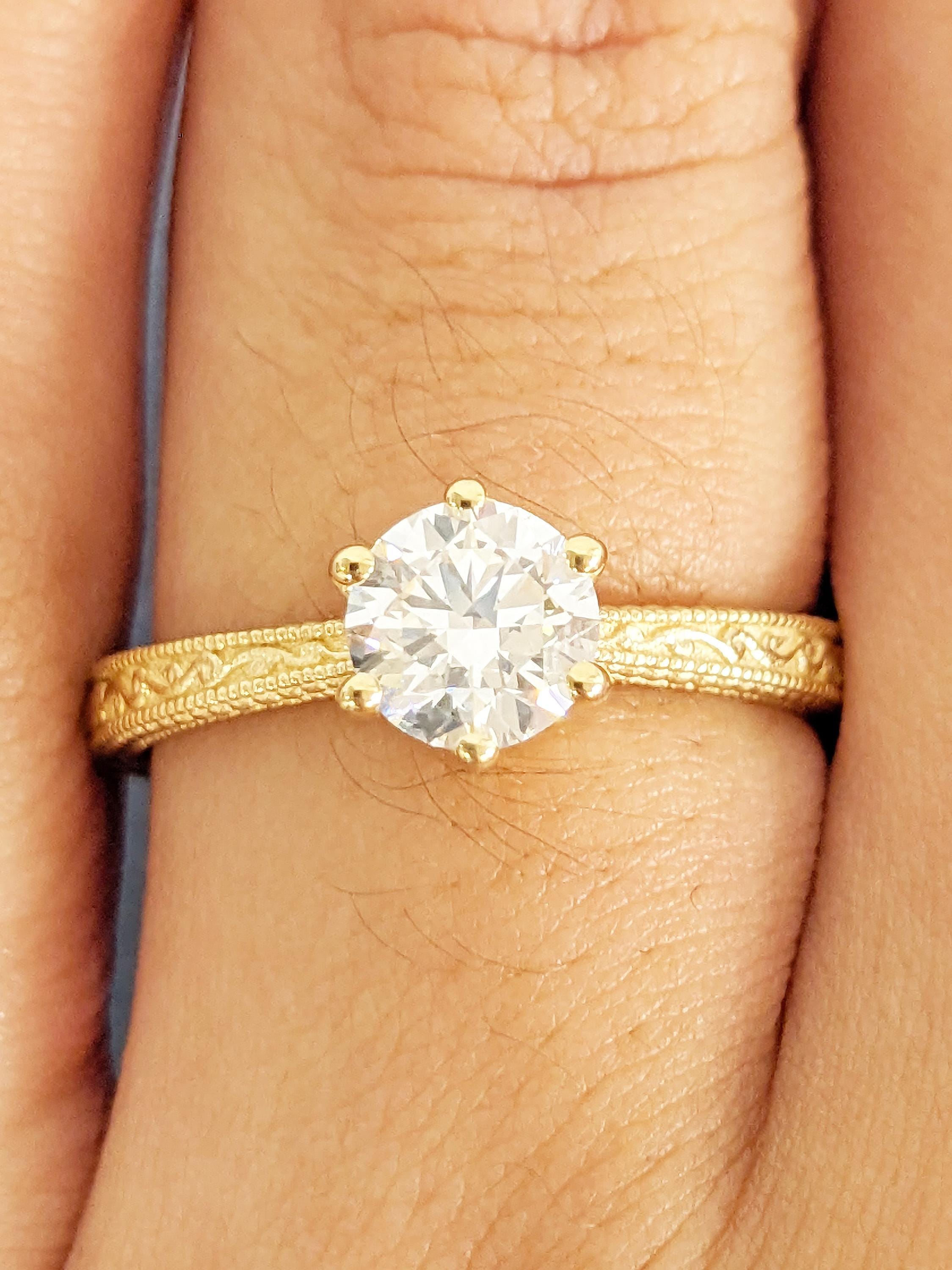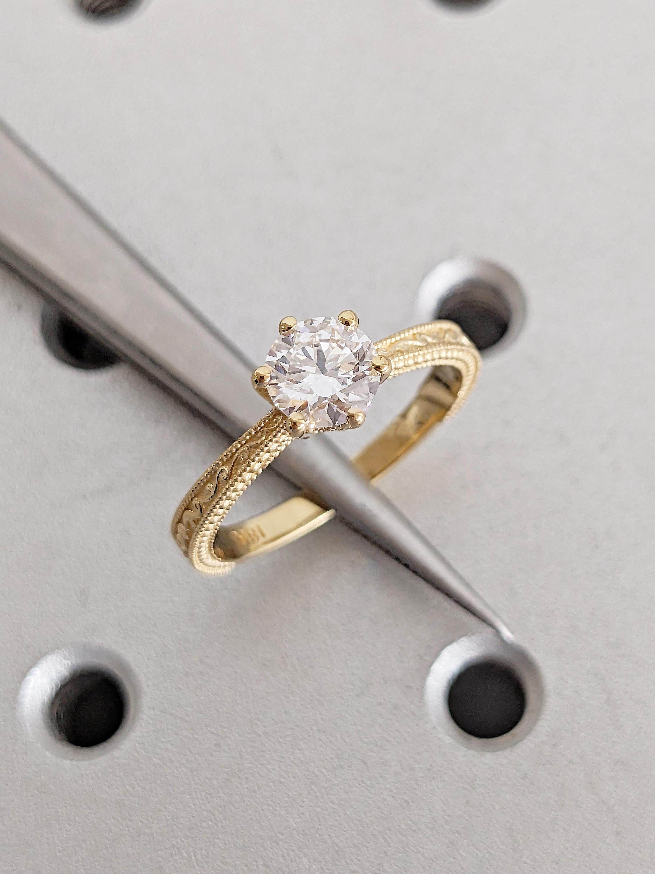 This Moissanite engagement ring features a classic solitaire design with a round center stone. The gold band is enriched with delicate filigree patterns and refined milgrain detailing for a vintage-inspired look. It’s a stunning blend of modern brilliance and timeless craftsmanship.