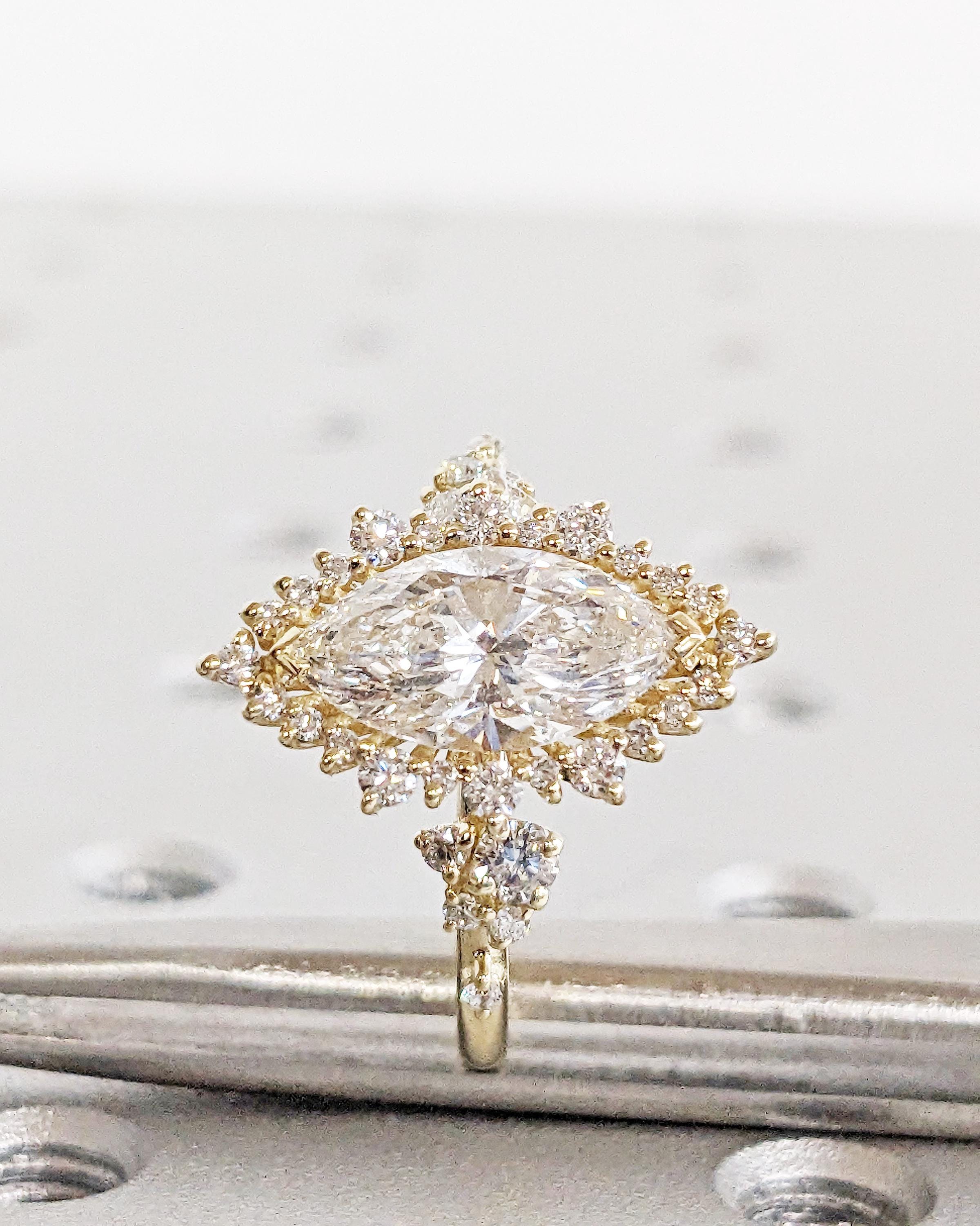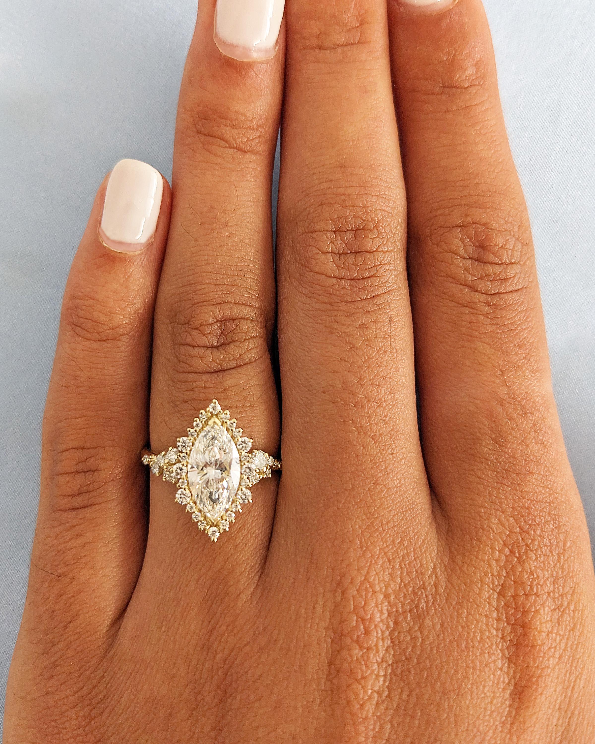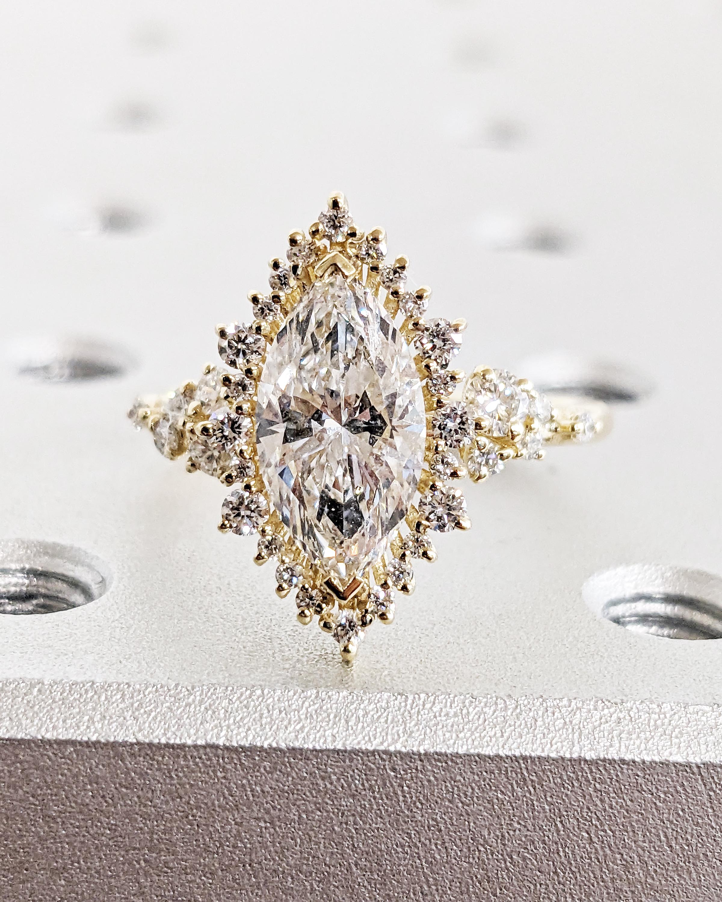Sparkly Star Burst Halo Ring, Moissanite Marquise Engagement Ring, 14K Yellow Gold Halo Engagement Ring, Cluster Halo Statement Ring For Her