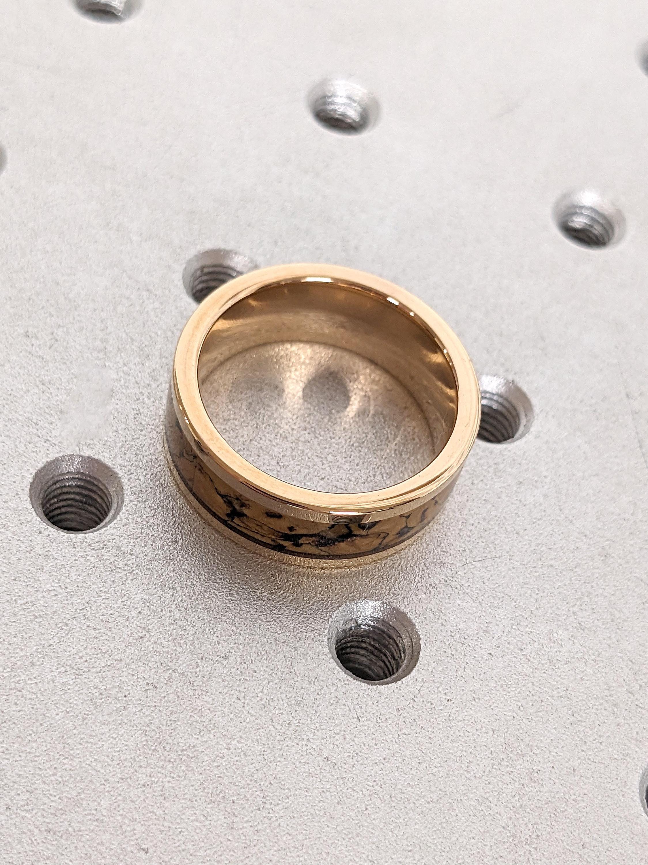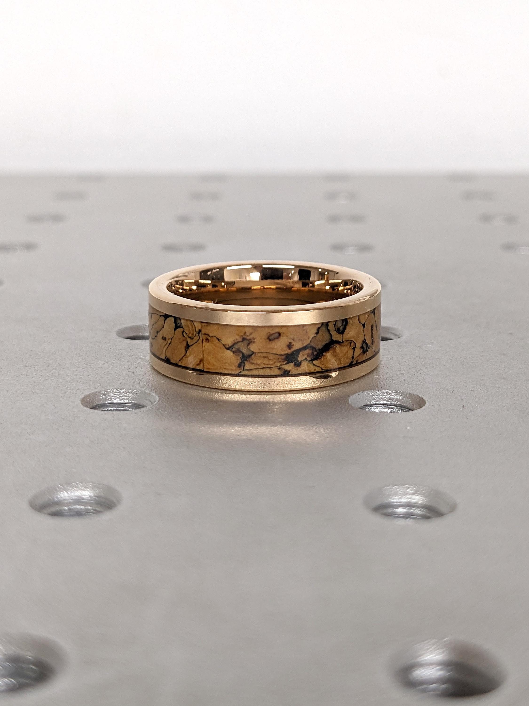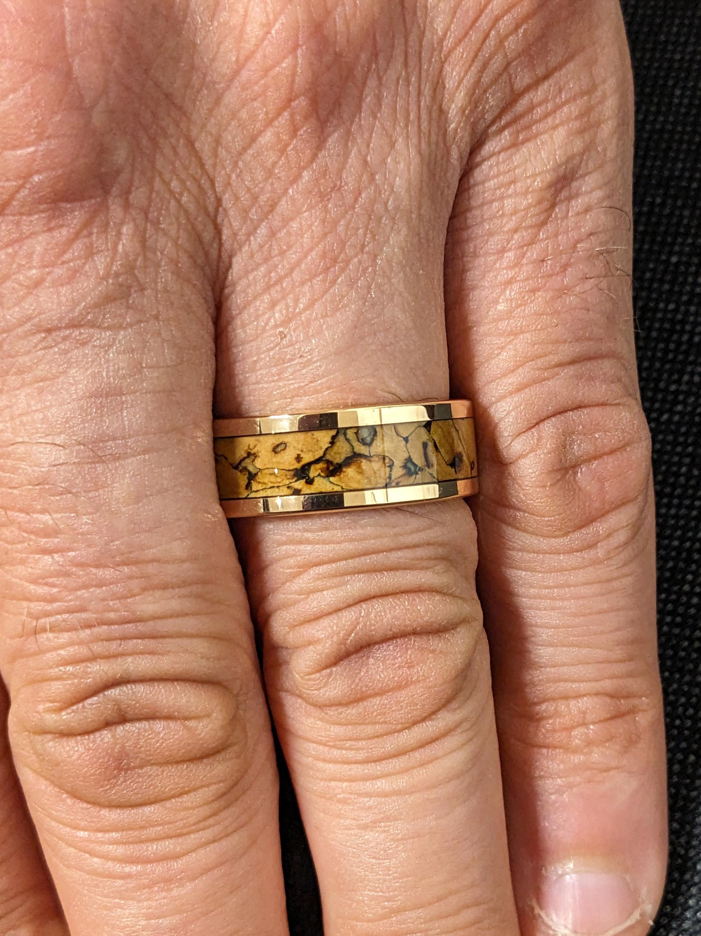 Bold and distinctive, this 8mm rose gold plated tungsten ring stands out with its striking man-made t-rex bone inlay pattern — a modern interpretation of prehistoric texture and timeless strength. The polished shiny finish adds a sleek, masculine edge, while the tungsten carbide construction ensures lasting durability and scratch resistance. Designed for comfort and individuality, this ring makes a powerful statement for the modern man who values both character and craftsmanship.