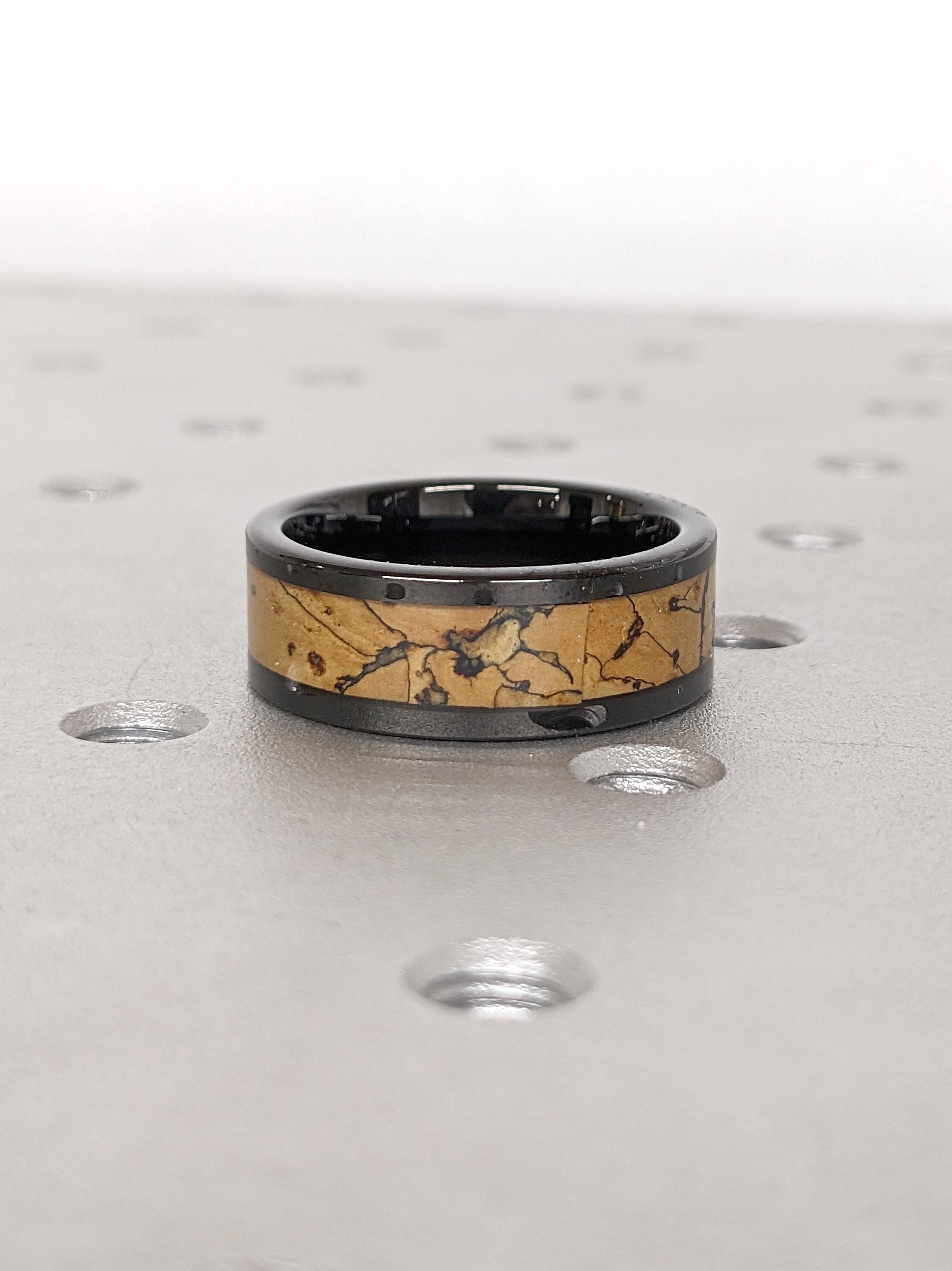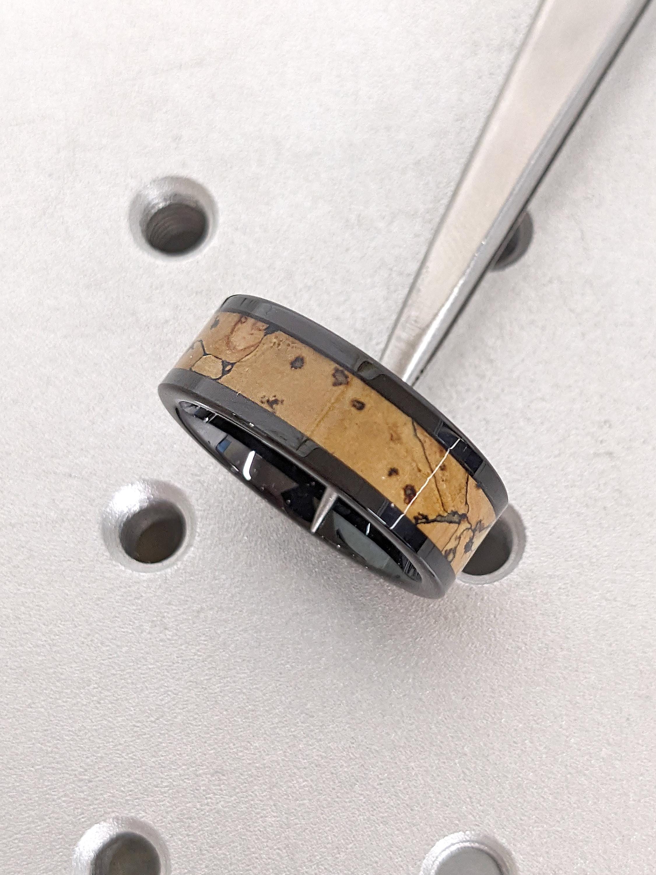 Bold and distinctive, this 8mm black tungsten ring stands out with its striking man-made dinosaur bone inlay pattern — a modern interpretation of prehistoric texture and timeless strength. The polished shiny finish adds a sleek, masculine edge, while the tungsten carbide construction ensures lasting durability and scratch resistance. Designed for comfort and individuality, this ring makes a powerful statement for the modern man who values both character and craftsmanship.