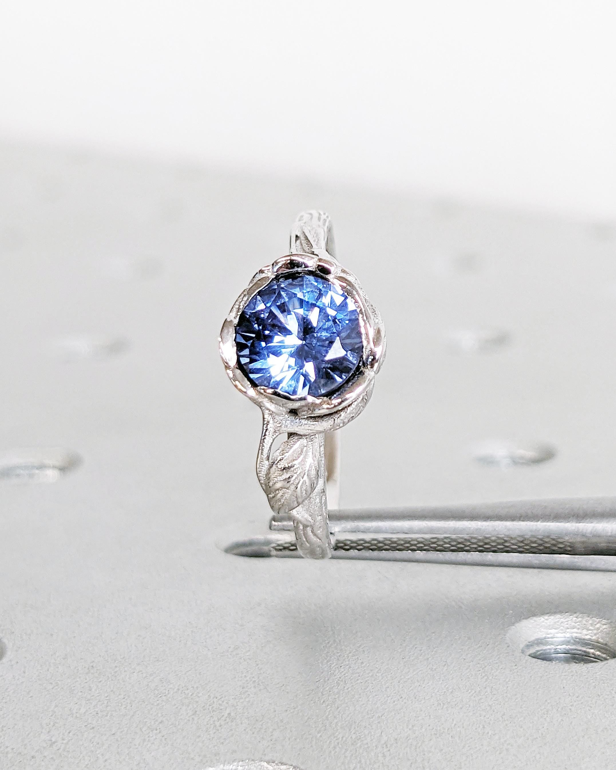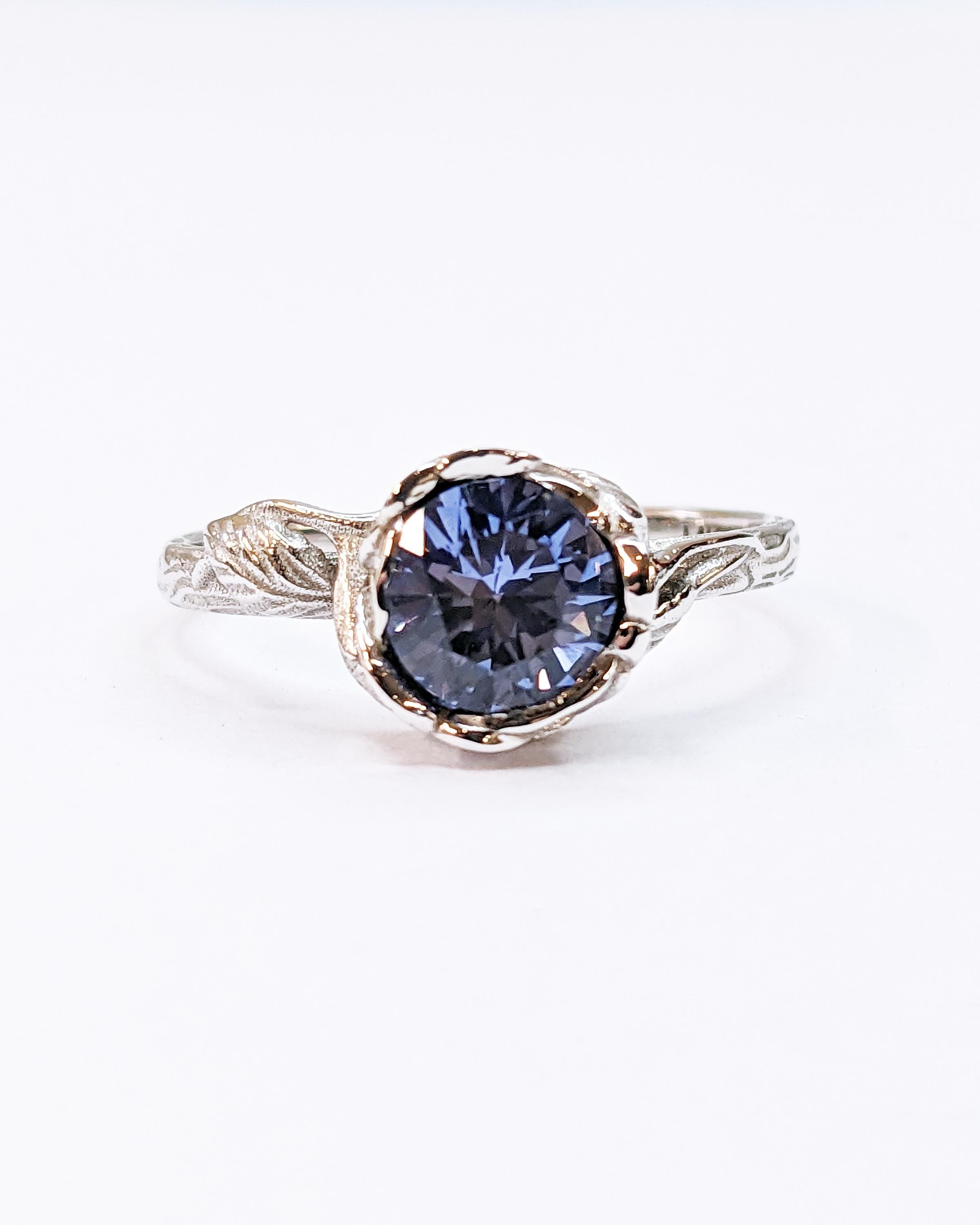 A beautiful round lab tanzanite blooms at the center of this vintage floral-inspired engagement ring, set gracefully within a petal-shaped setting. Known as December's birthstone, its soothing purple-blue violet hue symbolizes harmony, transformation and deep emotional connection. A romantic choice for those who love nature’s elegance and meaningful design.