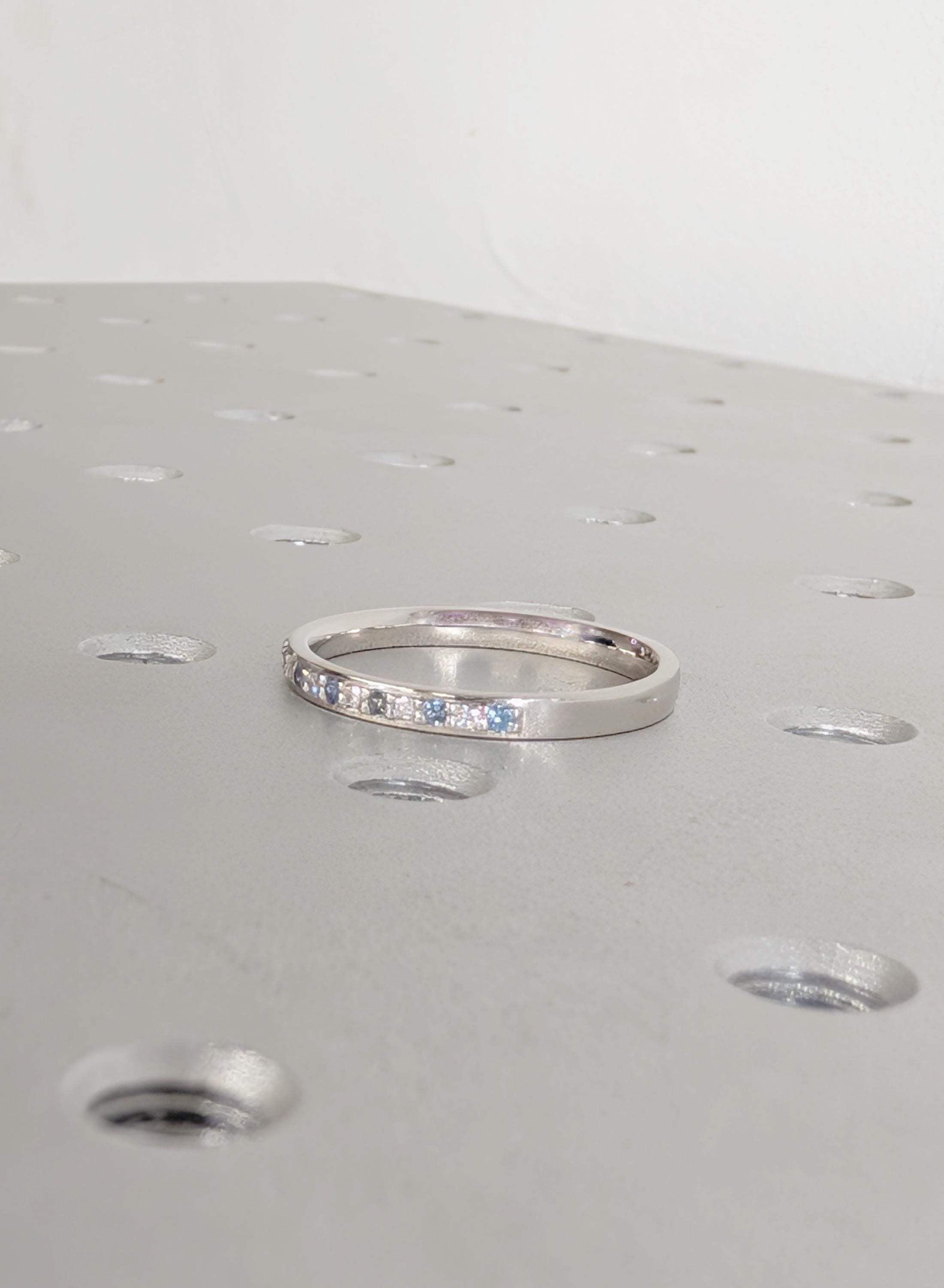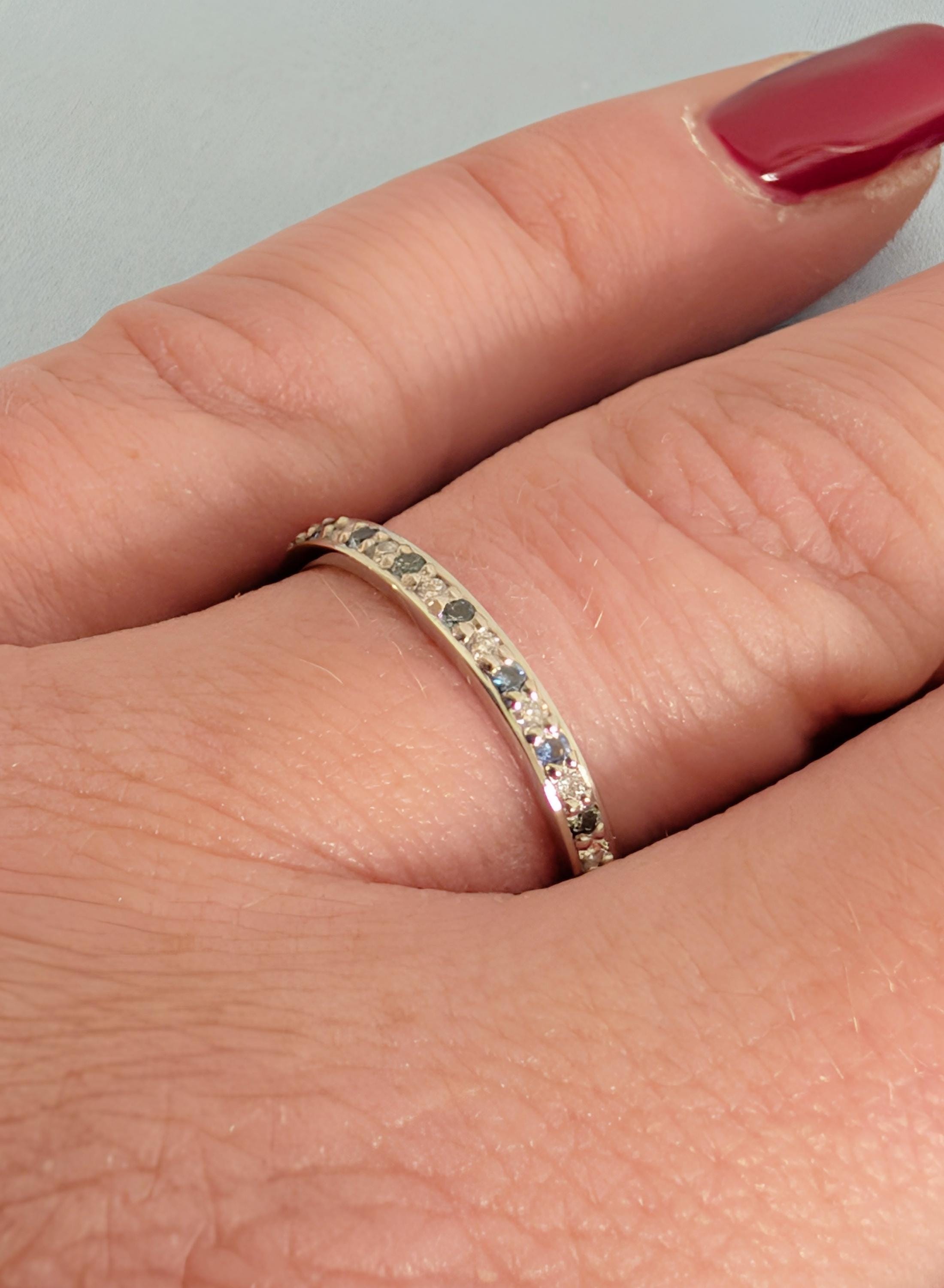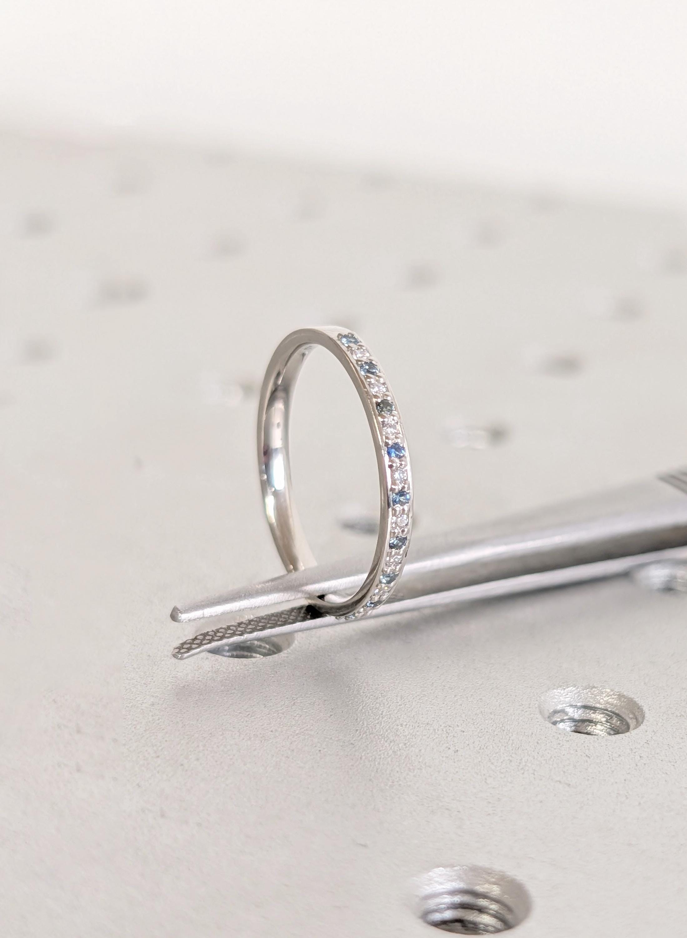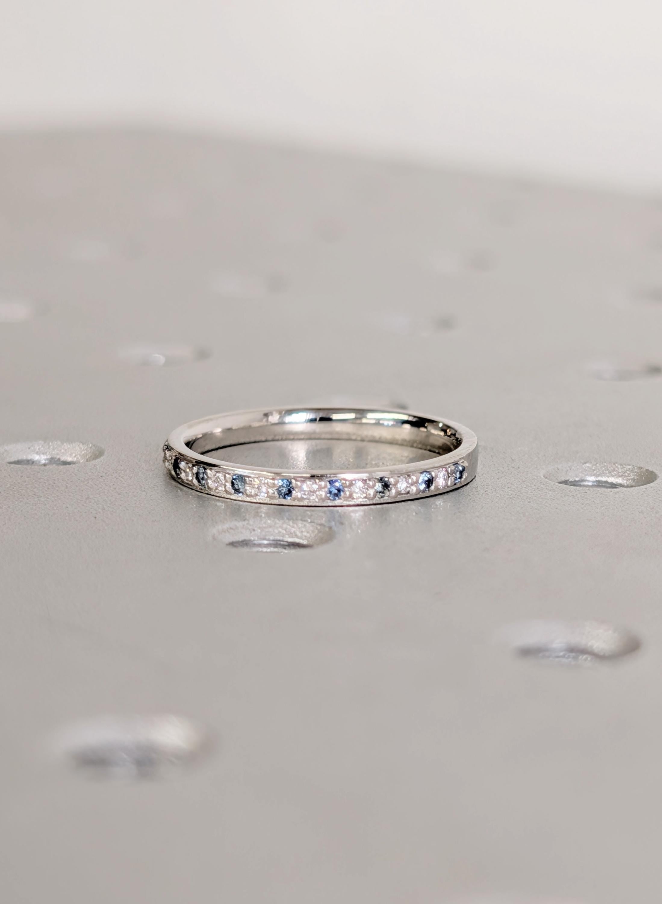 This elegant matching ring features round pave-set Diamond, Moissanite or Lab Diamond paired with soft blue Sapphire accents, creating a gentle contrast along the band. The slim profile keeps the look refined while adding subtle color and sparkle. Designed to sit beautifully beside an engagement ring, it also works well as a wedding band, anniversary ring, or a meaningful everyday piece.