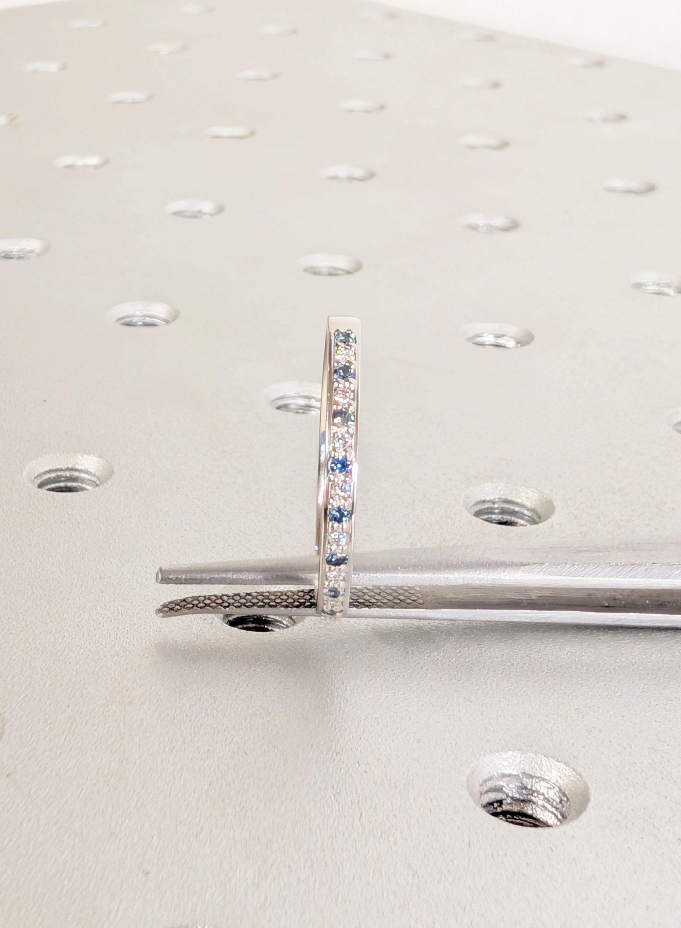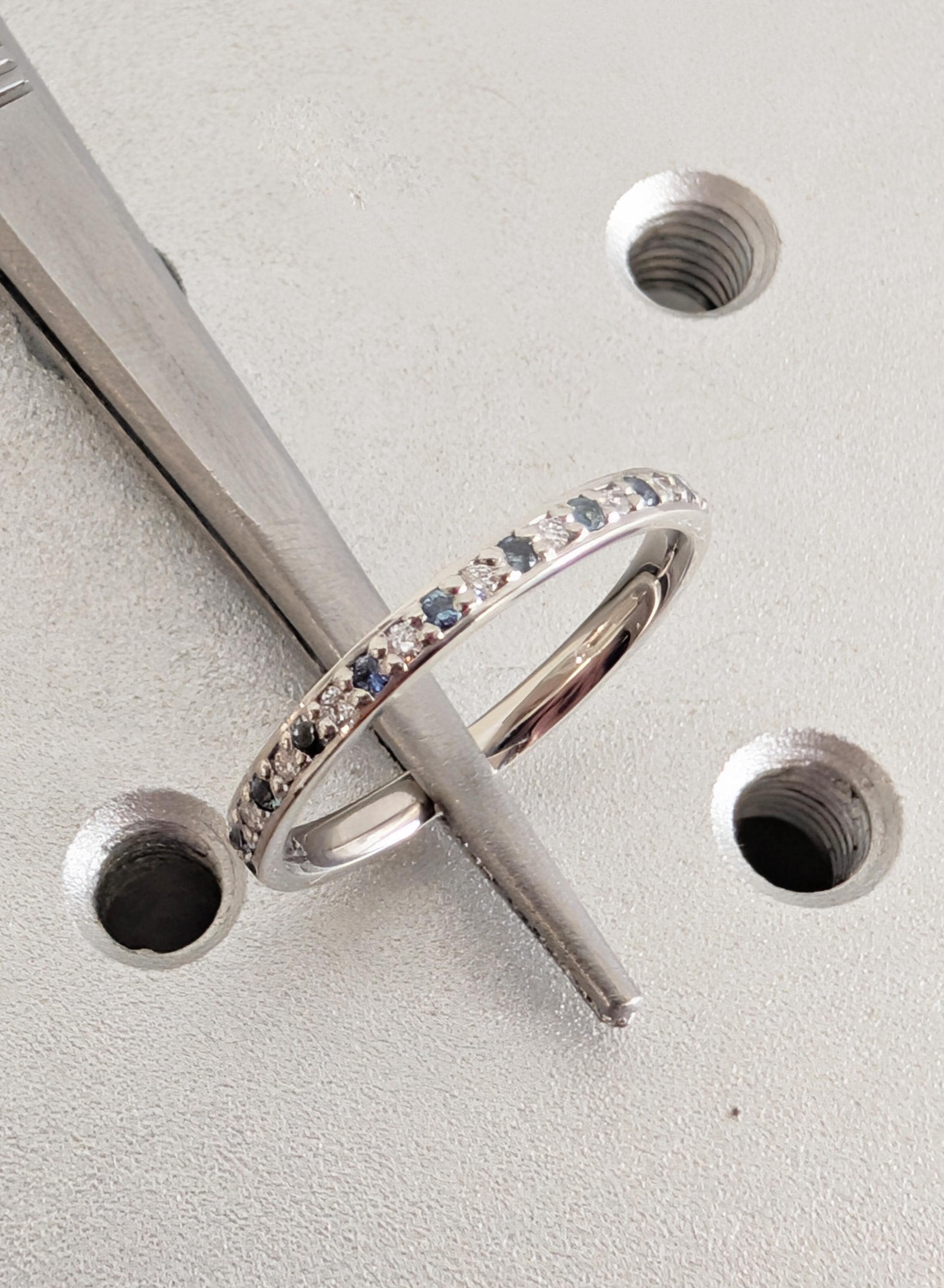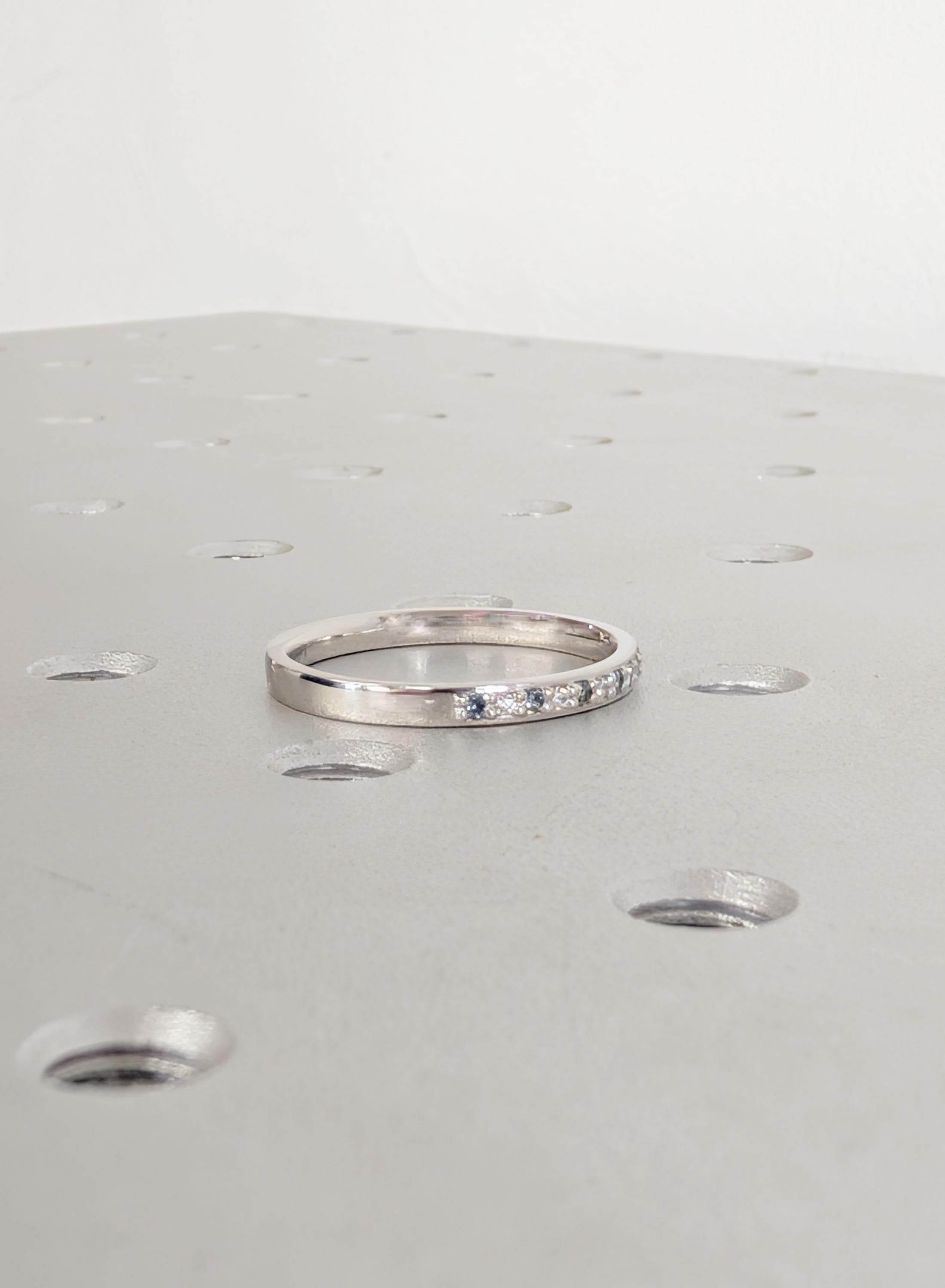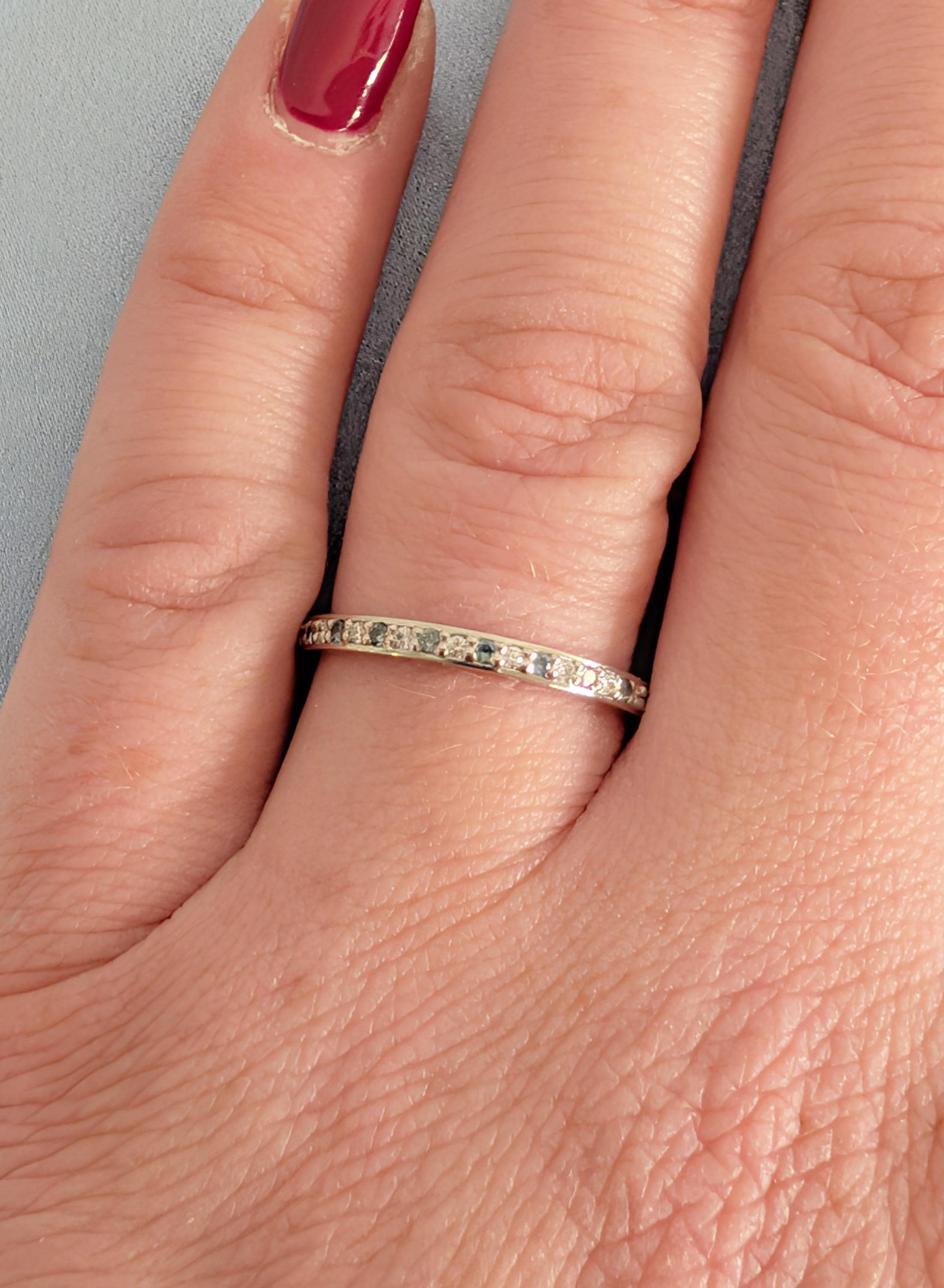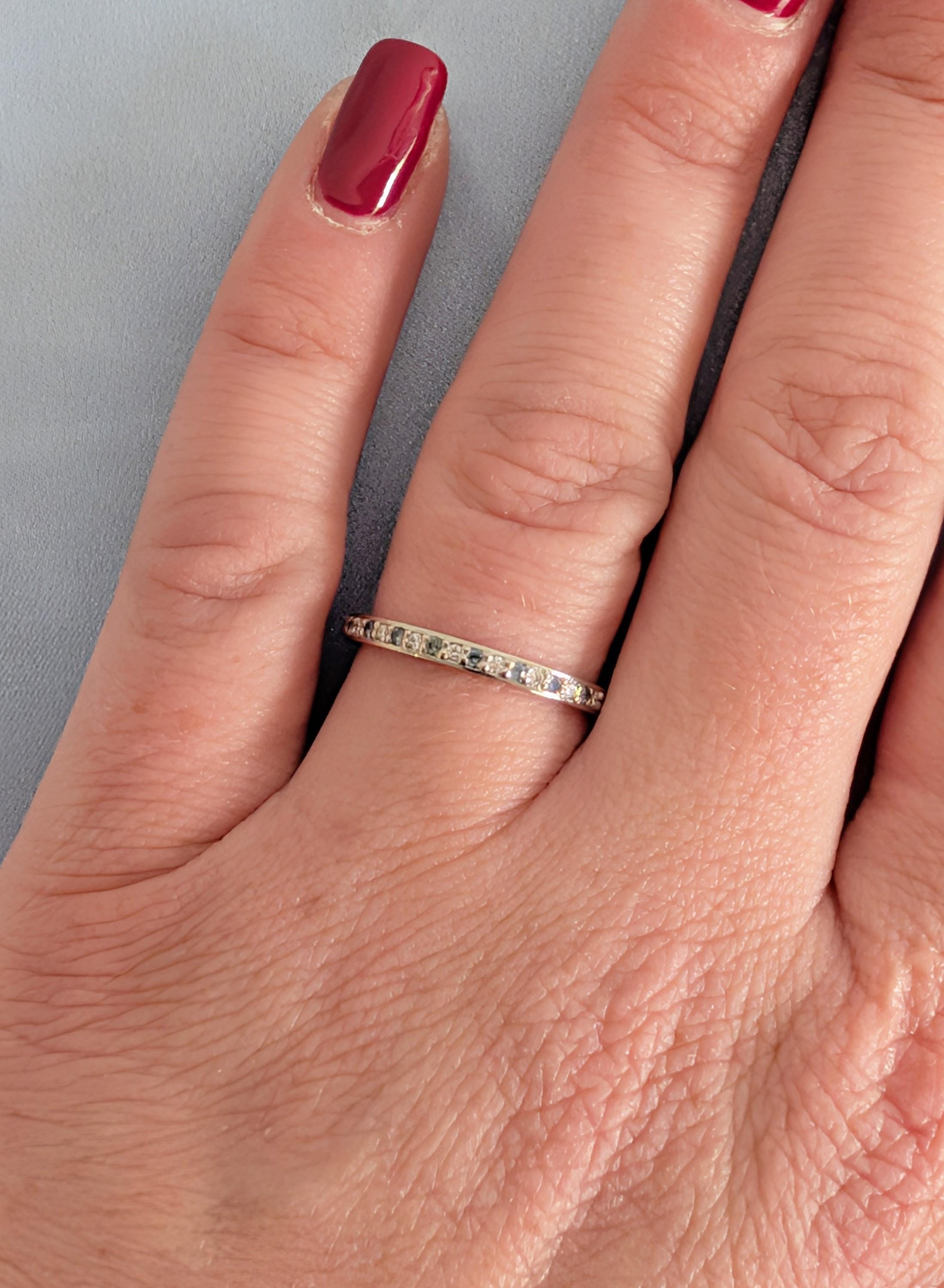 This elegant matching ring features round pave-set Diamond, Moissanite or Lab Diamond paired with soft blue Sapphire accents, creating a gentle contrast along the band. The slim profile keeps the look refined while adding subtle color and sparkle. Designed to sit beautifully beside an engagement ring, it also works well as a wedding band, anniversary ring, or a meaningful everyday piece.
