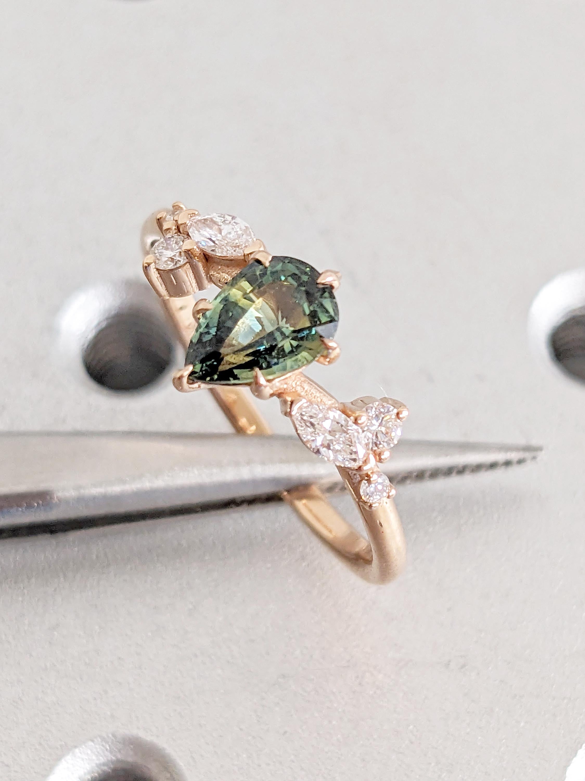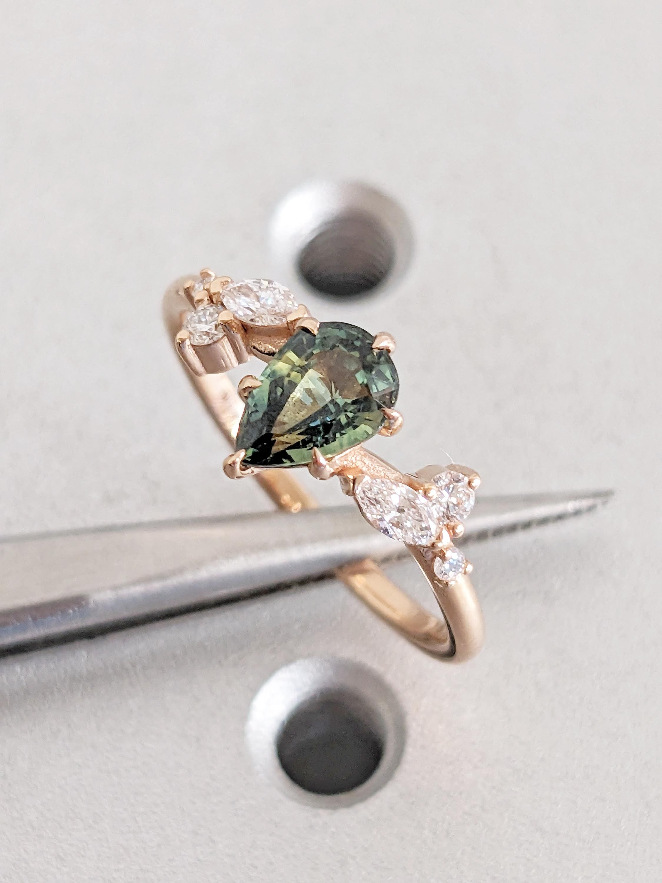 At the heart of this enchanting engagement ring lies a pear-cut Teal Sapphire, secured by six graceful talon prongs for a classic and durable design. The band features round and marquise accent stones resembling the shape of delicate leaves, blending natural beauty with timeless elegance. Personalize your ring with side stones of natural diamonds, lab diamonds, or Moissanites for a unique touch. Perfect for an ethereal wedding, this design beautifully captures the essence of nature and the magic of everlasting love.