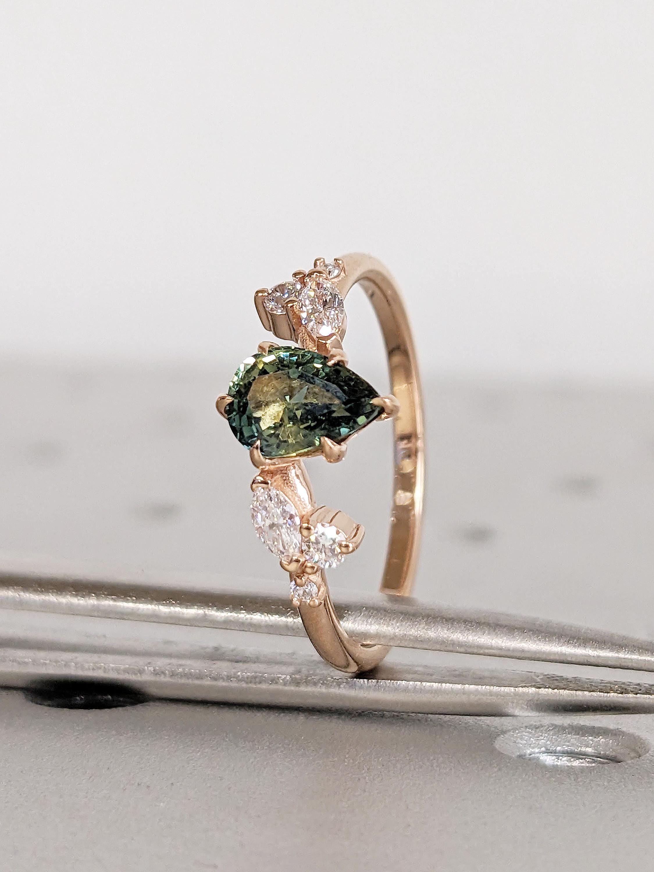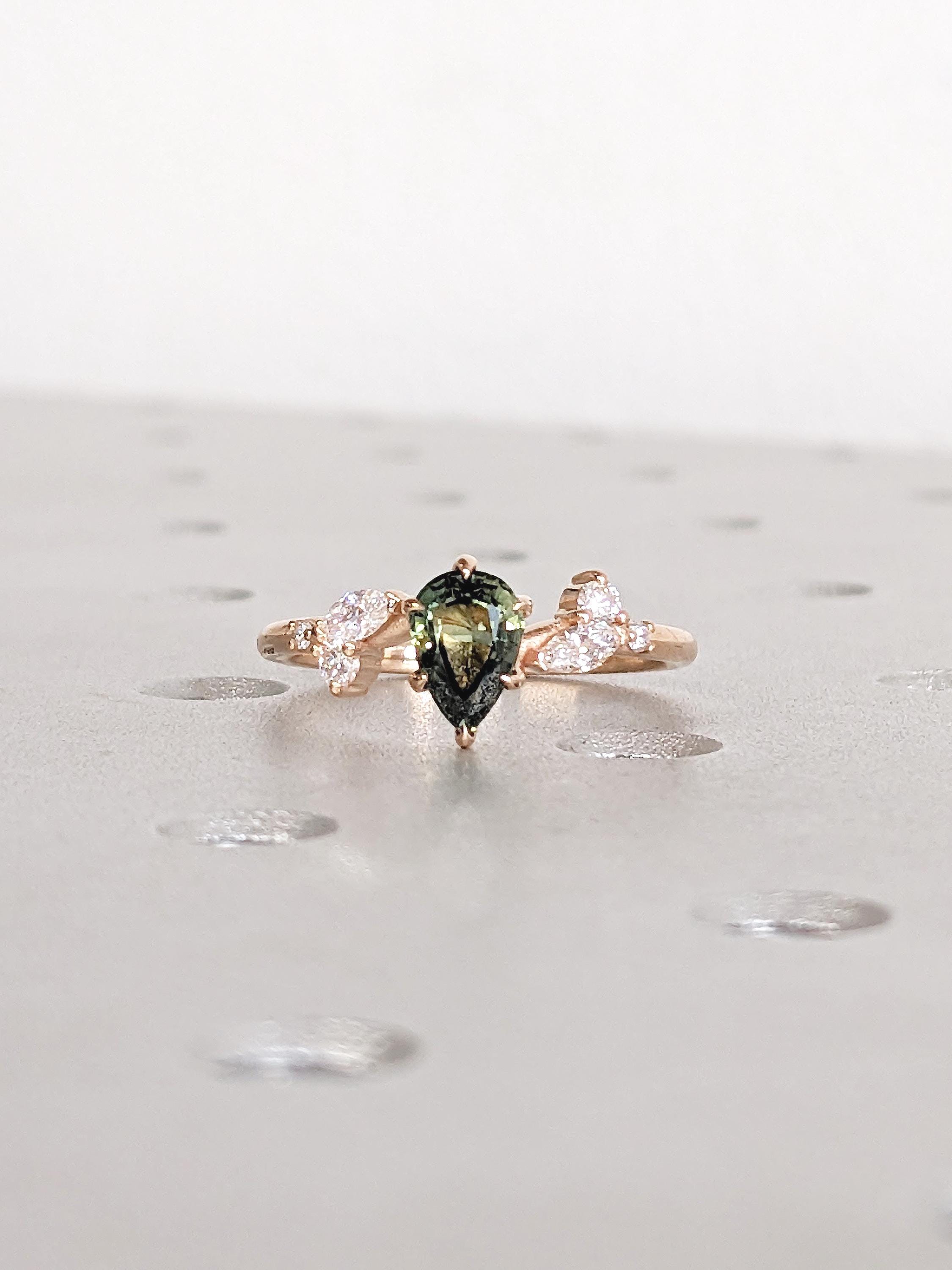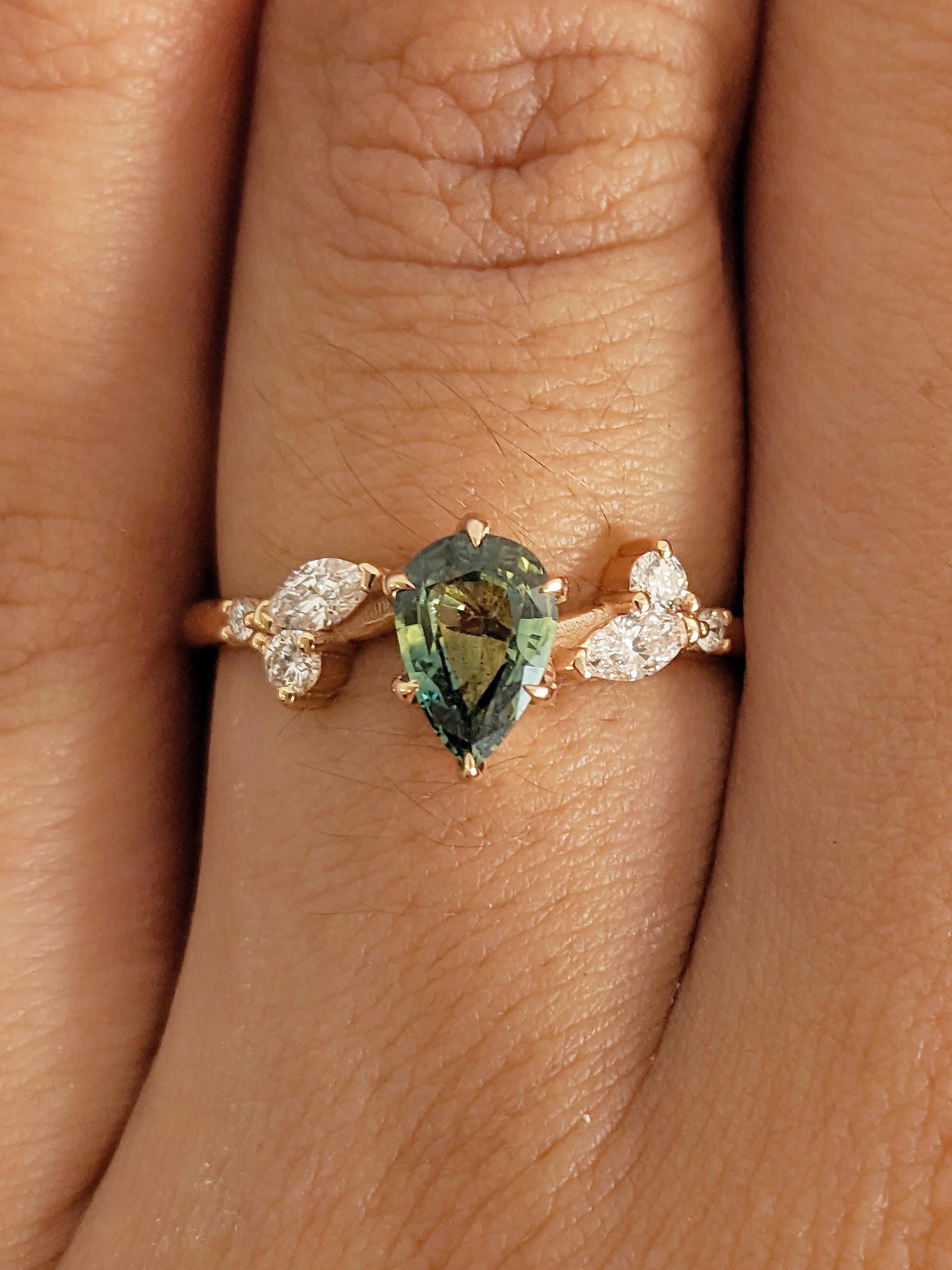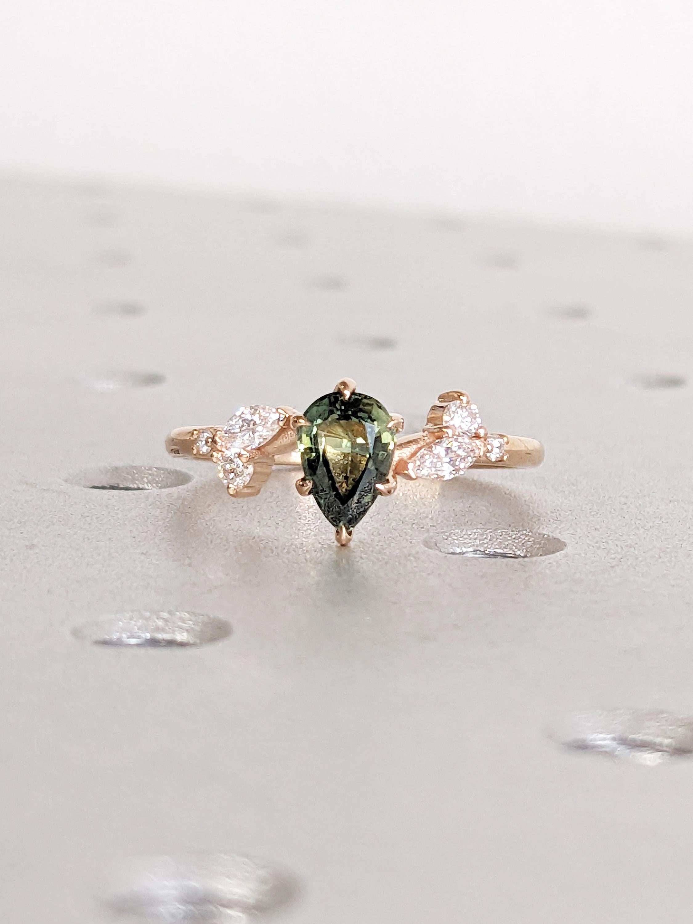 Teal Sapphire Engagement Ring, 18k Rose Gold Nature Inspired Ring, Pear Cut Green Blue Sapphire Ring, Art Deco Moissanite Floral Leaf Ring