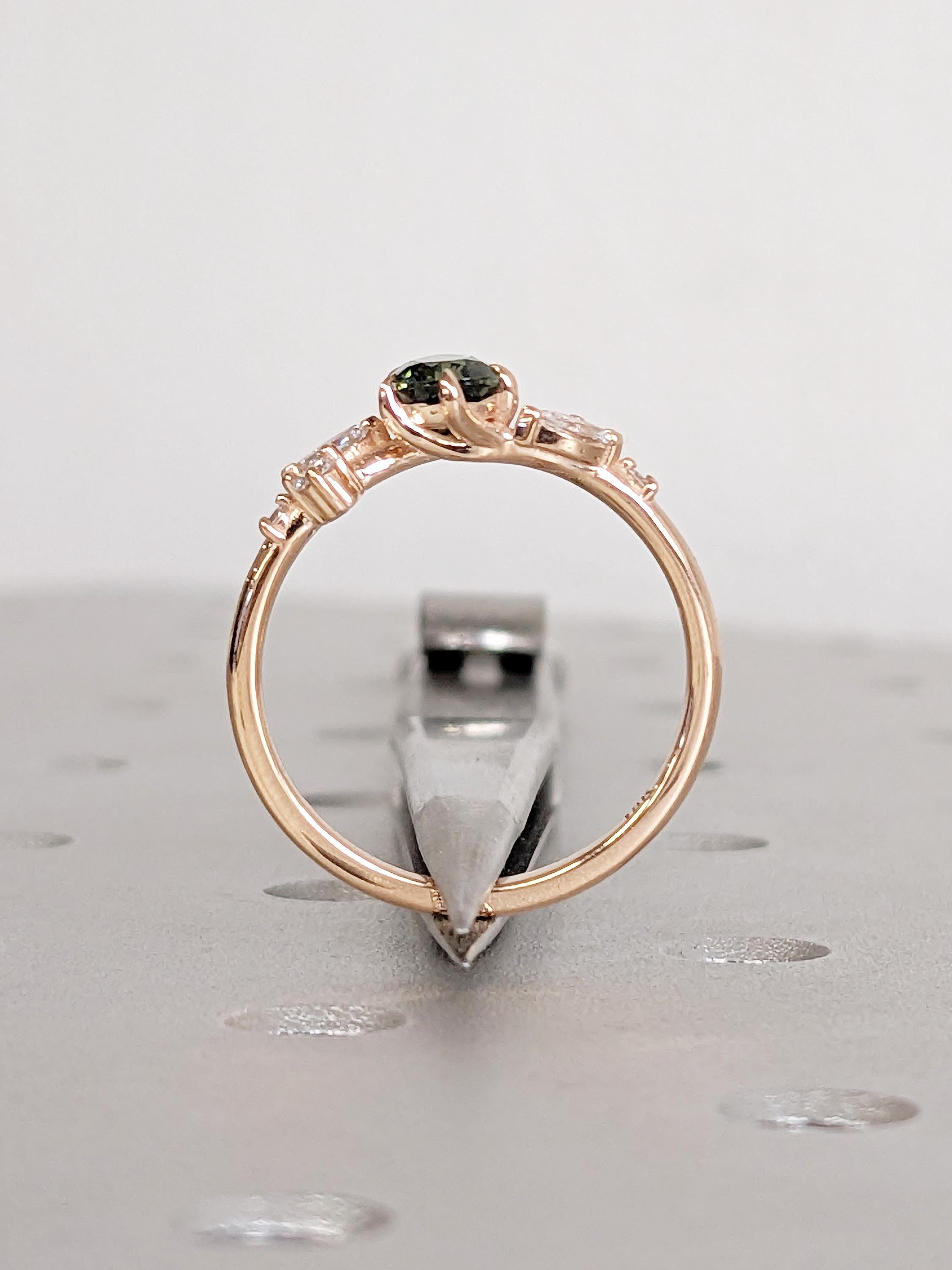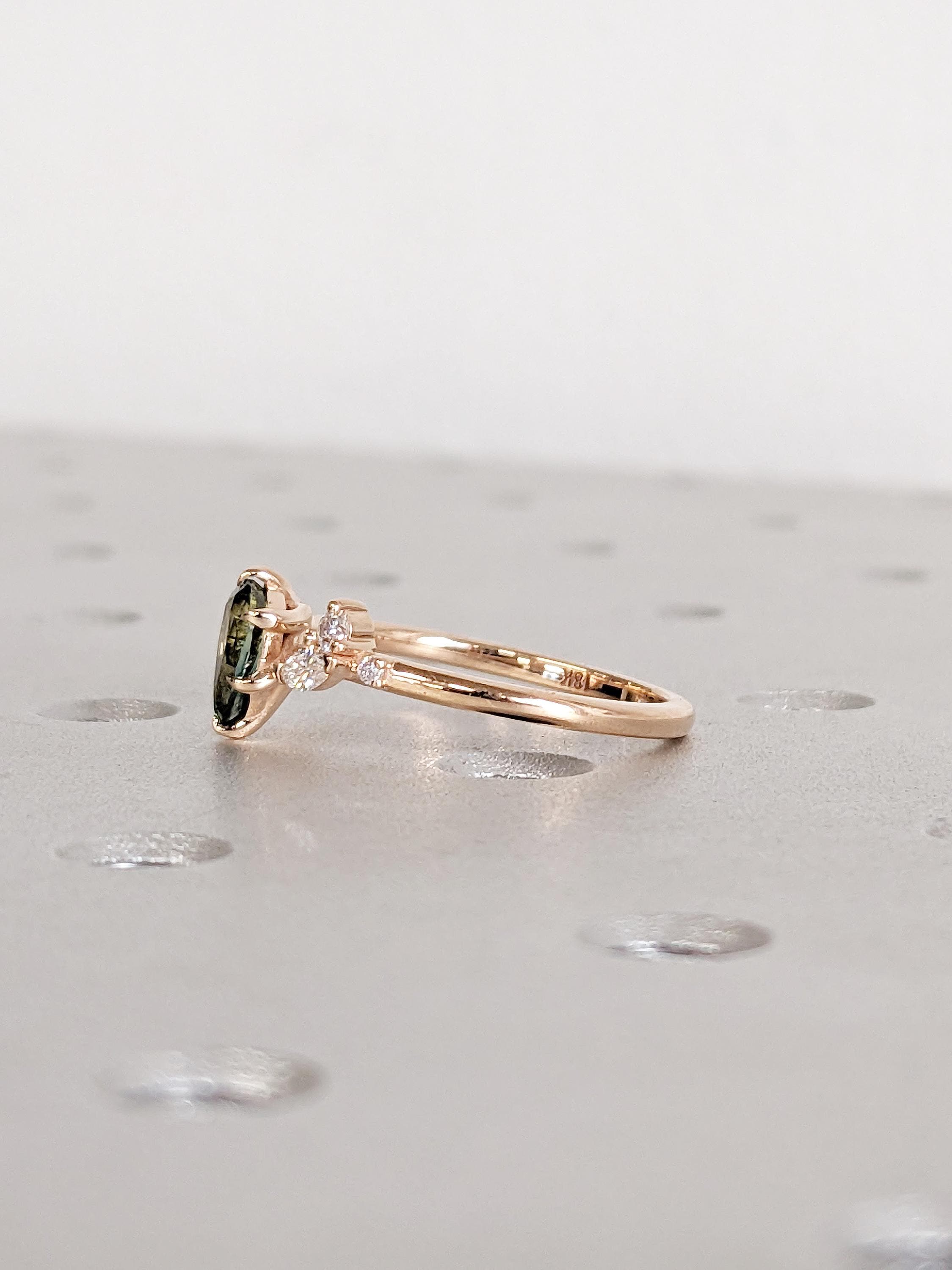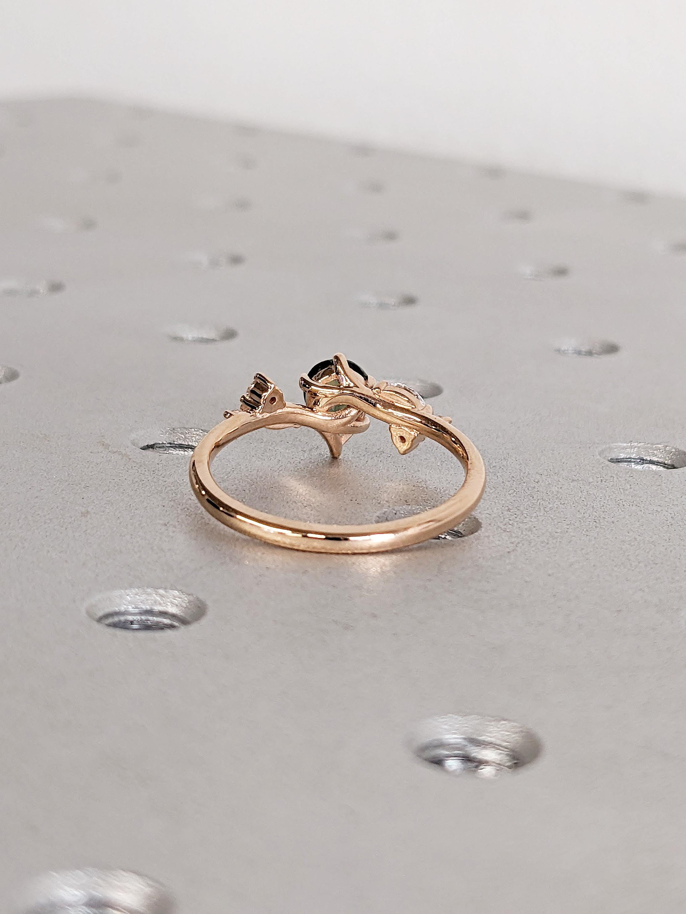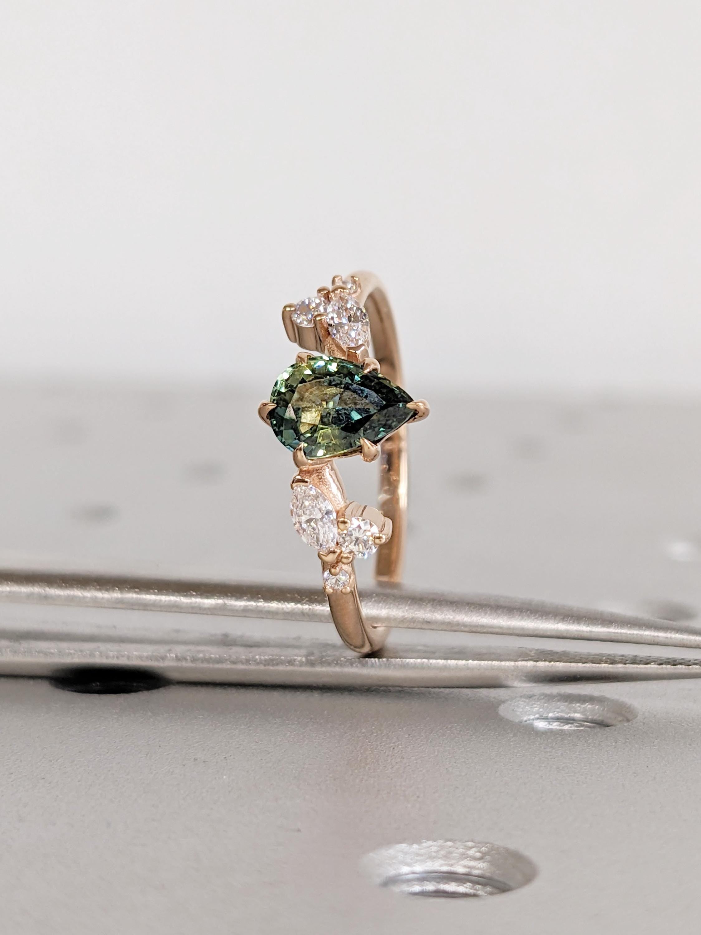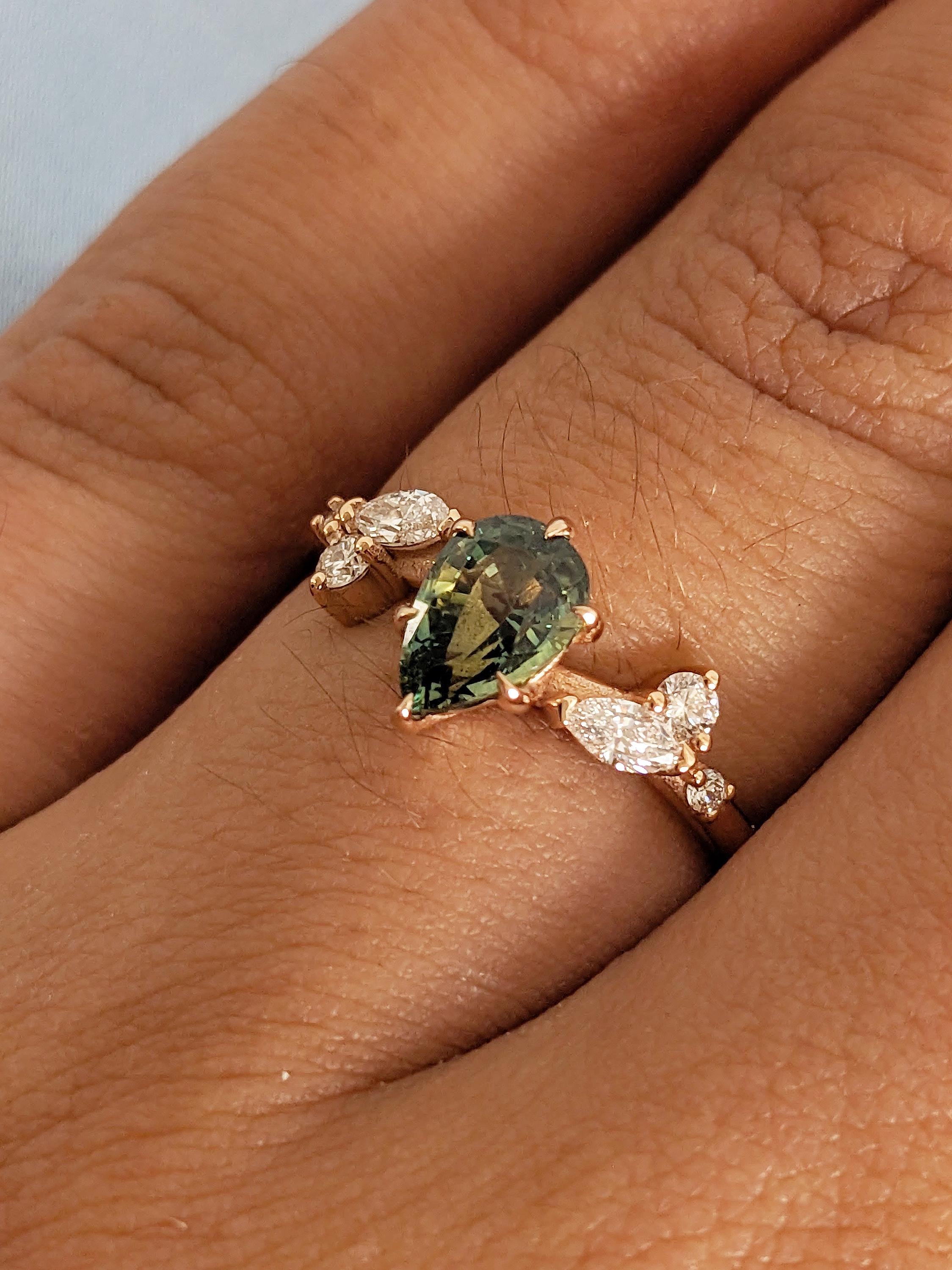 Teal Sapphire Engagement Ring, 18k Rose Gold Nature Inspired Ring, Pear Cut Green Blue Sapphire Ring, Art Deco Moissanite Floral Leaf Ring