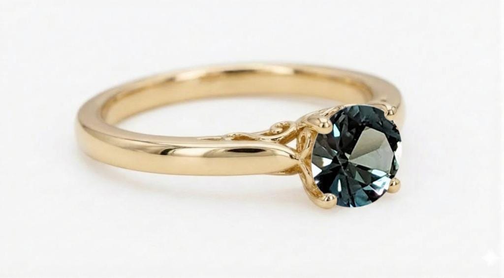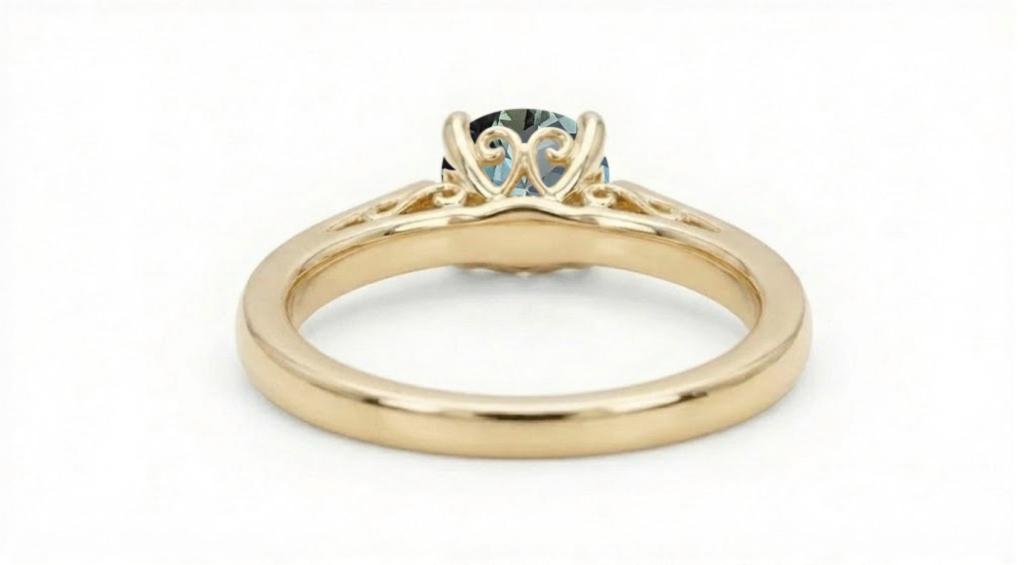 This engagement ring features a captivating round Peacock Sapphire center stone that shimmers with vibrant blue-green tones. Intricate filigree detailing beneath the setting adds a romantic, vintage touch that beautifully complements the gem’s color play. Set on a slender 1.8mm–2mm gold band, it offers a graceful and refined profile. A perfect choice for anyone drawn to distinctive gemstones and elegant craftsmanship.