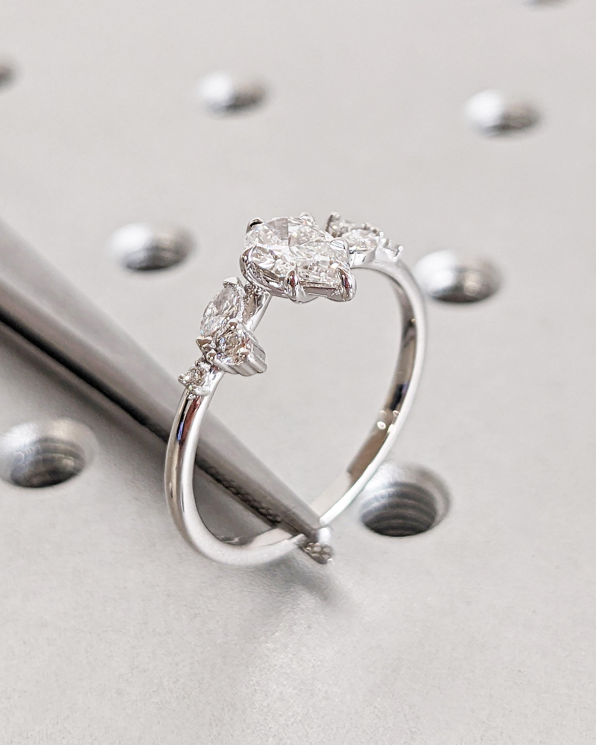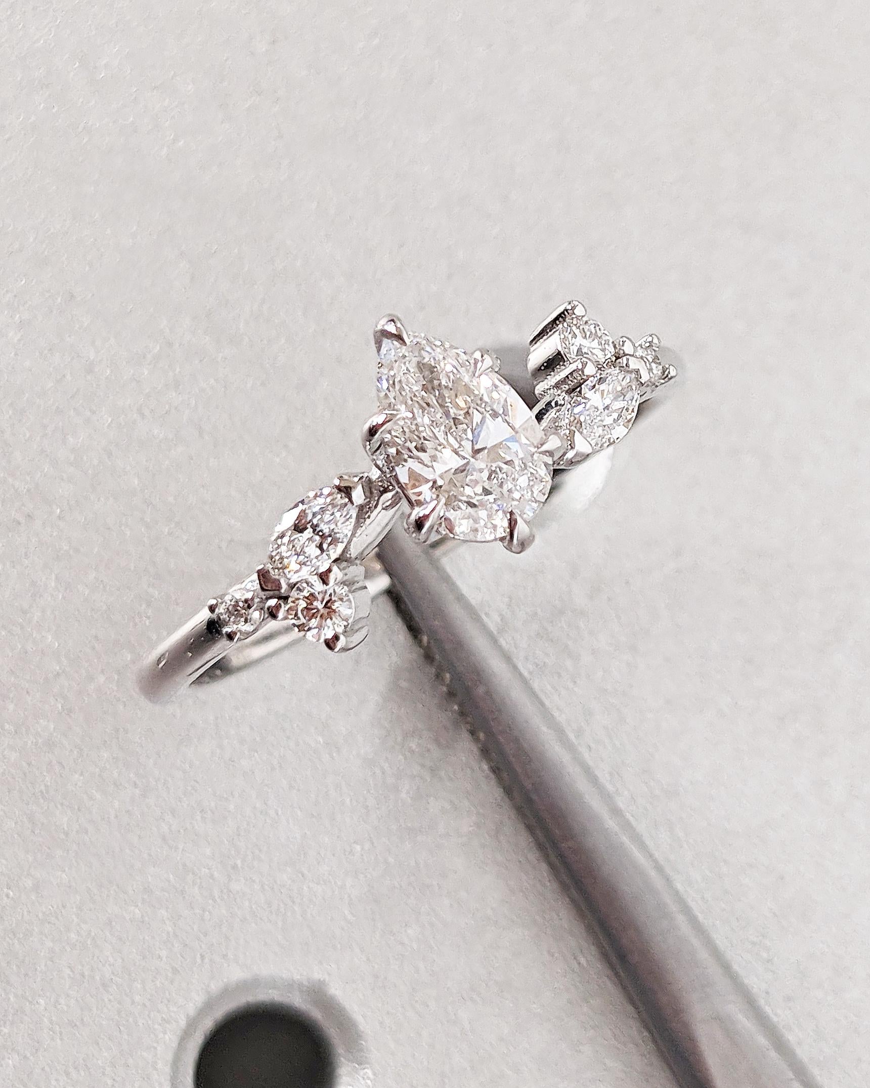 At the heart of this enchanting engagement ring lies a pear-cut Moissanite, secured by six graceful talon prongs for a classic and durable design. The band features round and marquise accent stones resembling the shape of delicate leaves, blending natural beauty with timeless elegance. Personalize your ring with side stones of natural diamonds, lab diamonds, or Moissanites for a unique touch. Perfect for an ethereal wedding, this design beautifully captures the essence of nature and the magic of everlasting love.