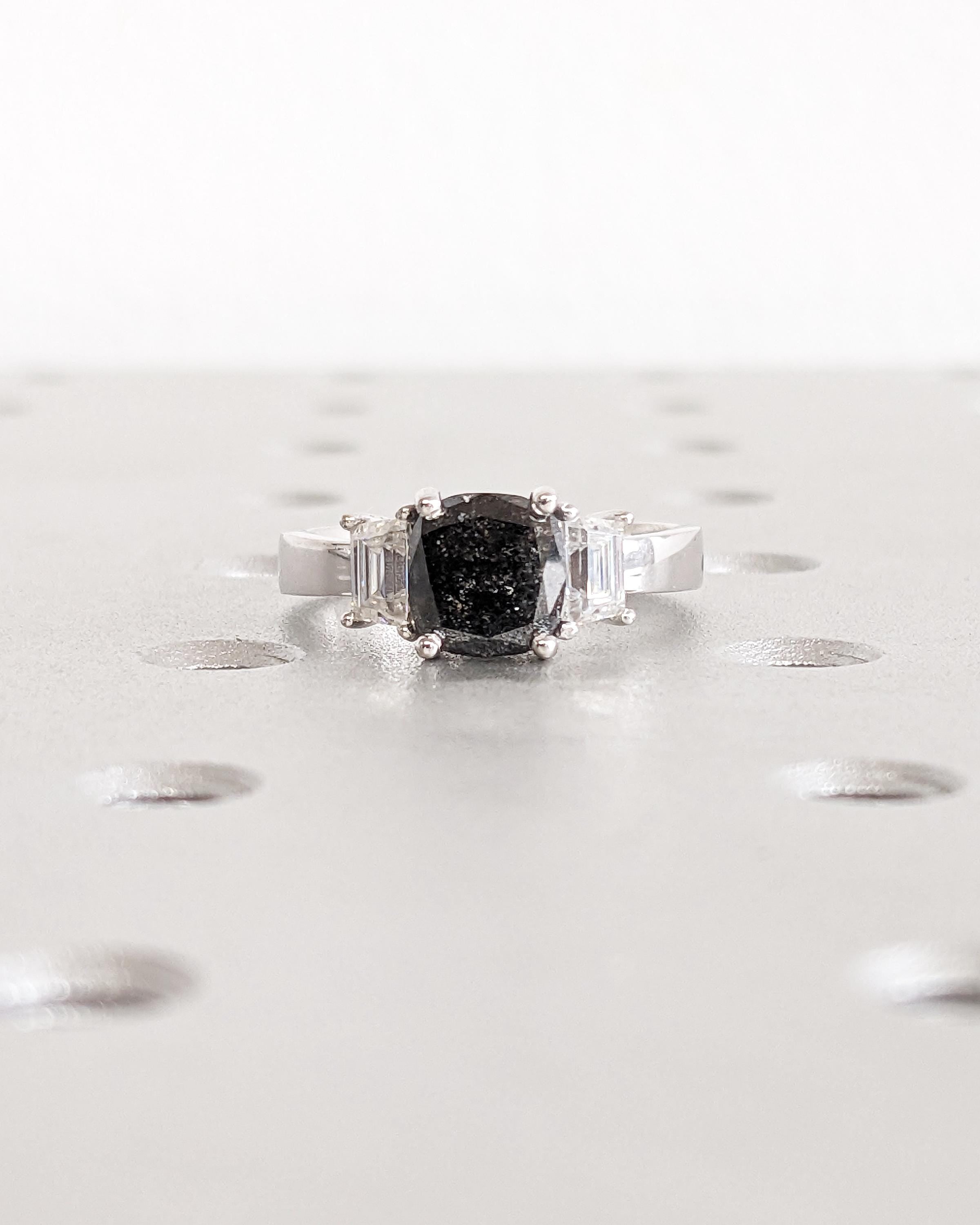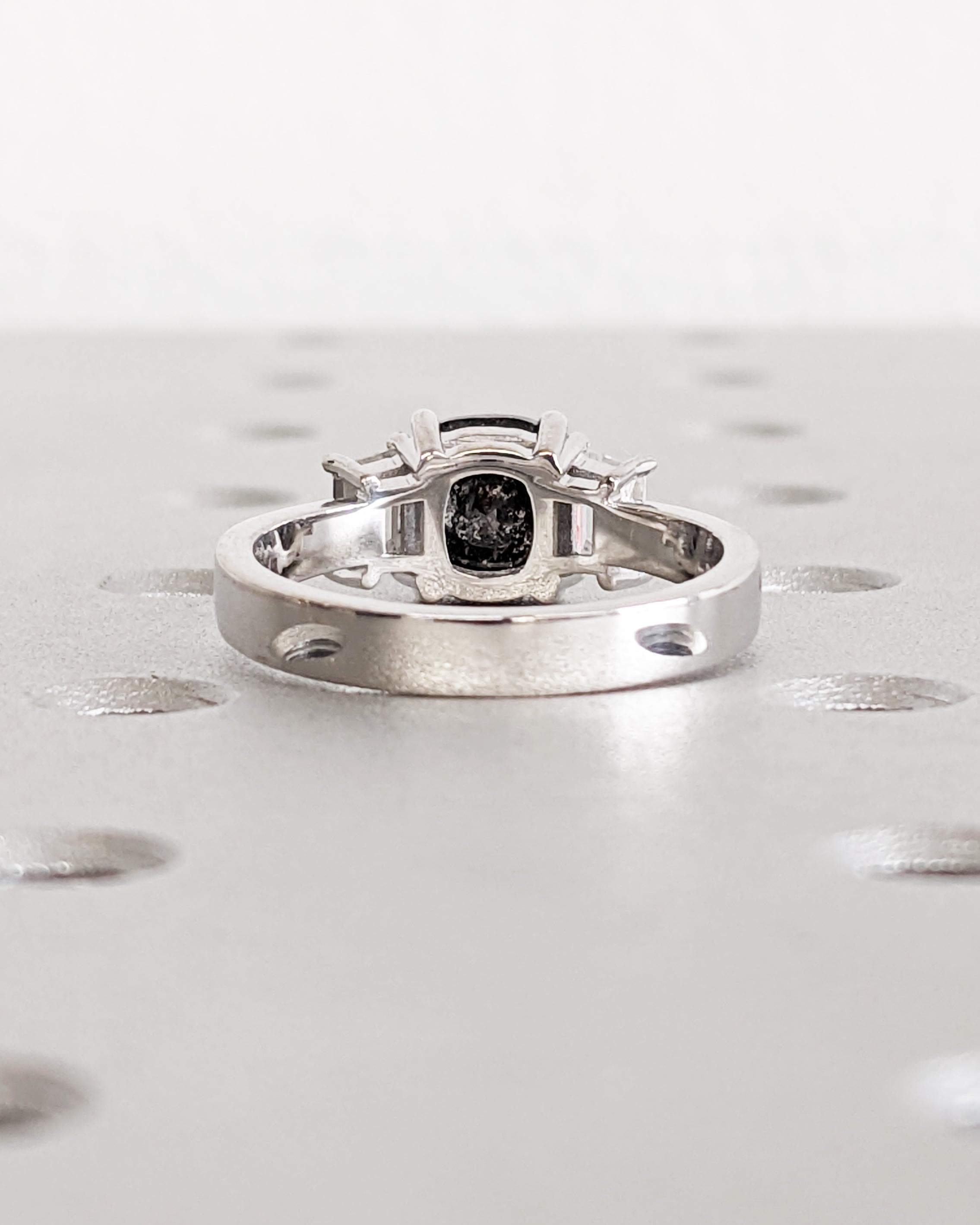 This ring features a stunning cushion cut Salt and Pepper diamond as the centerpiece, flanked by two trapezoid Moissanite side stones for a modern three stone design. The unique mix of natural character and refined sparkle makes it a perfect choice for an alternative engagement ring. Timeless and meaningful, it symbolizes individuality and love in a truly unique way.