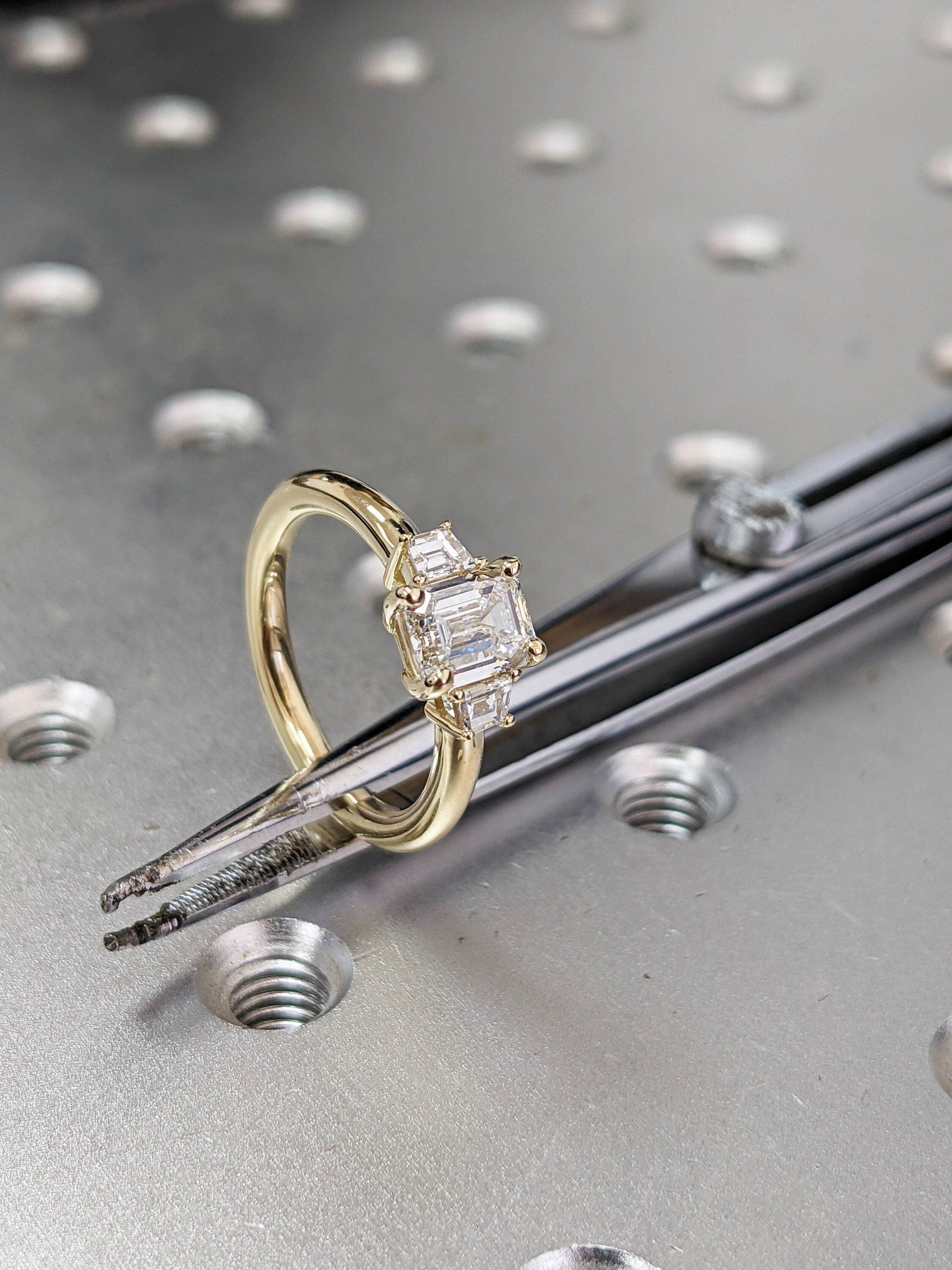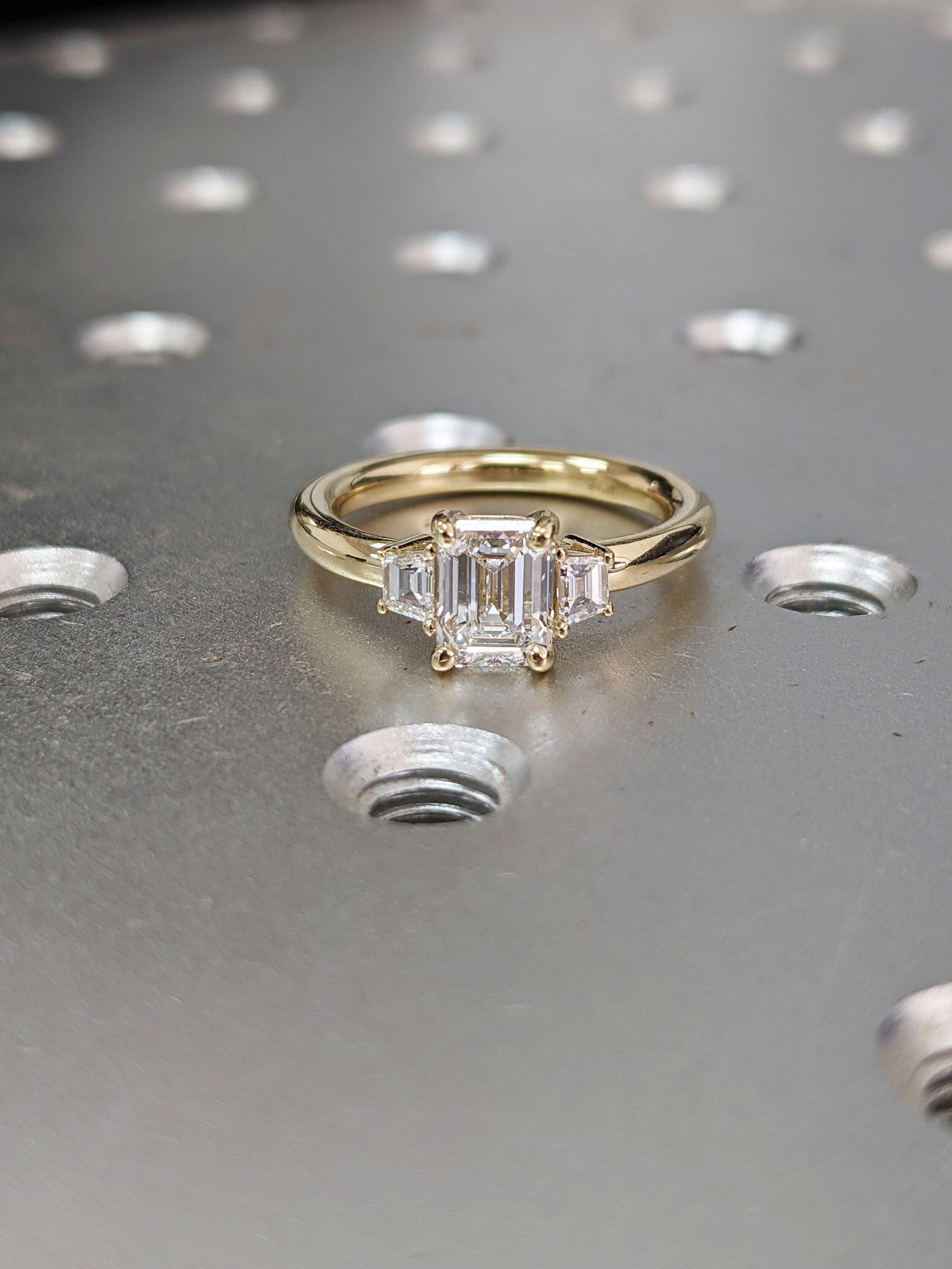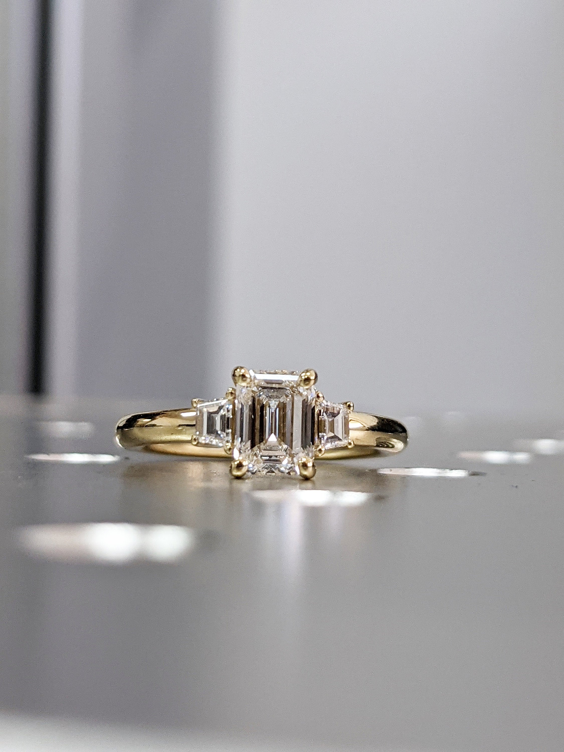 Three Stone Emerald Cut Moissanite Engagement Ring, Side Trapezoid Moissanite, Three Stone Engagement Ring, Emerald Cut and trapezoid Cut moissanite engagement ring