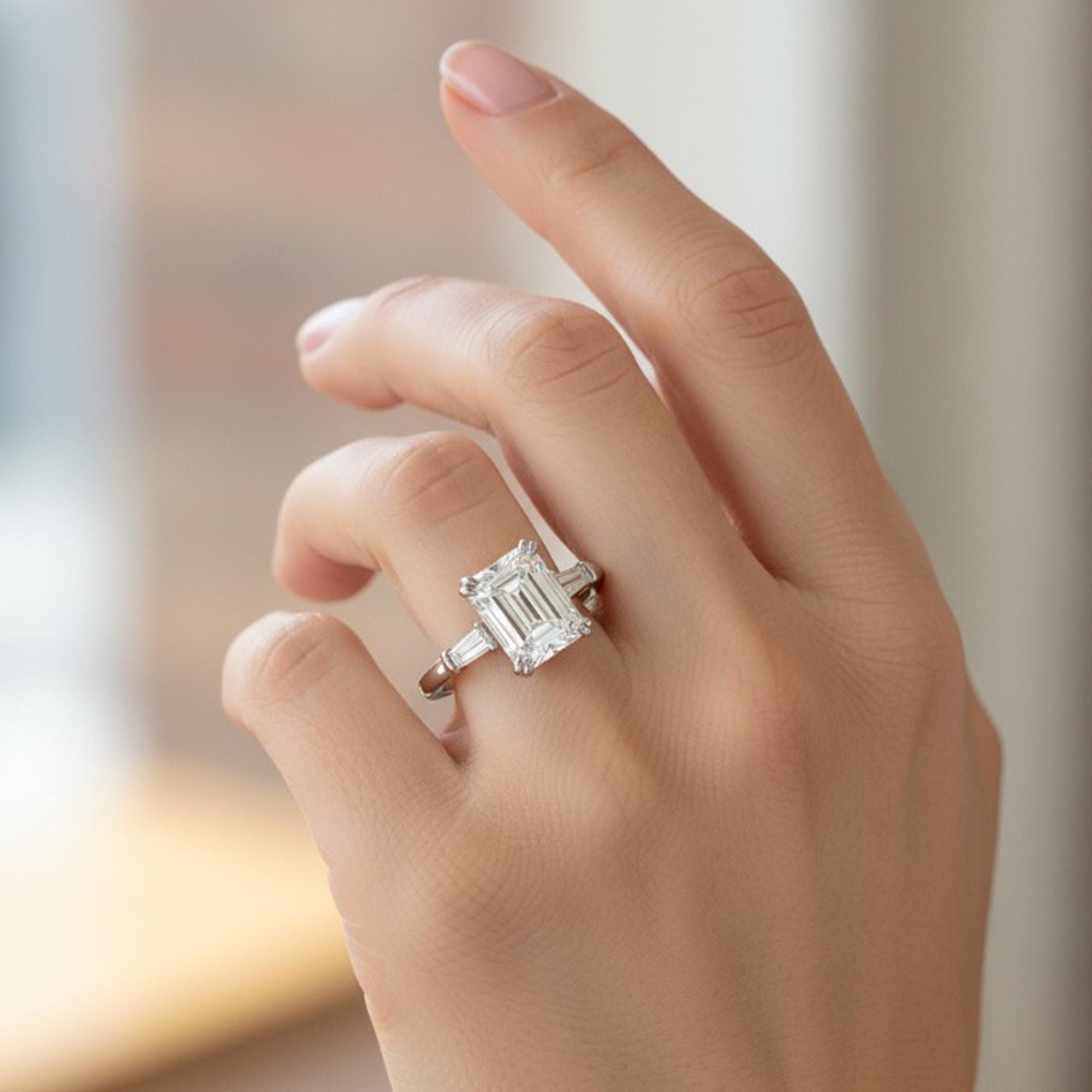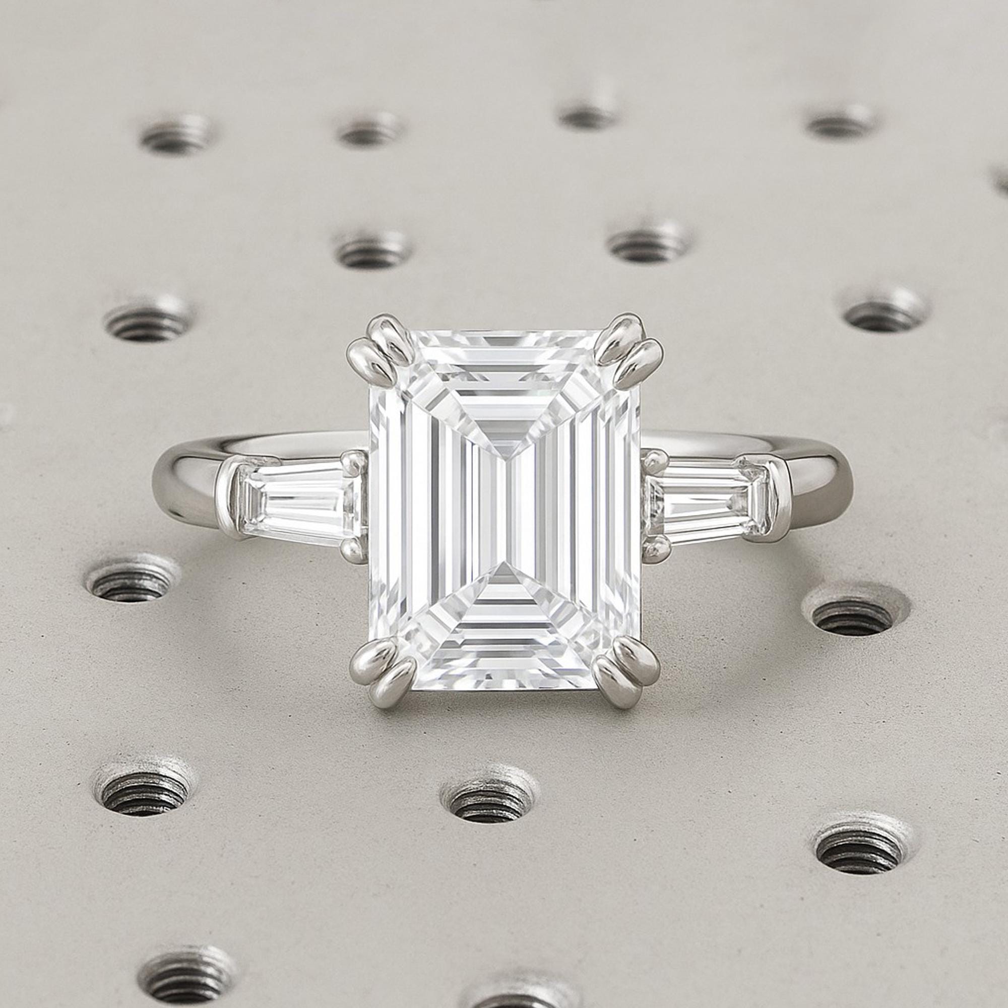 Sleek and timeless, this ring showcases an emerald cut Moissanite at the center, elegantly cradled by double prong head settings and accented by tapered baguette side stones. With its clean lines and understated brilliance, the design captures the elegance of classic artistry with a modern edge.