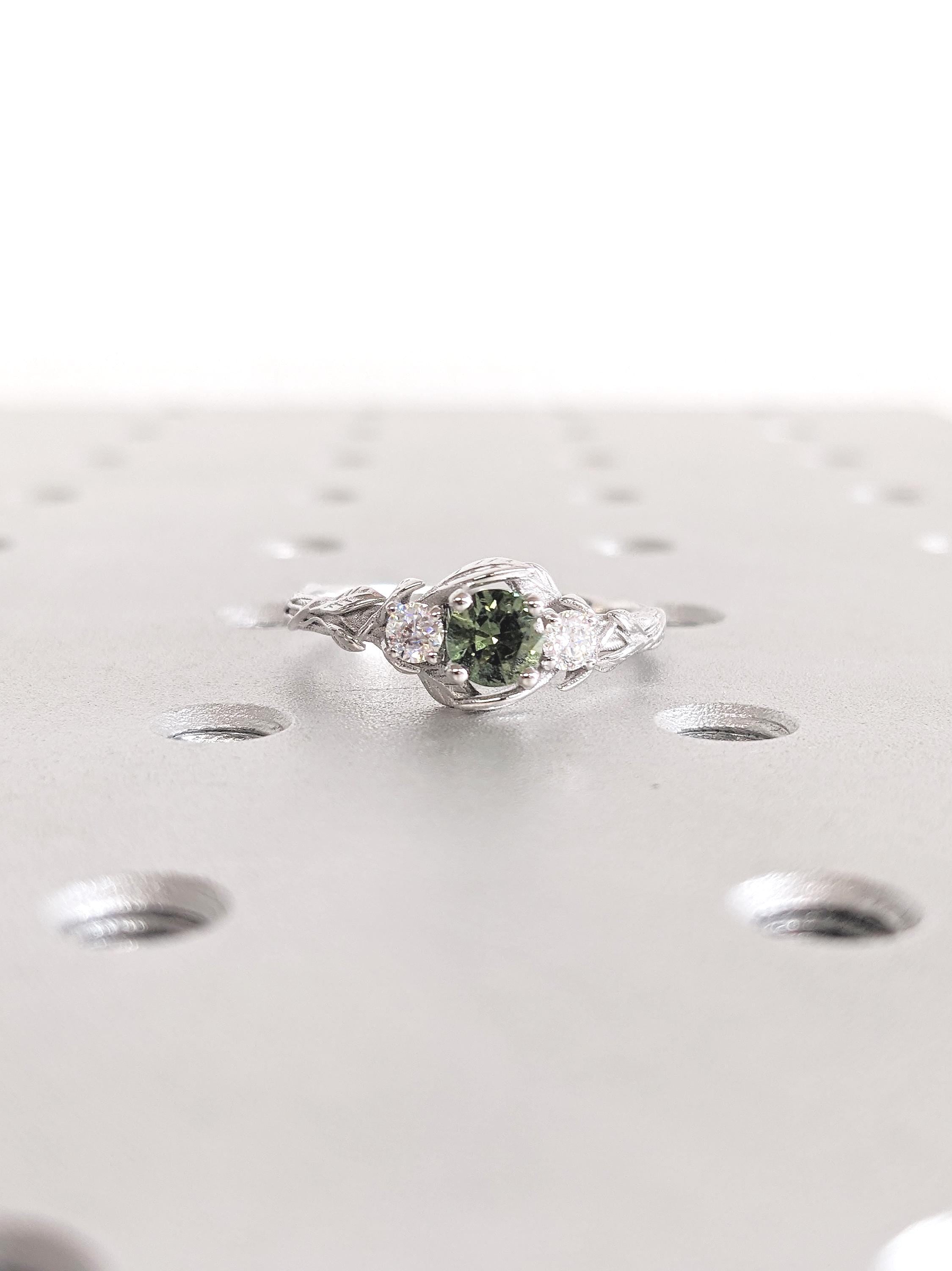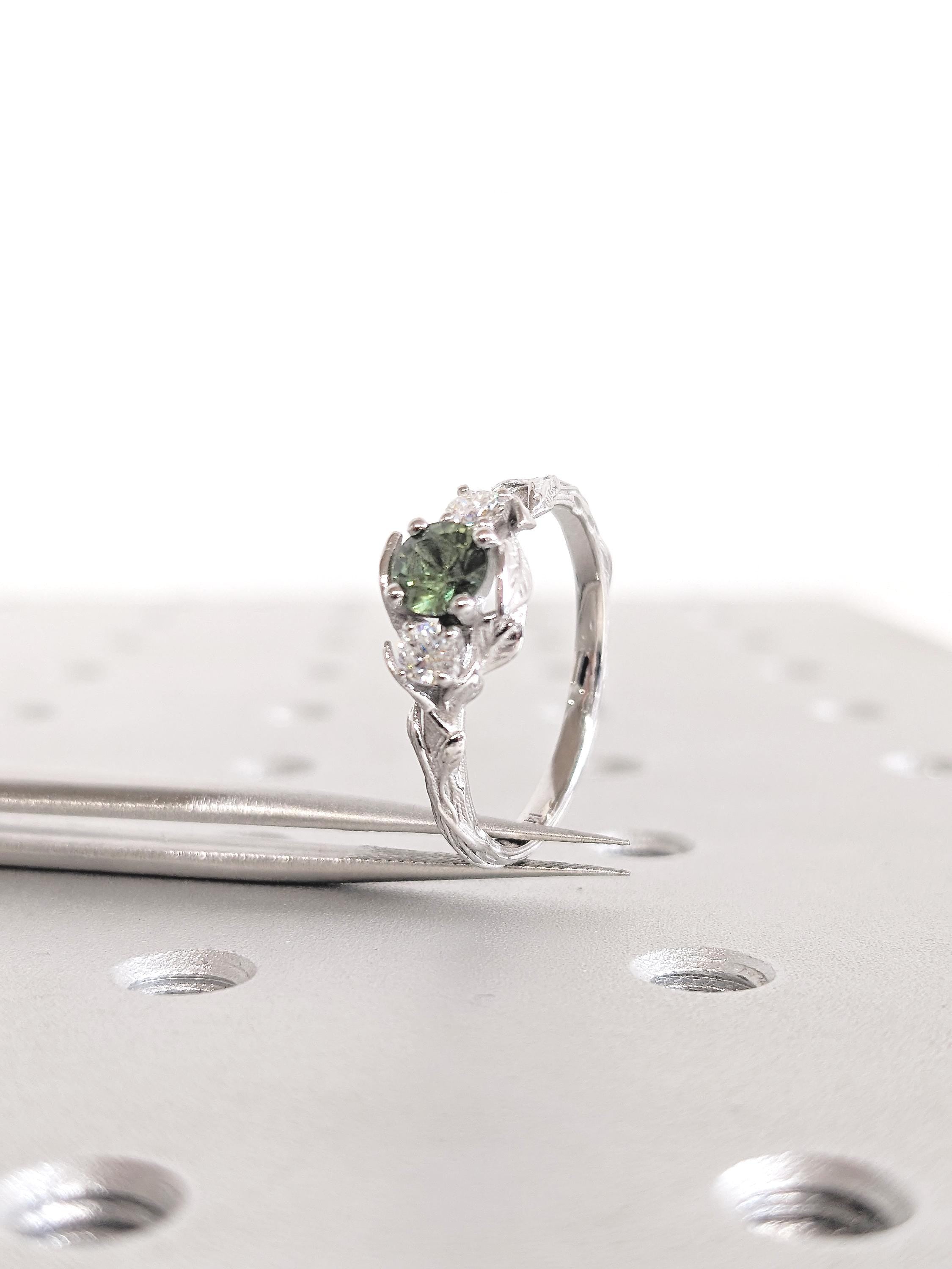 With an alluring blue/green hue from the central Peacock Sapphire setting, framed by elegant leaves motif and twigs engraving on the band, this vintage, nature inspired engagement ring is set with Natural Diamond or Moissanite accents for that added sparkle.