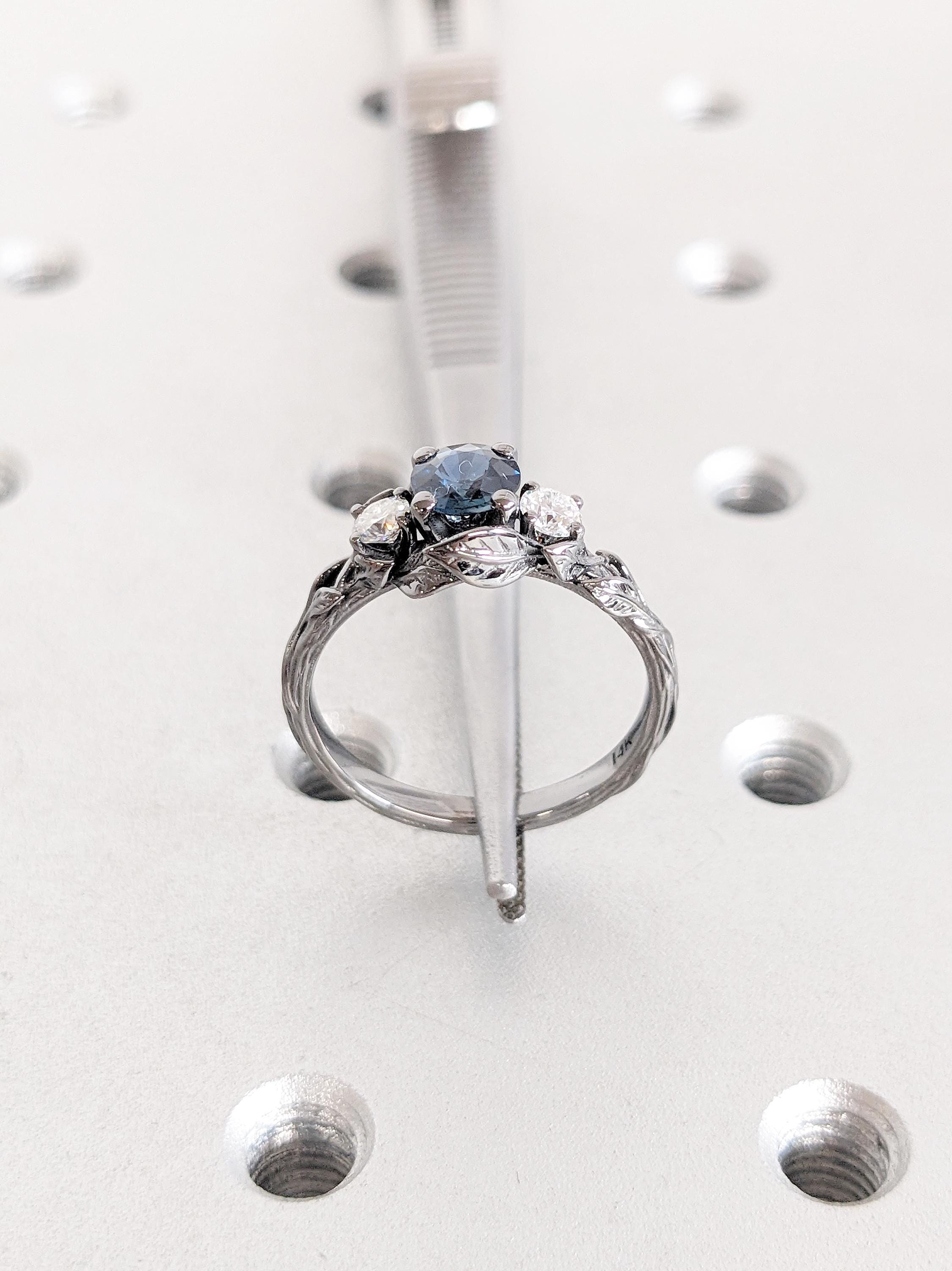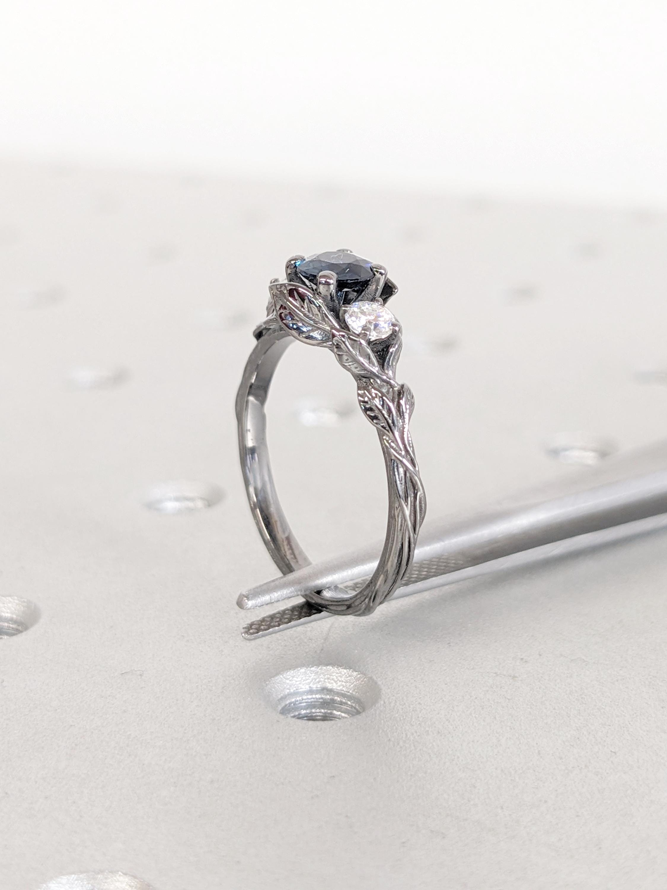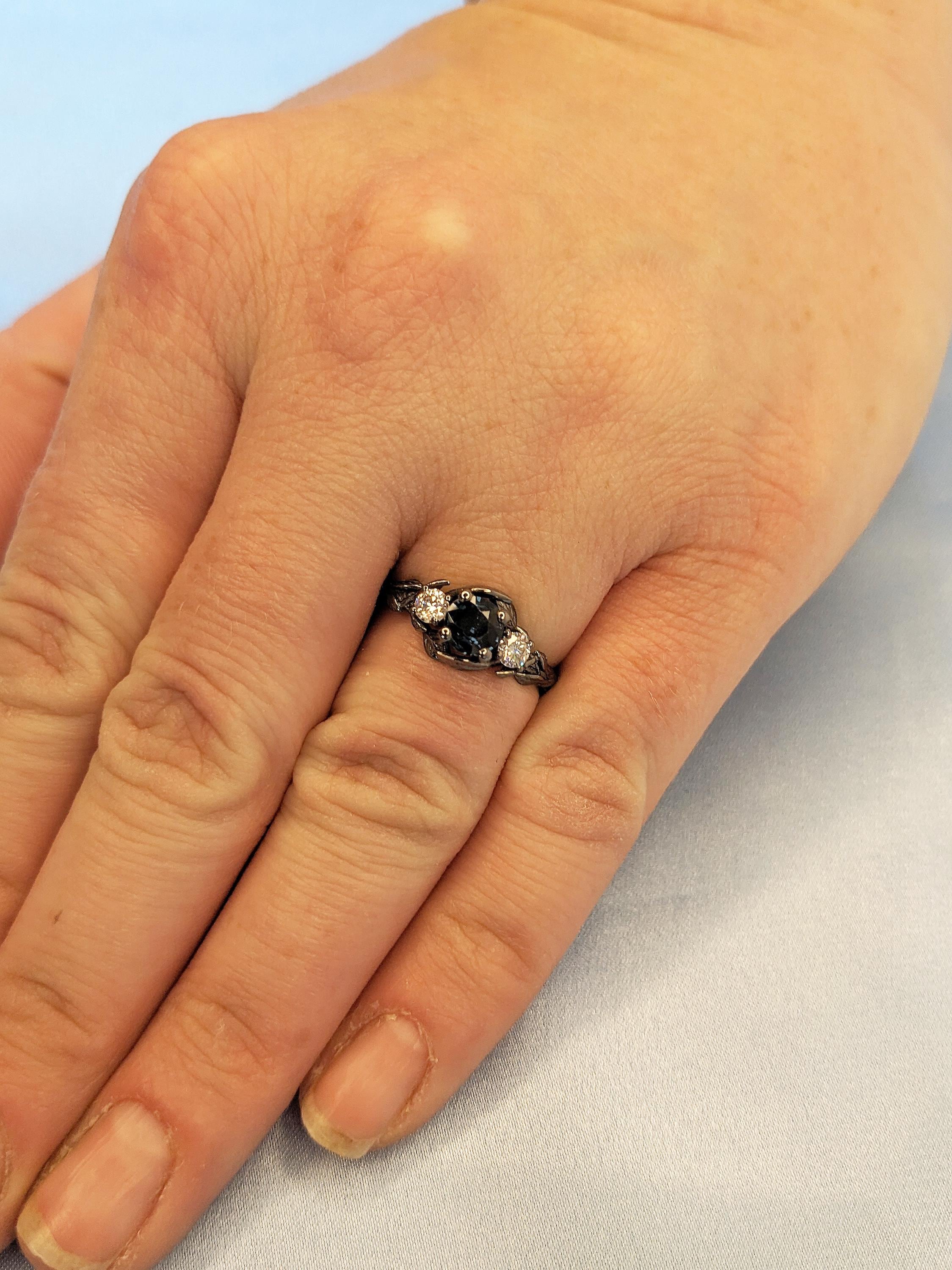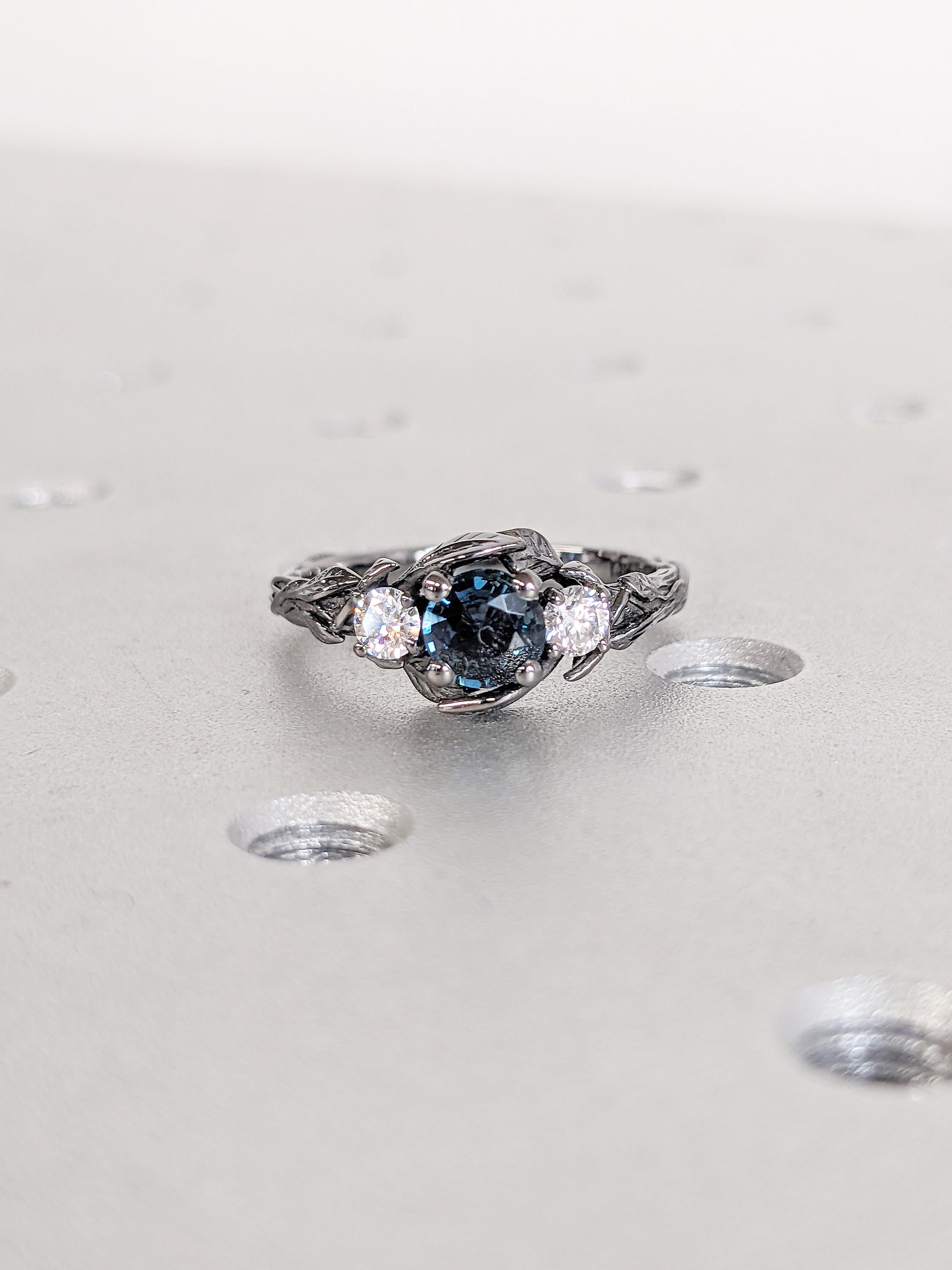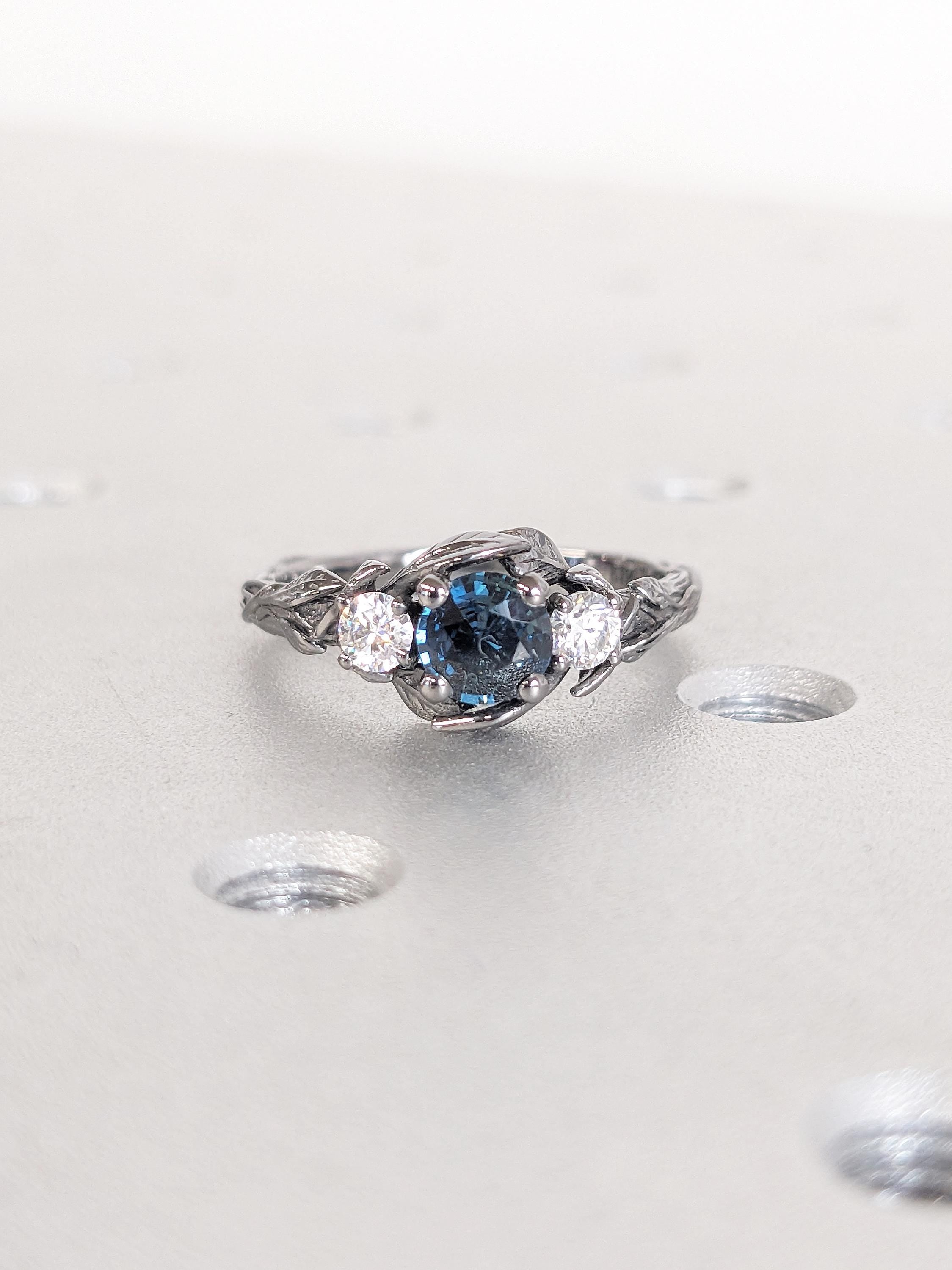 Three Stone Nature Inspired Ring, 14k Black Gold Engagement Ring, Round Peacock Sapphire Ring
