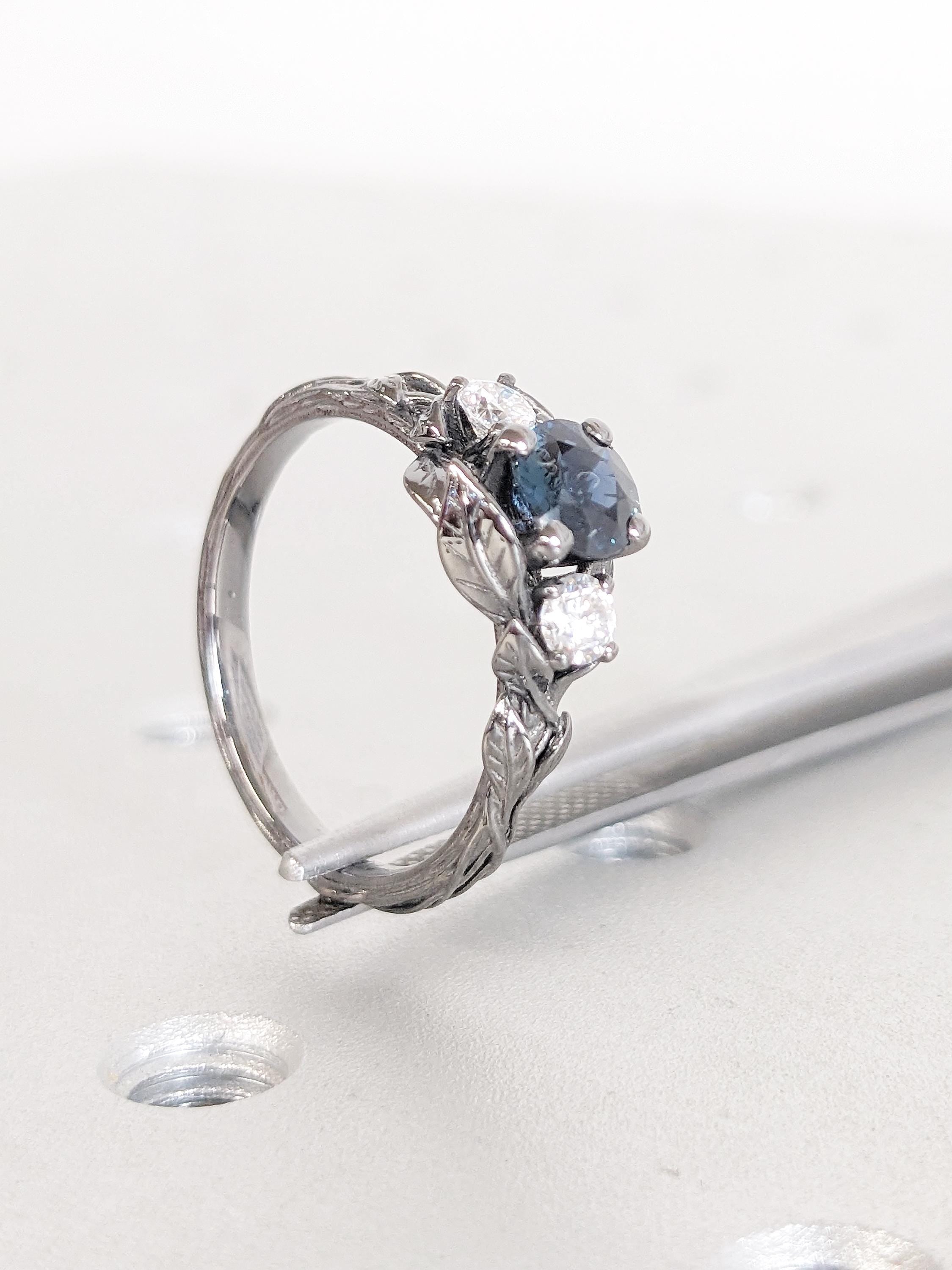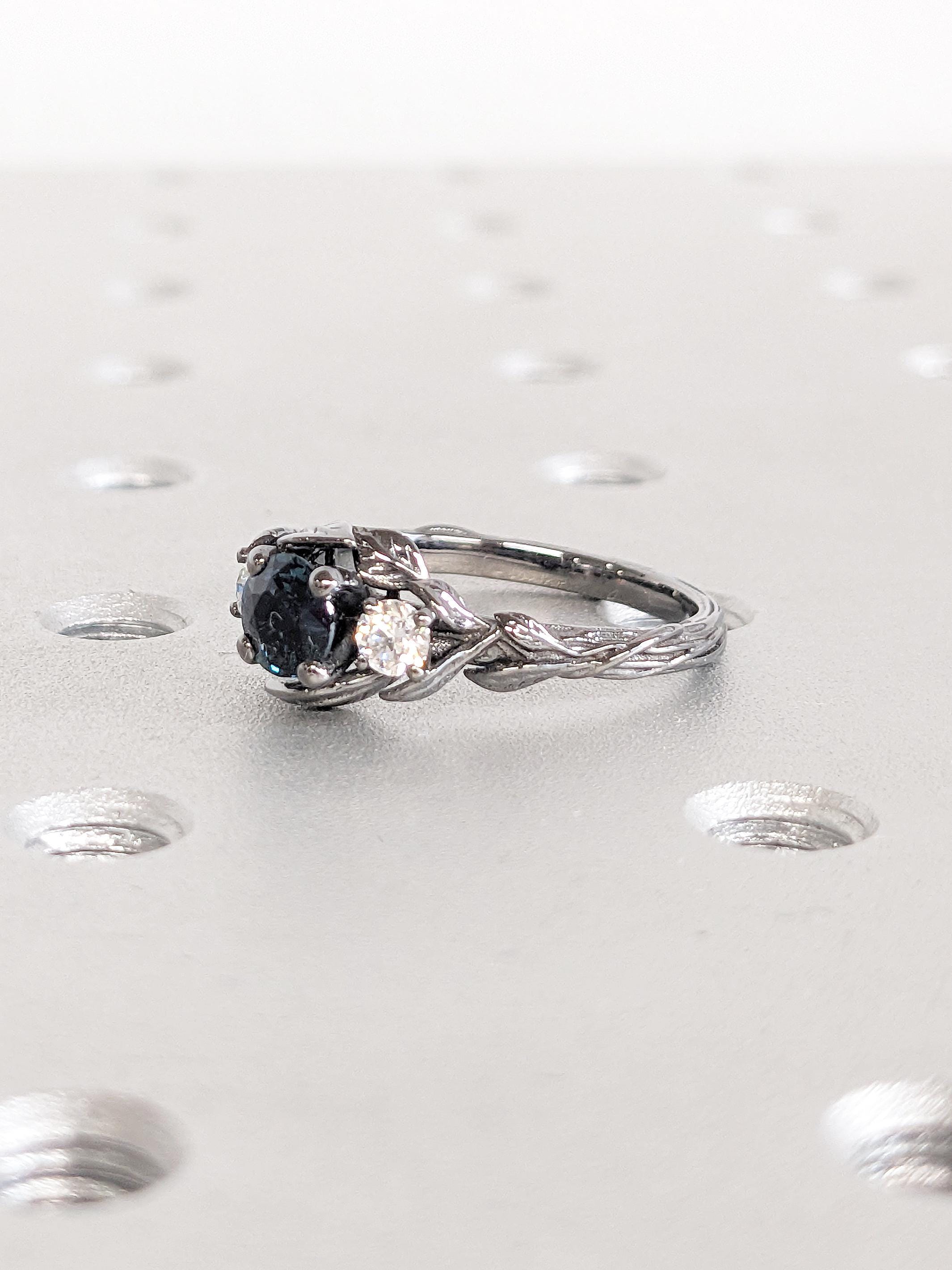 With an alluring blue/green hue from the central Peacock Sapphire setting, framed by elegant leaves motif and twigs engraving on the band, this vintage, rustic, nature inspired engagement ring is set with Natural Diamond or Moissanite accents for that added sparkle.